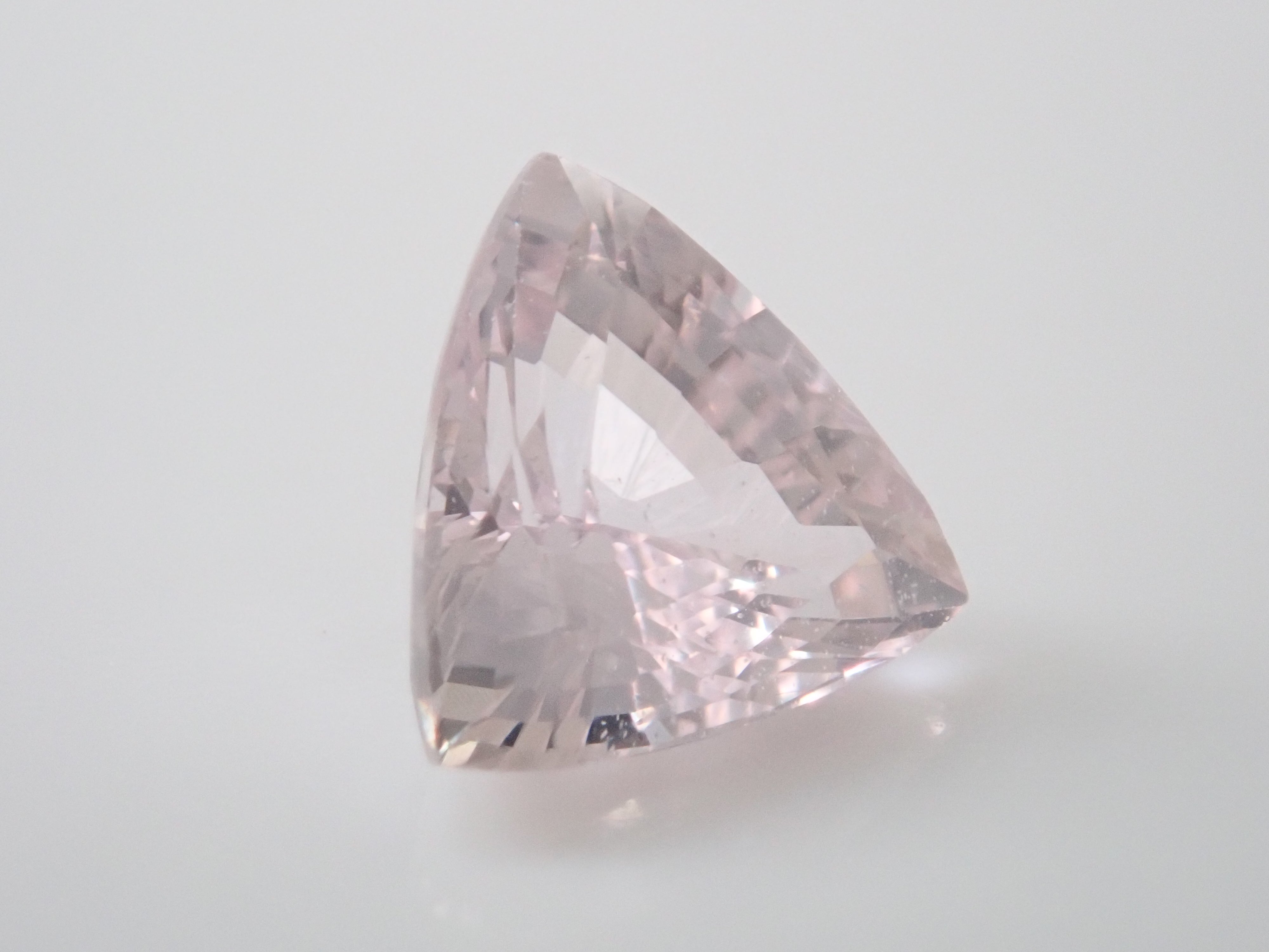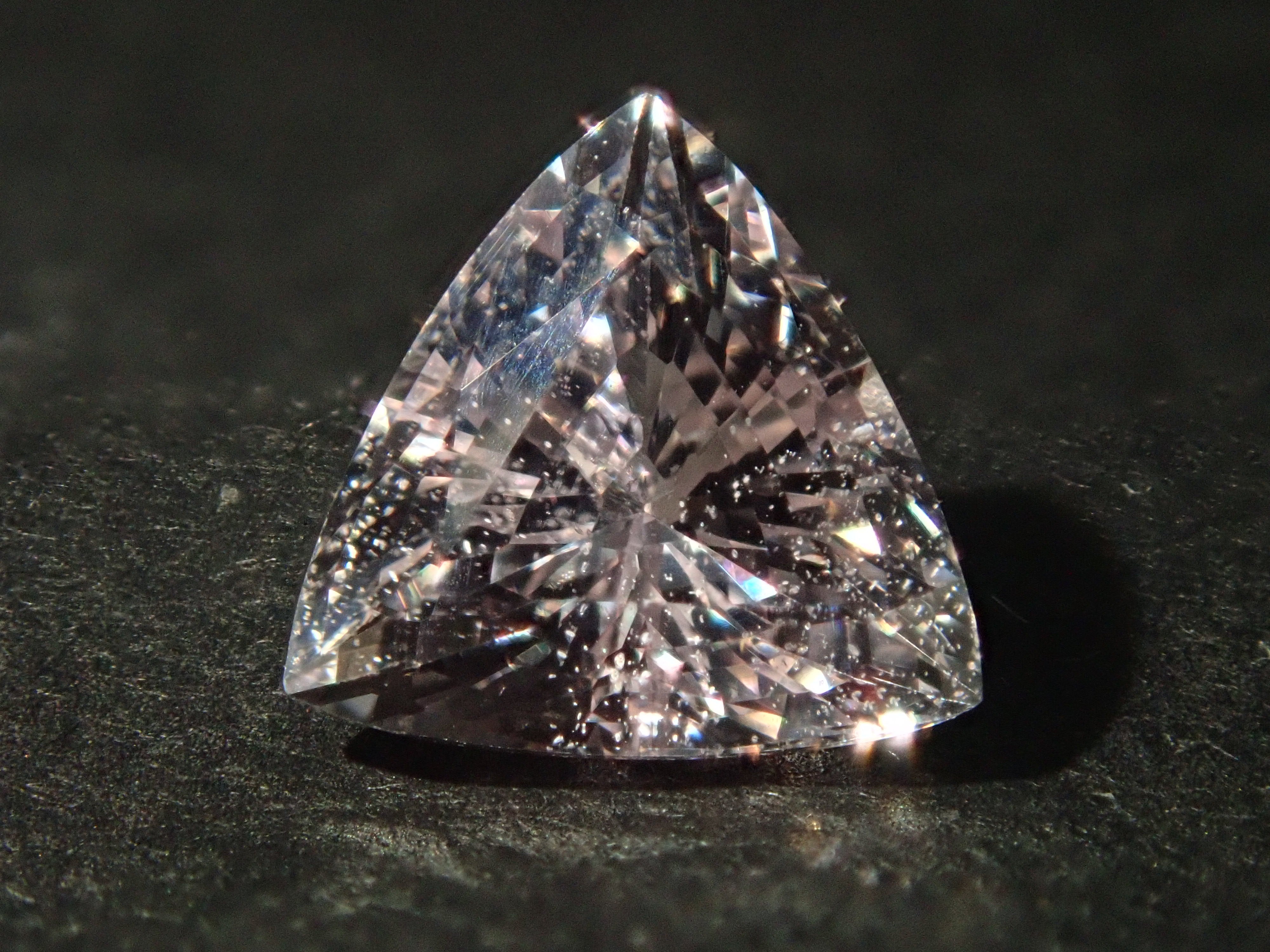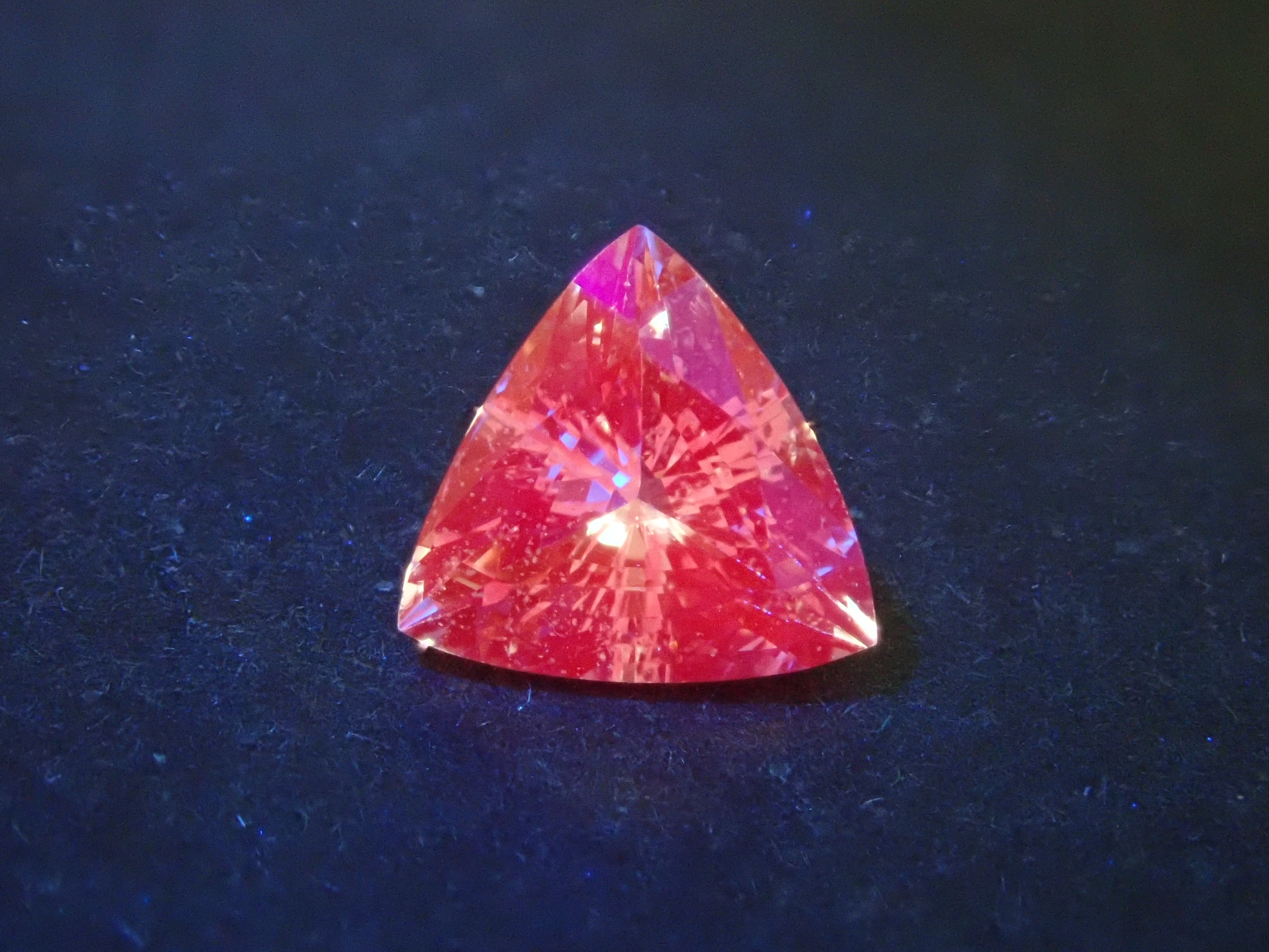 藍寶石是一種著名的寶石。礦物為剛玉,與紅寶石相同,但除紅色以外的所有剛玉稱為藍寶石。這是一顆帶有鮮明桃色的粉紅色藍寶石。藍寶石的硬度為 9,是僅次於鑽石的第二硬寶石,是一種高度堅韌、穩定且易於護理的寶石。 一顆明亮式切割藍寶石。照片末尾的紅色藍寶石是在黑光燈下拍攝的。