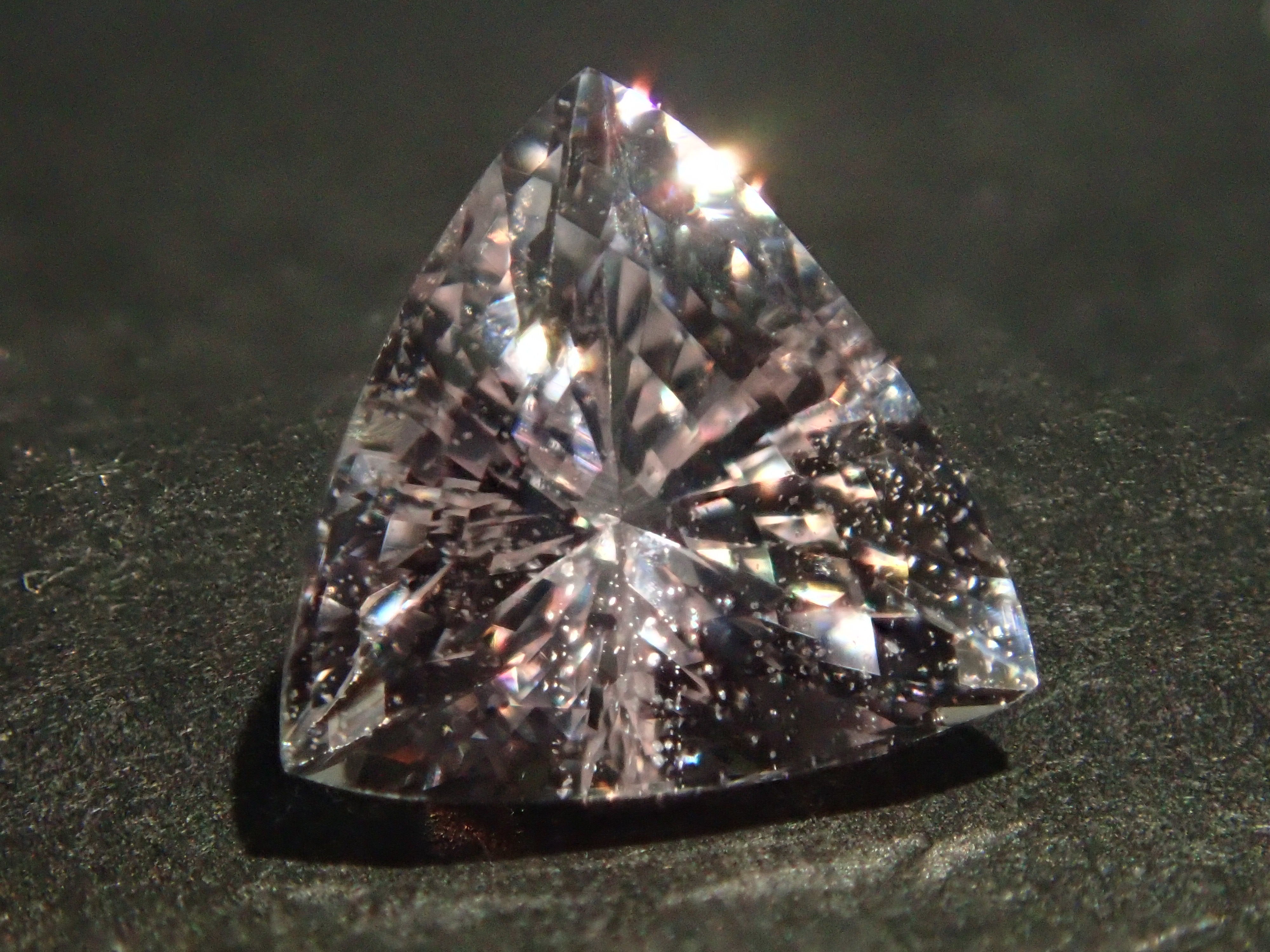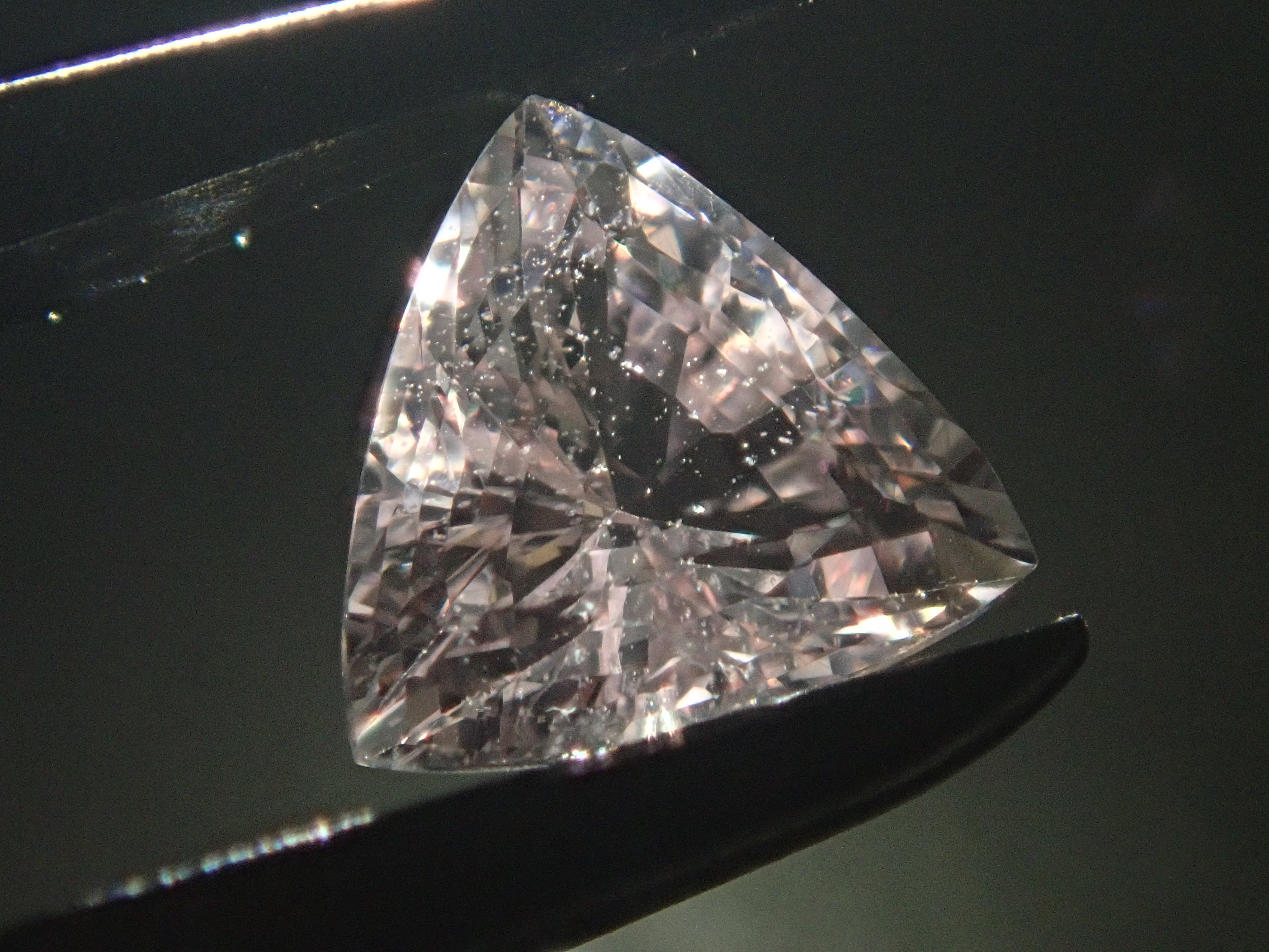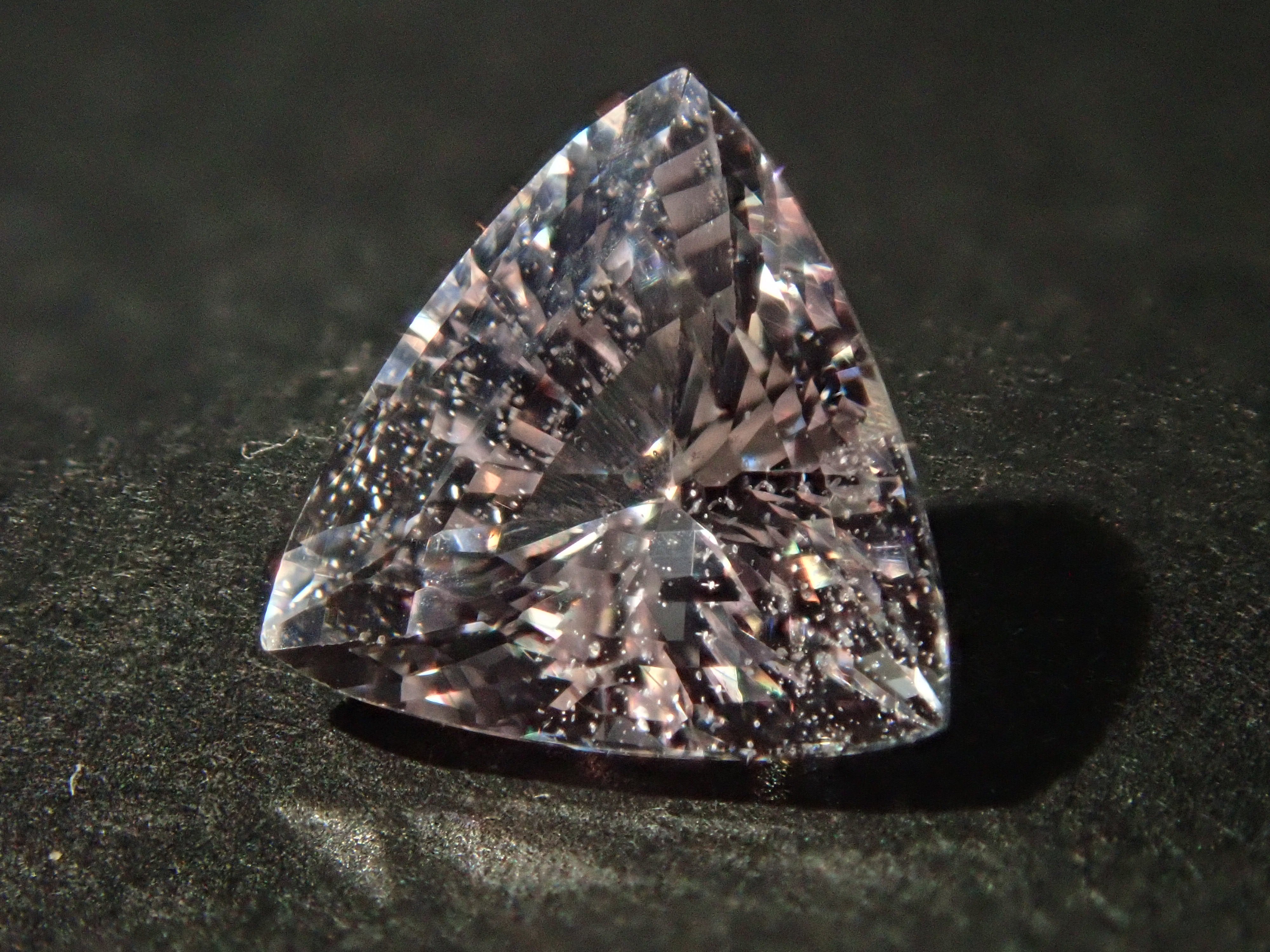 藍寶石是一種著名的寶石。礦物為剛玉,與紅寶石相同,但除紅色以外的所有剛玉稱為藍寶石。這是一顆帶有鮮明桃色的粉紅色藍寶石。藍寶石的硬度為 9,是僅次於鑽石的第二硬寶石,是一種高度堅韌、穩定且易於護理的寶石。 一顆明亮式切割藍寶石。照片末尾的紅色藍寶石是在黑光燈下拍攝的。