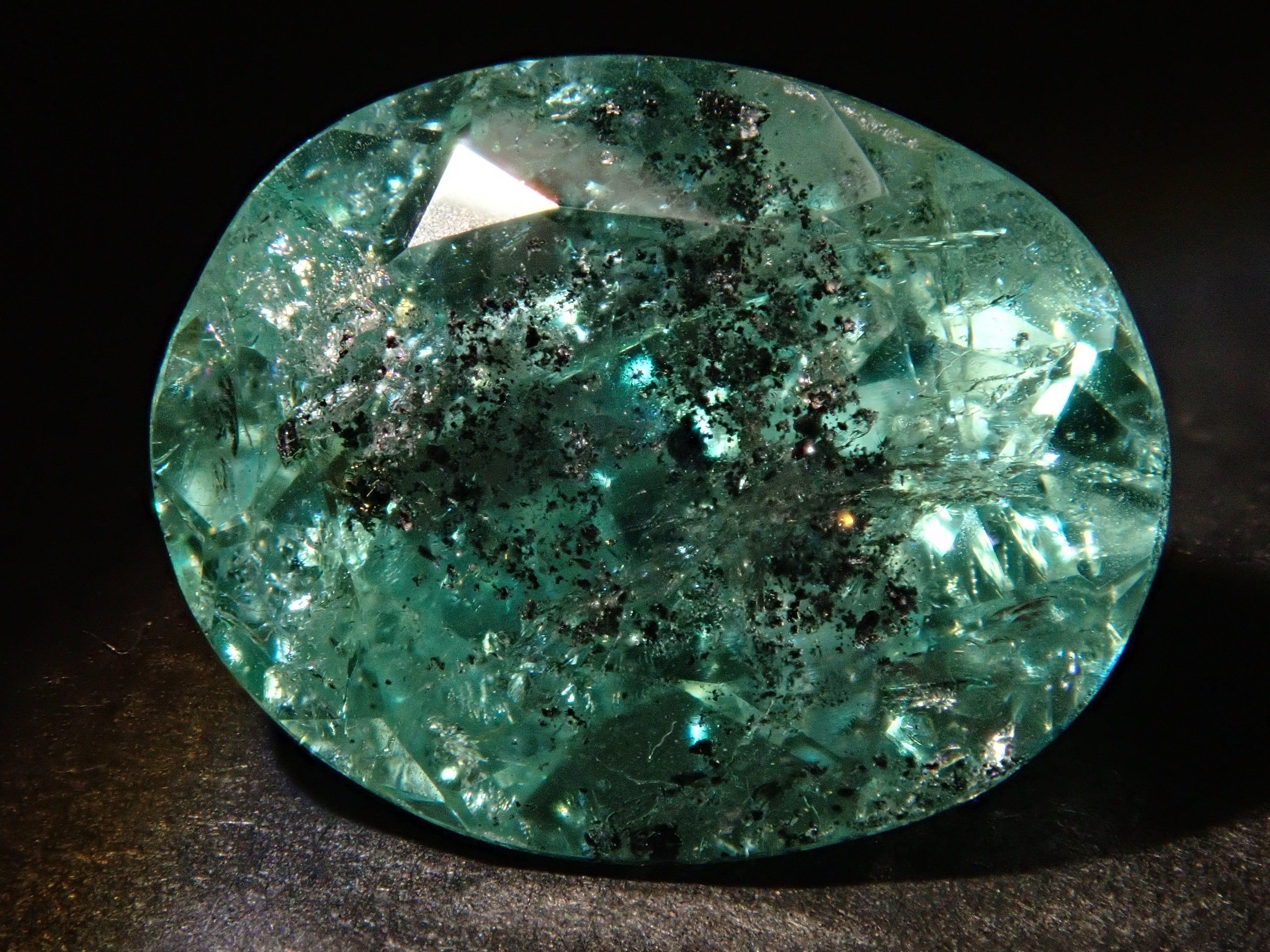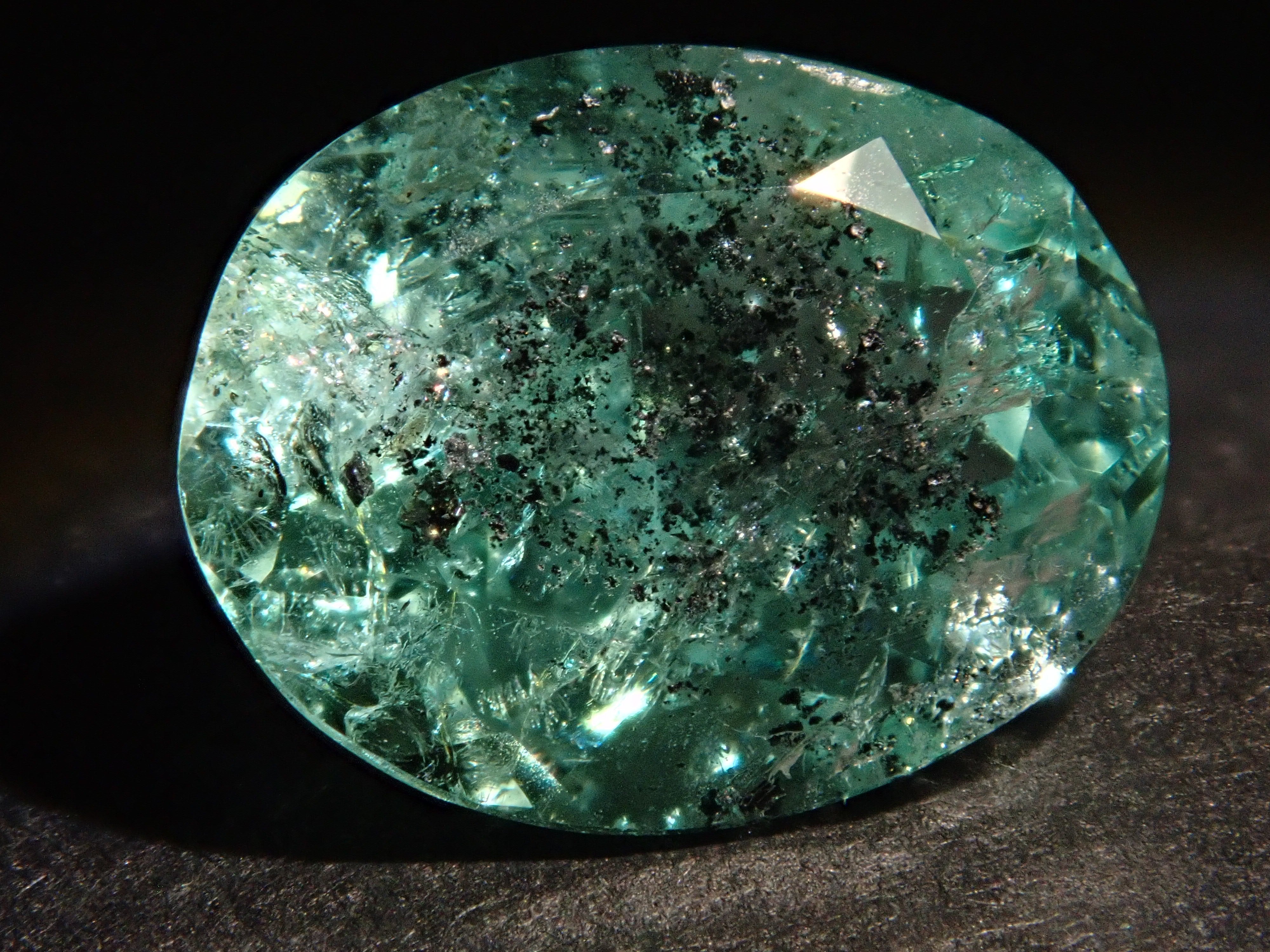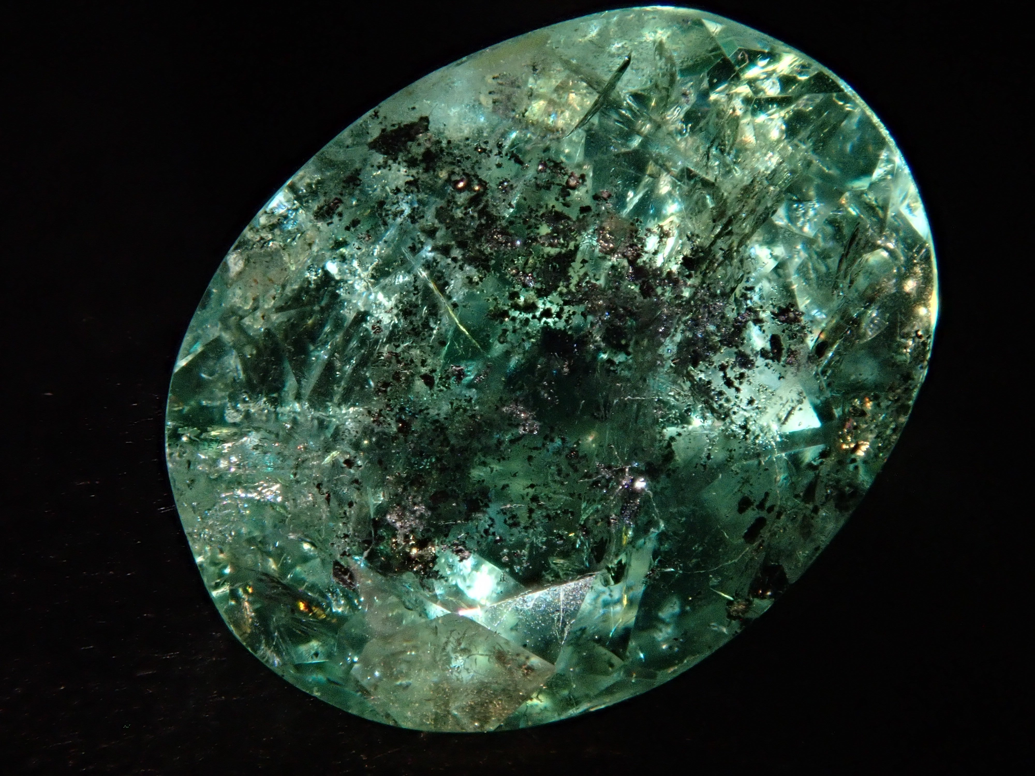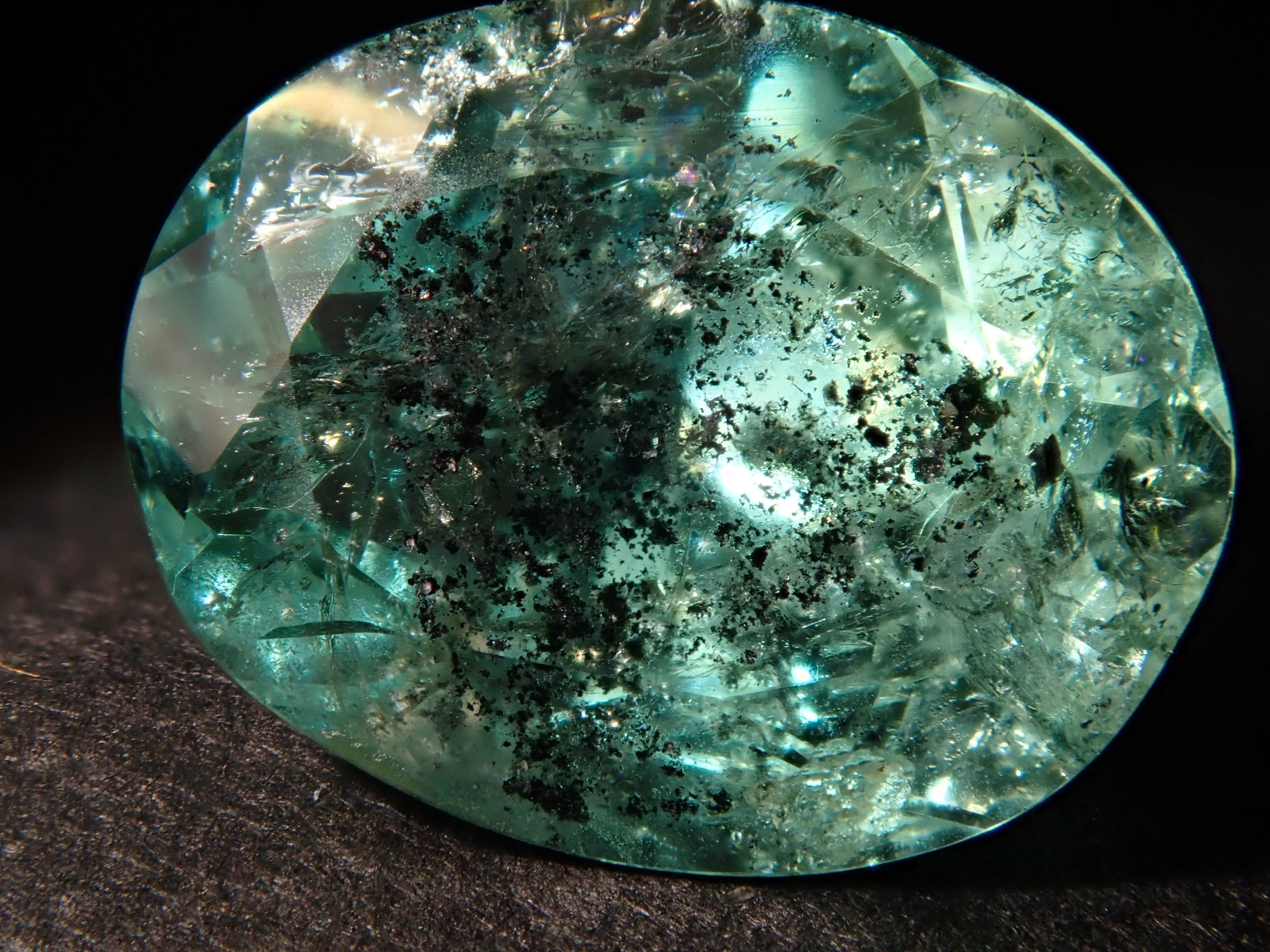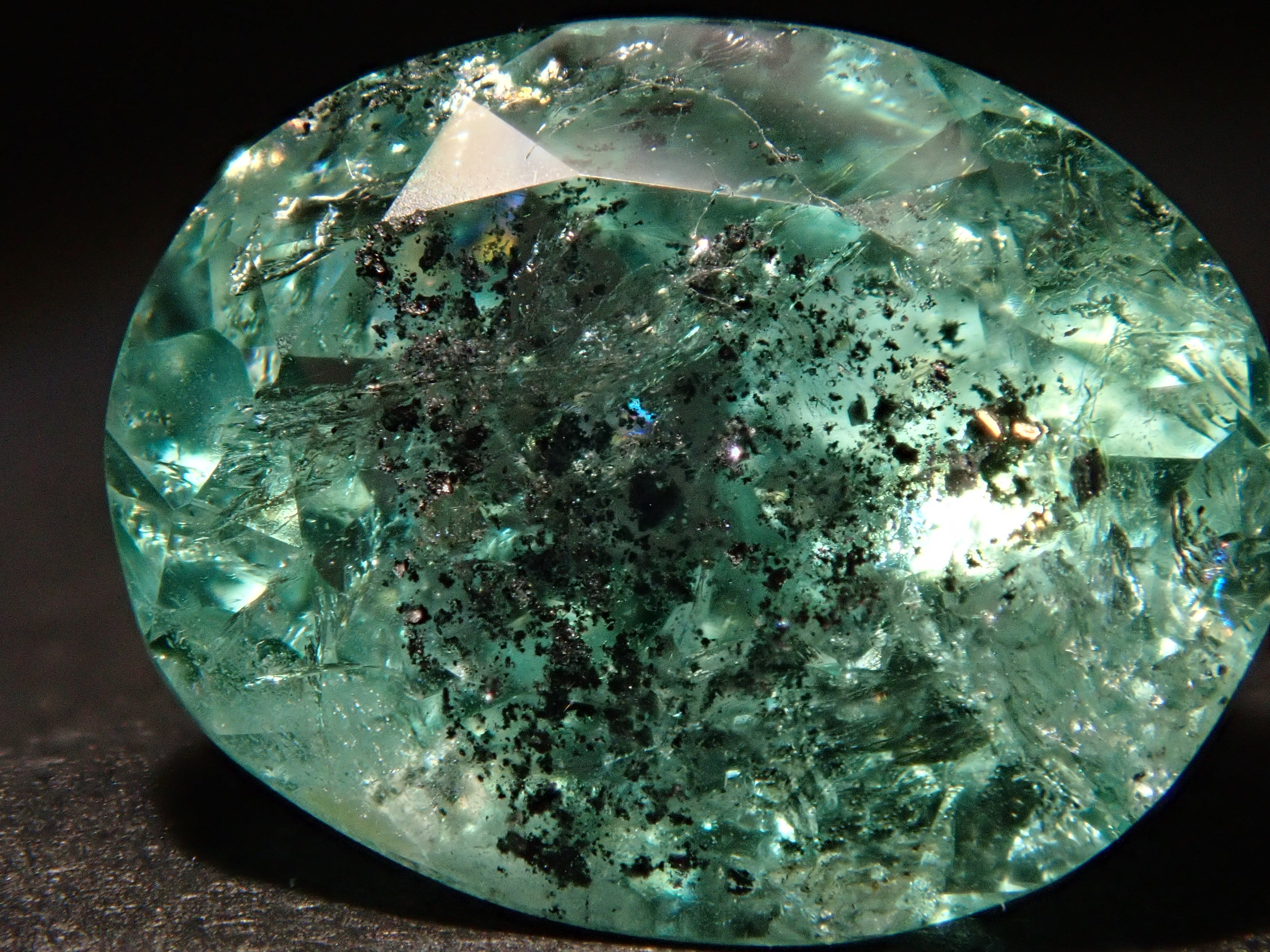 據說祖母綠的美麗綠色因產地而異。這顆產自哥倫比亞的祖母綠,據說擁有特別深邃的綠色。祖母綠通常容易出現刮痕,因此通常會用油進行處理,使刮痕不那麼明顯。請欣賞它優雅的綠色。這顆產自哥倫比亞的雲母祖母綠。