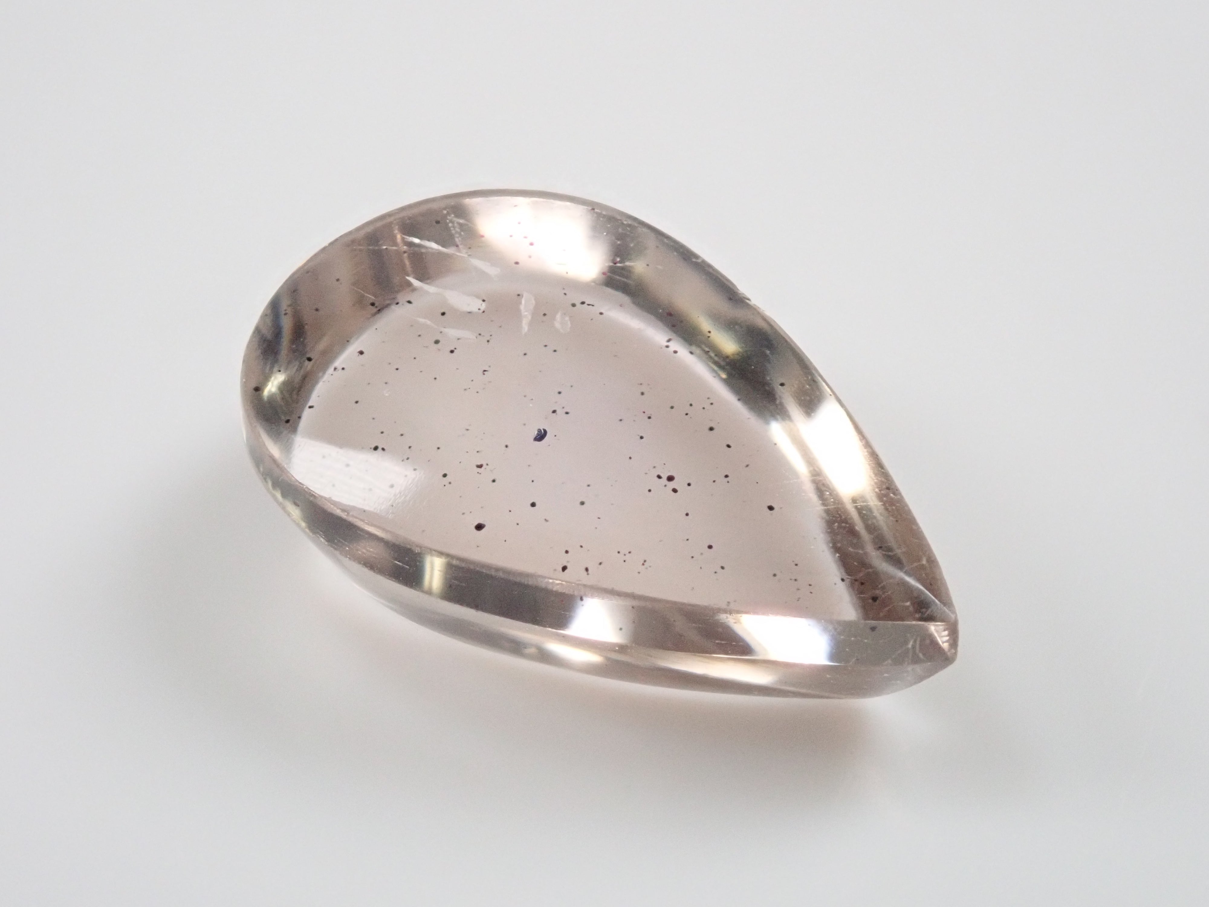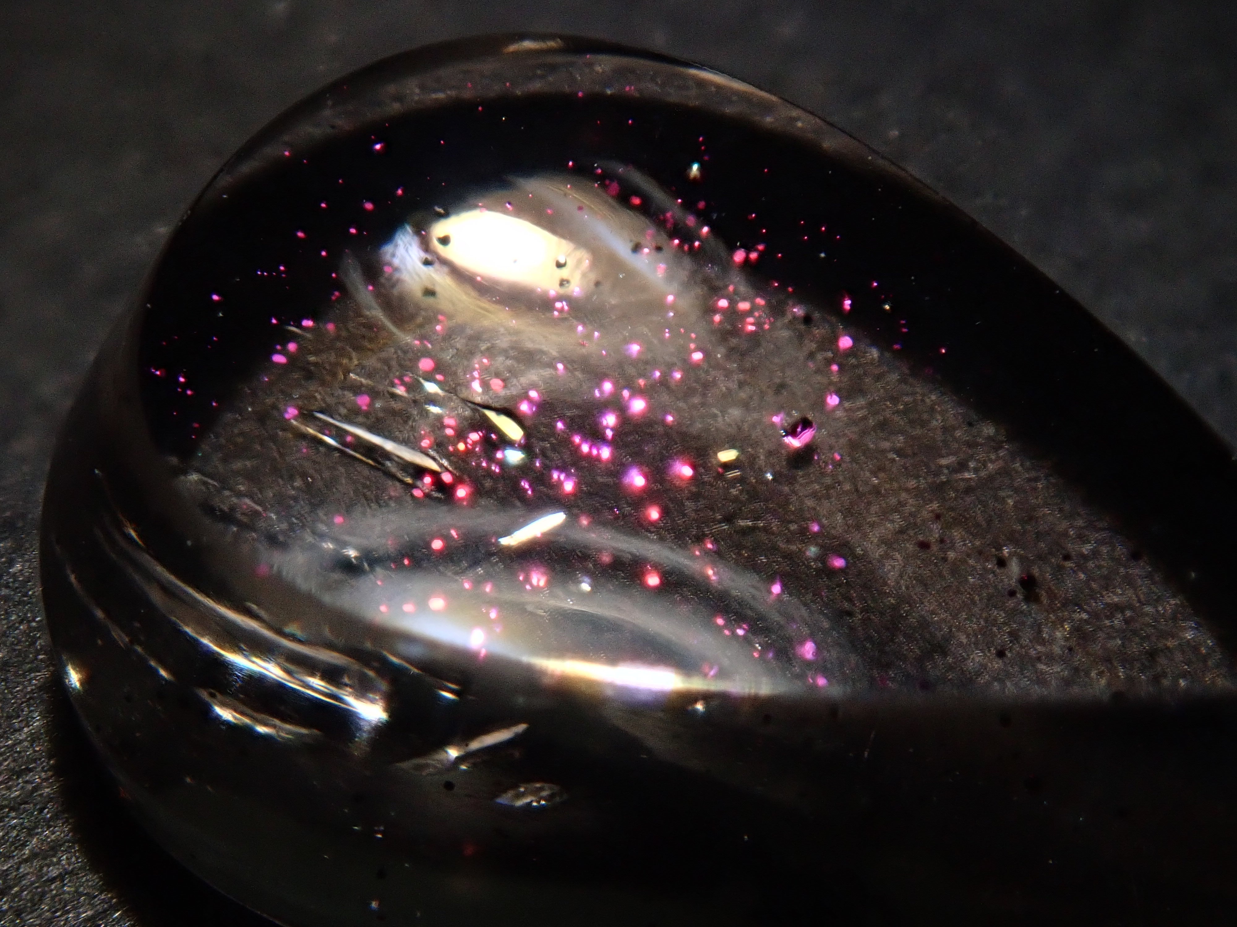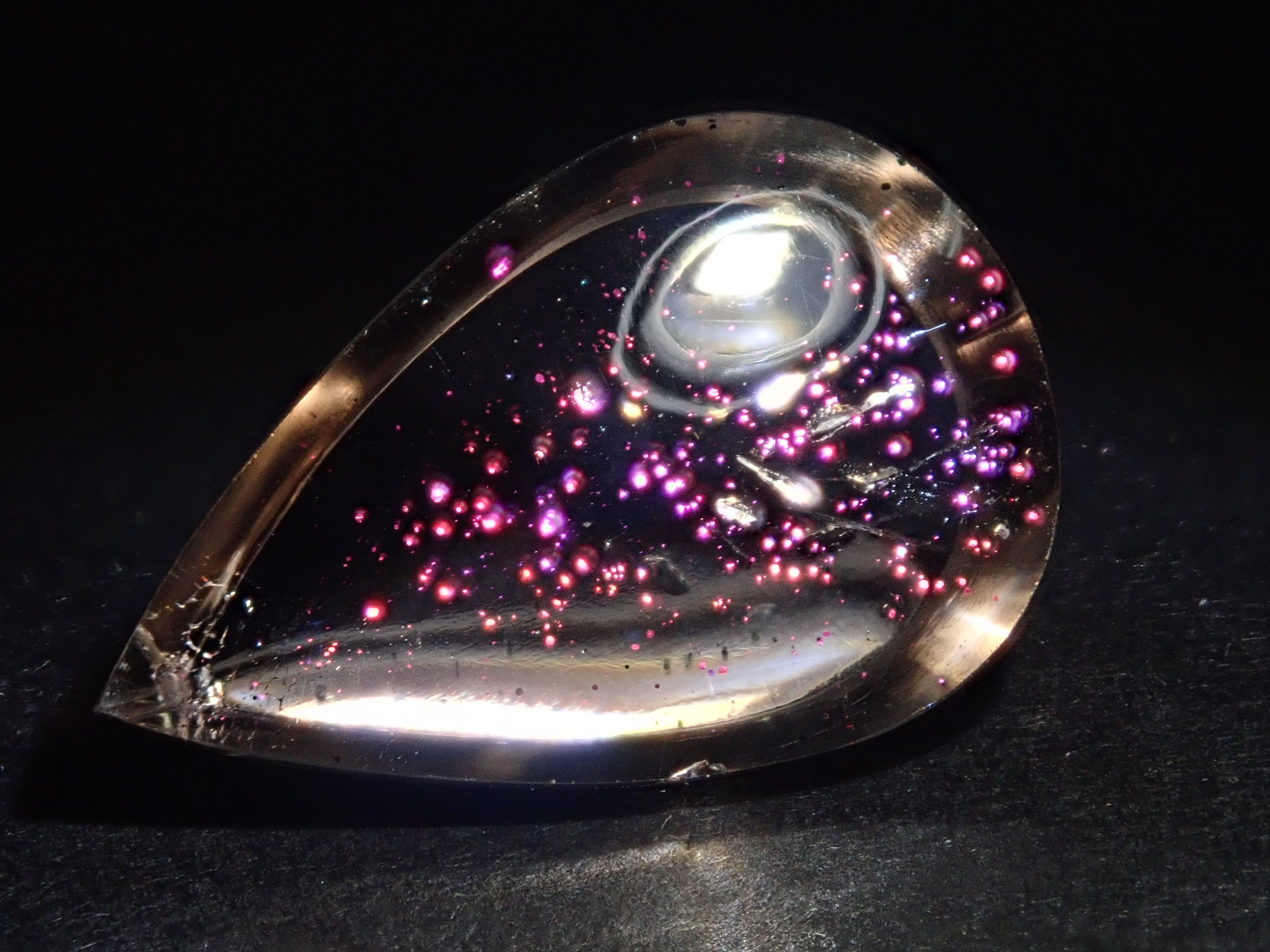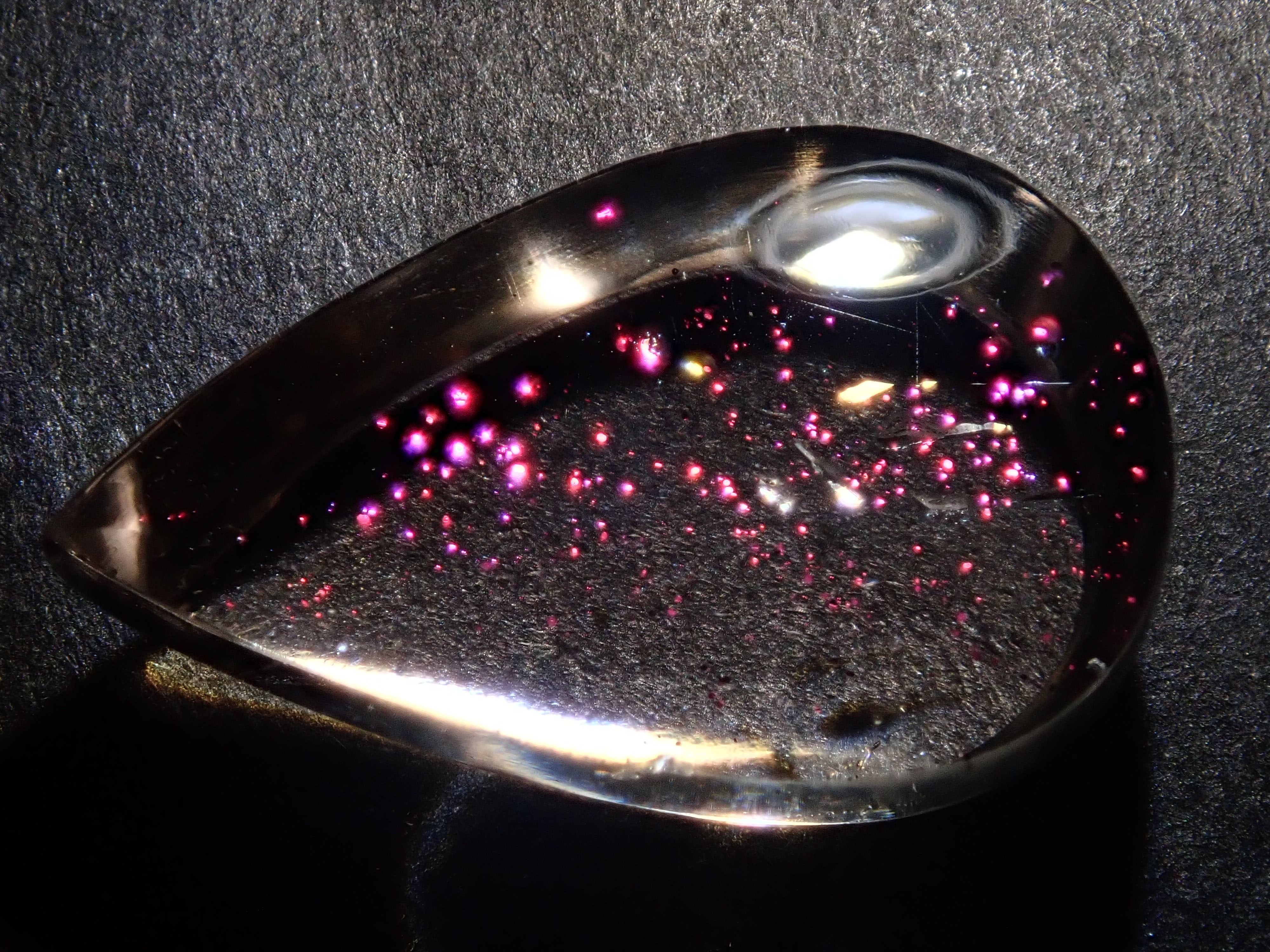 石英,日文稱為“水晶”,在日本是一種常見的寶石,但它也是一種深奧的寶石,擁有眾多種類,包括紫水晶和黃水晶。這種形狀像紅色花瓣的水晶被稱為「小叮噹石英」或「粉紅火石英」。照片是用筆形電筒拍攝的,以便清晰地顯示內部內含物的狀態。