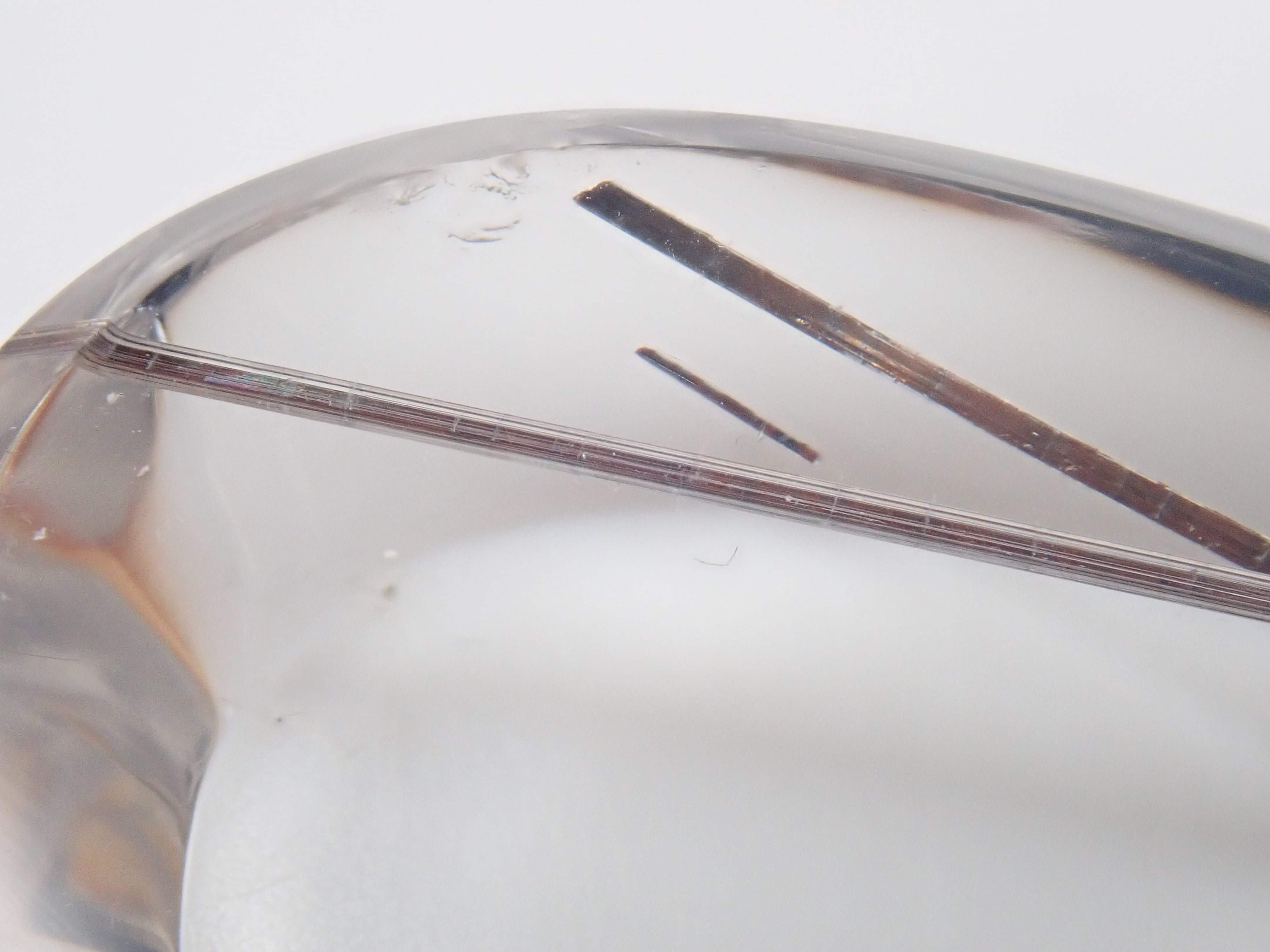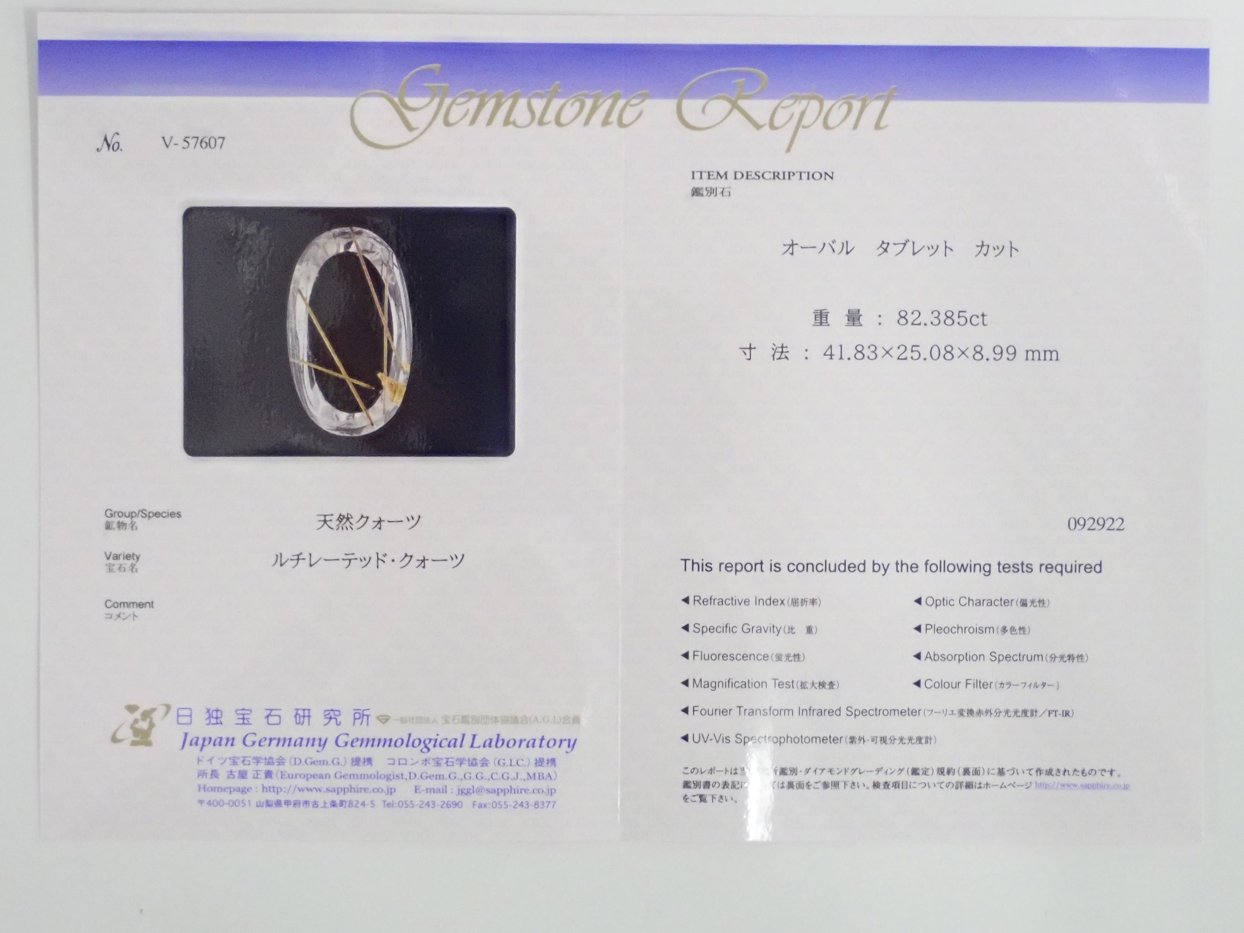 金紅石石英具有美麗的金色光澤。將一根由金紅石製成的「金針」插入晶體中。日本名字是“Kinkoishi”。它也被稱為“金紅石石英”、“金紅石石英”和“金紅石石英”。攝影時使用筆形燈捕捉內含物的美麗光芒。附有日德寶石研究所頒發的鑑定證書。
