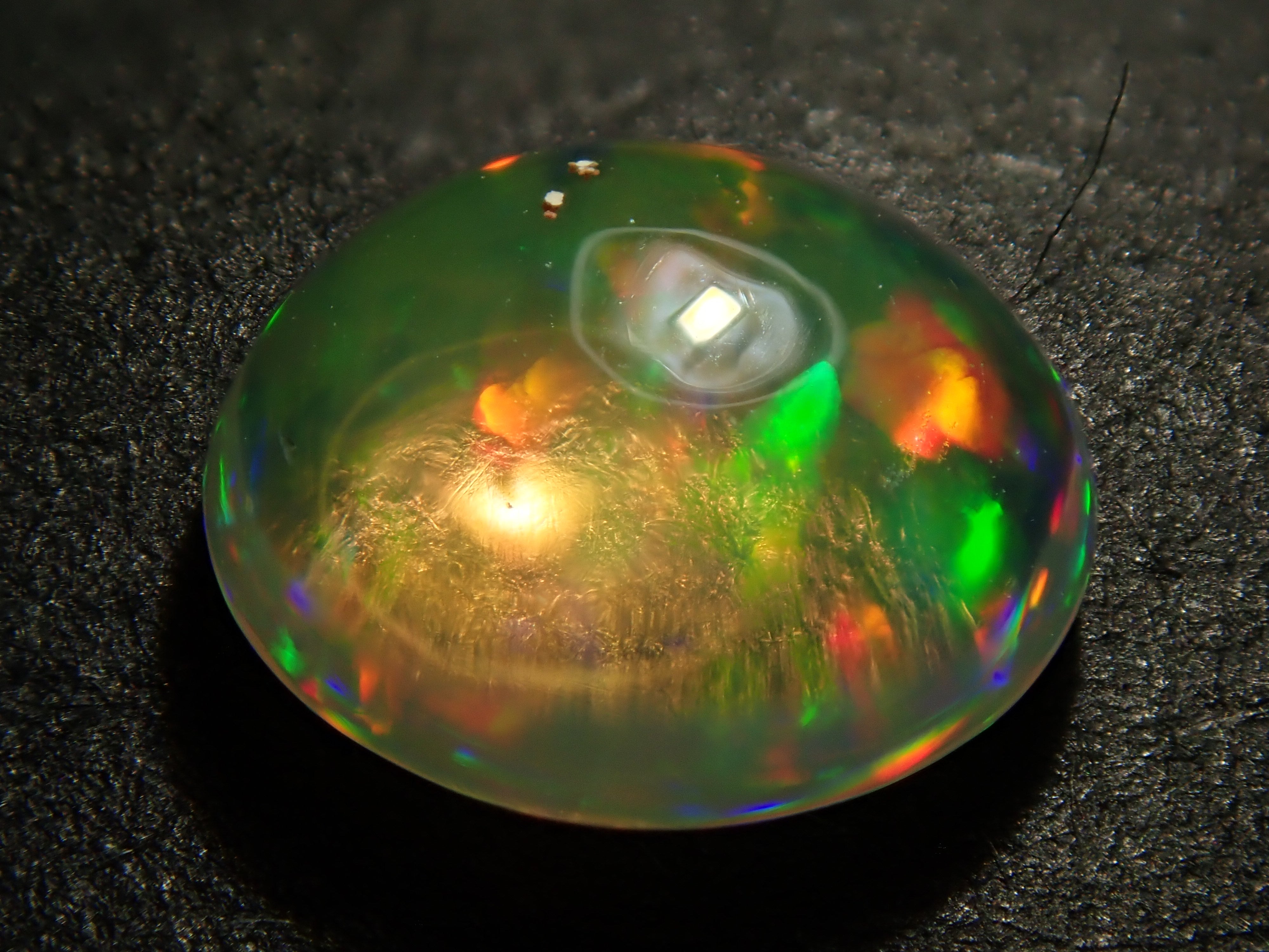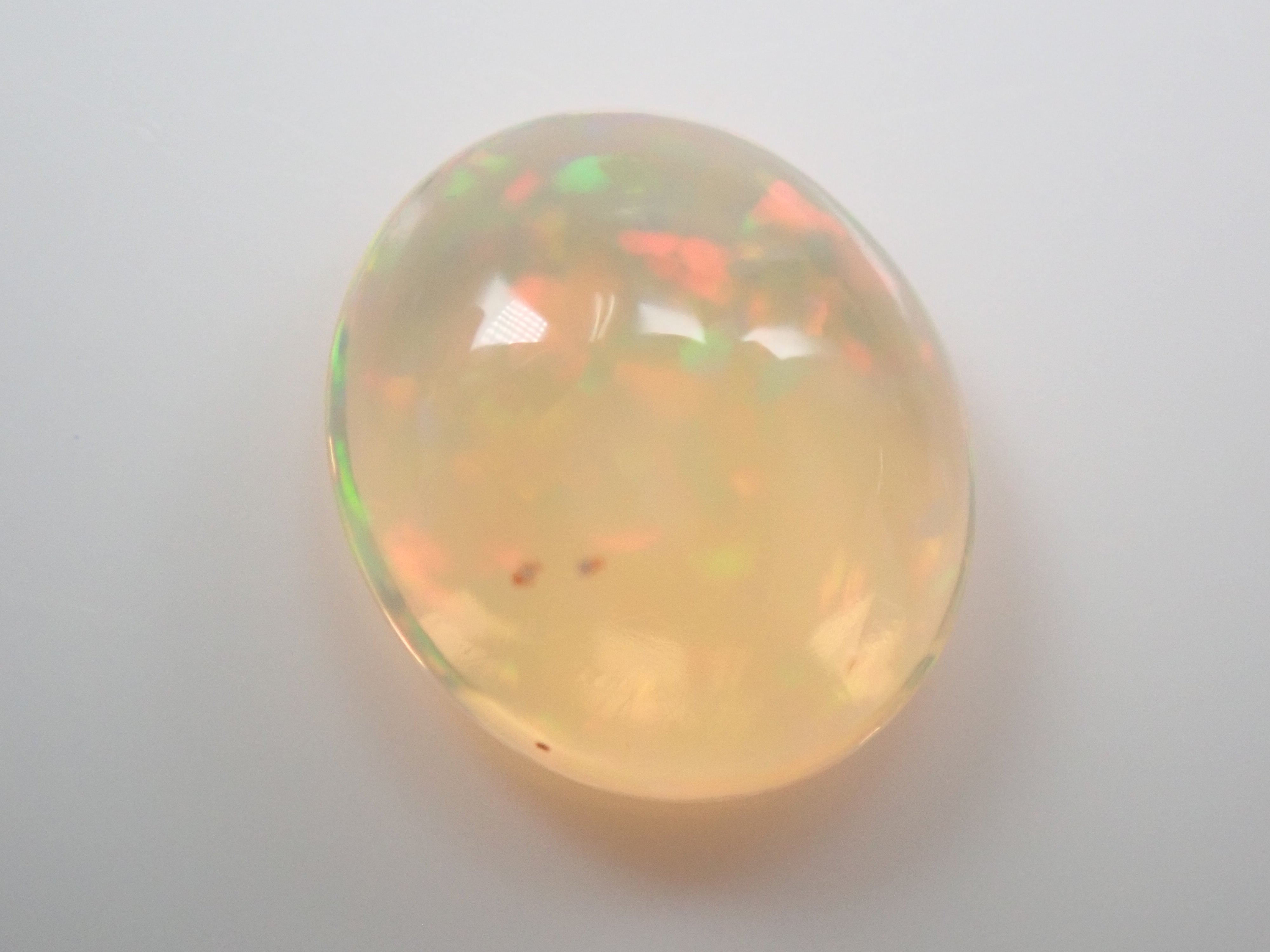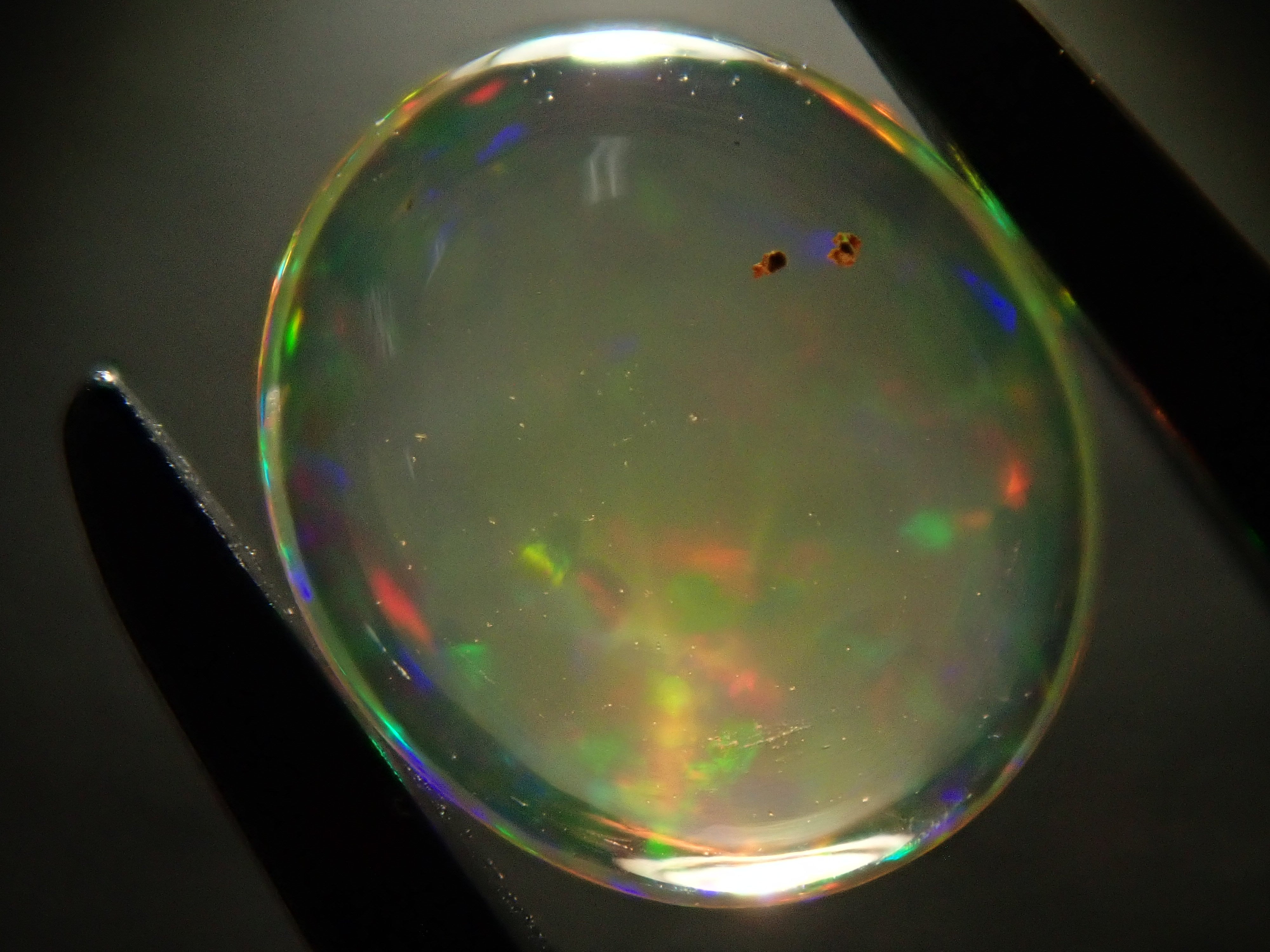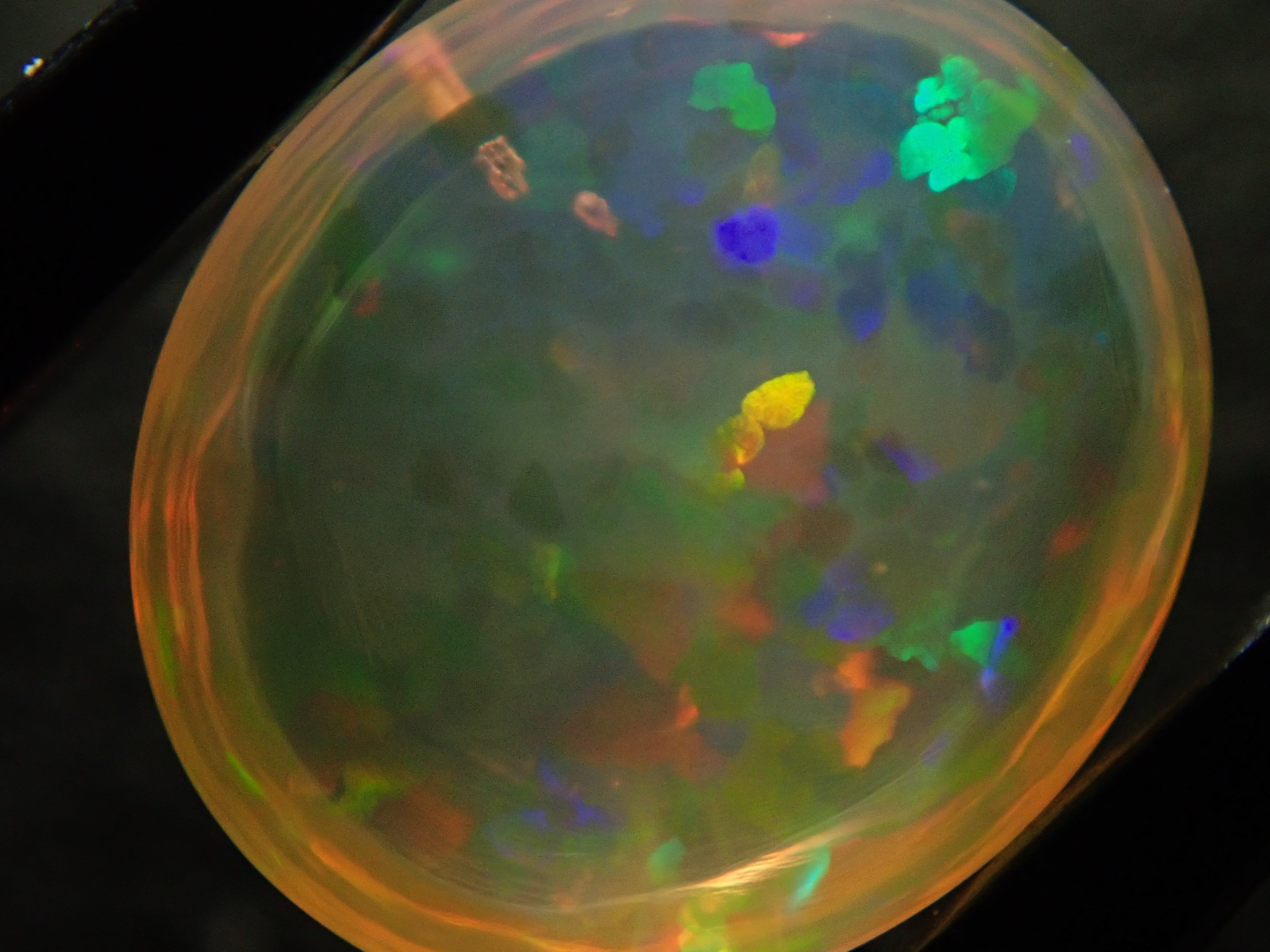 蛋白石自古羅馬時代以來就很受歡迎。火蛋白石是指底色從紅色到橘色的蛋白石,給人火的形象。照片是使用筆燈拍攝的。墨西哥火蛋白石 0.780 克拉裸石,附遊彩。