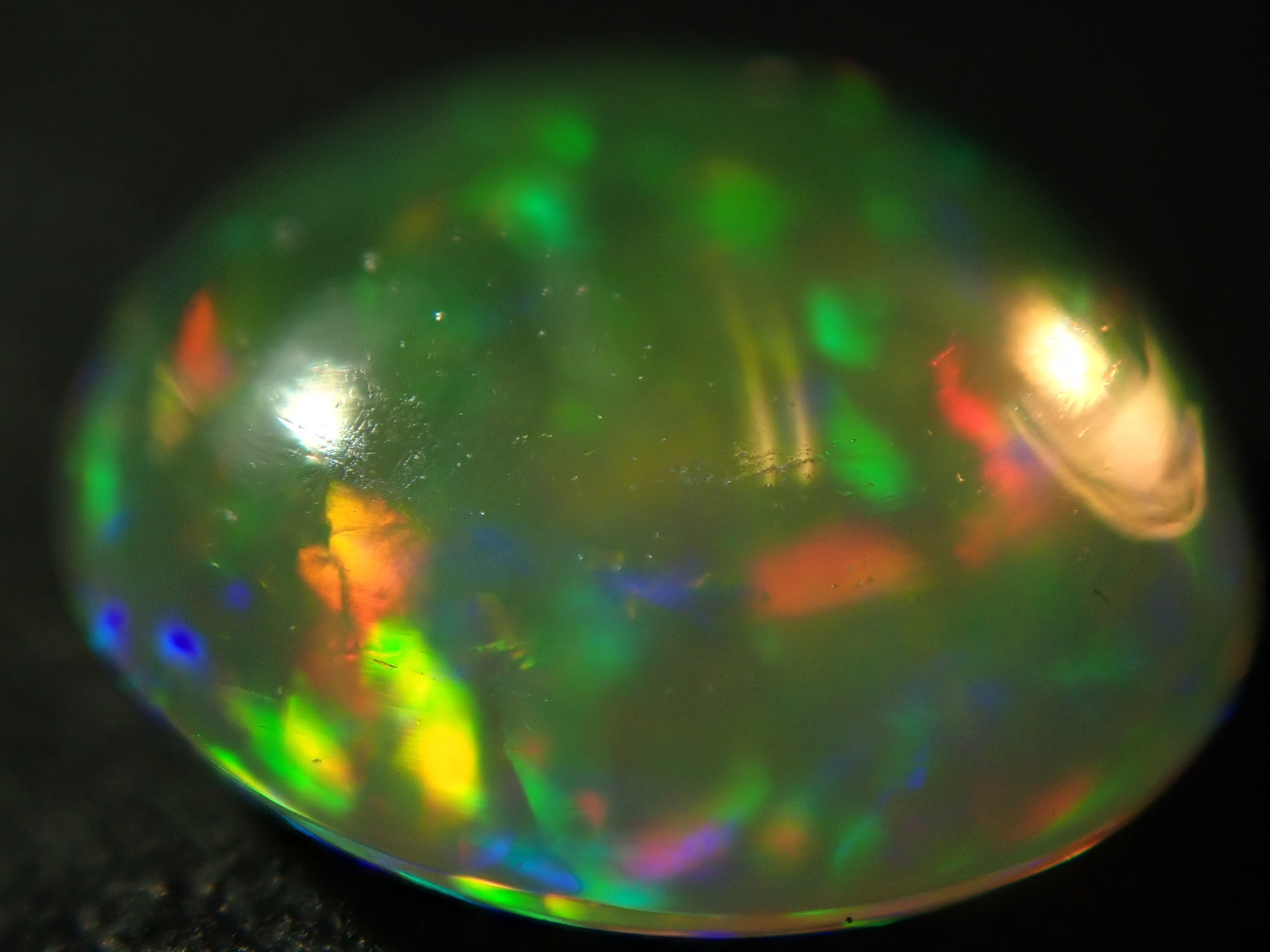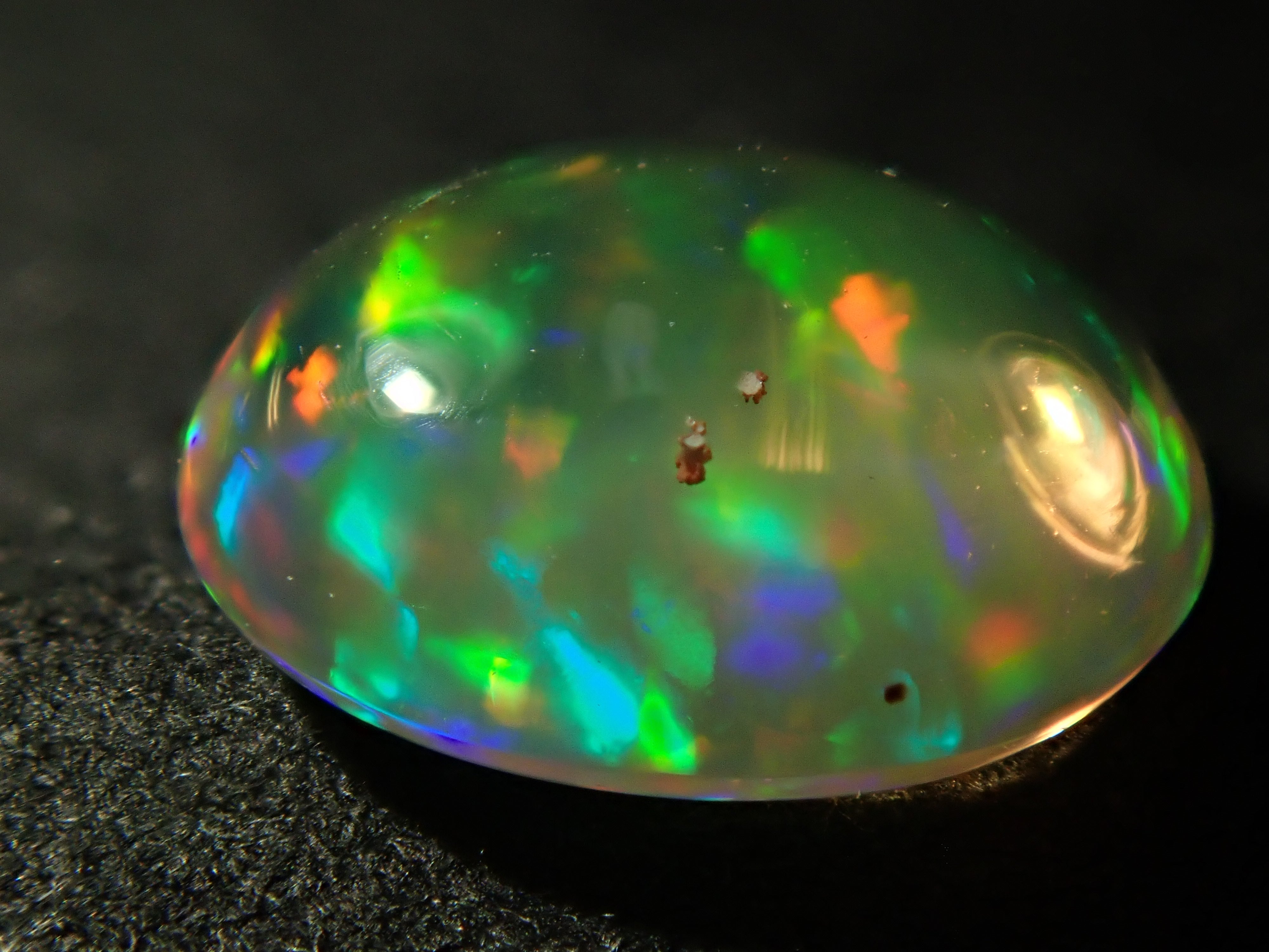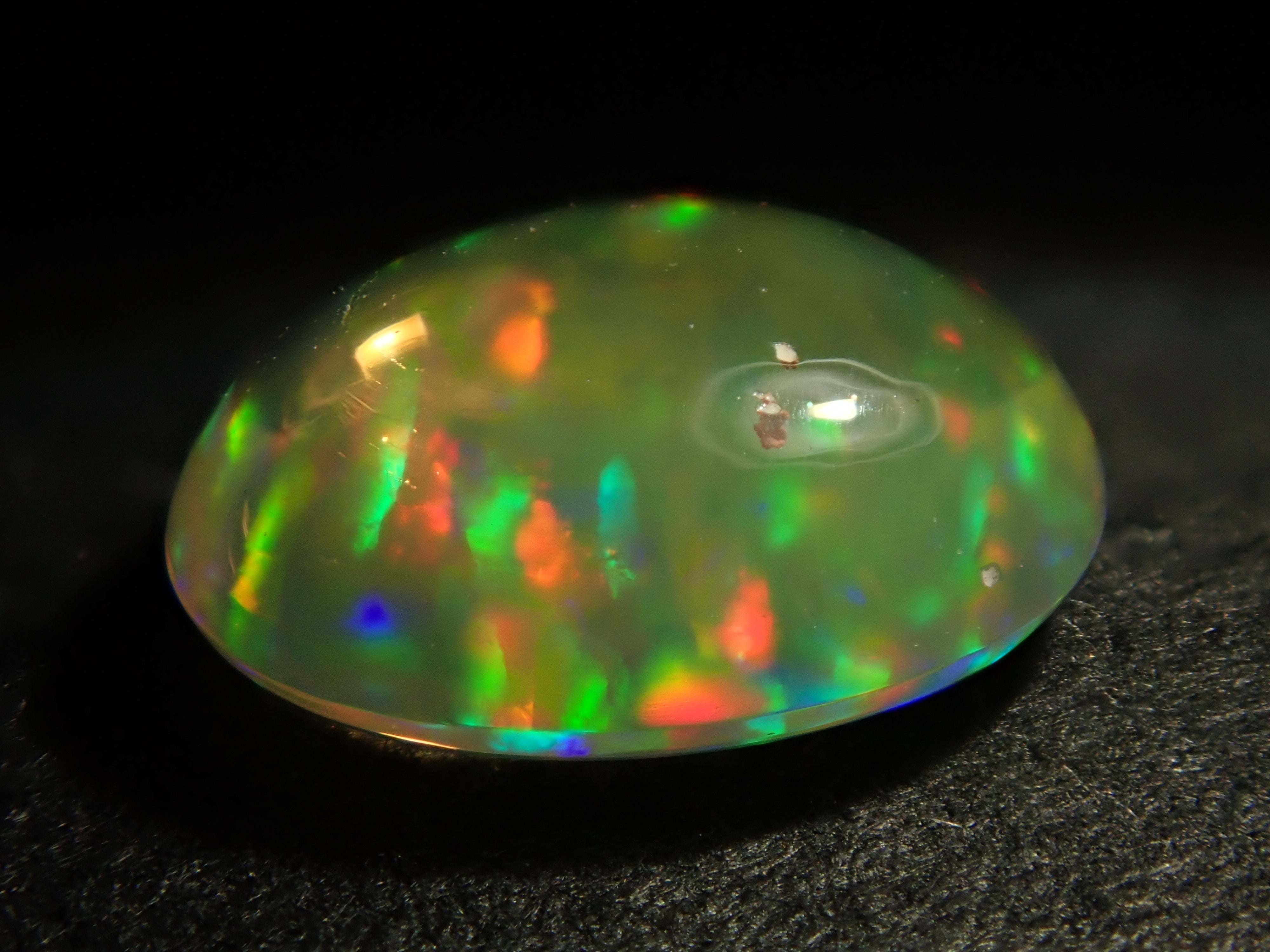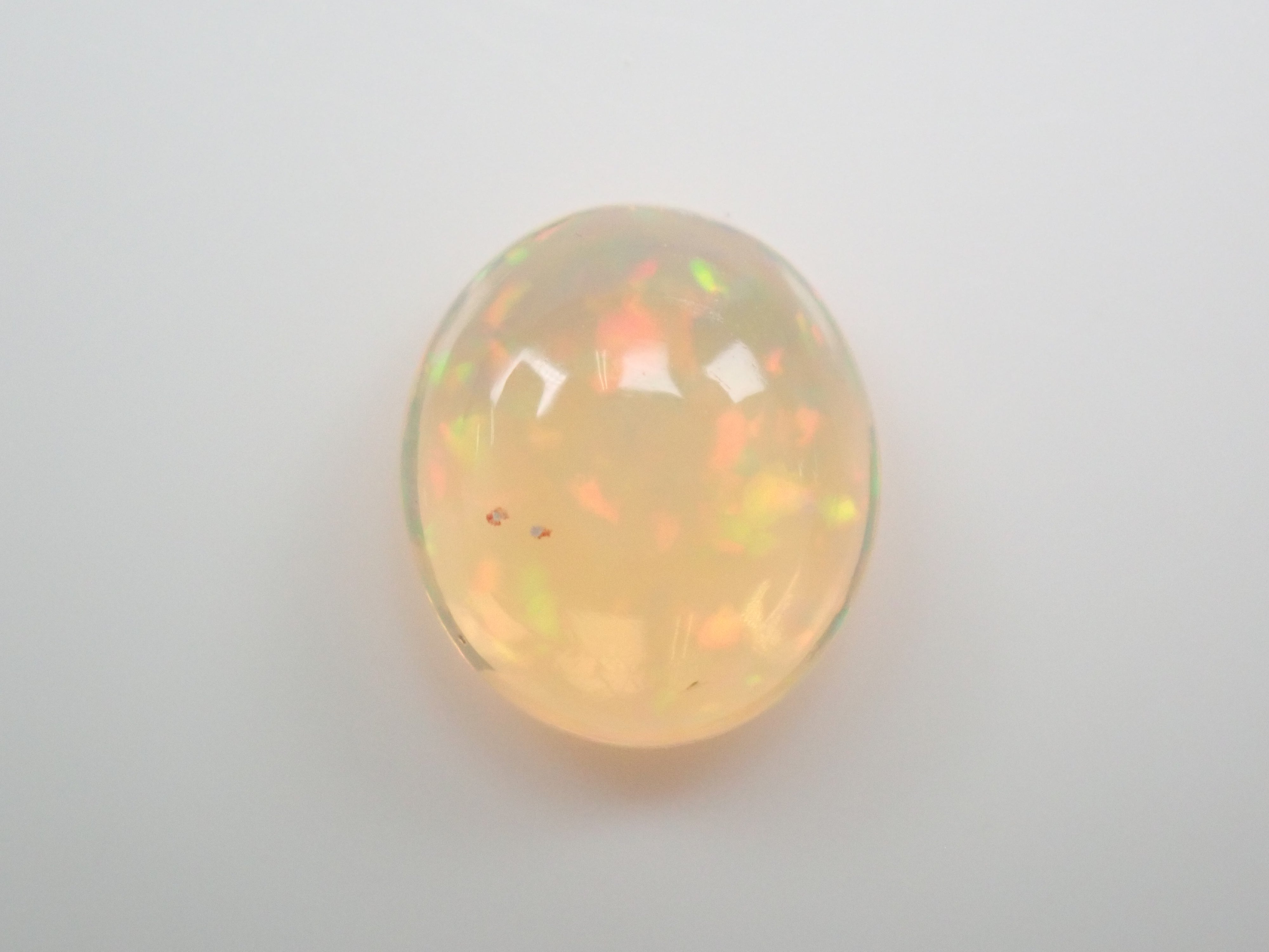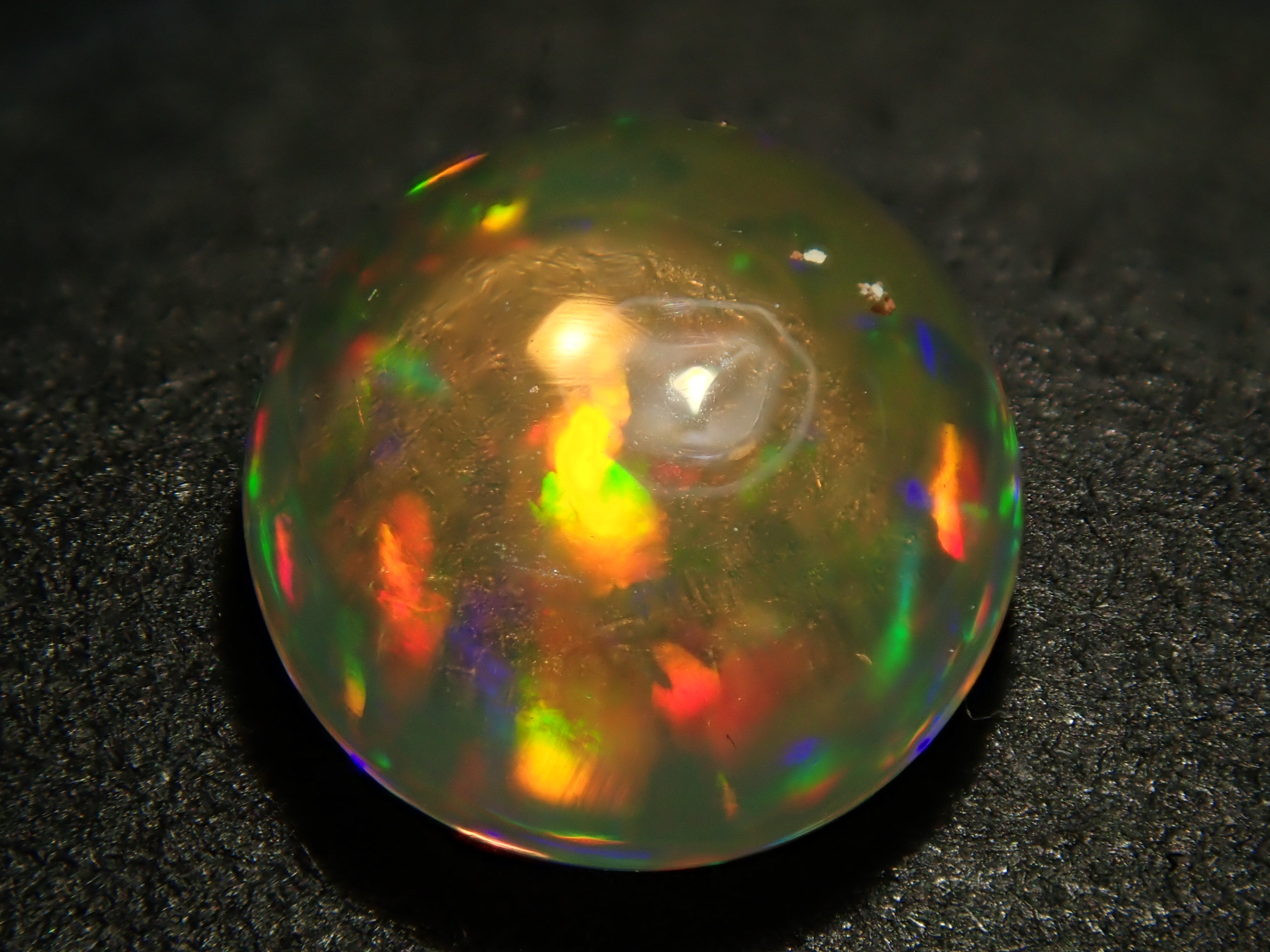 蛋白石自古羅馬時代以來就很受歡迎。火蛋白石是指底色從紅色到橘色的蛋白石,給人火的形象。照片是使用筆燈拍攝的。墨西哥火蛋白石 0.780 克拉裸石,附遊彩。