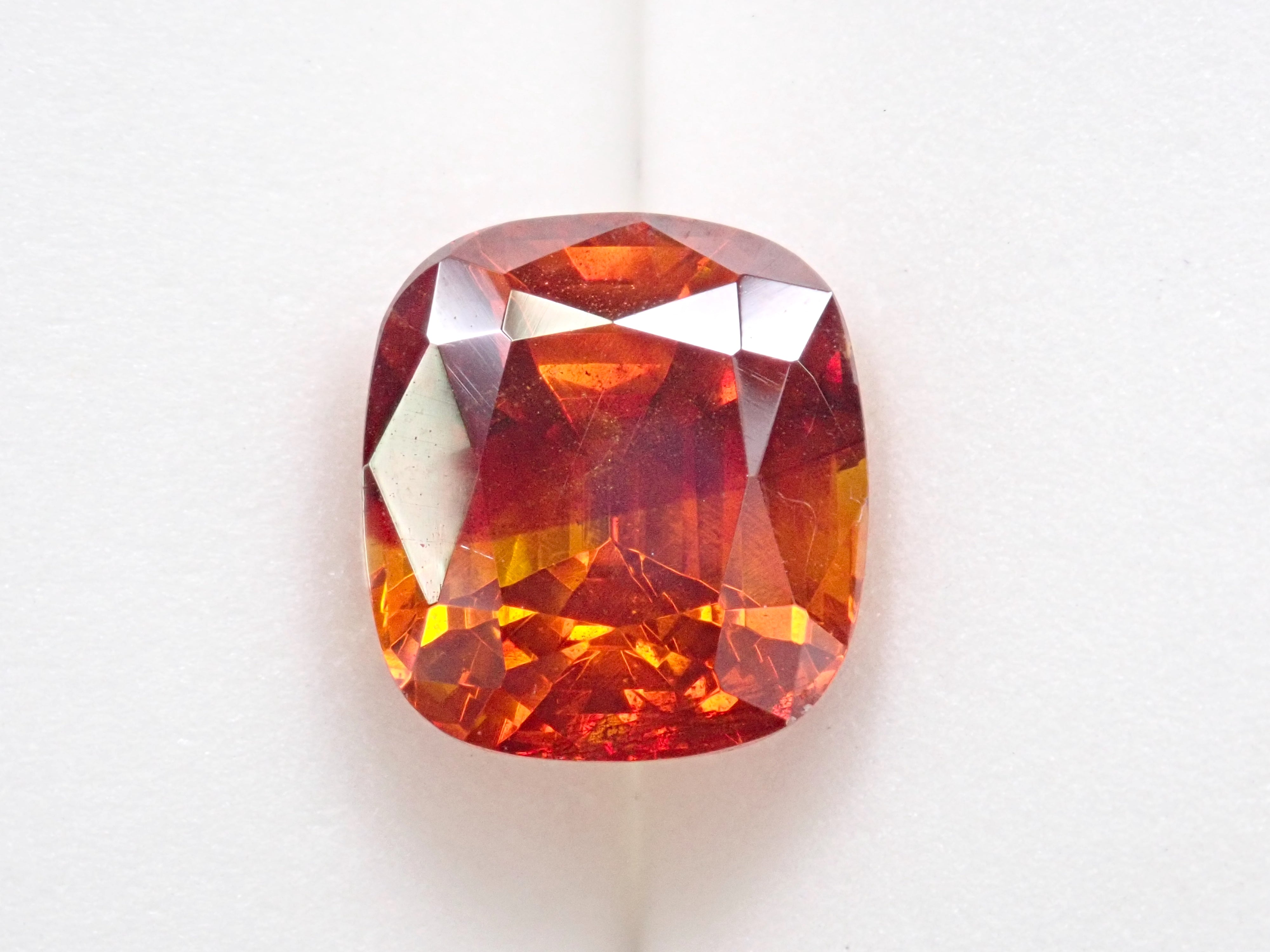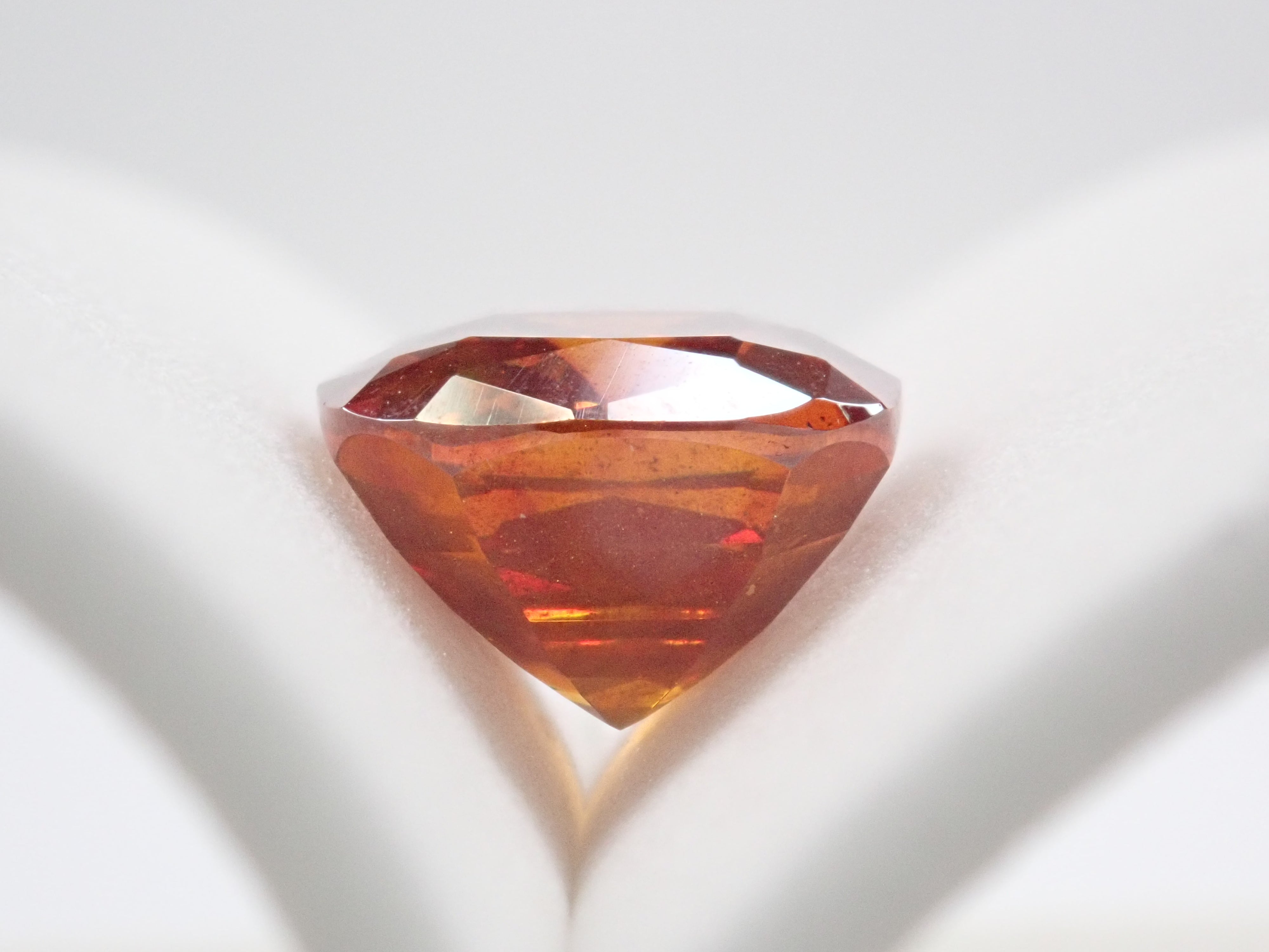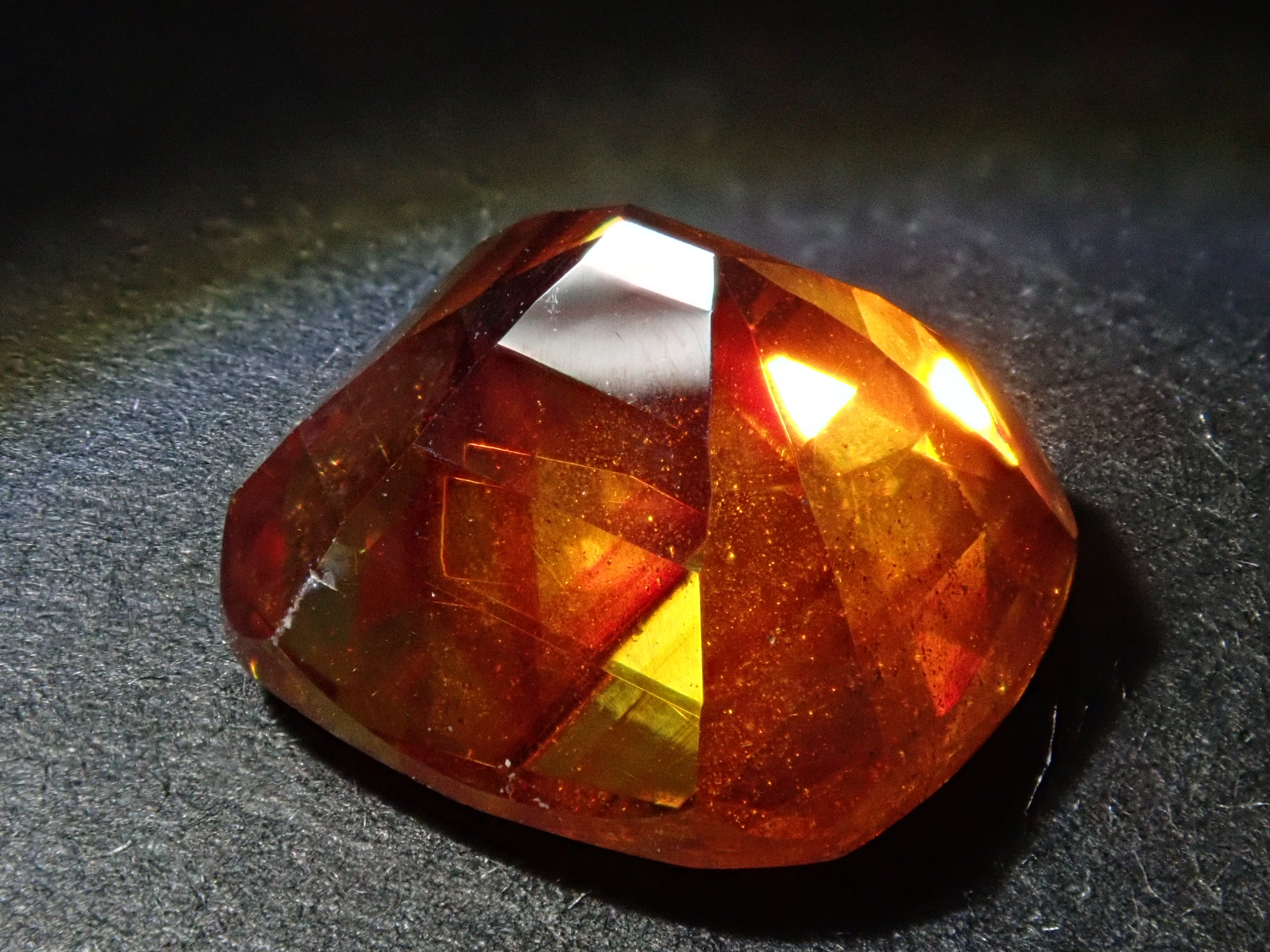 閃鋅礦的色散率幾乎是鑽石的四倍,並能展現出絢麗的火彩。據說,它是稀有寶石之一,流通量很小,在市場上並不常見。其底色為黃色、橙色、綠色等,火彩則呈現各種顏色,例如黃色、棕色、橙色、紅色和綠色。這顆閃鋅礦呈現出橙色和黃色的混合色。