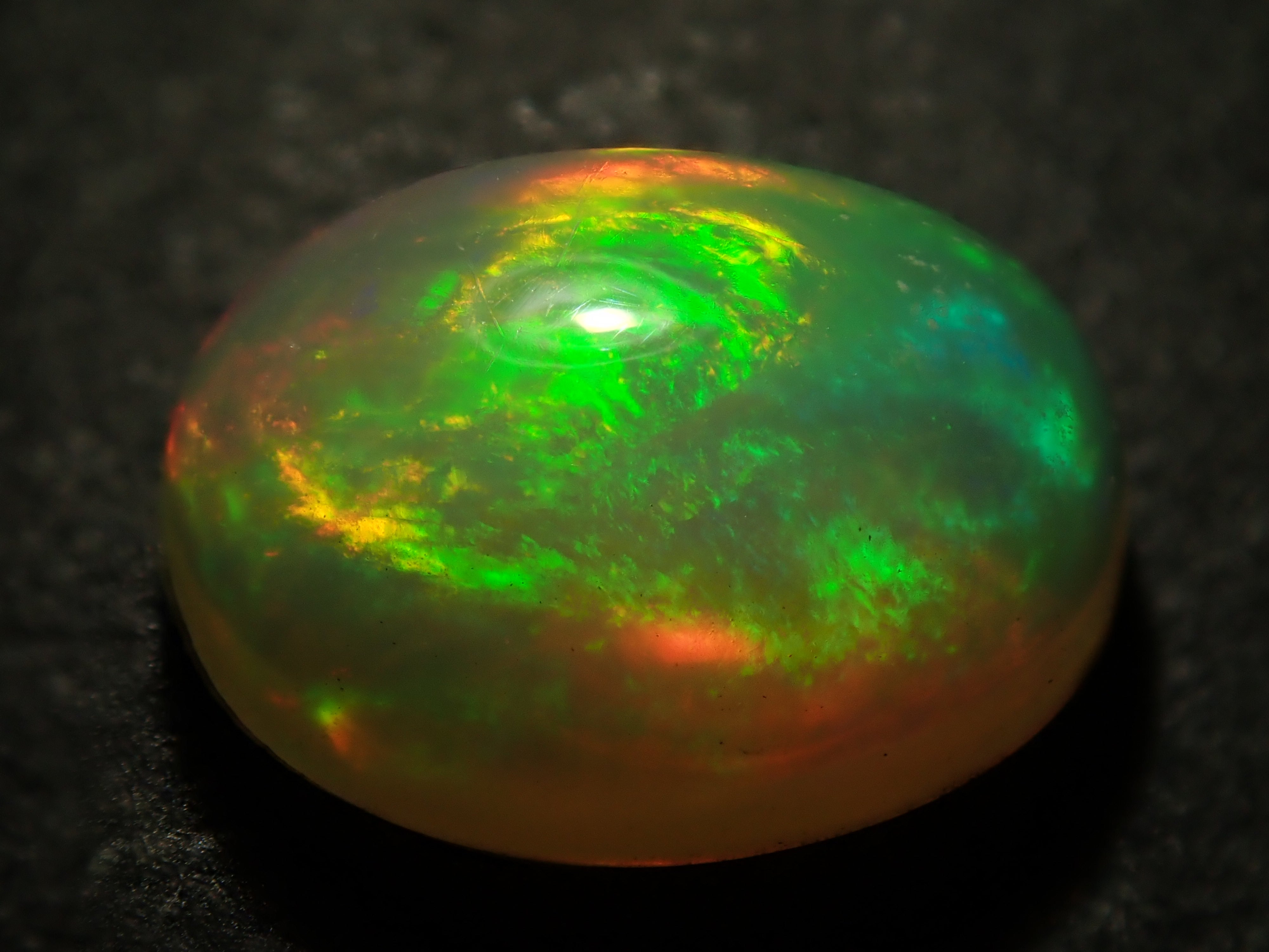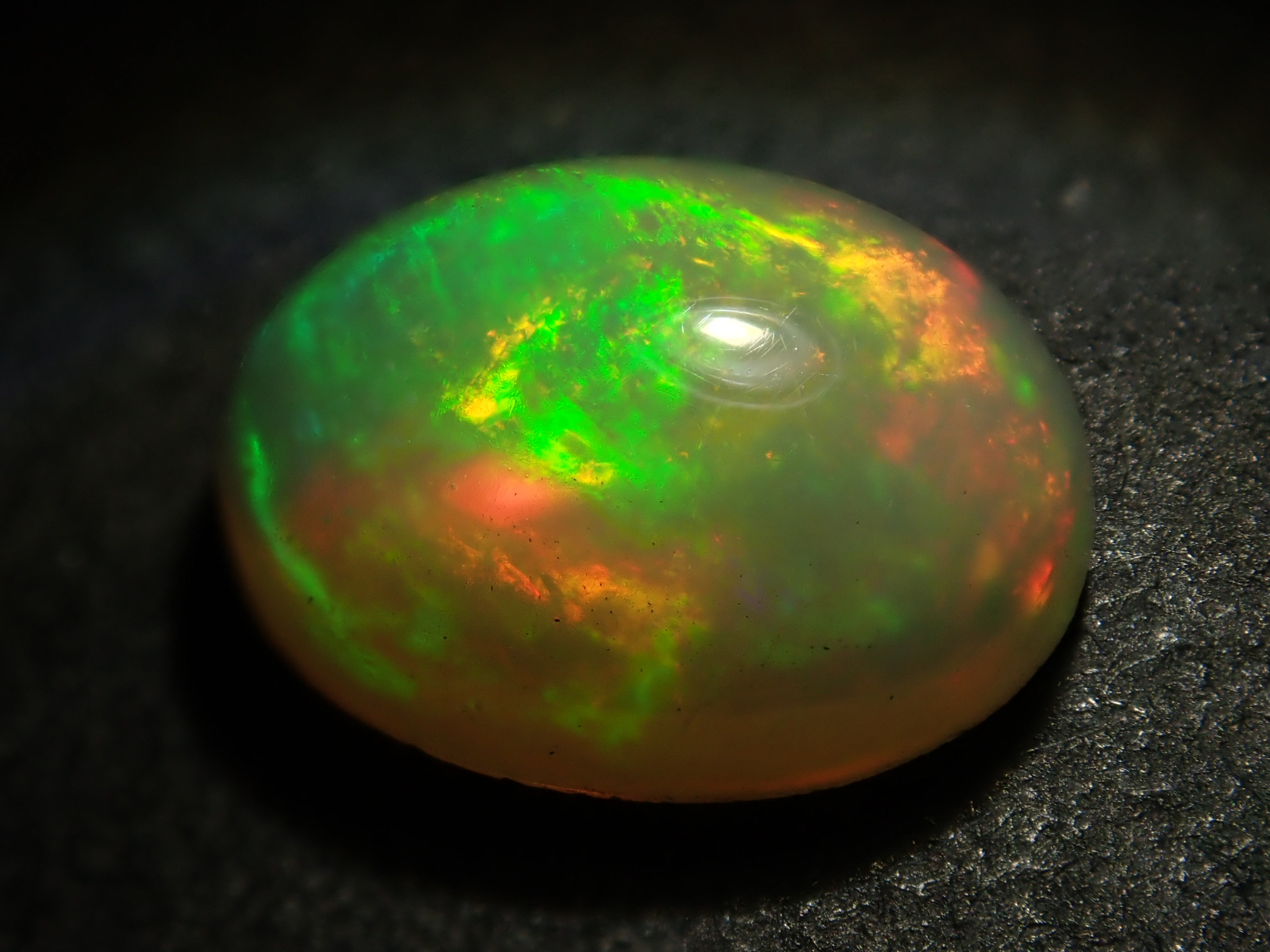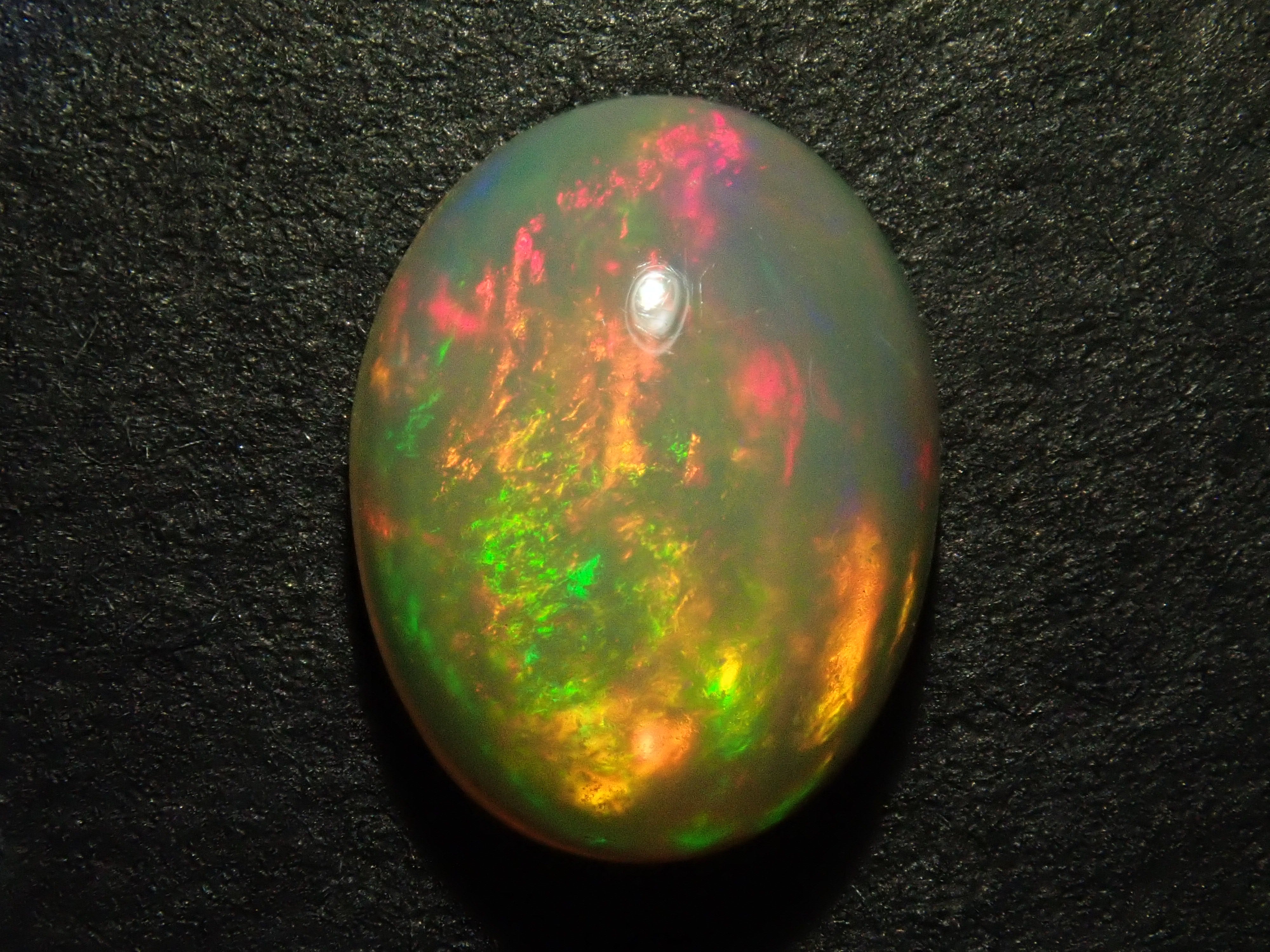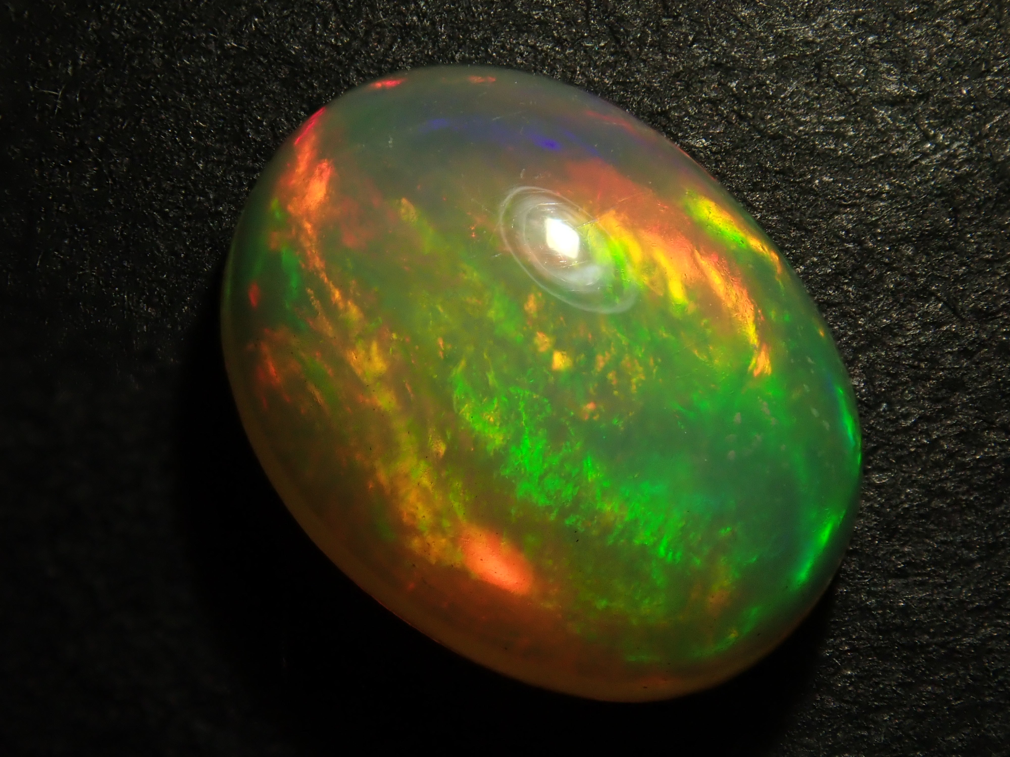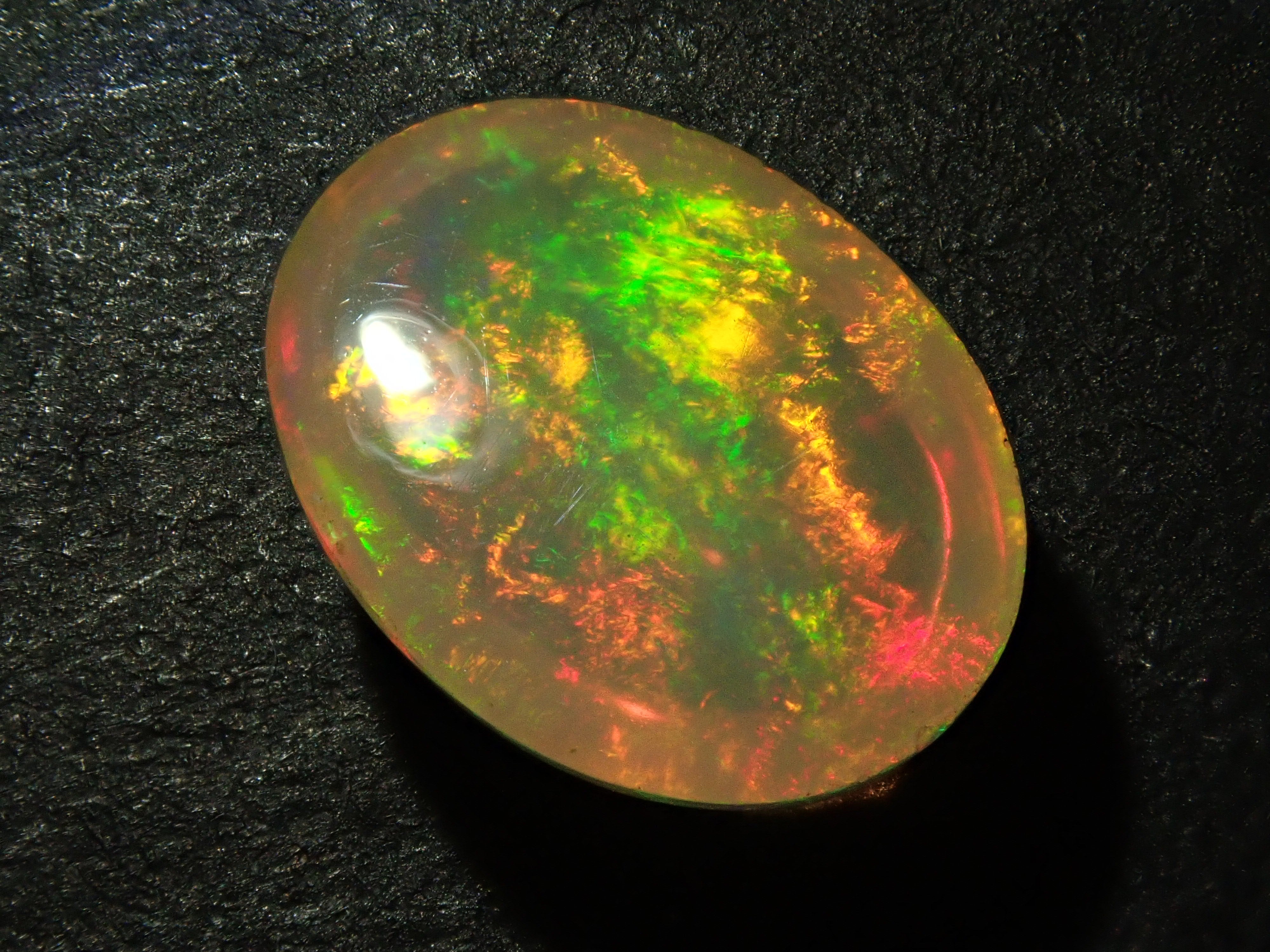 蛋白石是一種閃爍著彩虹色光芒的寶石。蛋白石是一種寶石,有許多不同的類型並具有多種表現形式。有些人被這種魅力所吸引,以至於只收集蛋白石。照片是使用筆燈拍攝的。
