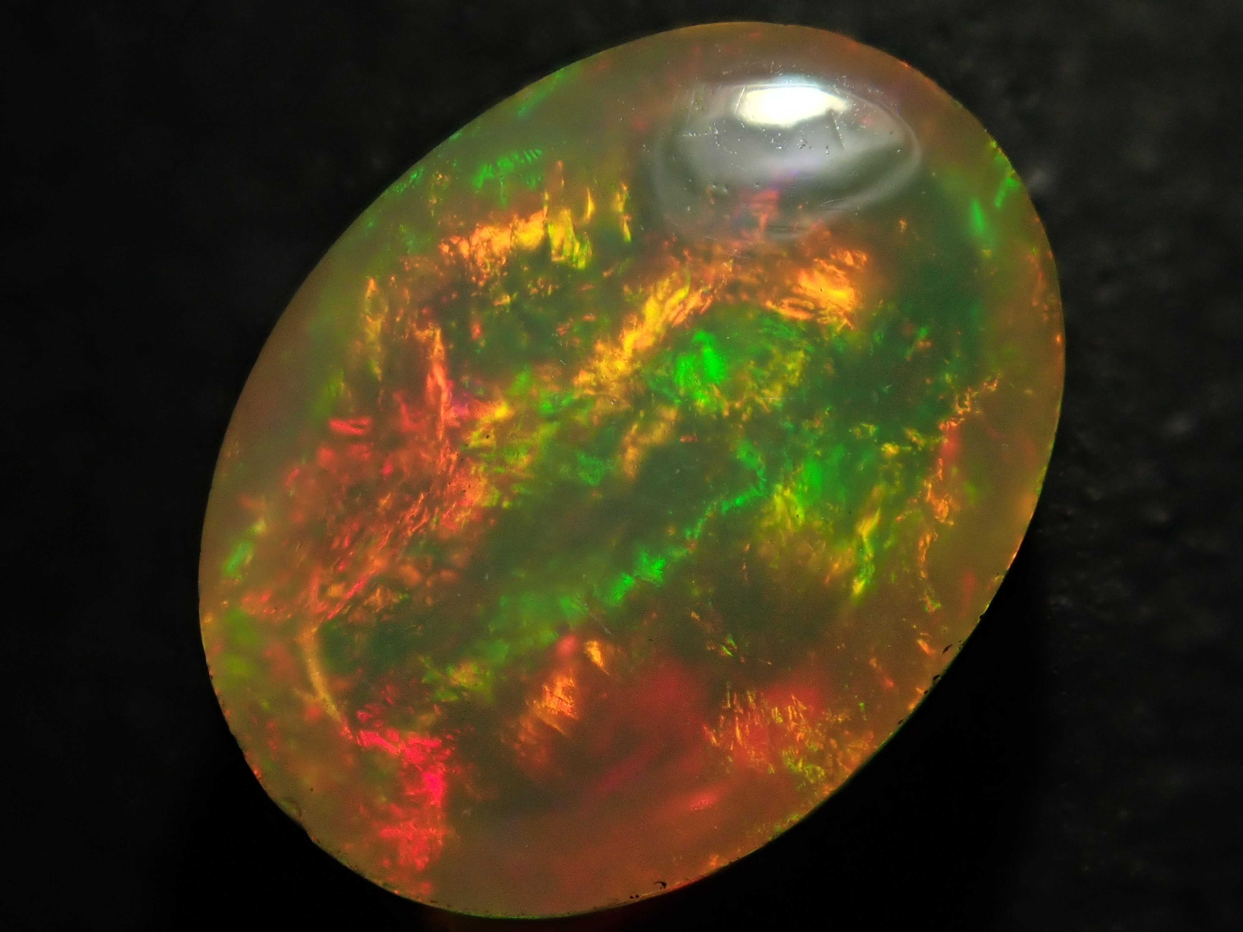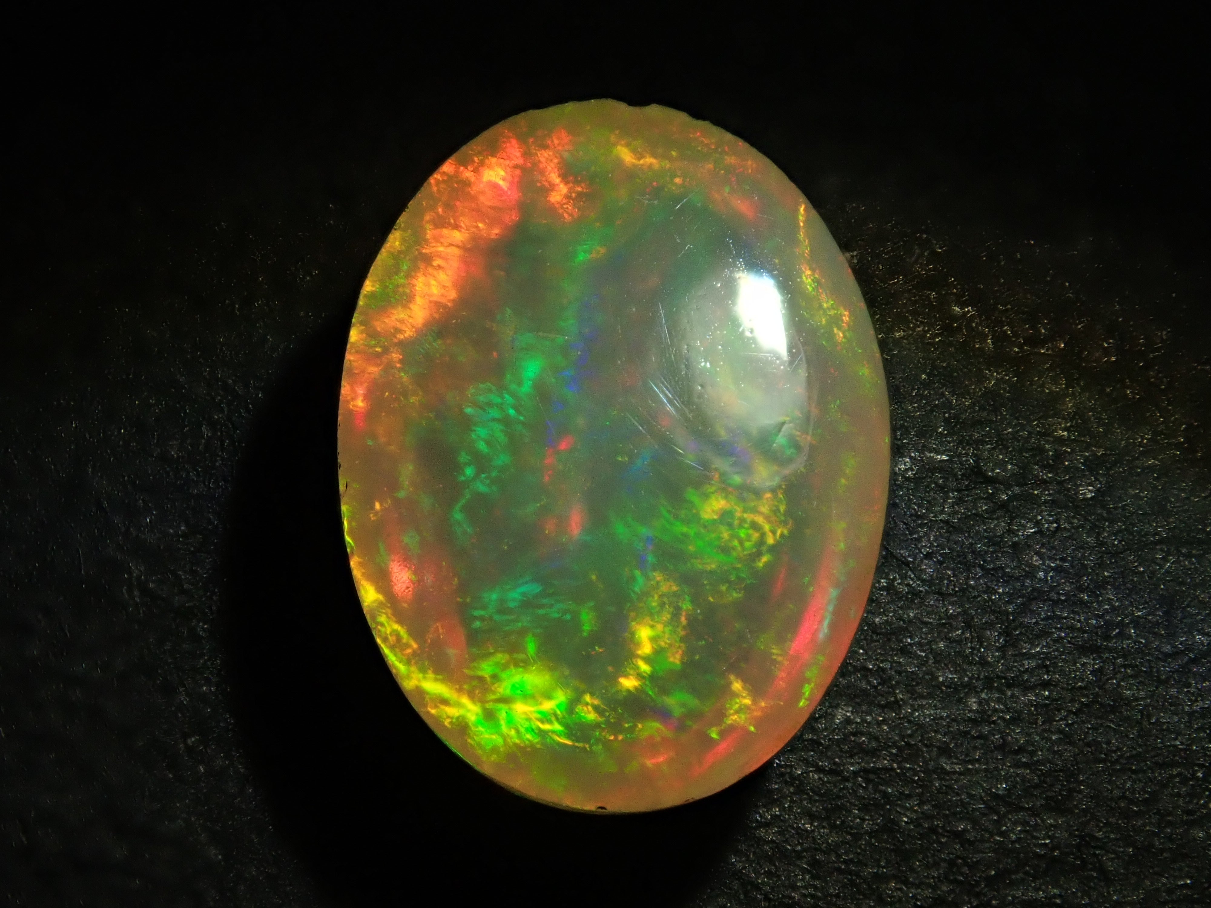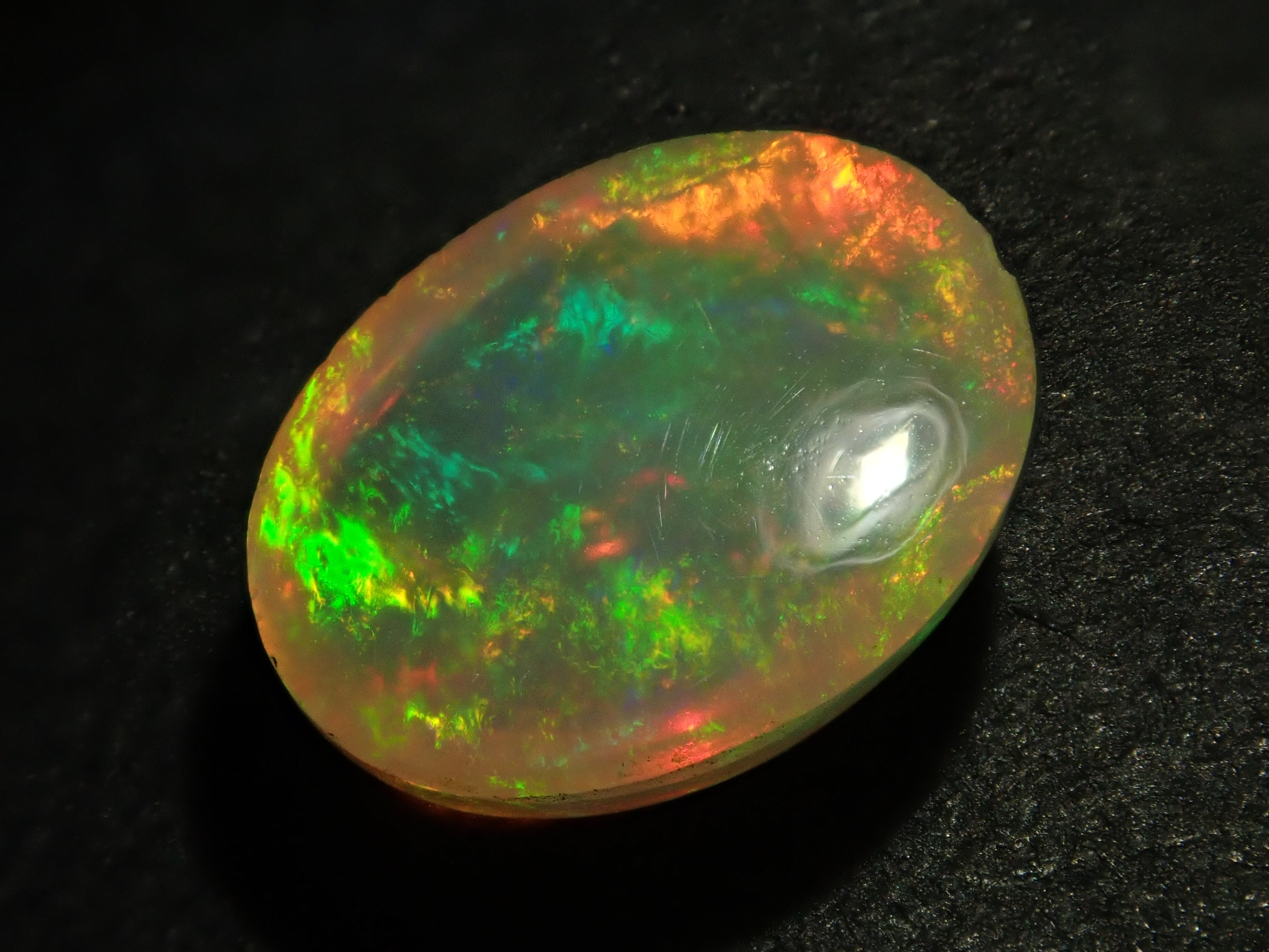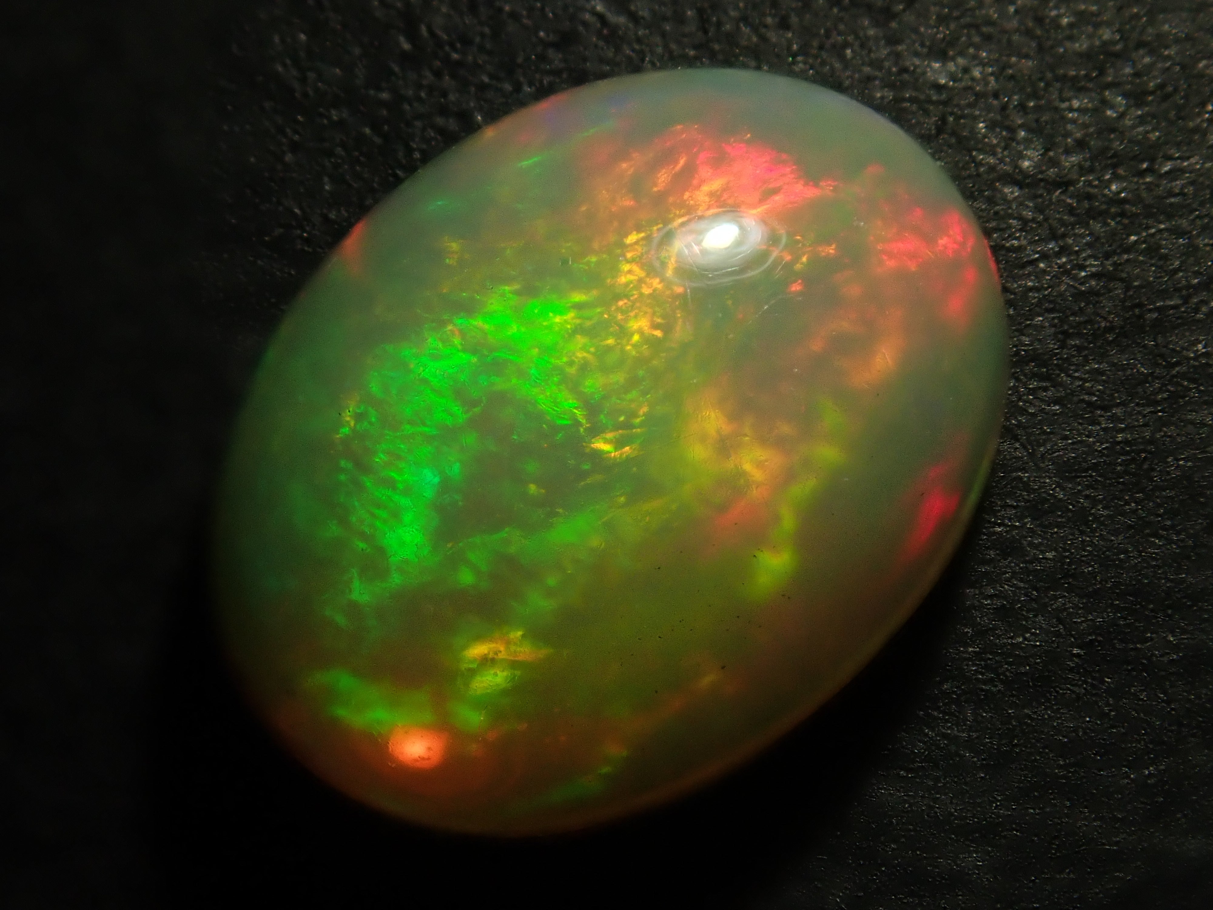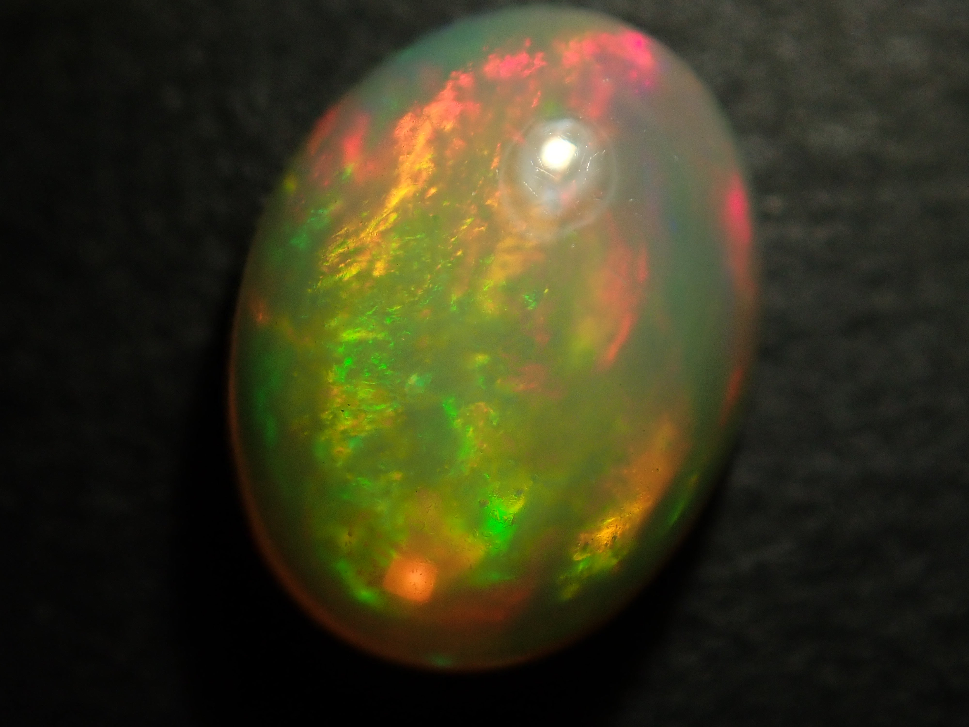 蛋白石是一種閃爍著彩虹色光芒的寶石。蛋白石是一種寶石,有許多不同的類型並具有多種表現形式。有些人被這種魅力所吸引,以至於只收集蛋白石。照片是使用筆燈拍攝的。