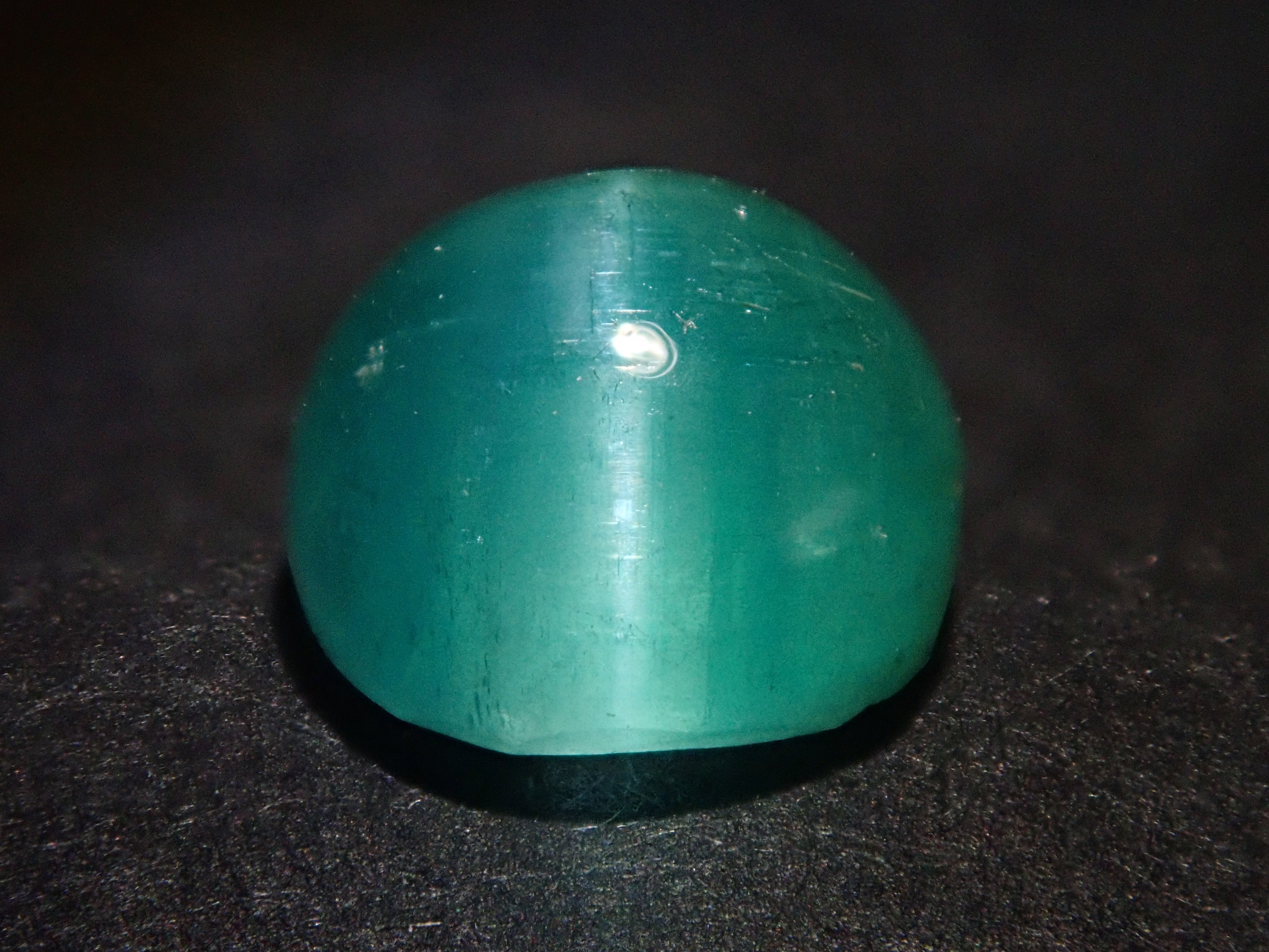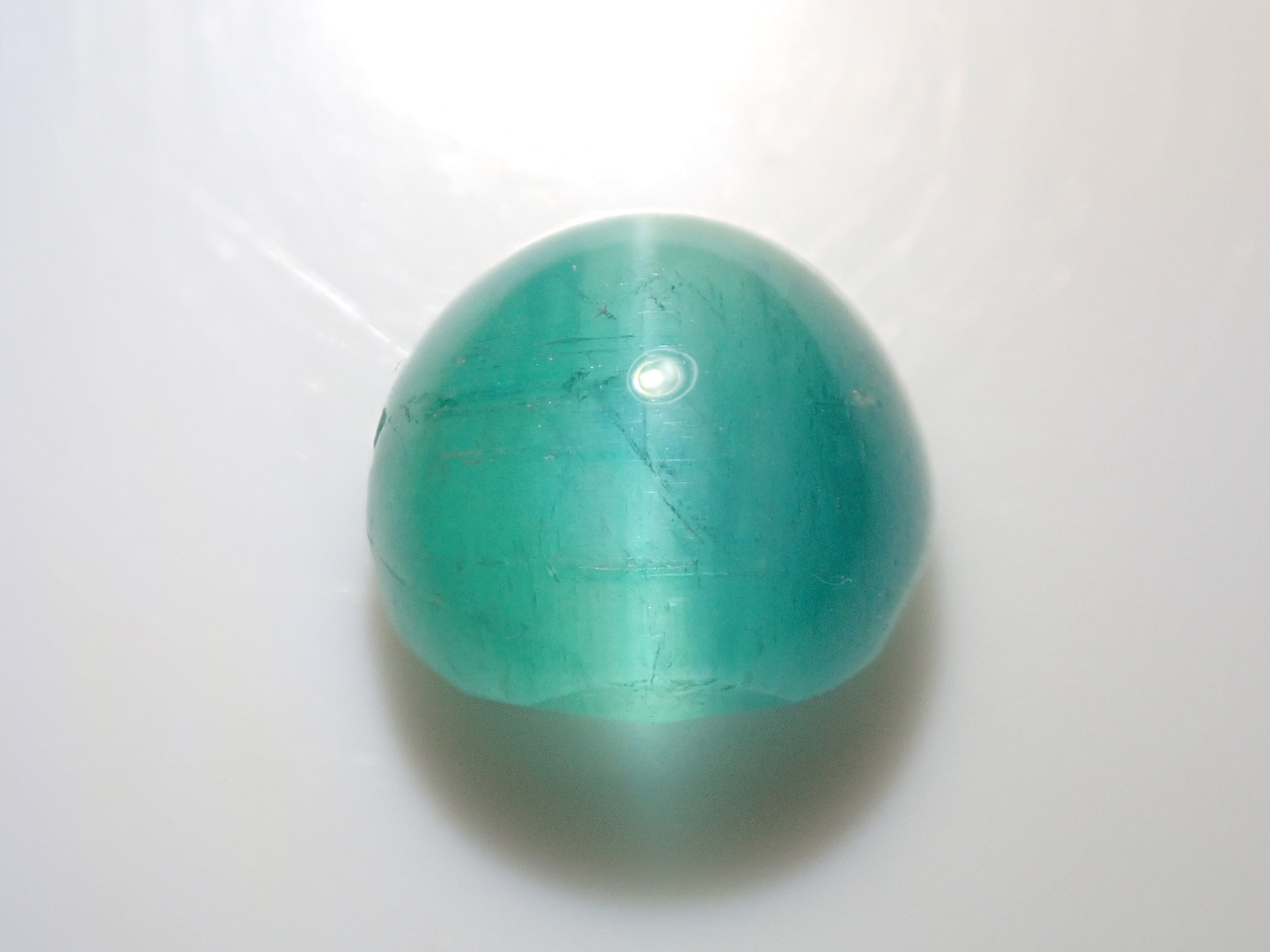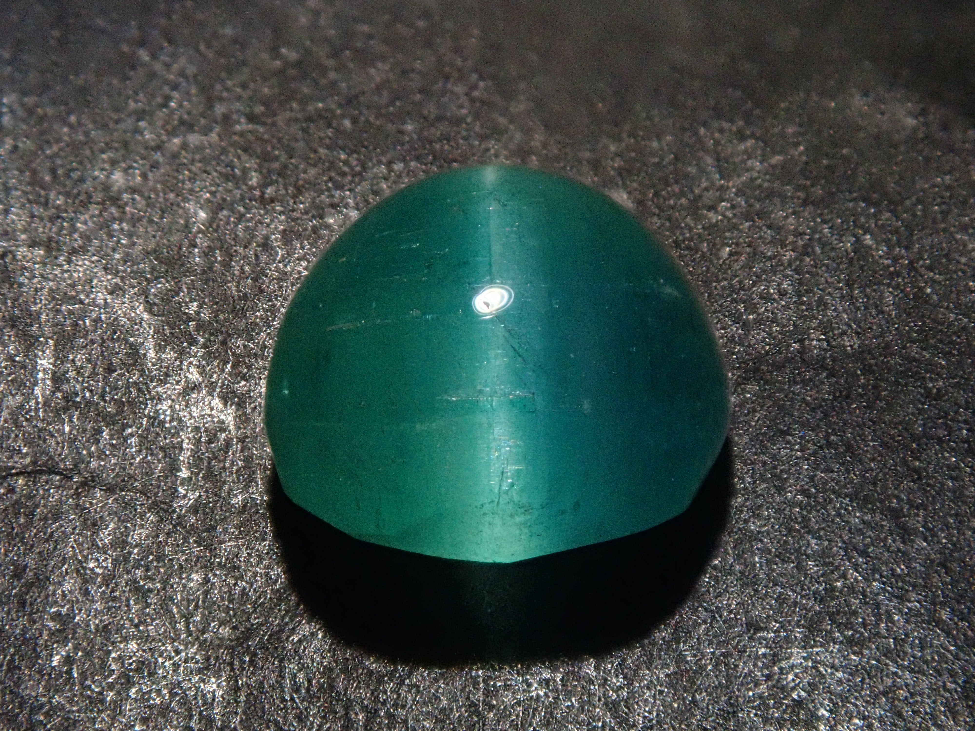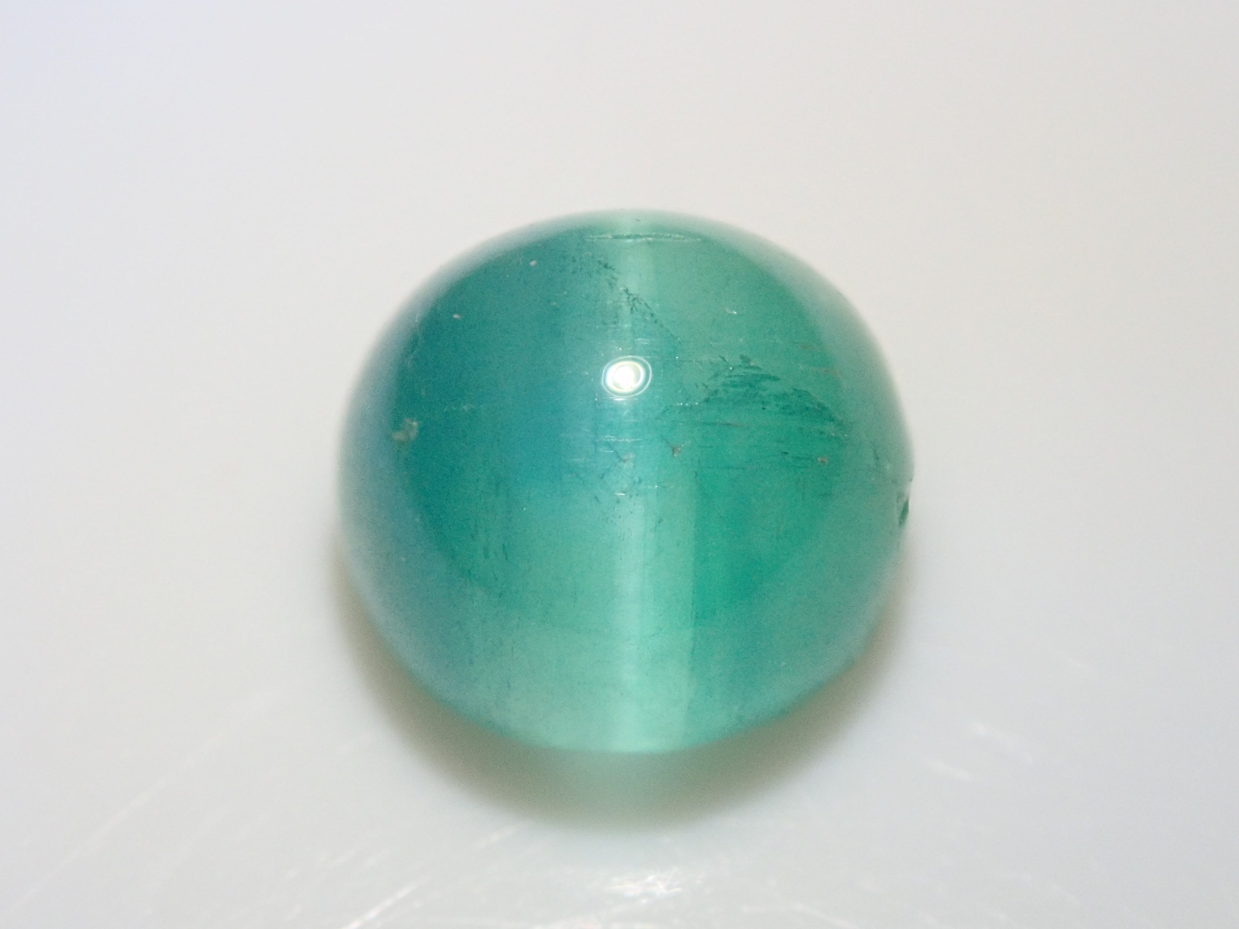 祖母綠是一種因受到埃及豔後克莉奧佩特拉的喜愛而聞名的寶石。它也是一塊有瑕疵的石頭,以至於有「無瑕疵的祖母綠與無瑕疵的人一樣少」之說。因此,通常使用油處理來使刮痕不那麼明顯。當暴露在光線下時,您可以看到貓眼效應(貓眼)。溫柔與清新融為一體的表情非常吸引人。照片是使用筆燈拍攝的。石頭的背面基本上是未拋光的。祖母綠貓眼石,重約 1 克拉。
