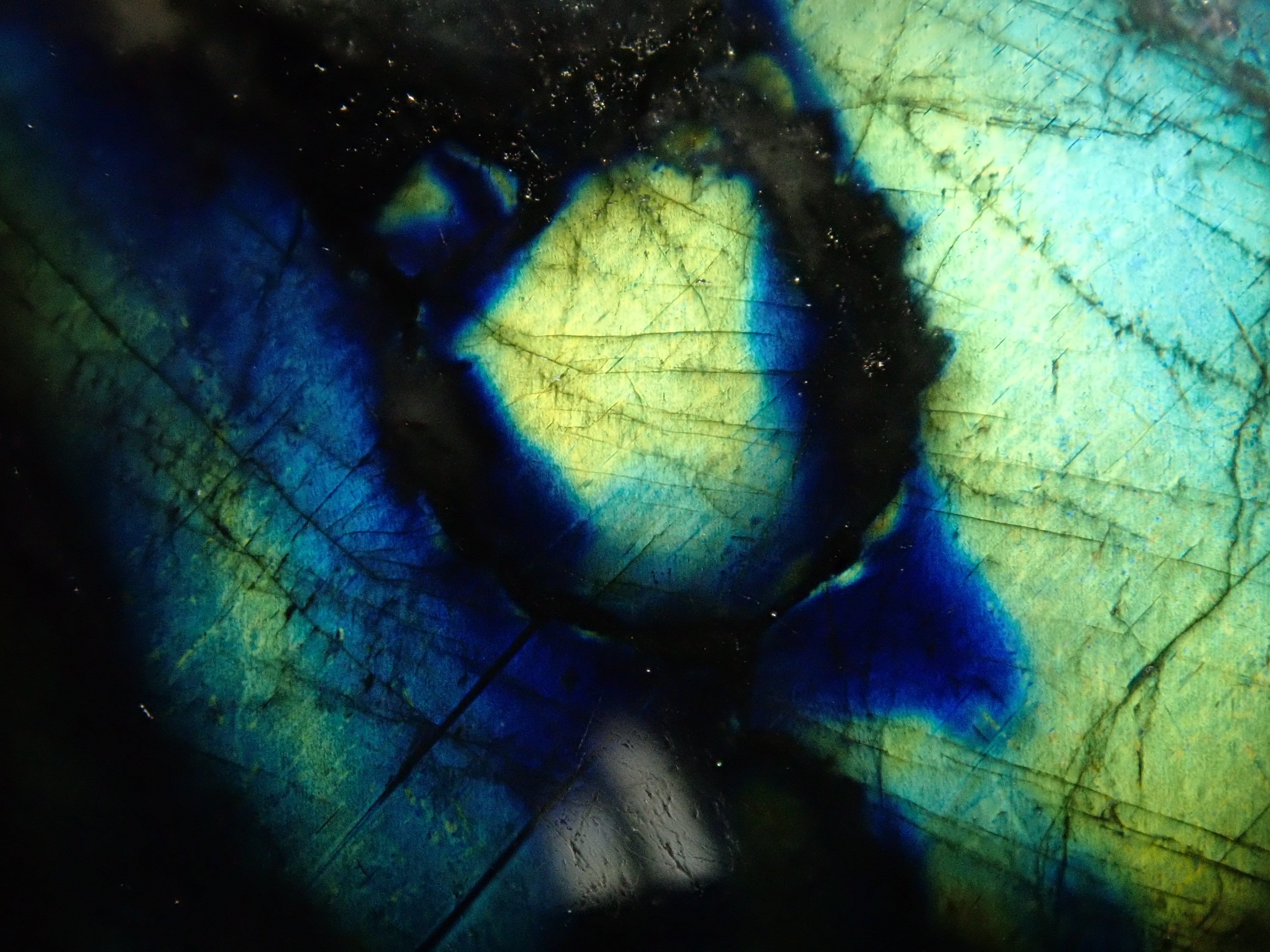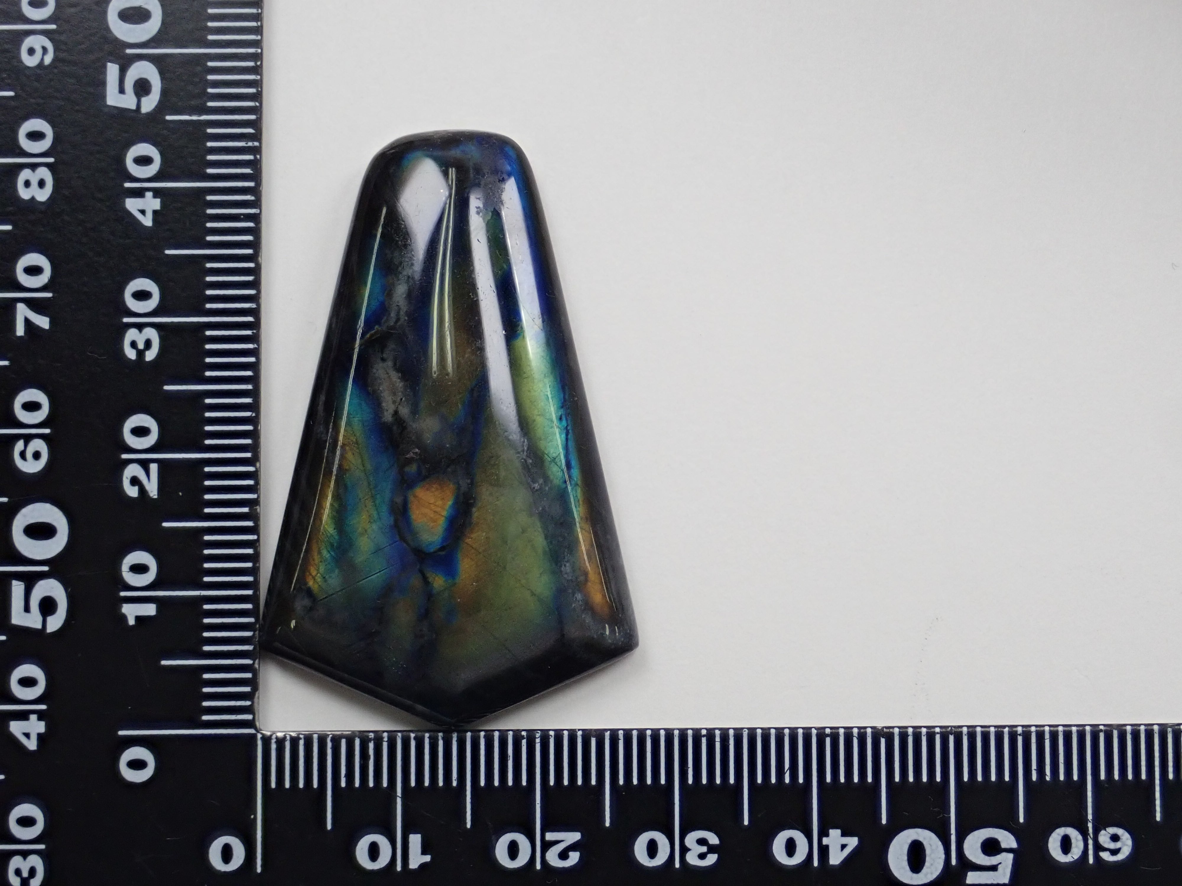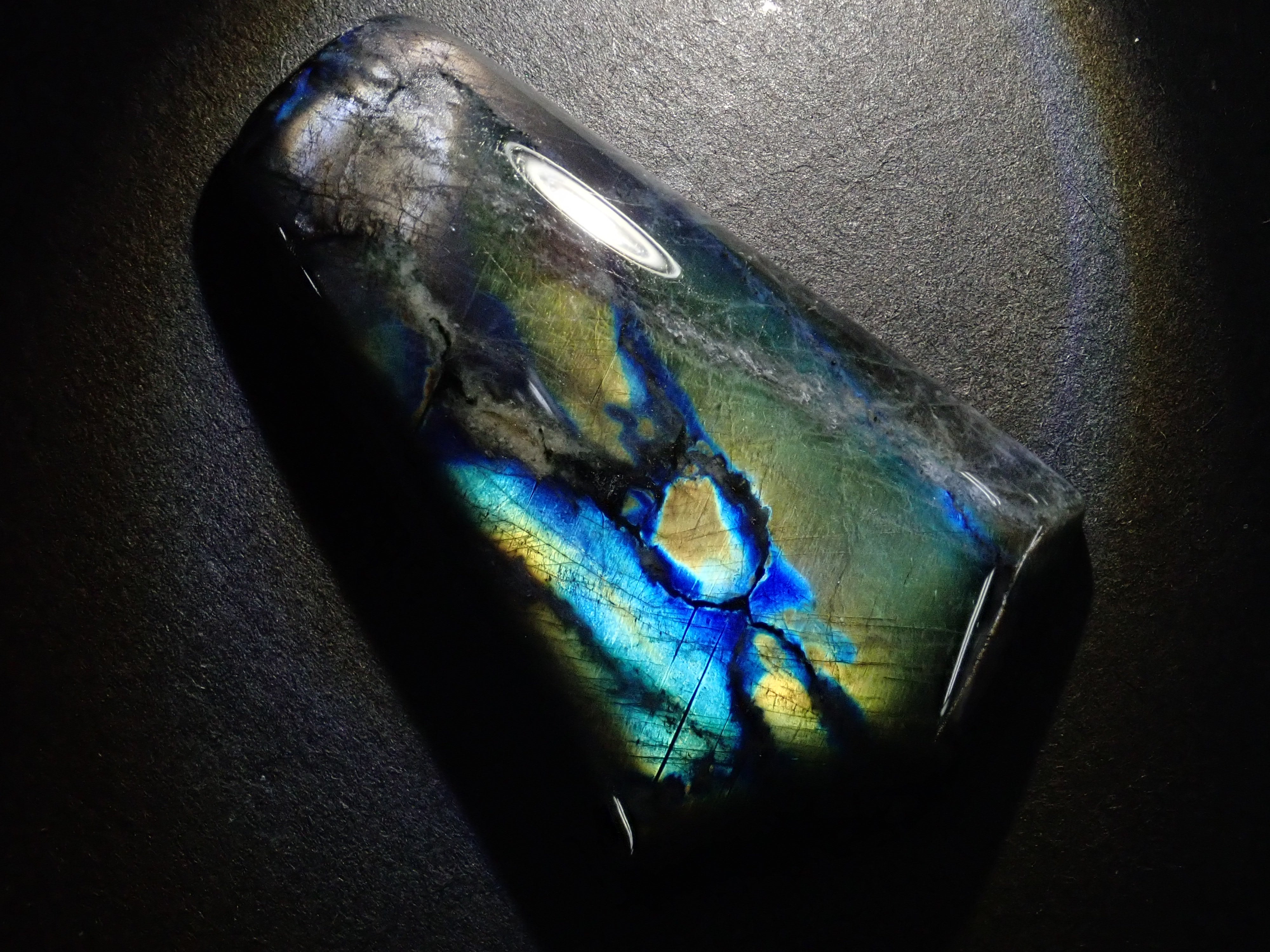 拉長石散發著柔和的光芒。拉長石主要有兩種:一種是光澤效果,另一種是彩虹色的閃光效果,被稱為拉長石光彩。請欣賞它美麗的光學效果。這是一種名為「光譜石」的拉長石,會發出美麗的光芒,產自芬蘭。請欣賞這顆高品質的拉長石。