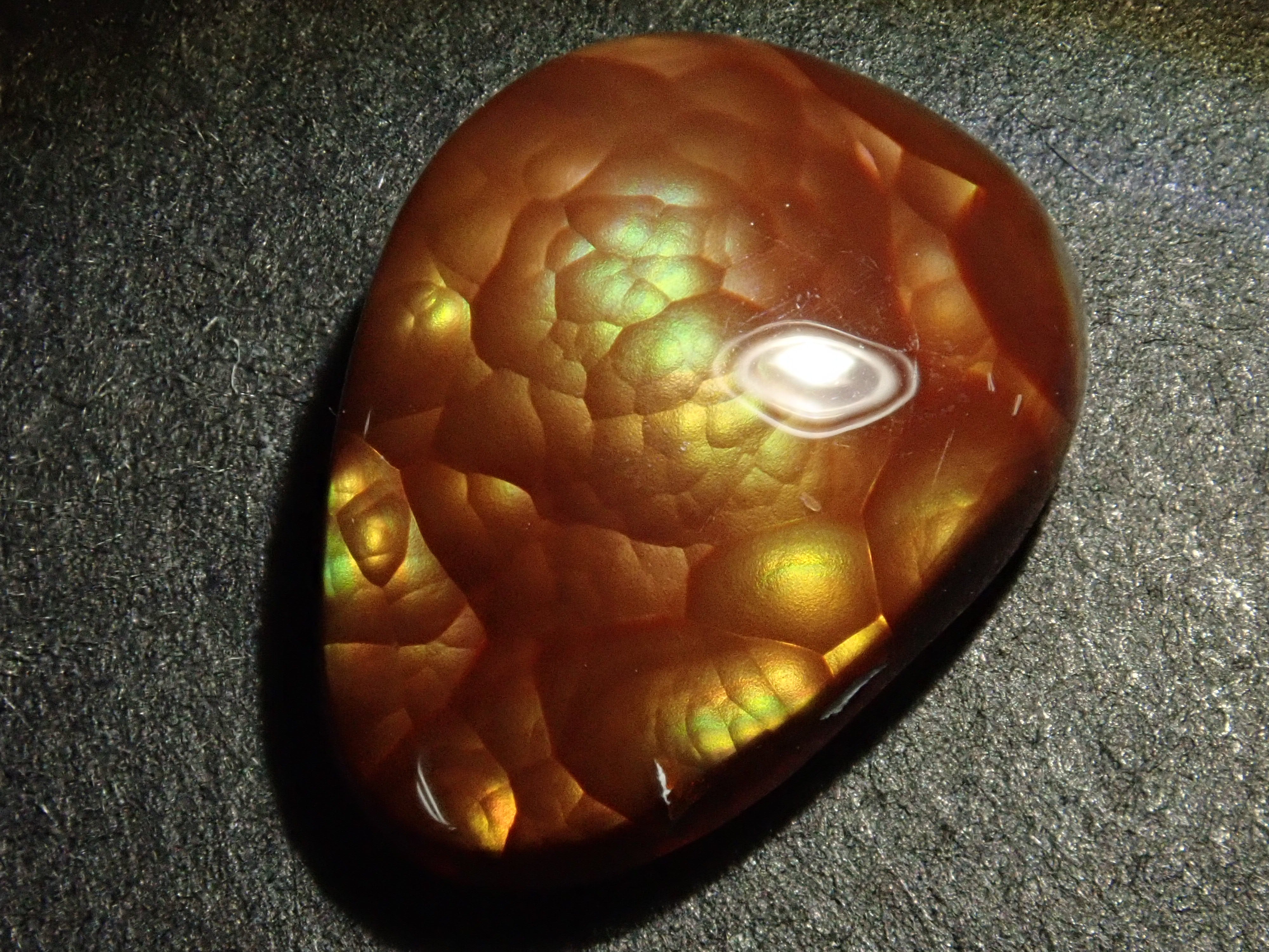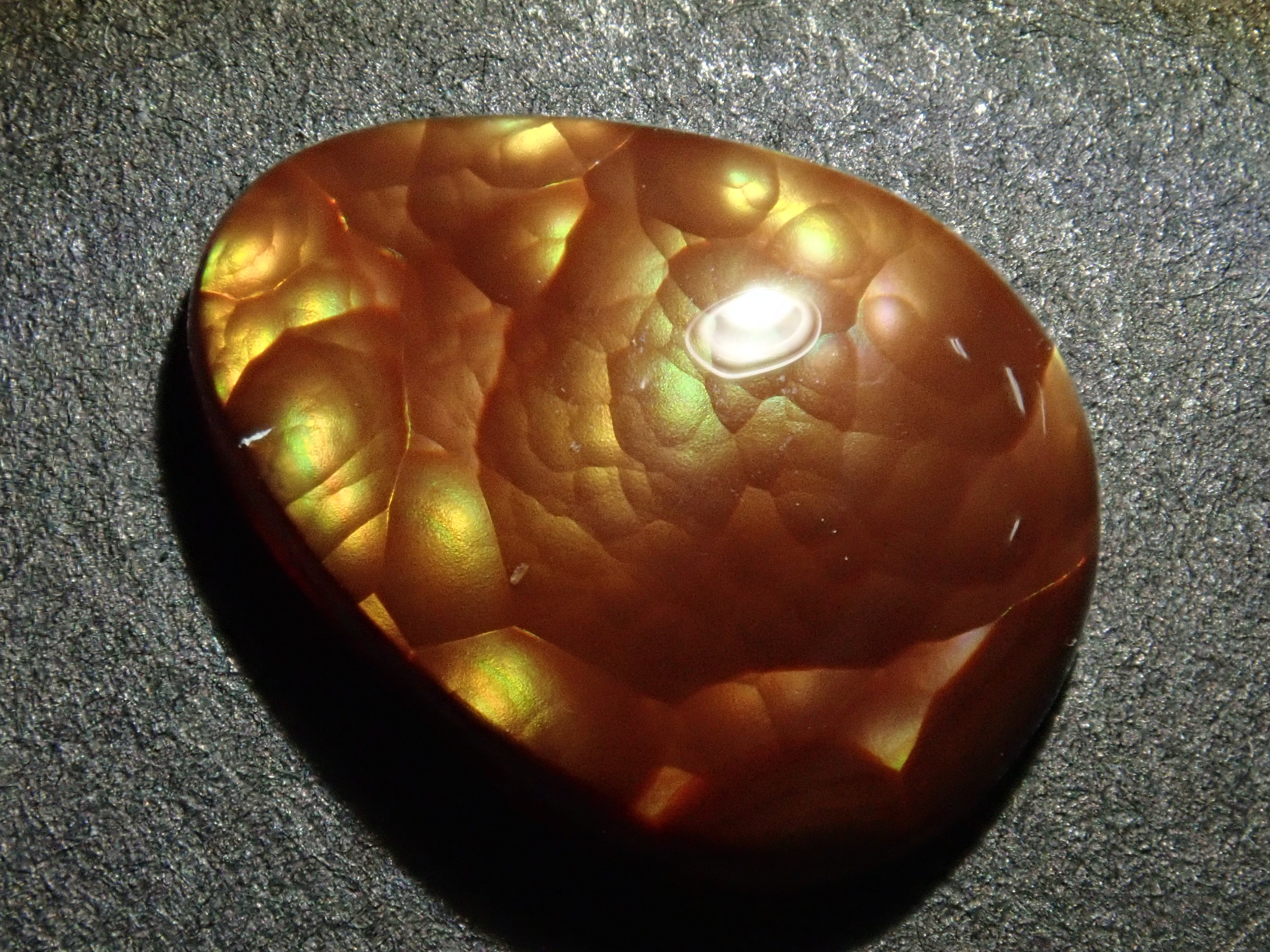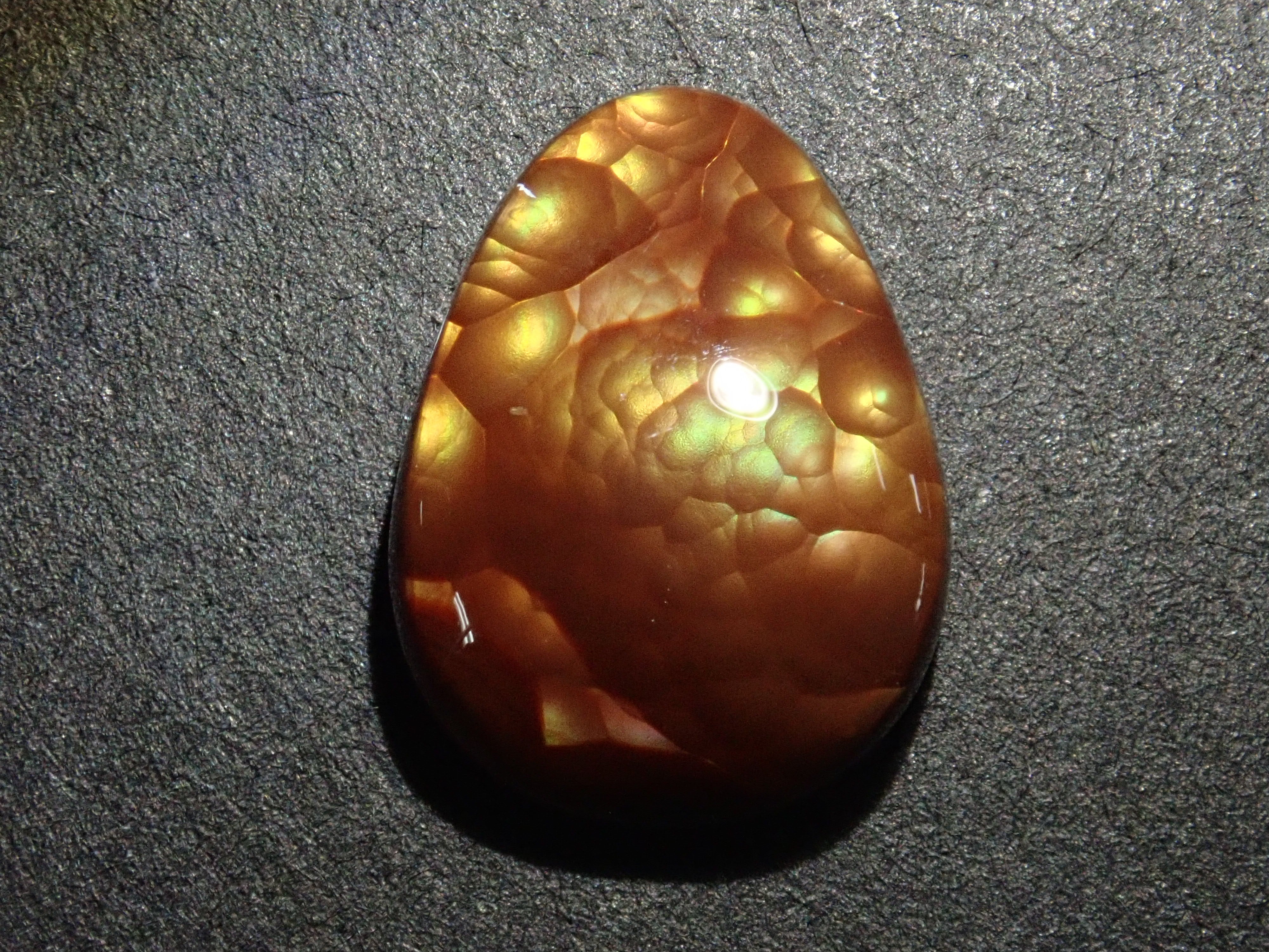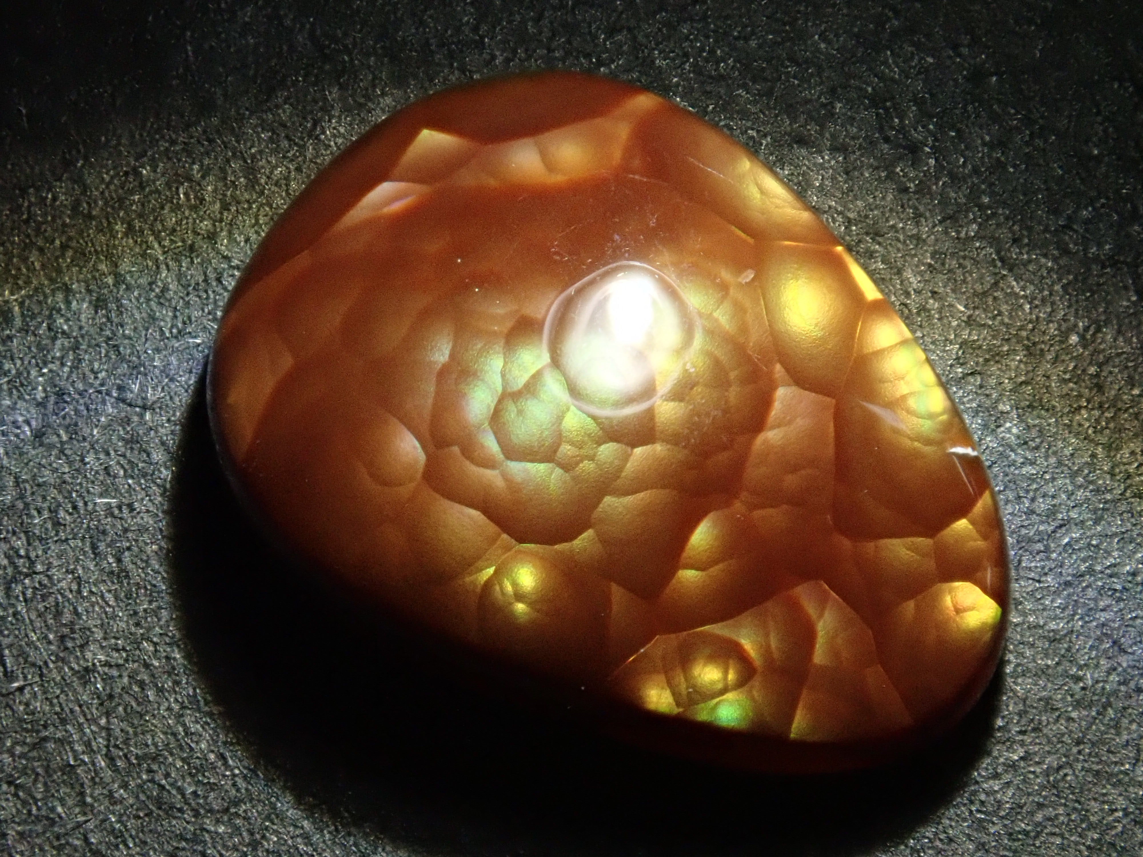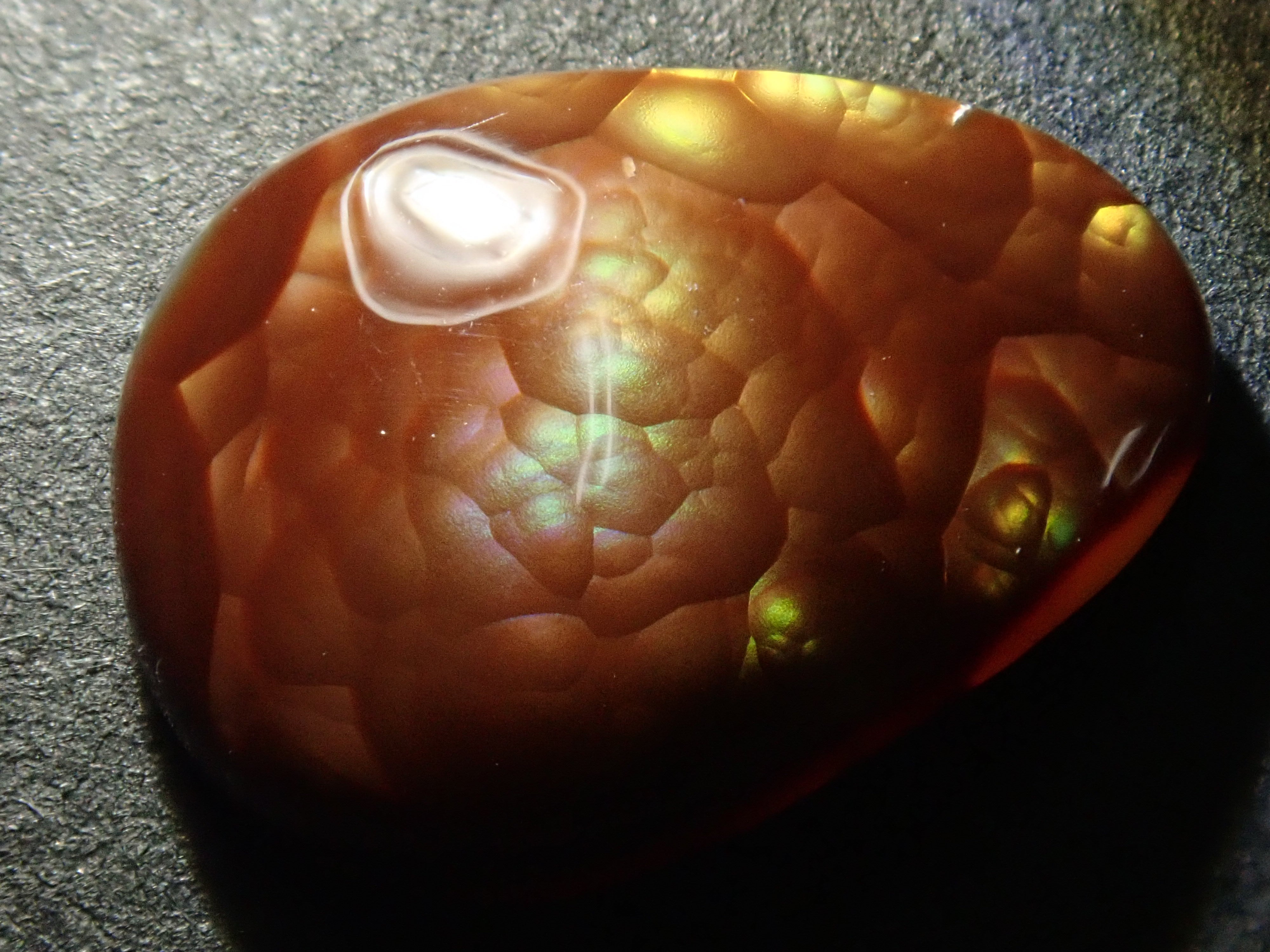 這塊石頭給人一種微微冰涼的感覺,彷彿裡面正在生長著細胞膜。它的名字叫火瑪瑙。當你改變角度時,會出現彩虹色的彩虹,真是太棒了。如果你仔細觀察,你就會被吸引進去。