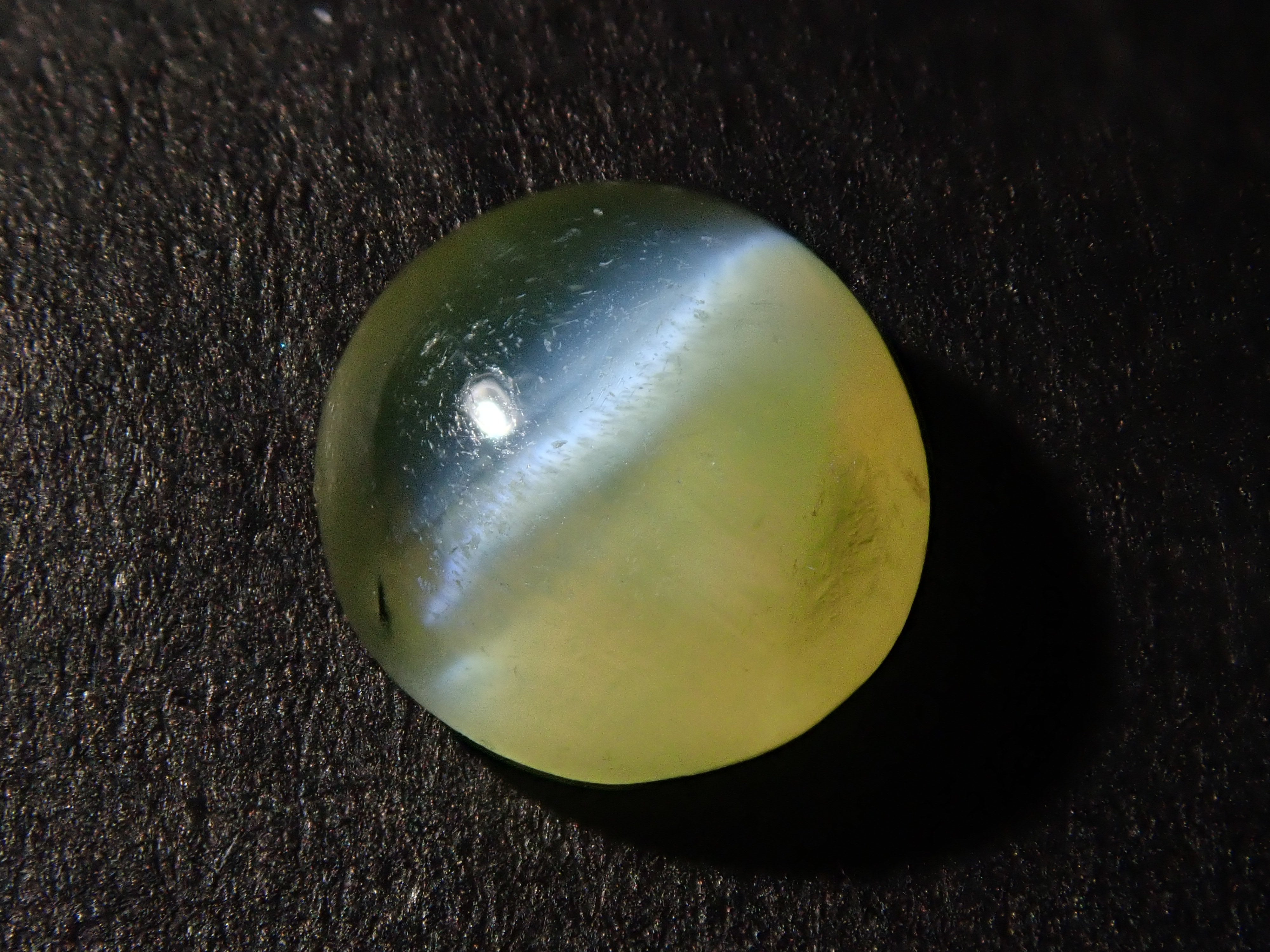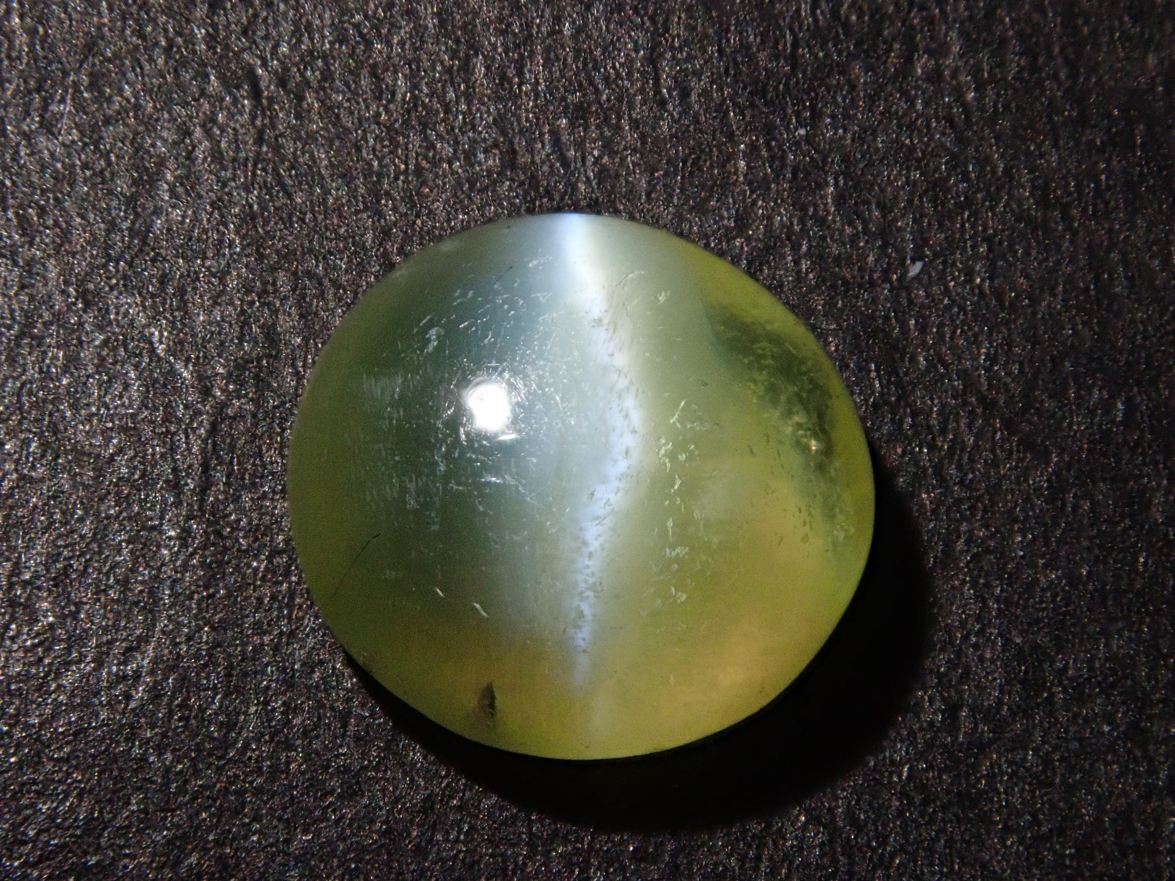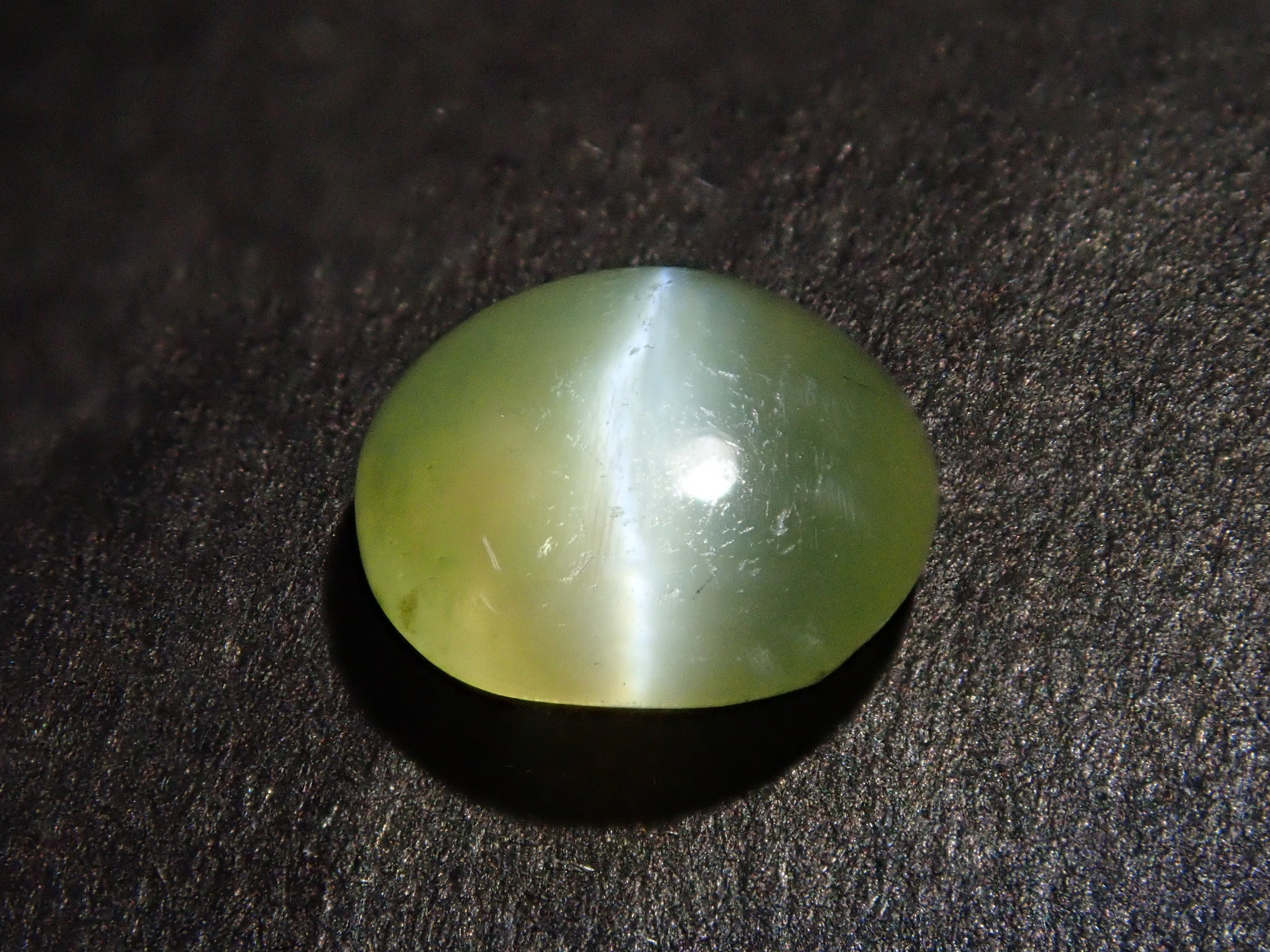 金綠寶石是一種有多種色調的寶石,從淺黃色到綠色再到深棕色。它是一種堅硬耐用的寶石。這是可以看到貓眼效果的類型,使用筆燈拍攝。石頭的背面基本上是未拋光的。