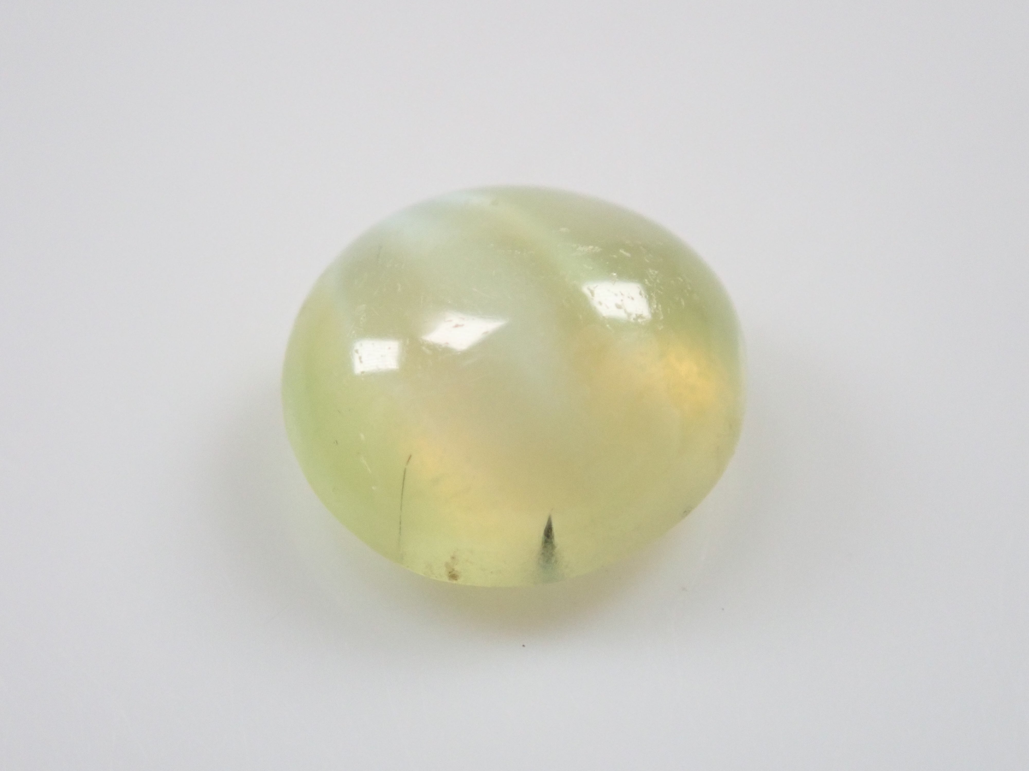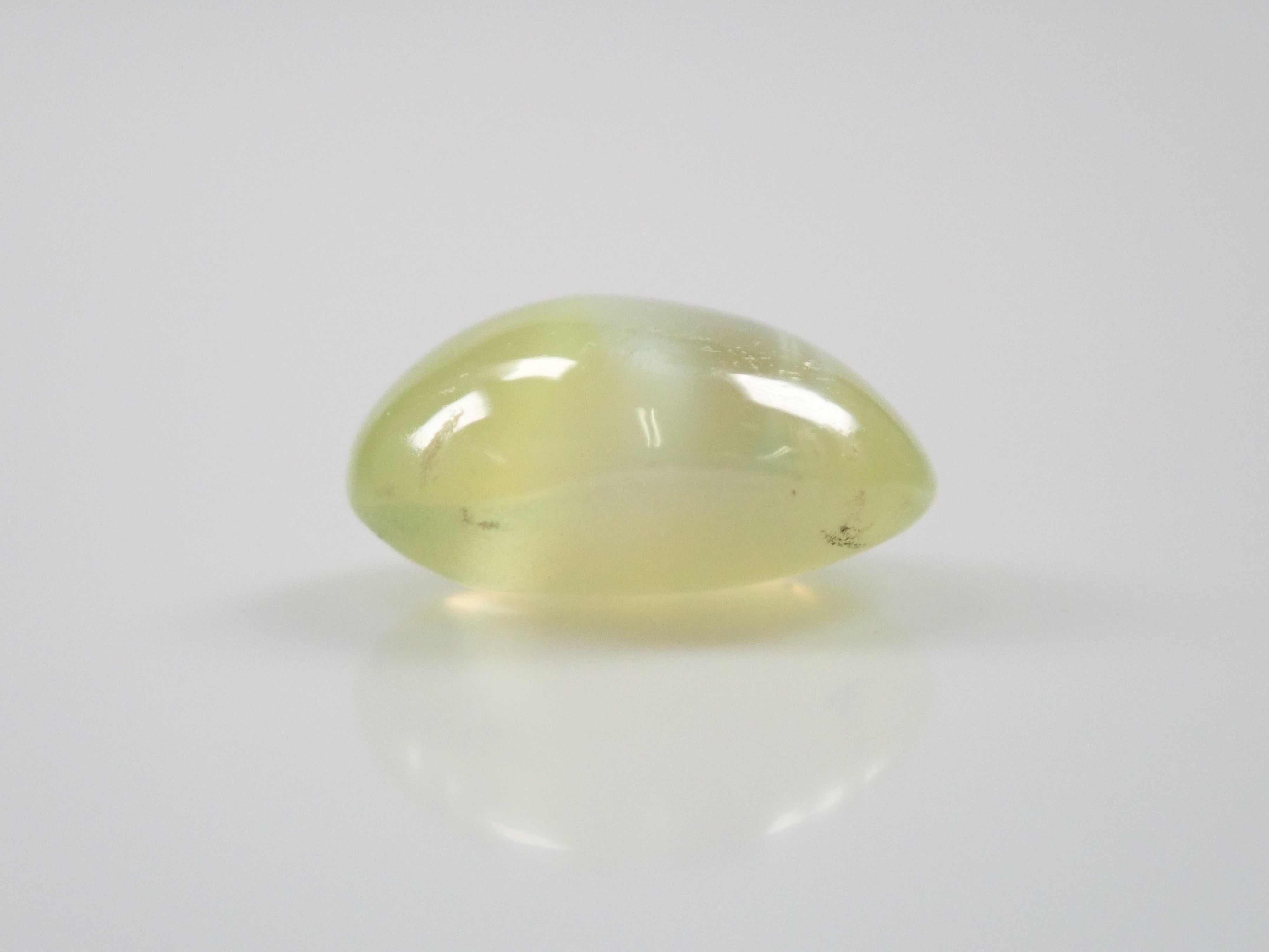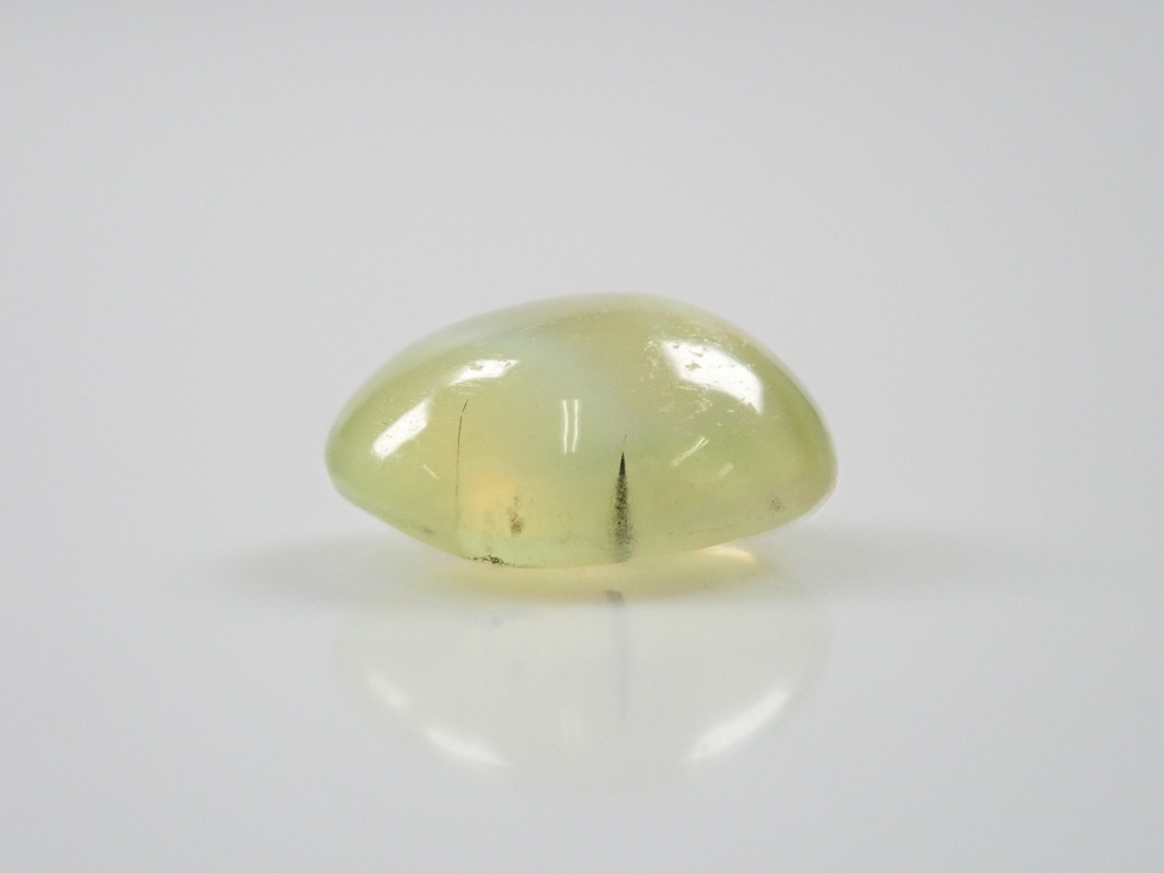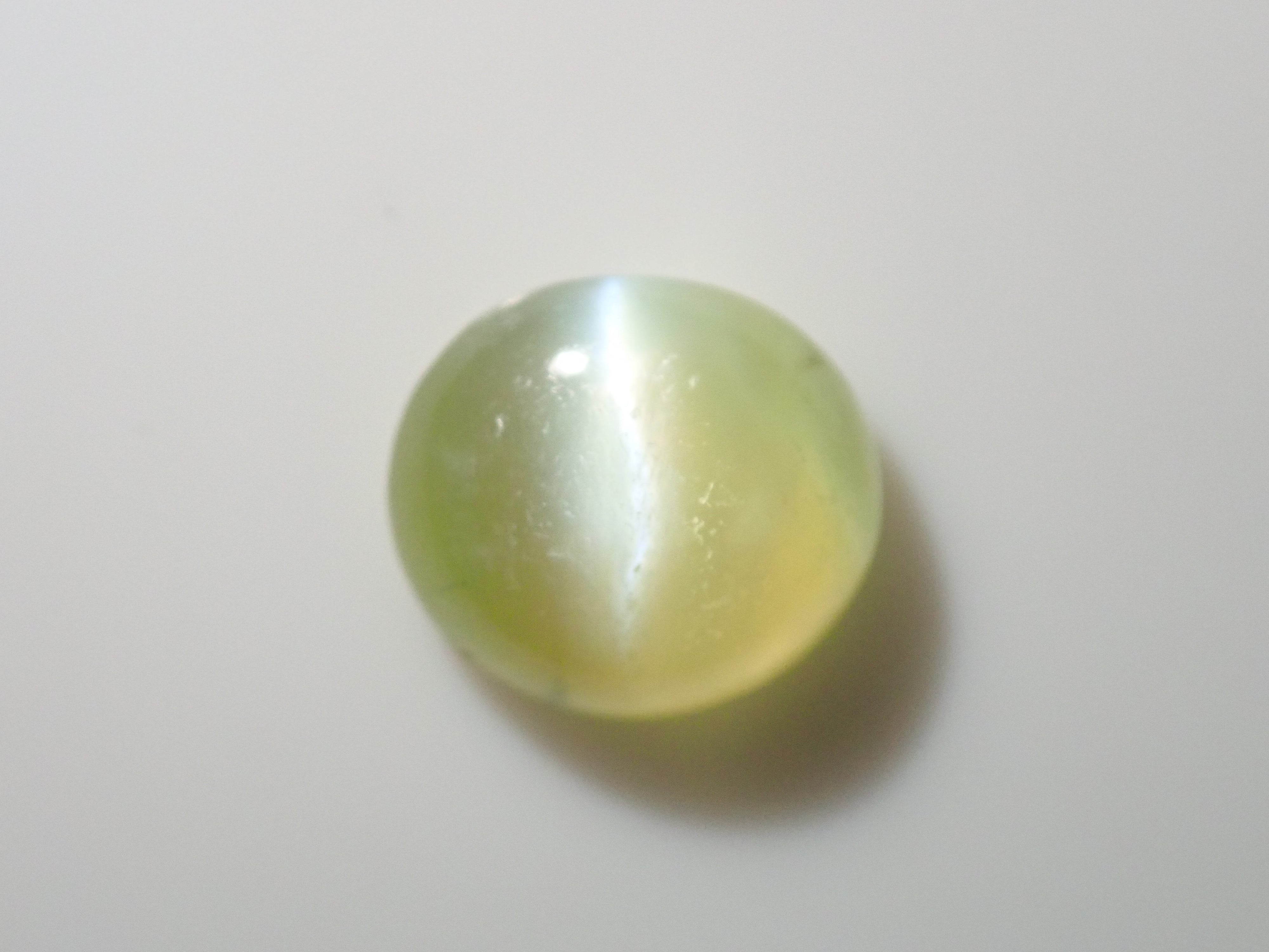 金綠寶石是一種有多種色調的寶石,從淺黃色到綠色再到深棕色。它是一種堅硬耐用的寶石。這是可以看到貓眼效果的類型,使用筆燈拍攝。石頭的背面基本上是未拋光的。