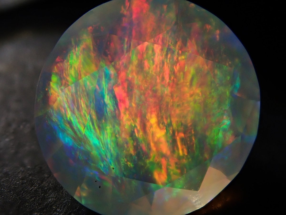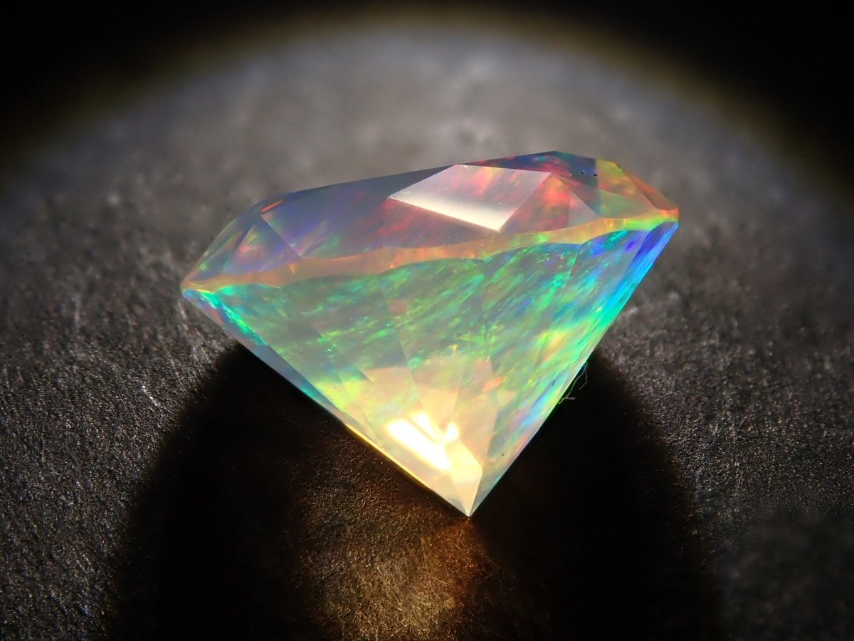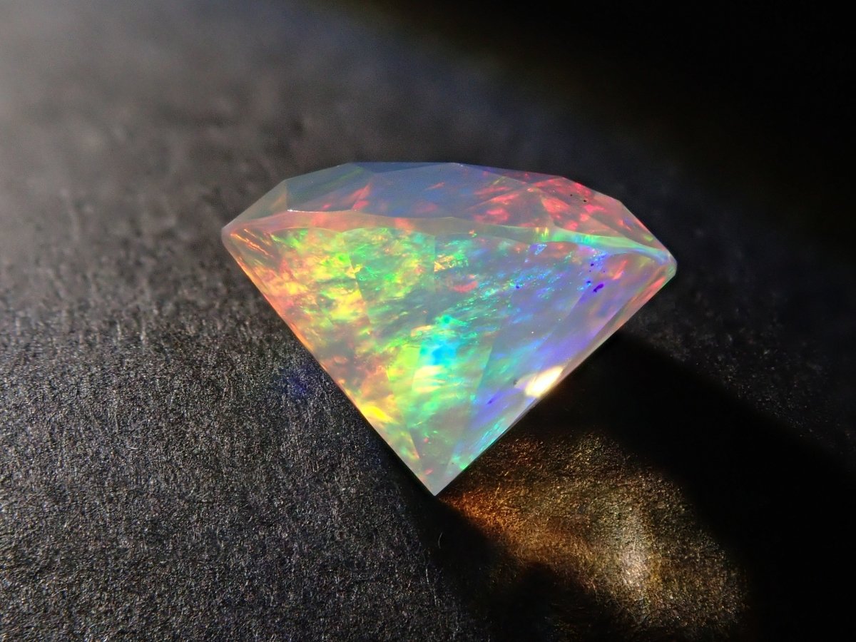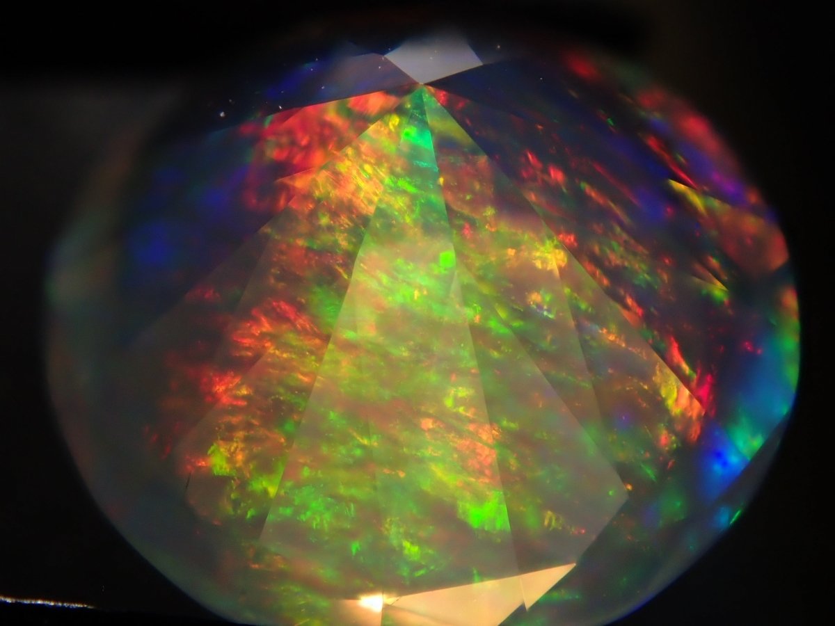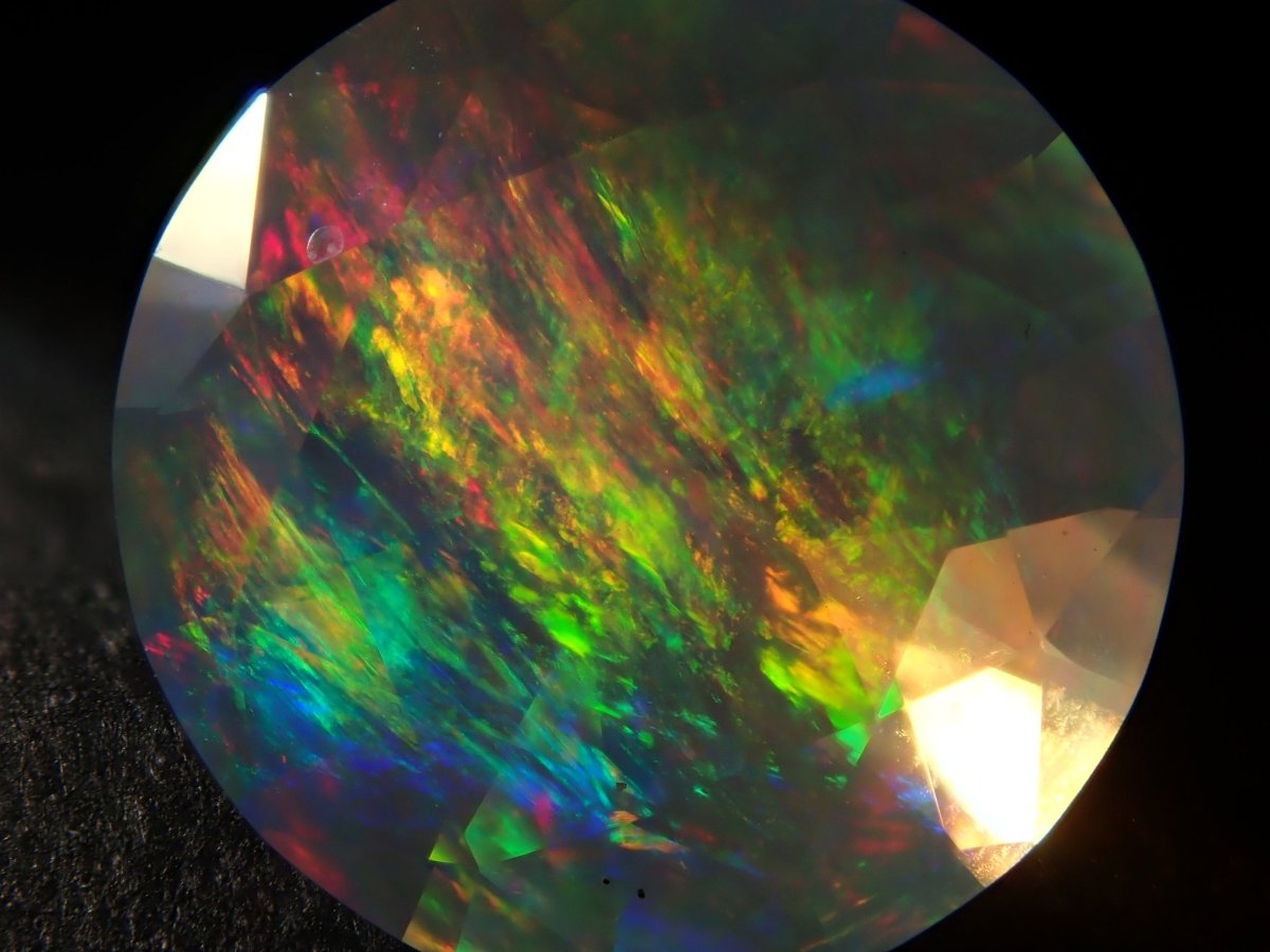 蛋白石是一種閃爍著彩虹色光芒的寶石。蛋白石是一種寶石,有許多不同的類型並具有多種表現形式。有些人被這種魅力所吸引,以至於只收集蛋白石。照片是使用筆燈拍攝的。