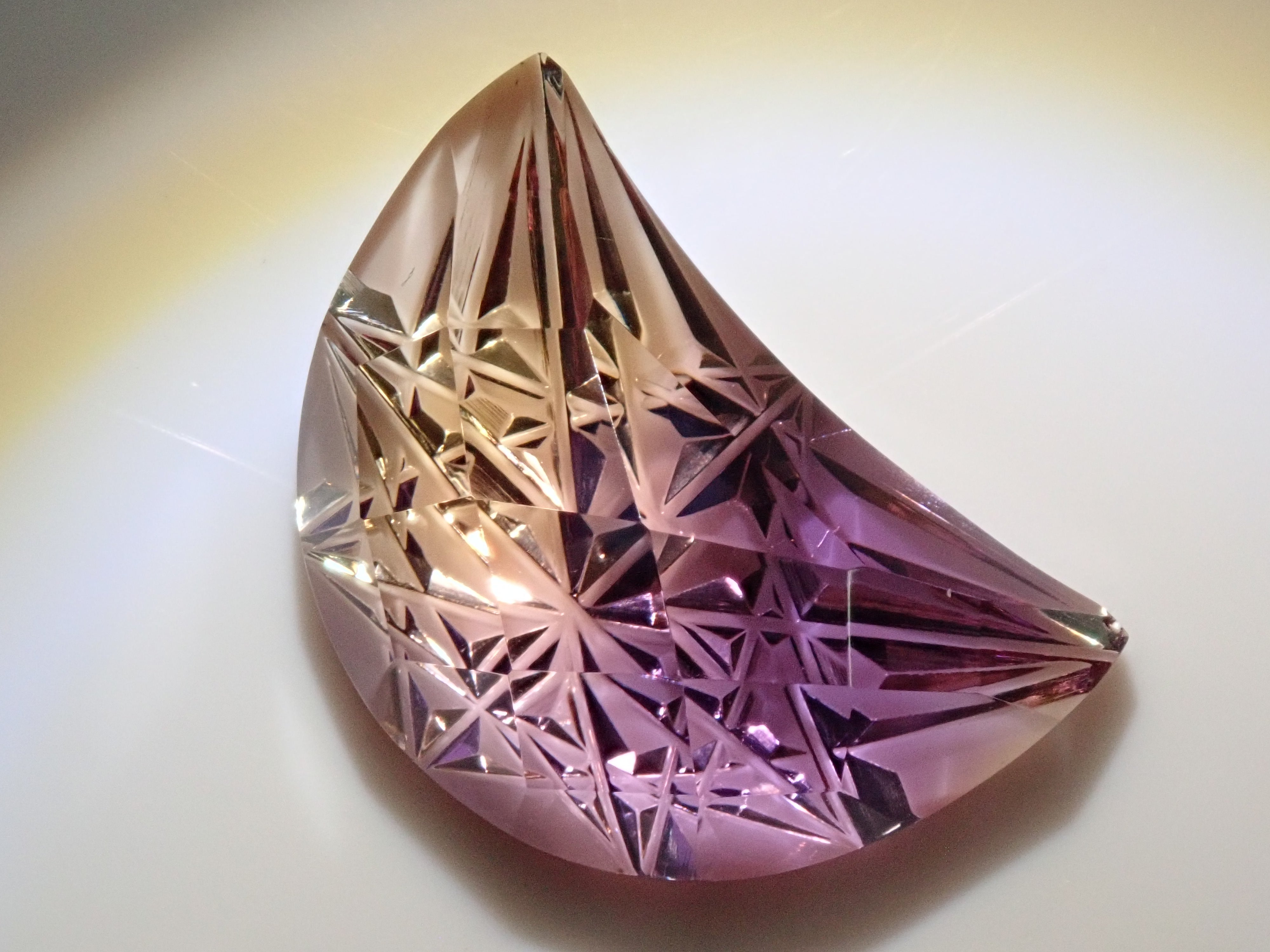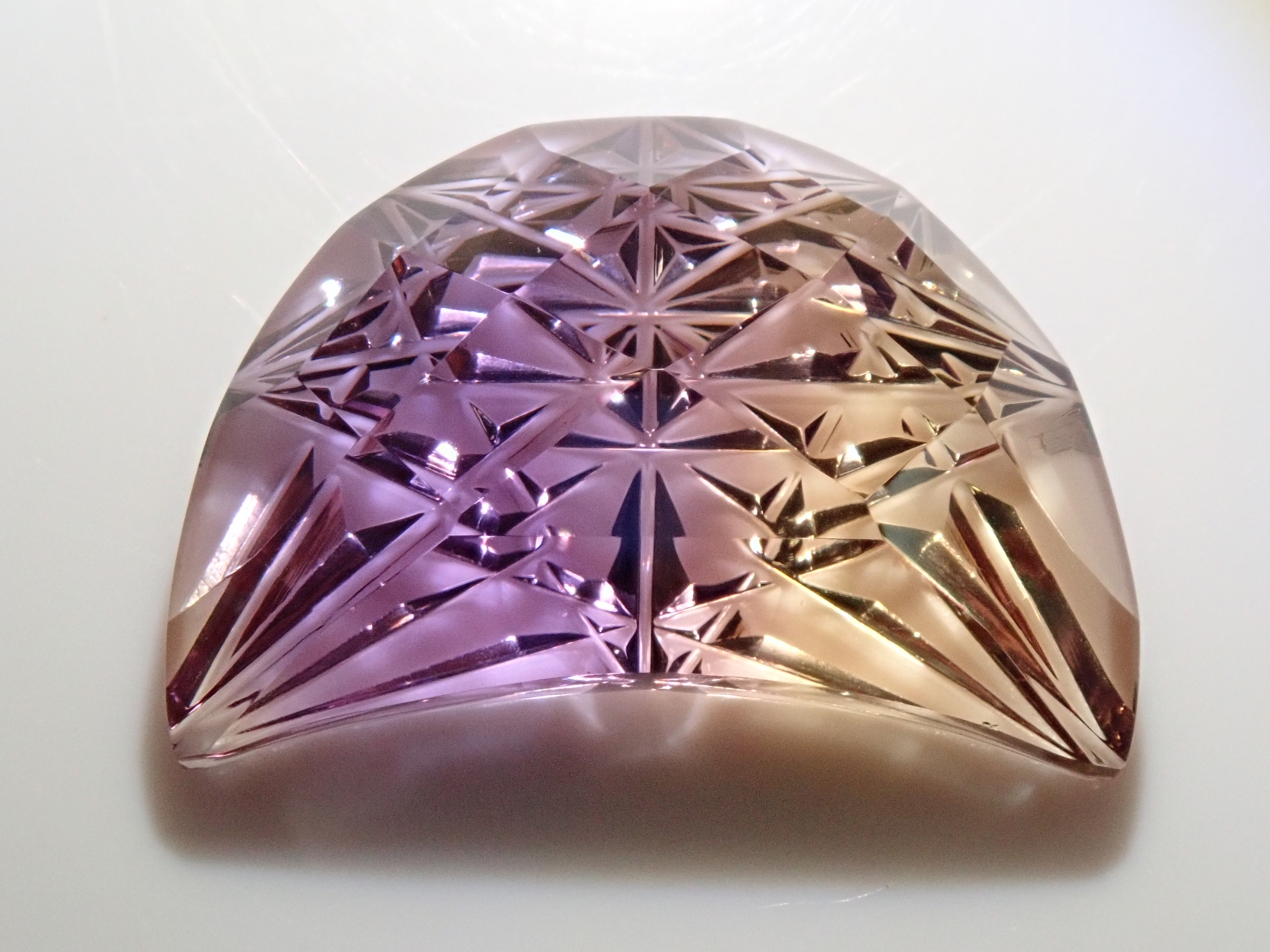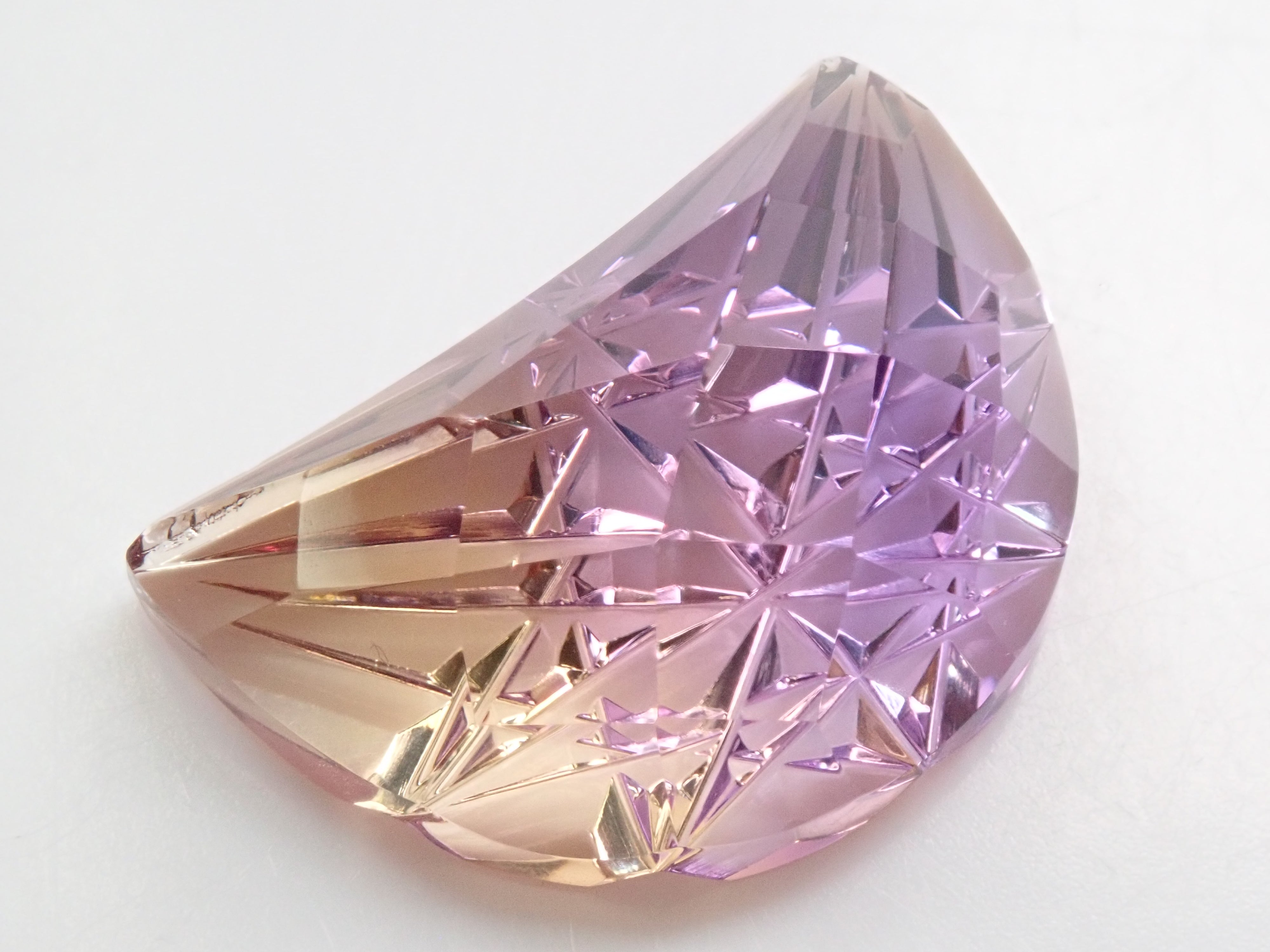 紫黃晶可以讓您同時享受紫水晶的紫色和黃水晶的黃色。紫水晶和黃水晶都是石英(水晶)的一種,它們的寶石名稱是“雙色石英”,它們的日文名稱是紫水晶。這是高州高石切子的紫黃晶《月形曉切子》,是清水奇蹟和深澤洋一先生的合作作品。