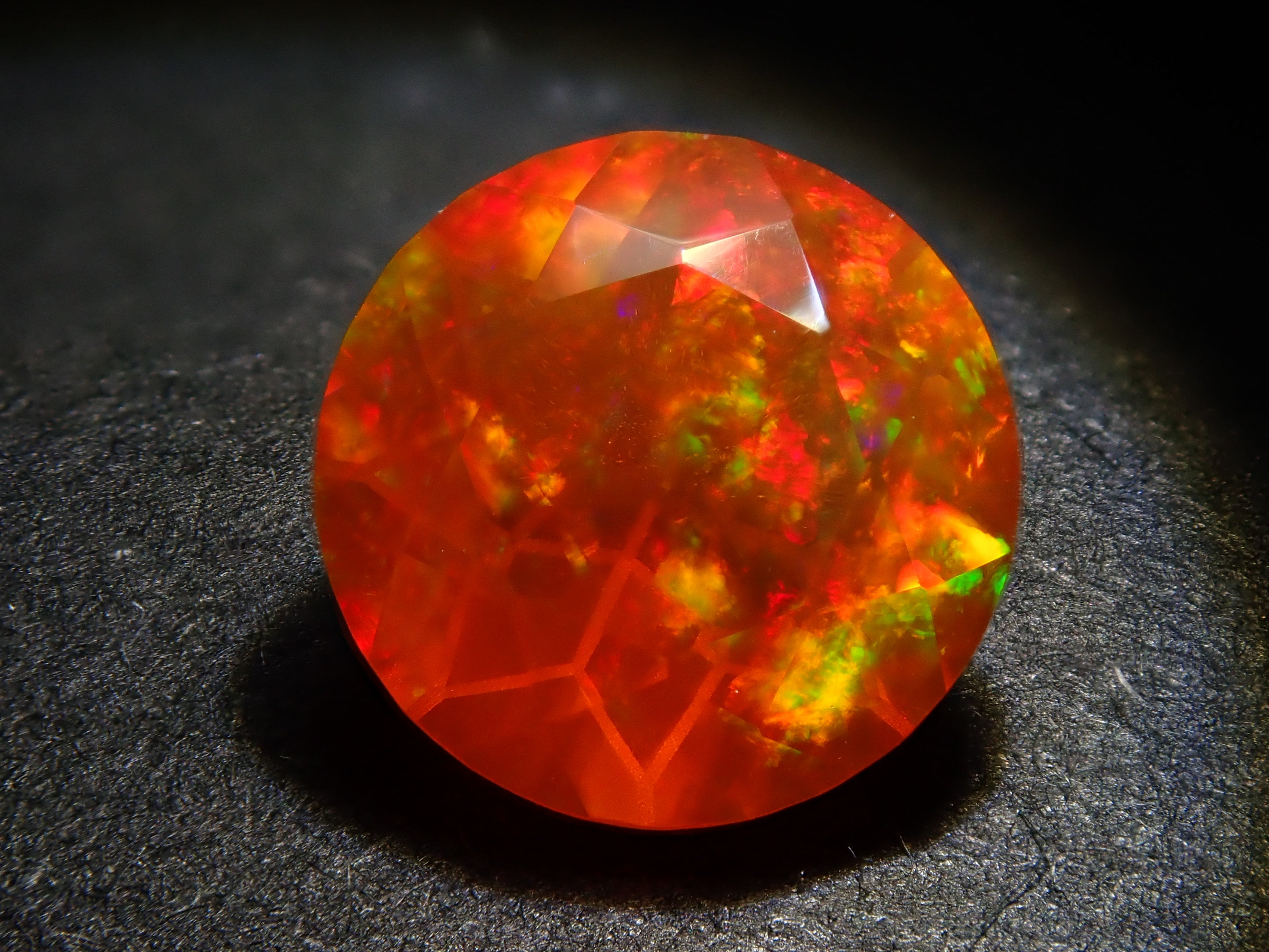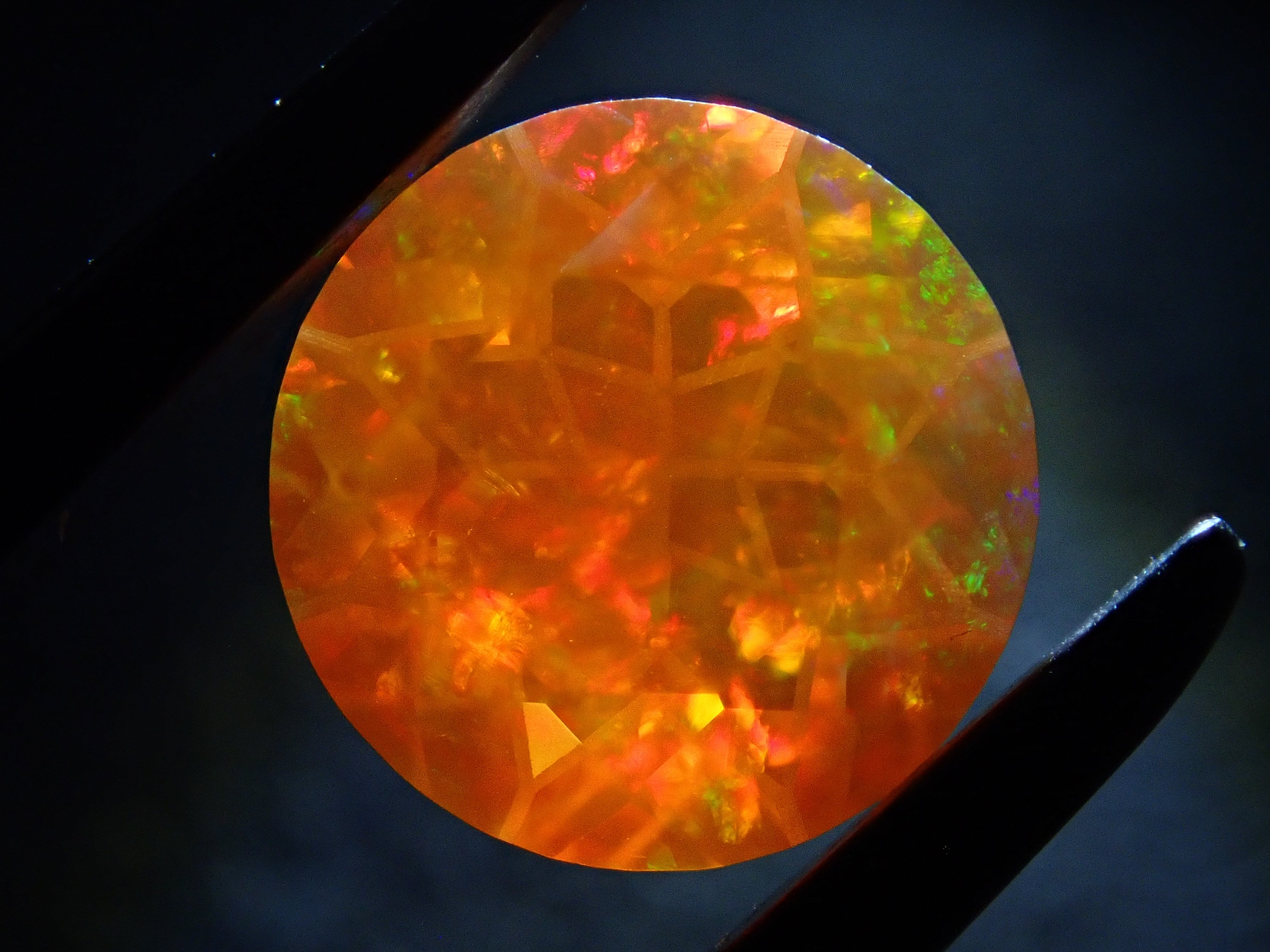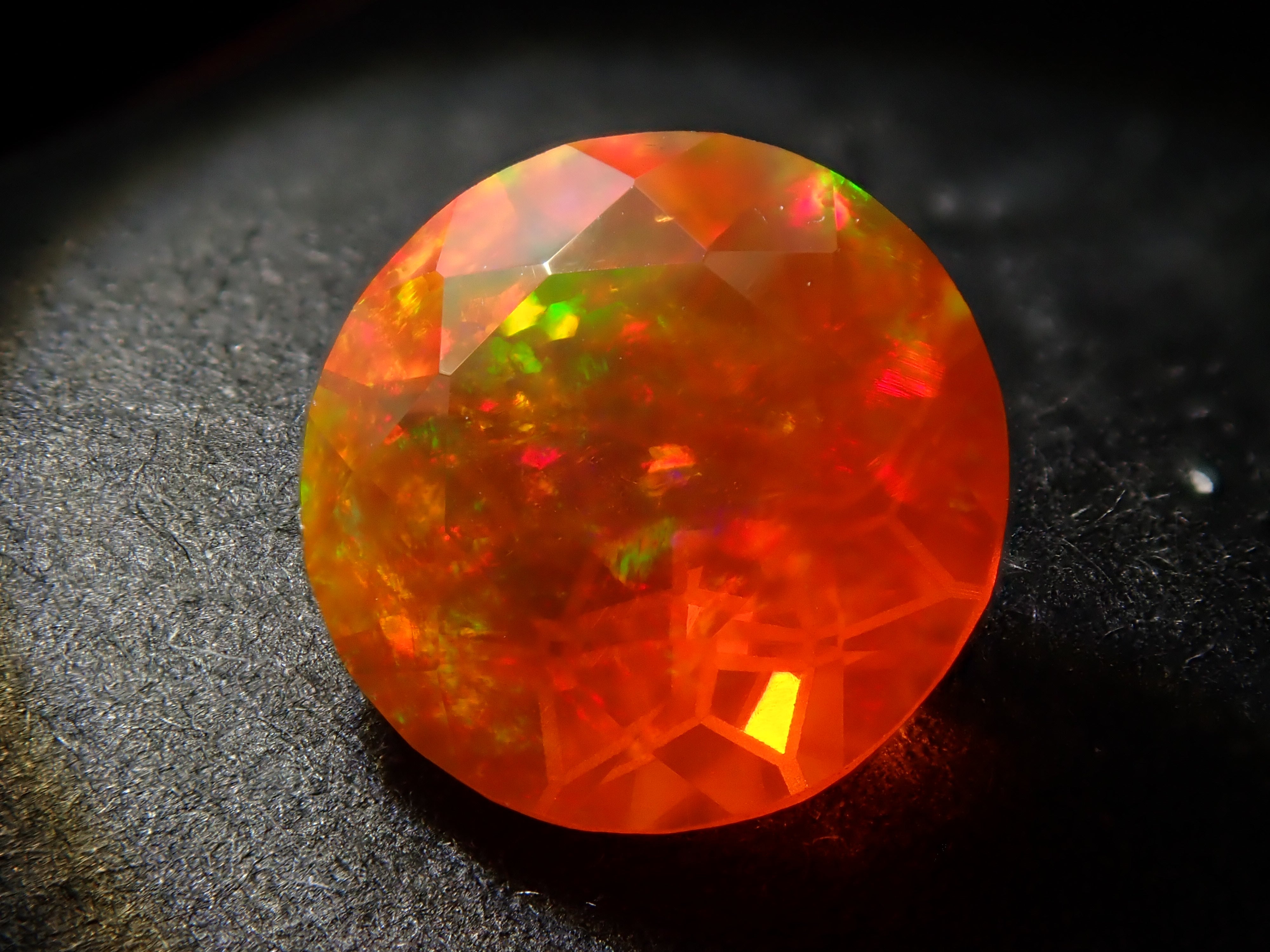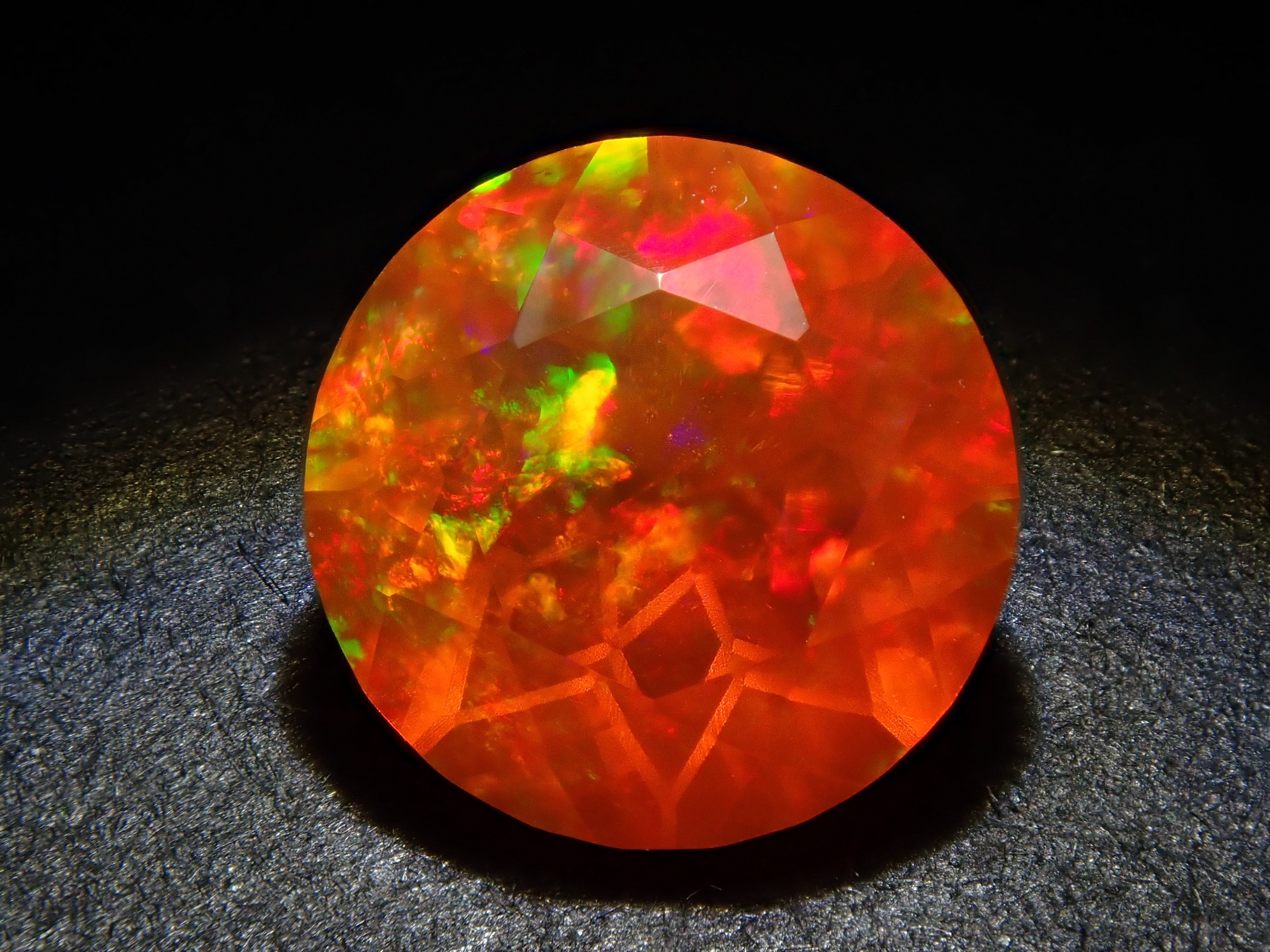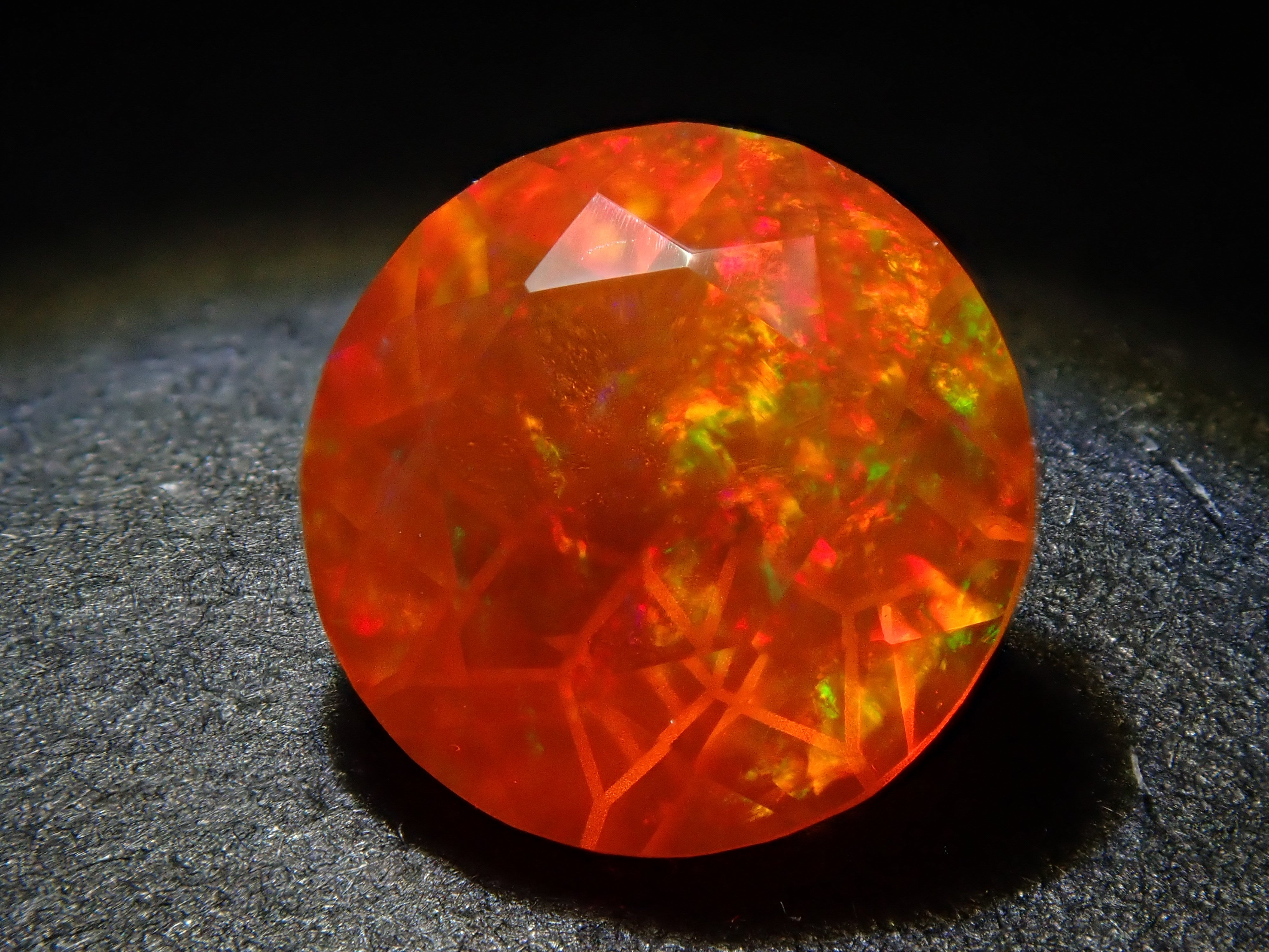 蛋白石自古羅馬時代就很受歡迎。火蛋白石是指底色從紅色到橘色的蛋白石,給人火的形象。照片是使用筆燈拍攝的。