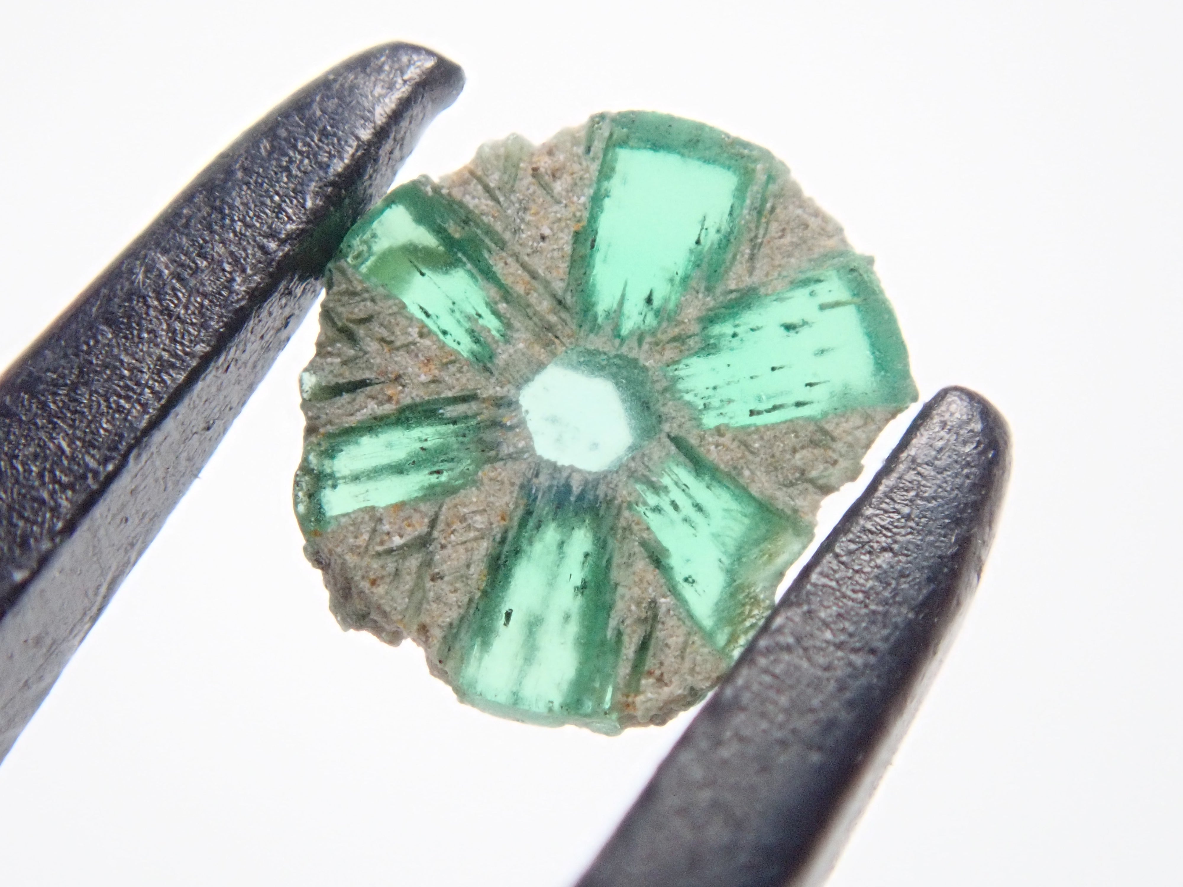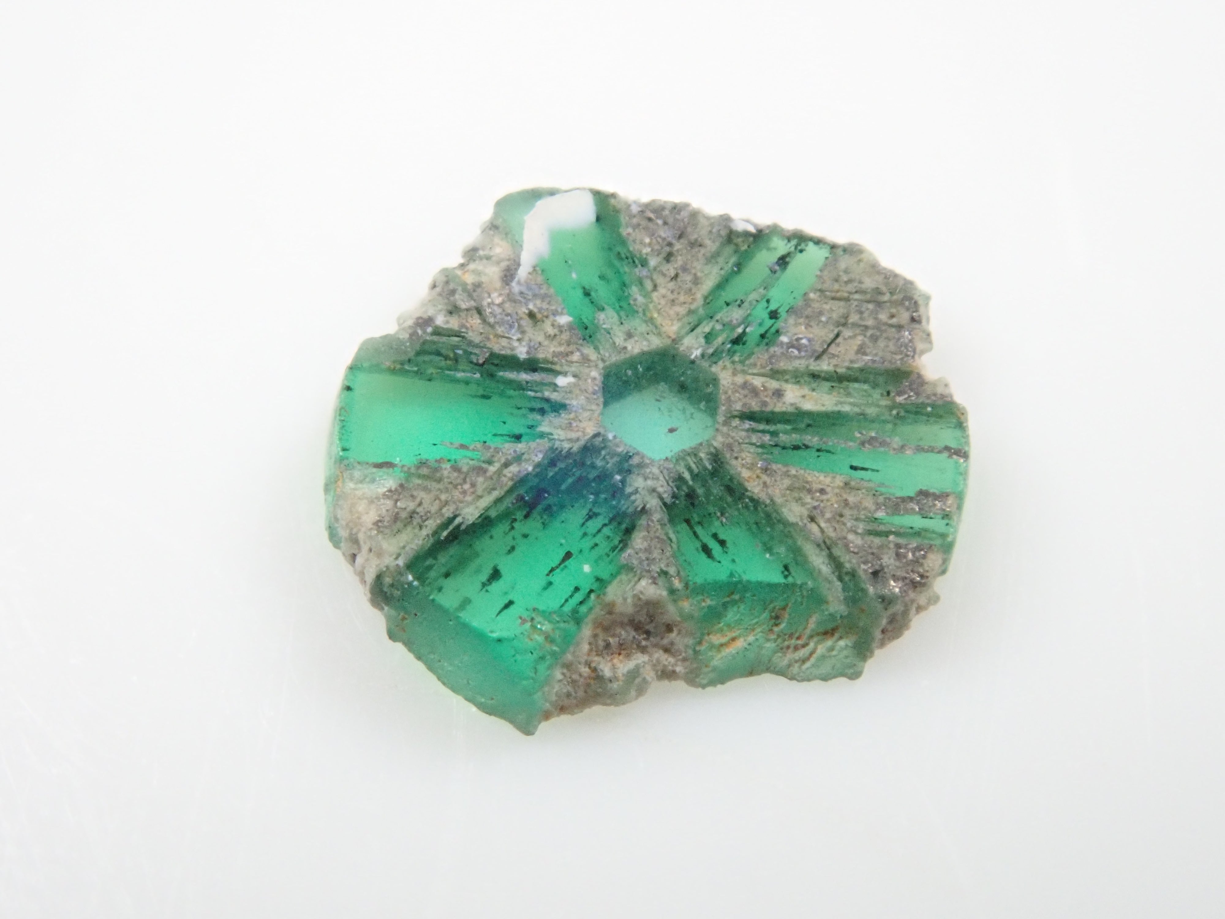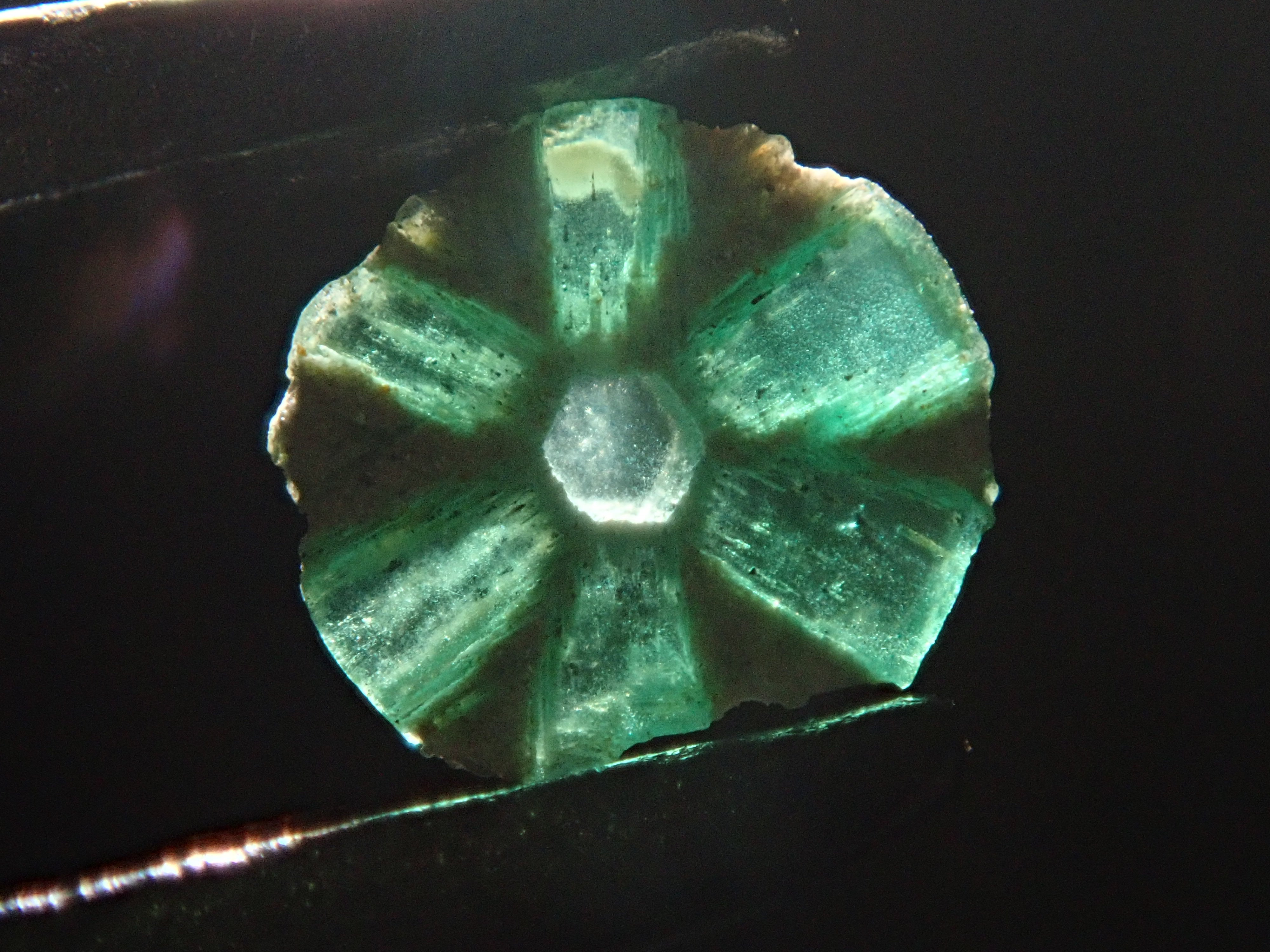 特拉碧茲祖母綠擁有六條清晰可見的紋路,是一種罕見的寶石,其開採量僅佔祖母綠總產量的極小部分。人們認為,這種紋路是由於晶體生長過程中混入雜質,並隨晶體垂直延伸而形成的。圖中是一顆典型的特拉碧茲祖母綠和一顆反向特拉碧茲祖母綠裸石。這顆非常罕見的祖母綠被稱為反向特拉碧茲祖母綠,其原石位於中心,生長紋路與正常祖母綠不同。在當地,它也被稱為反向特拉碧茲祖母綠。