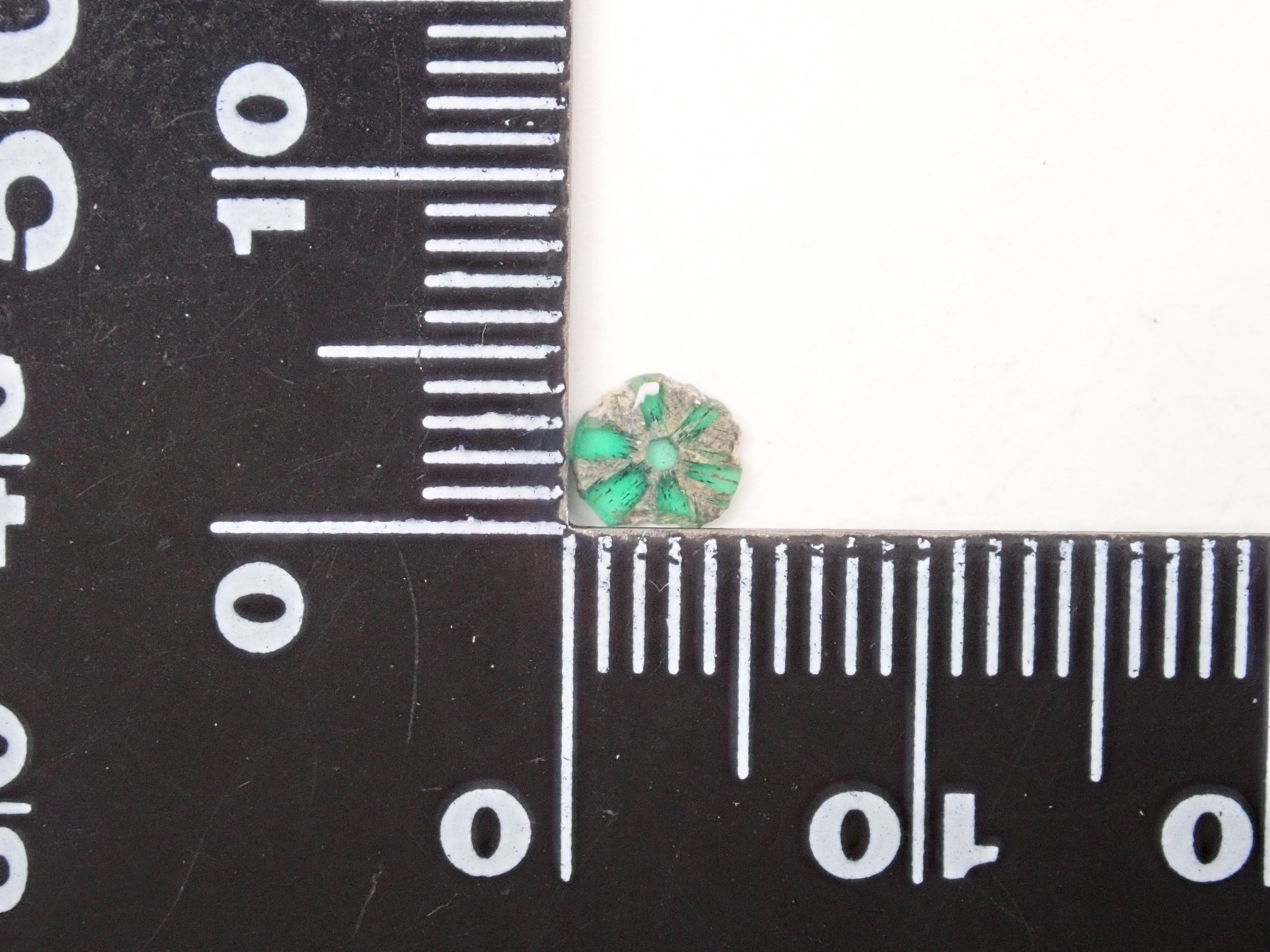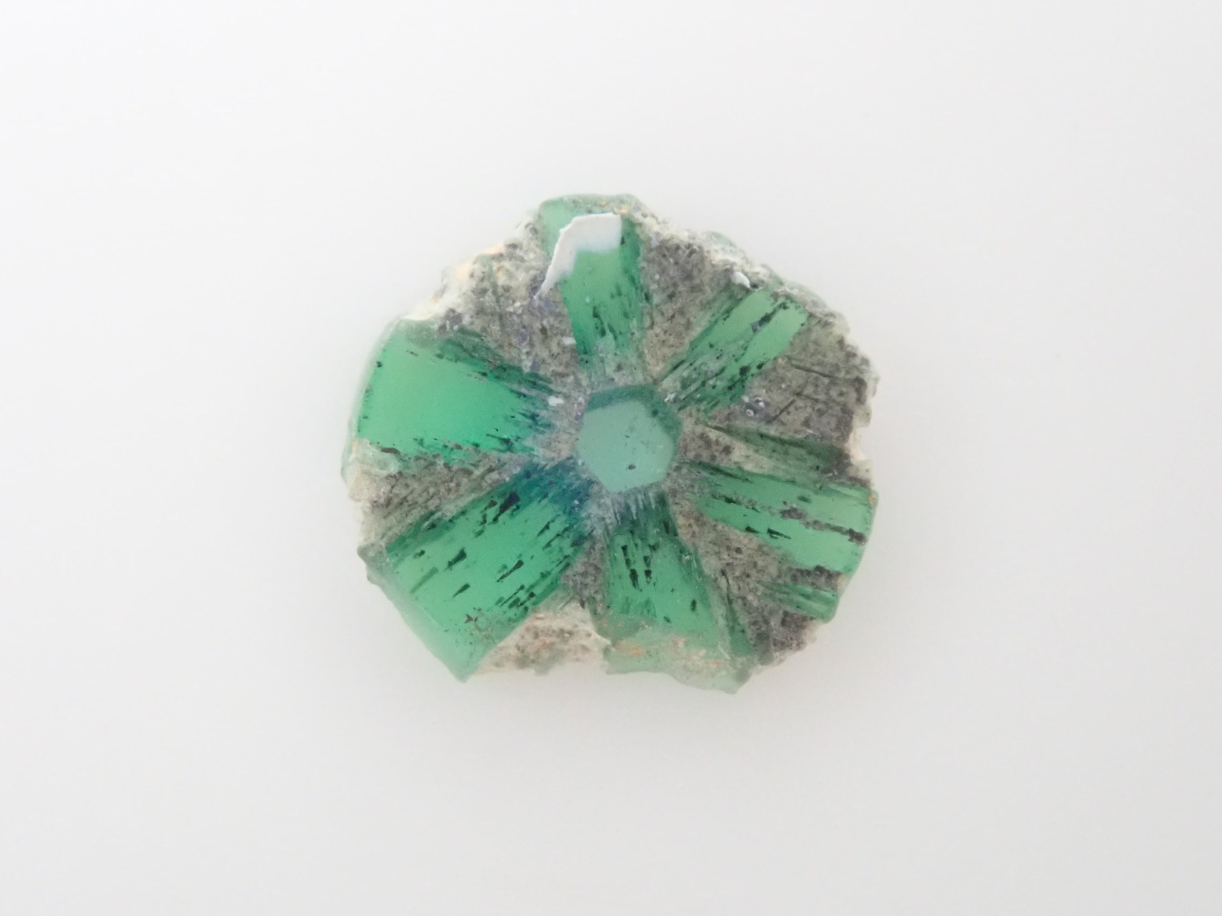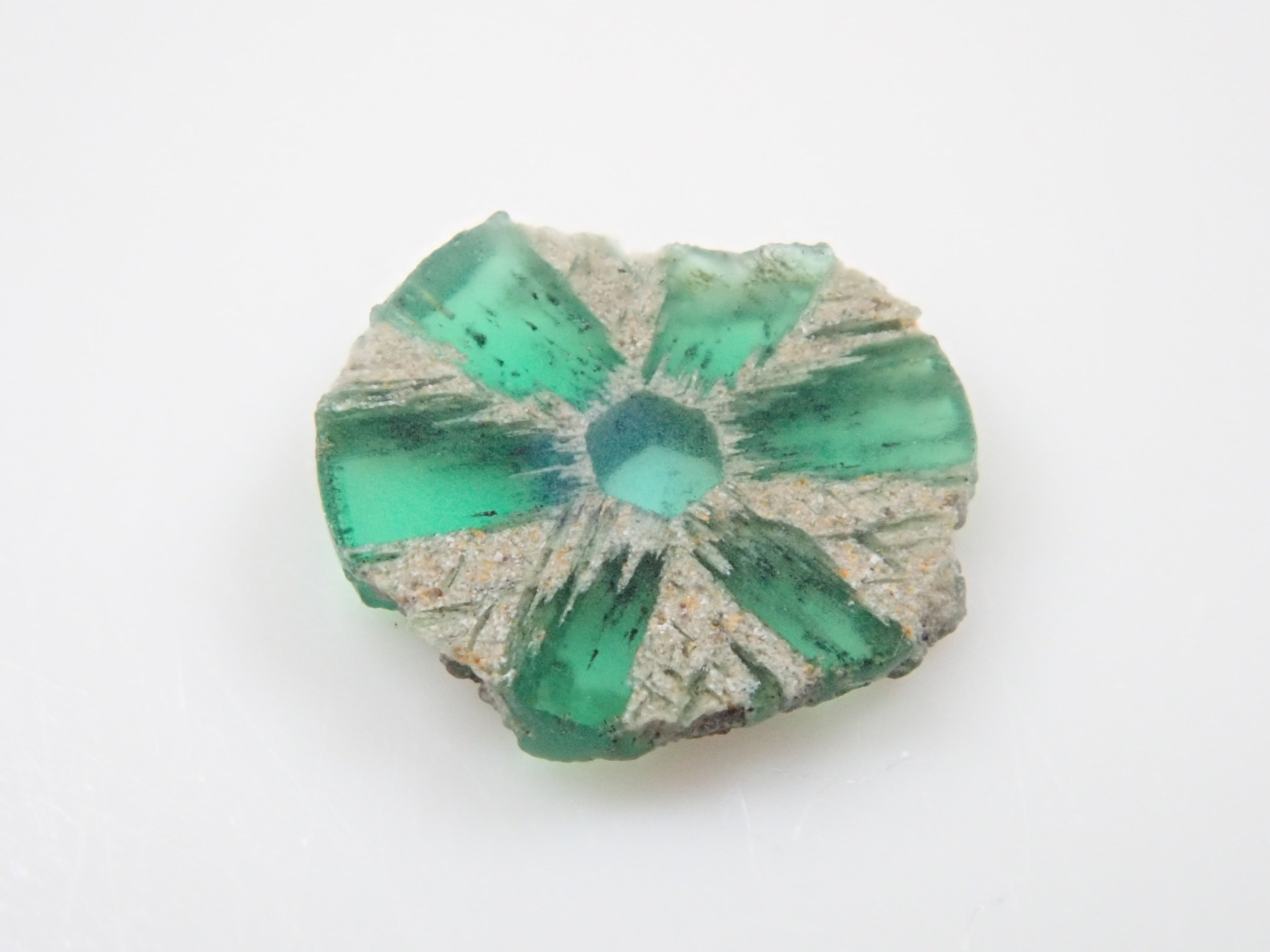 特拉碧茲祖母綠擁有六條清晰可見的紋路,是一種罕見的寶石,其開採量僅佔祖母綠總產量的極小部分。人們認為,這種紋路是由於晶體生長過程中混入雜質,並隨晶體垂直延伸而形成的。圖中是一顆典型的特拉碧茲祖母綠和一顆反向特拉碧茲祖母綠裸石。這顆非常罕見的祖母綠被稱為反向特拉碧茲祖母綠,其原石位於中心,生長紋路與正常祖母綠不同。在當地,它也被稱為反向特拉碧茲祖母綠。