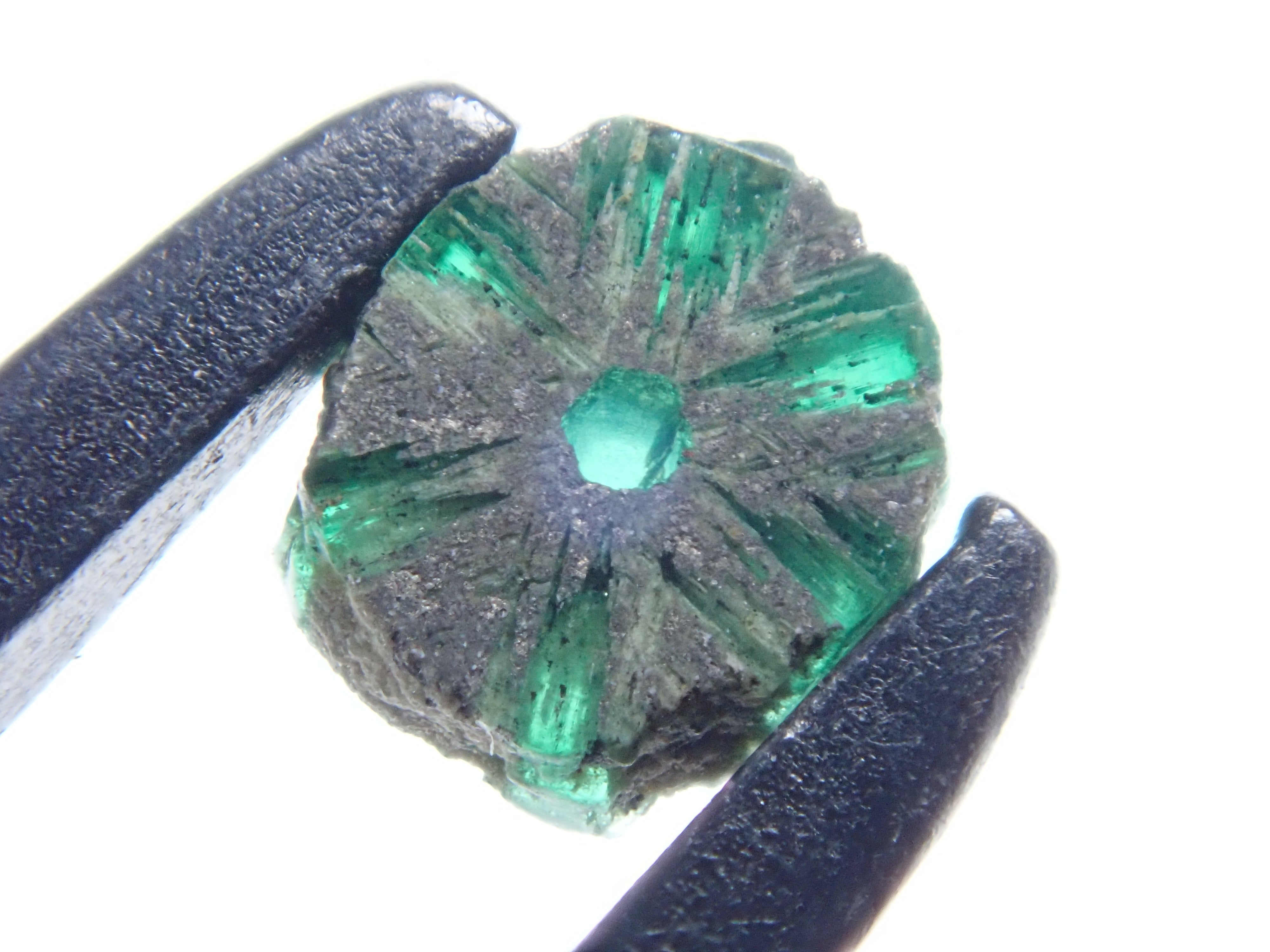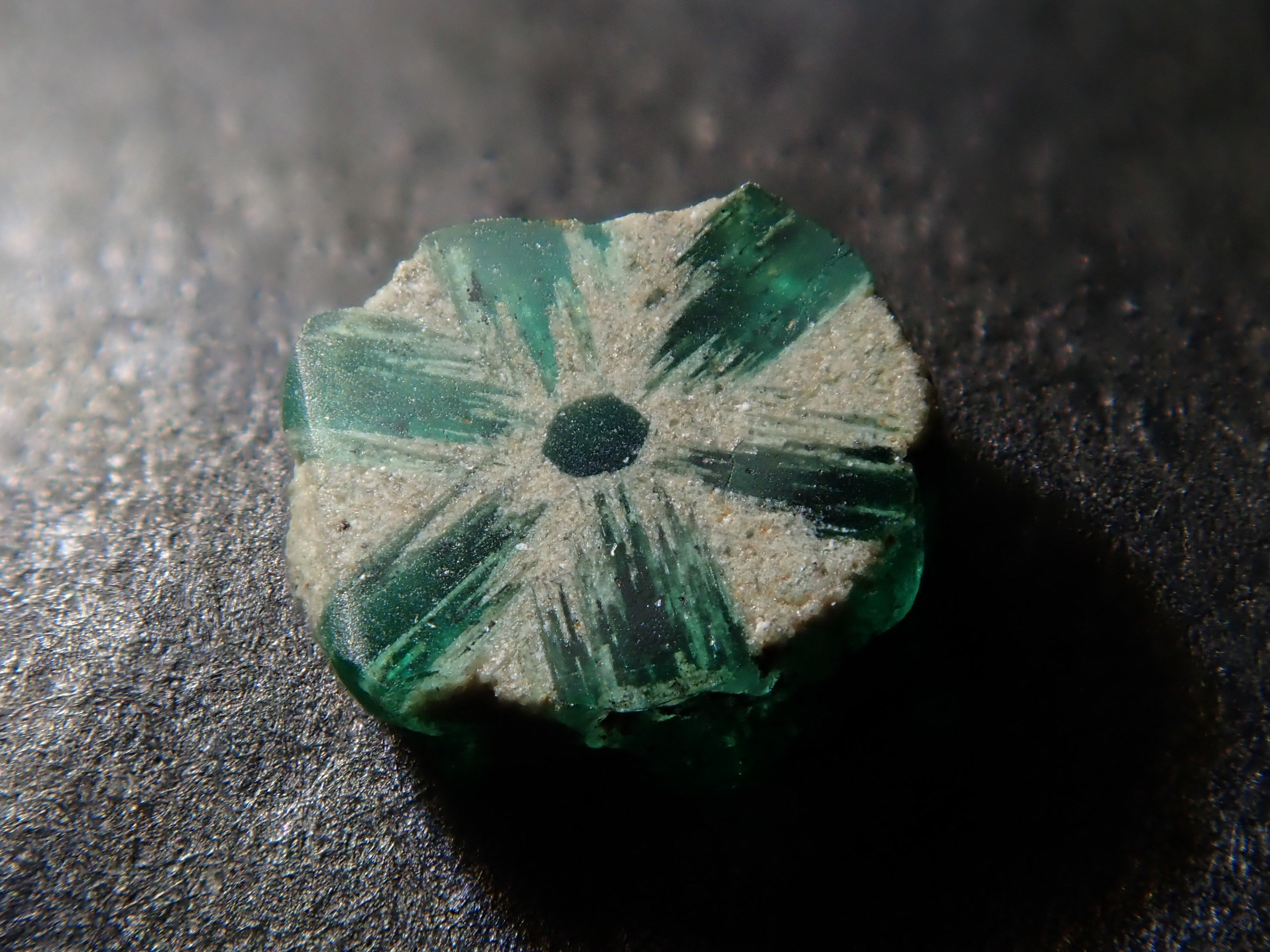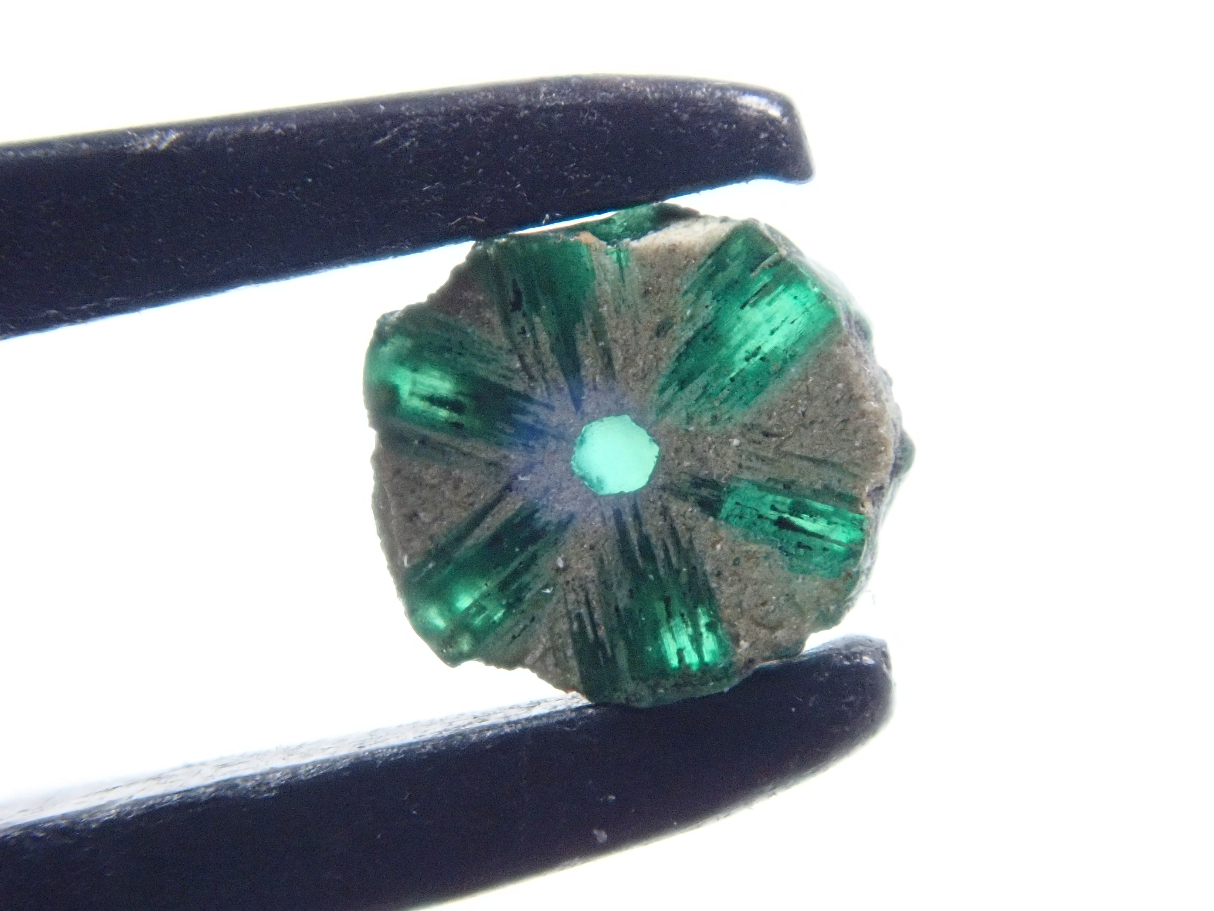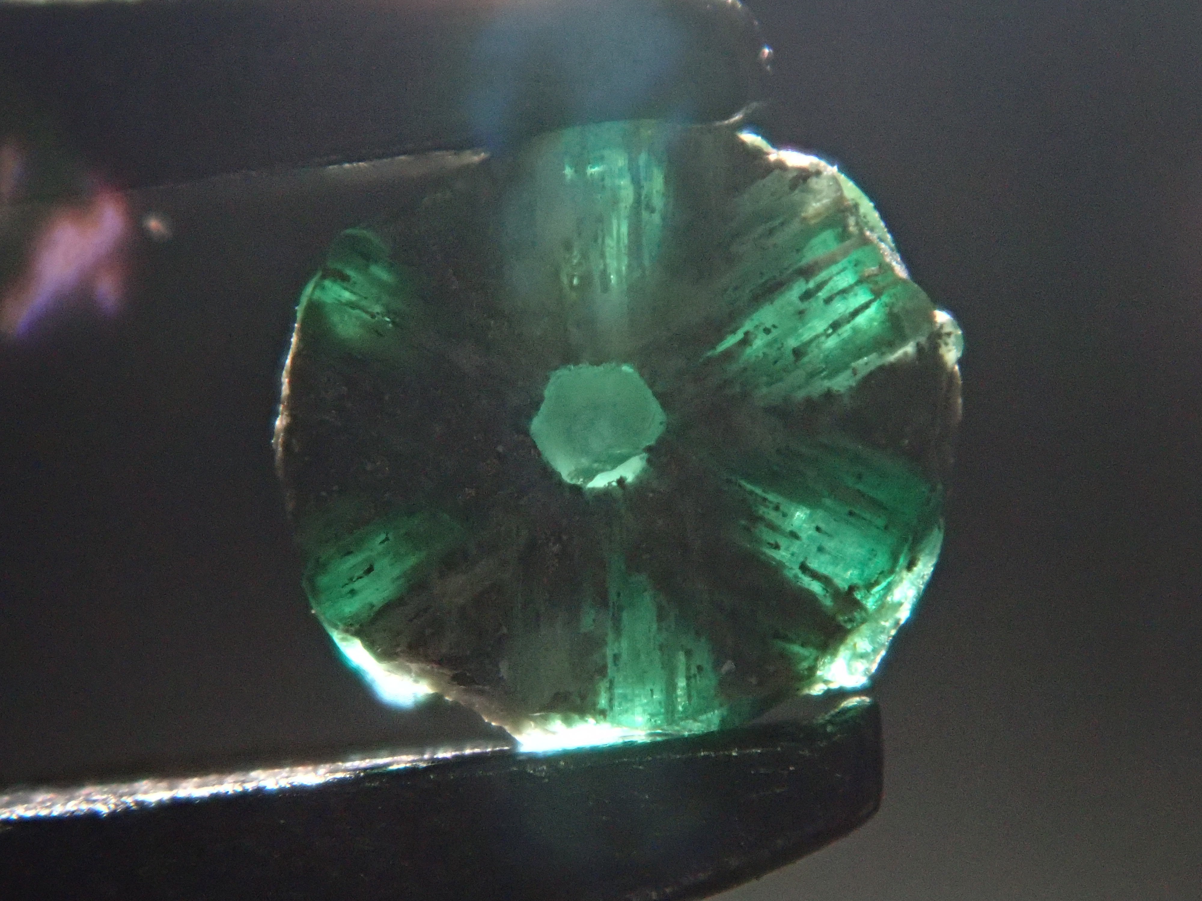 特拉碧茲祖母綠擁有六條清晰可見的紋路,是一種罕見的寶石,其開採量僅佔祖母綠總產量的極小部分。人們認為,這種紋路是由於晶體生長過程中混入雜質,並隨晶體垂直延伸而形成的。圖中是一顆典型的特拉碧茲祖母綠和一顆反向特拉碧茲祖母綠裸石。這顆非常罕見的祖母綠被稱為反向特拉碧茲祖母綠,其原石位於中心,生長紋路與正常祖母綠不同。在當地,它也被稱為反向特拉碧茲祖母綠。