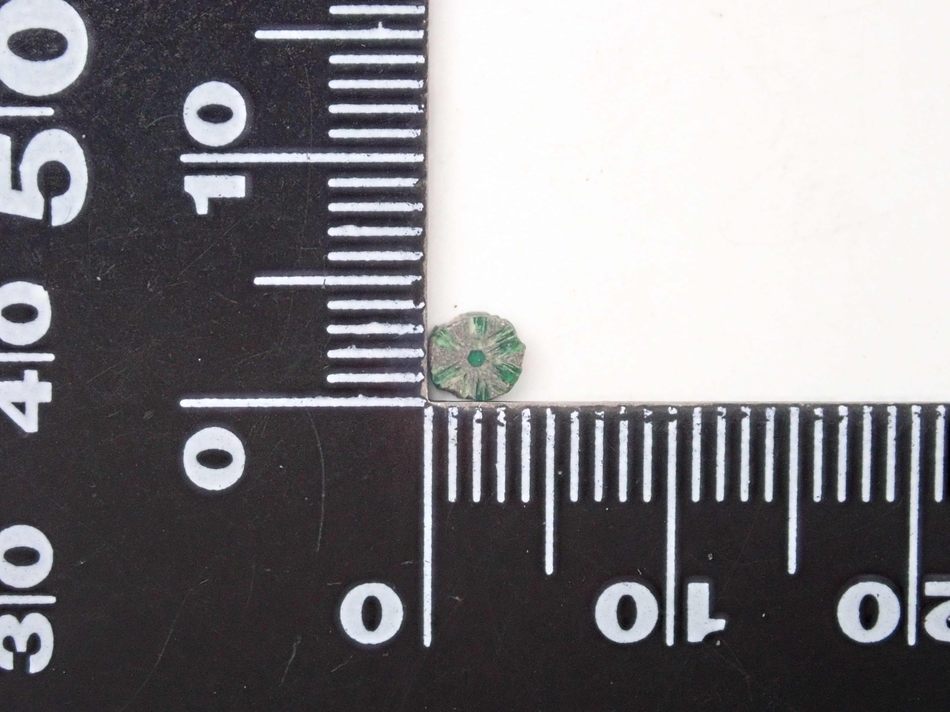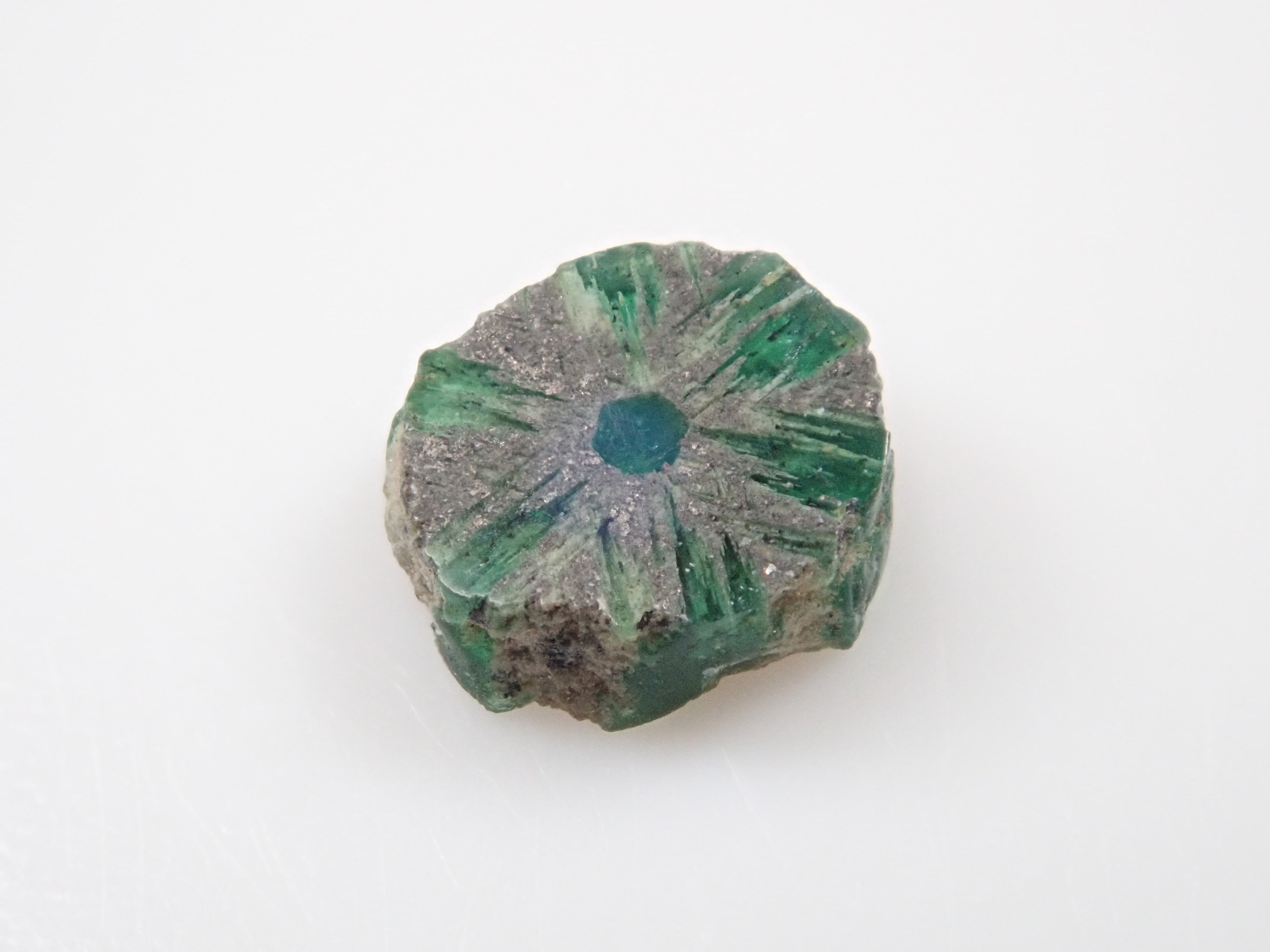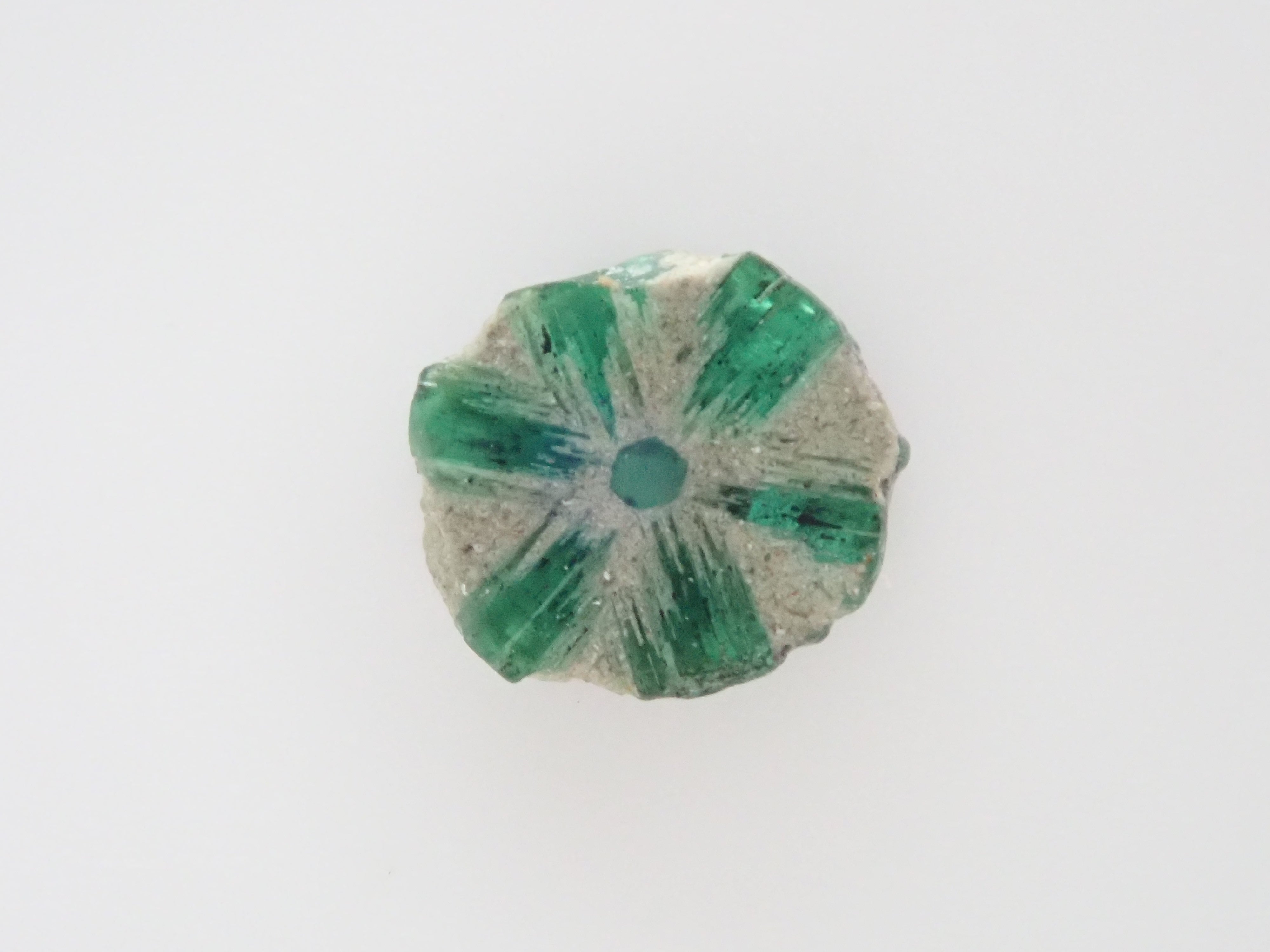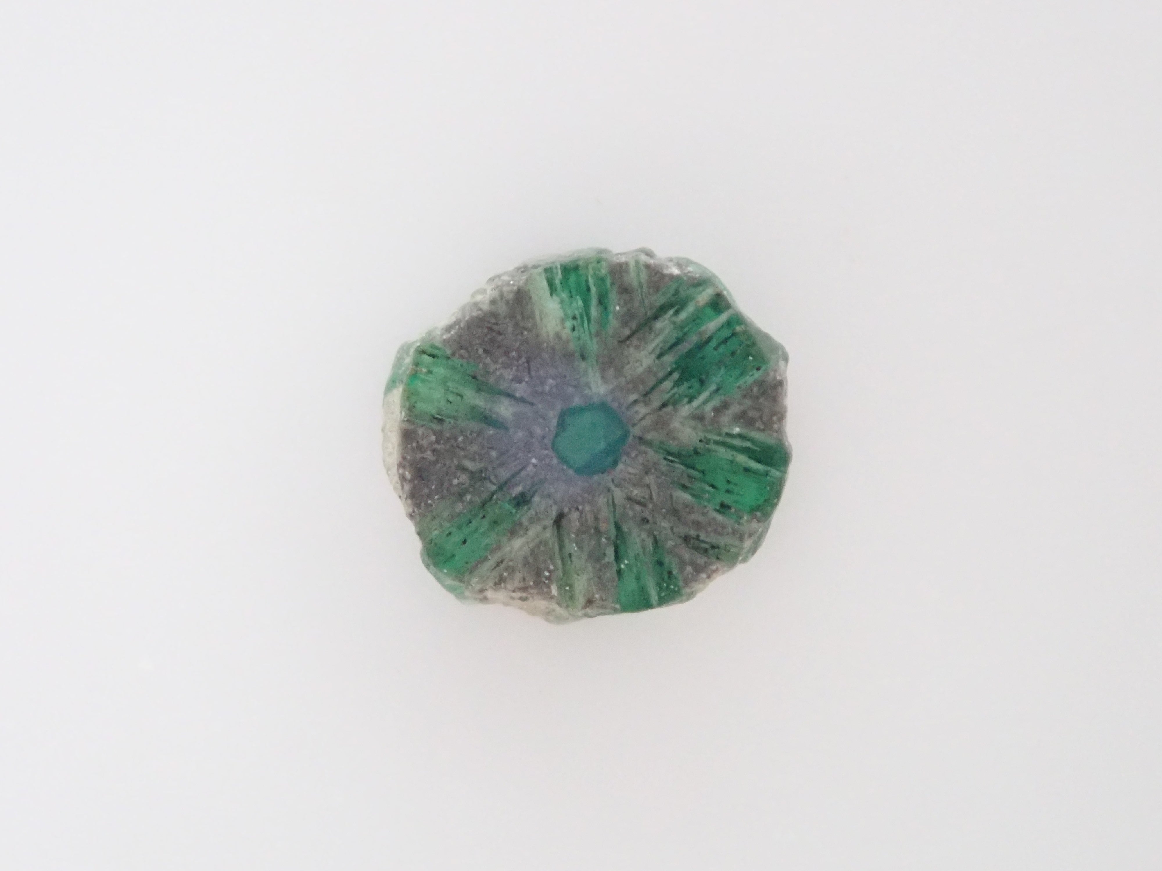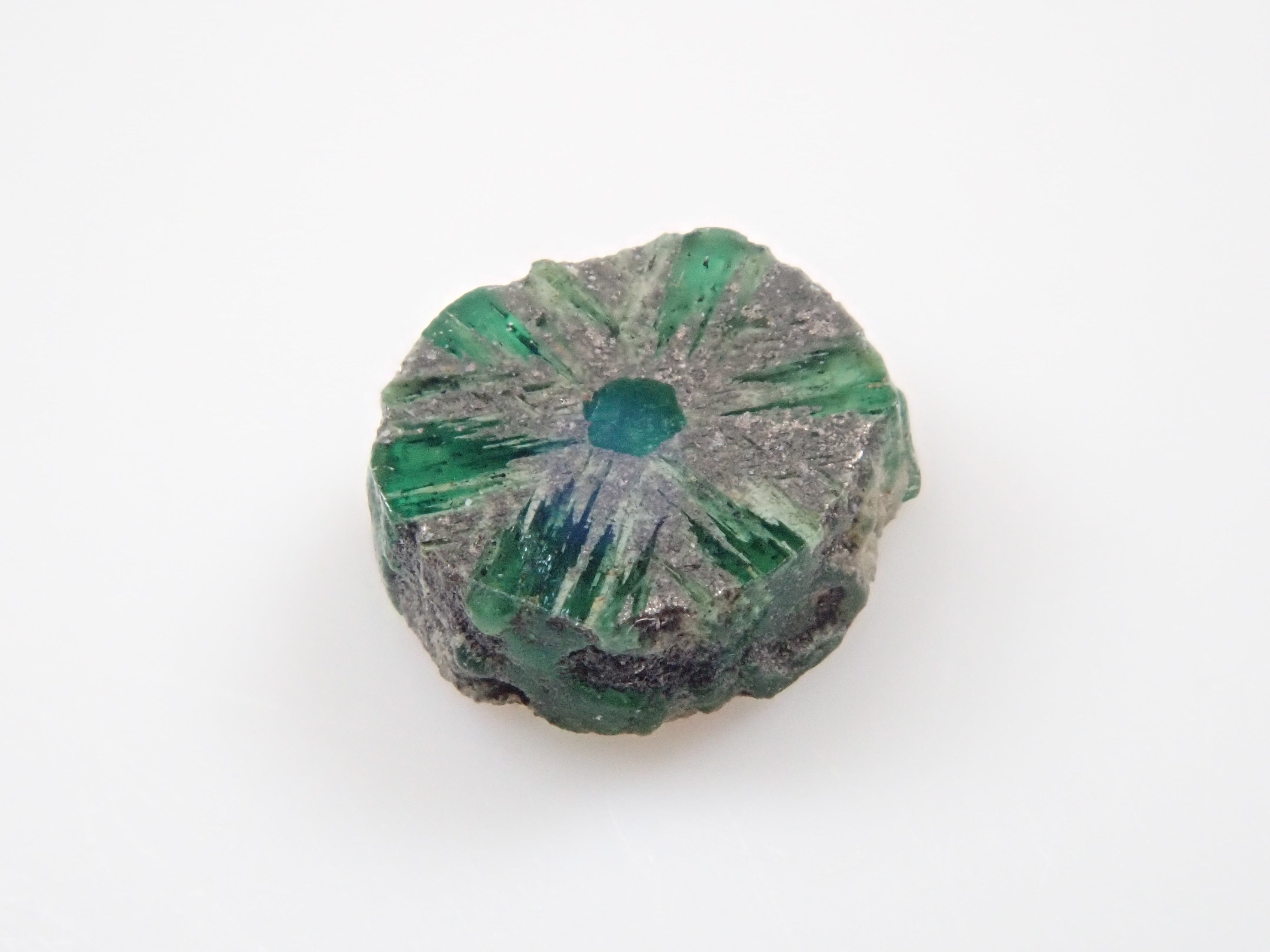 特拉碧茲祖母綠擁有六條清晰可見的紋路,是一種罕見的寶石,其開採量僅佔祖母綠總產量的極小部分。人們認為,這種紋路是由於晶體生長過程中混入雜質,並隨晶體垂直延伸而形成的。圖中是一顆典型的特拉碧茲祖母綠和一顆反向特拉碧茲祖母綠裸石。這顆非常罕見的祖母綠被稱為反向特拉碧茲祖母綠,其原石位於中心,生長紋路與正常祖母綠不同。在當地,它也被稱為反向特拉碧茲祖母綠。
