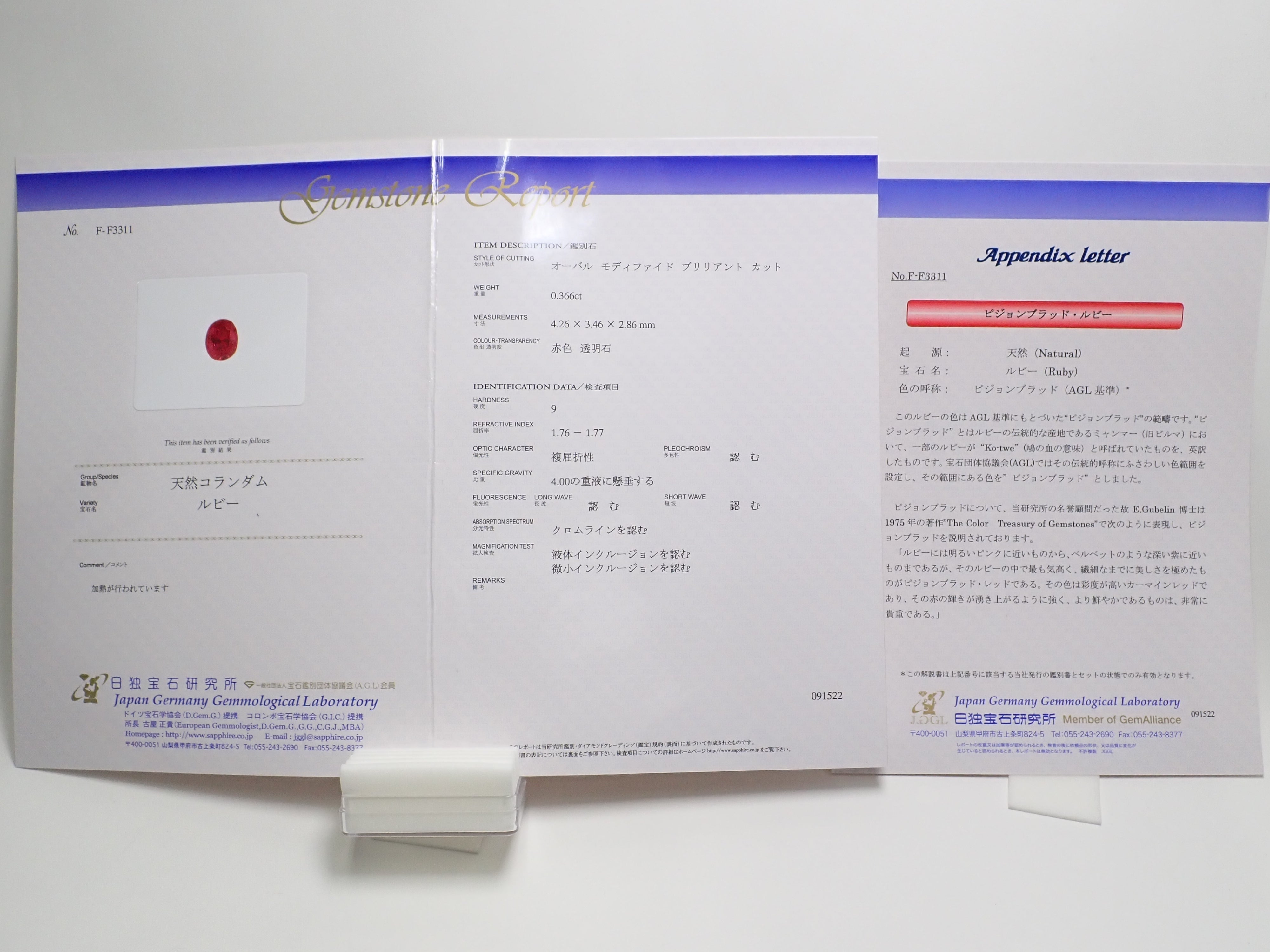 紅寶石自古以來就被視為寶石而受到推崇。指紅剛玉。紅寶石是僅次於鑽石的第二硬寶石,硬度為9,是一種堅韌、穩定且易於護理的寶石。這是一種罕見的鴿血紅紅寶石。附有日德寶石研究所頒發的鑑定證書。