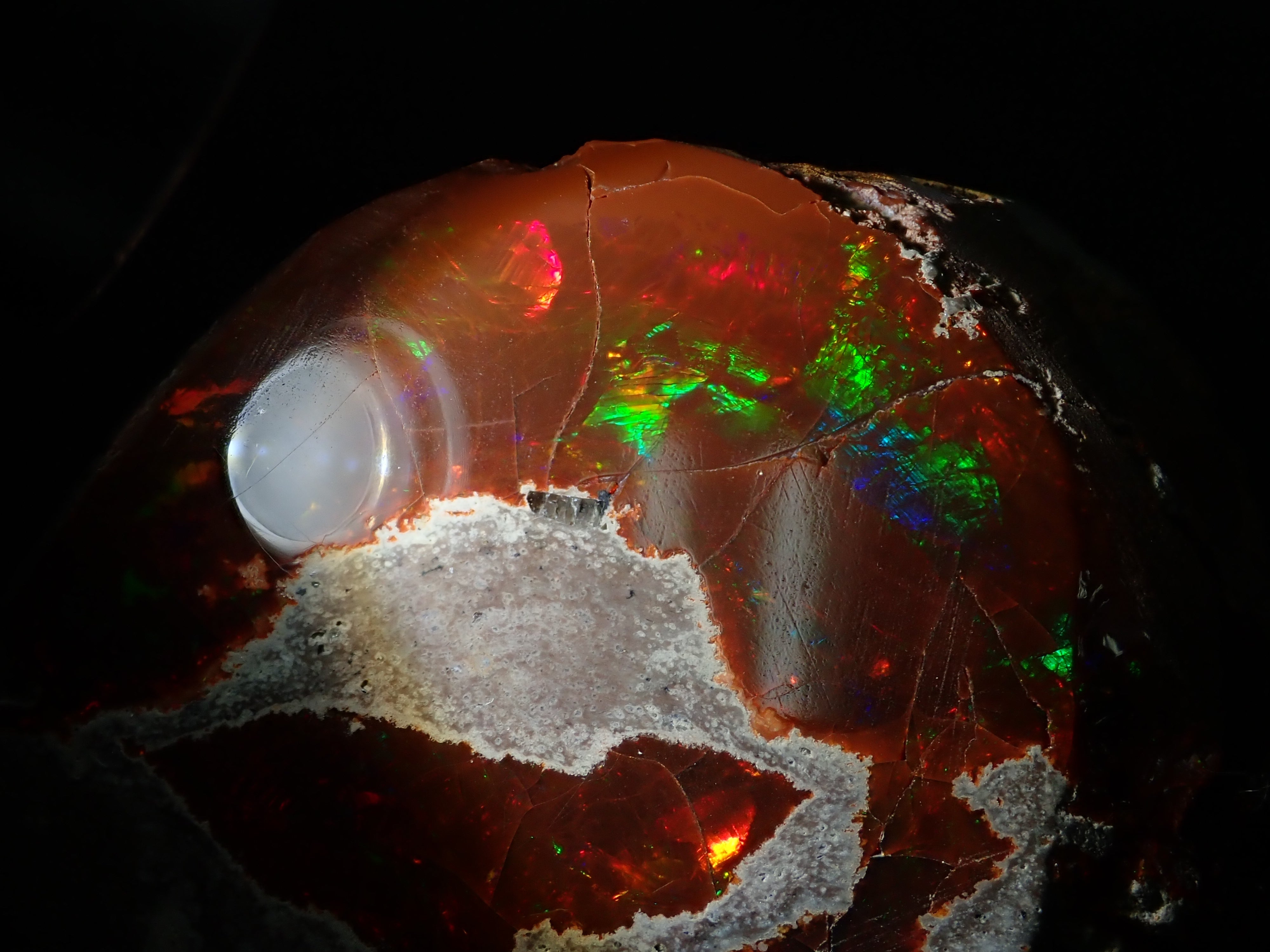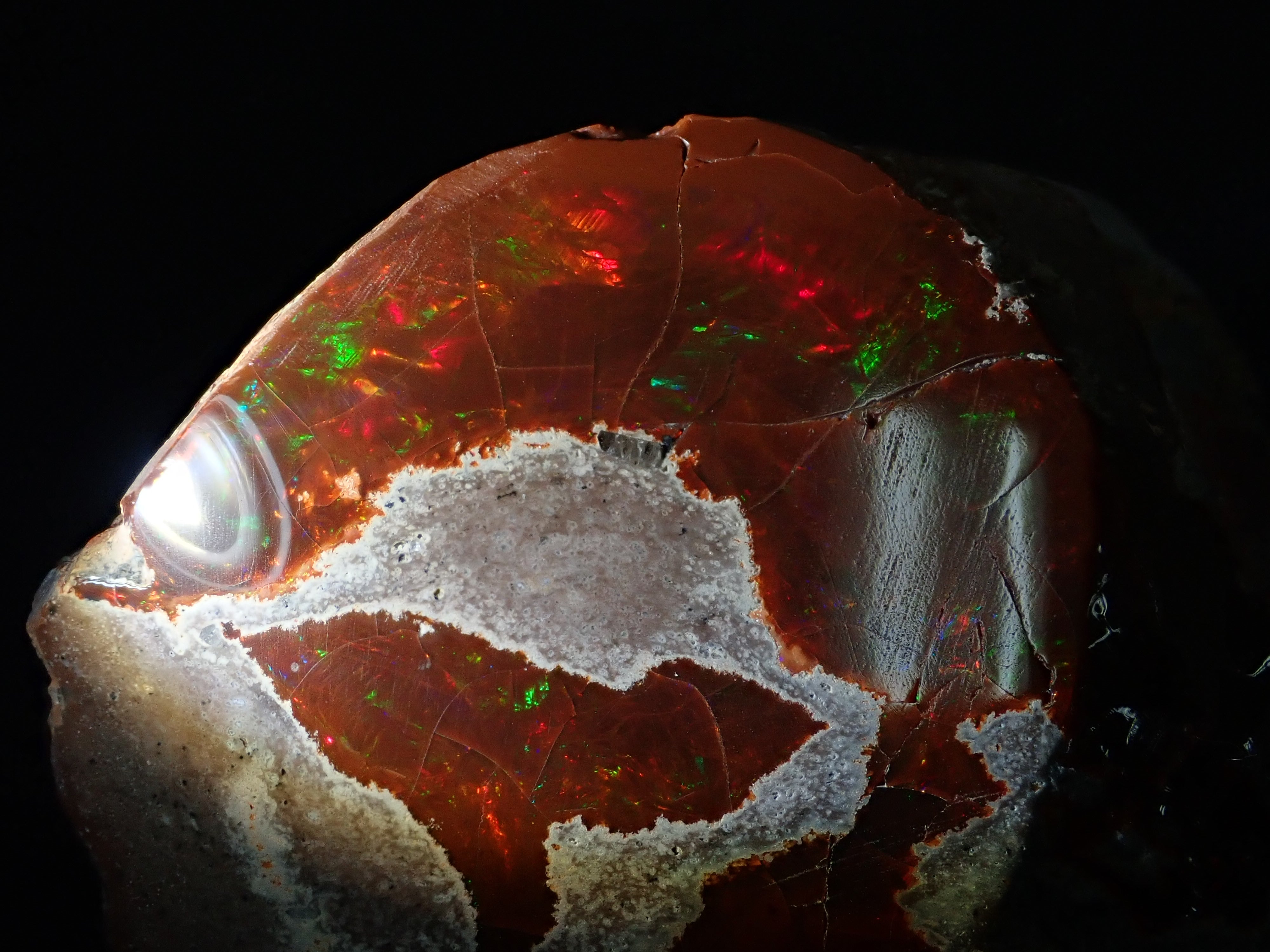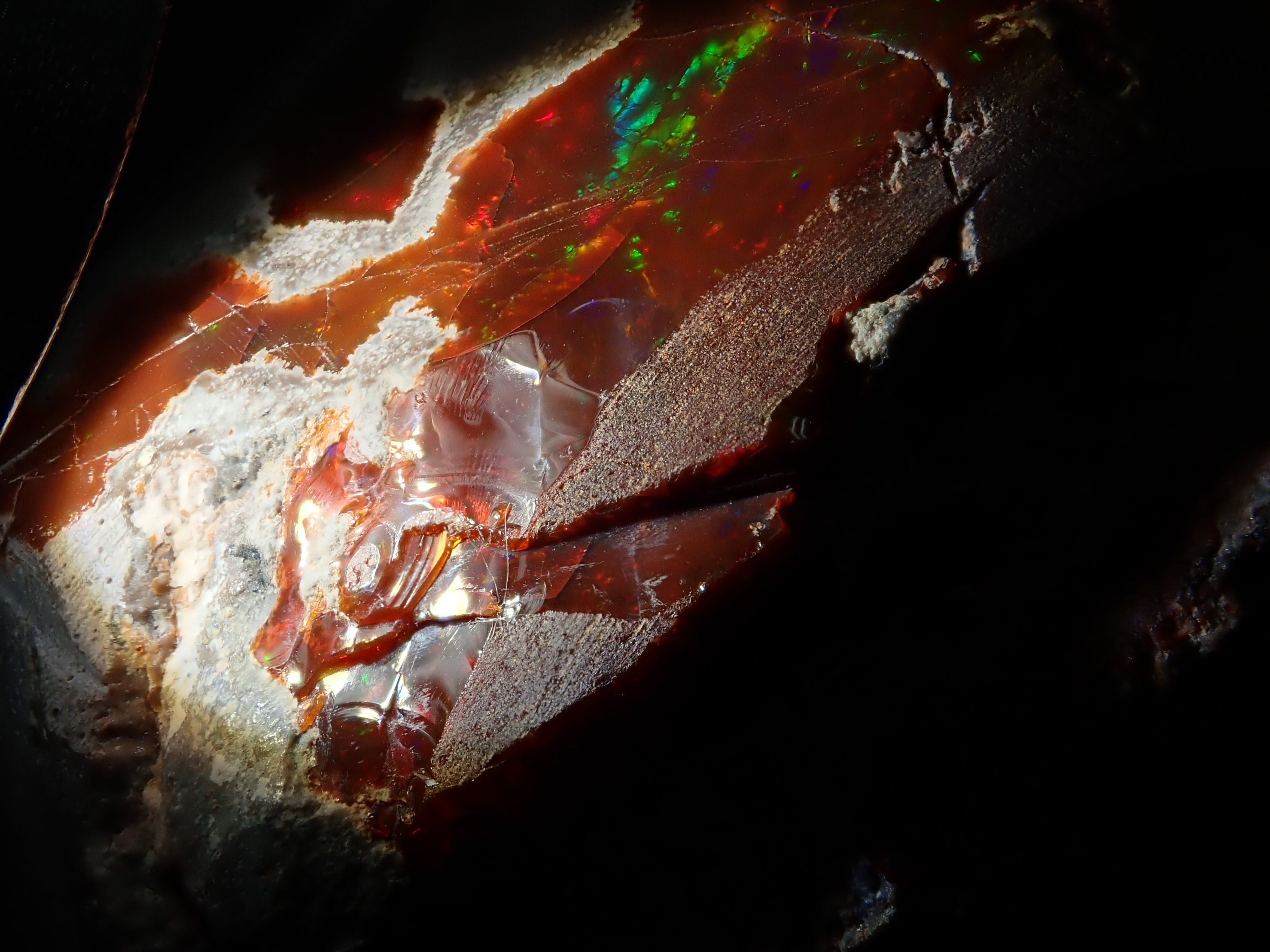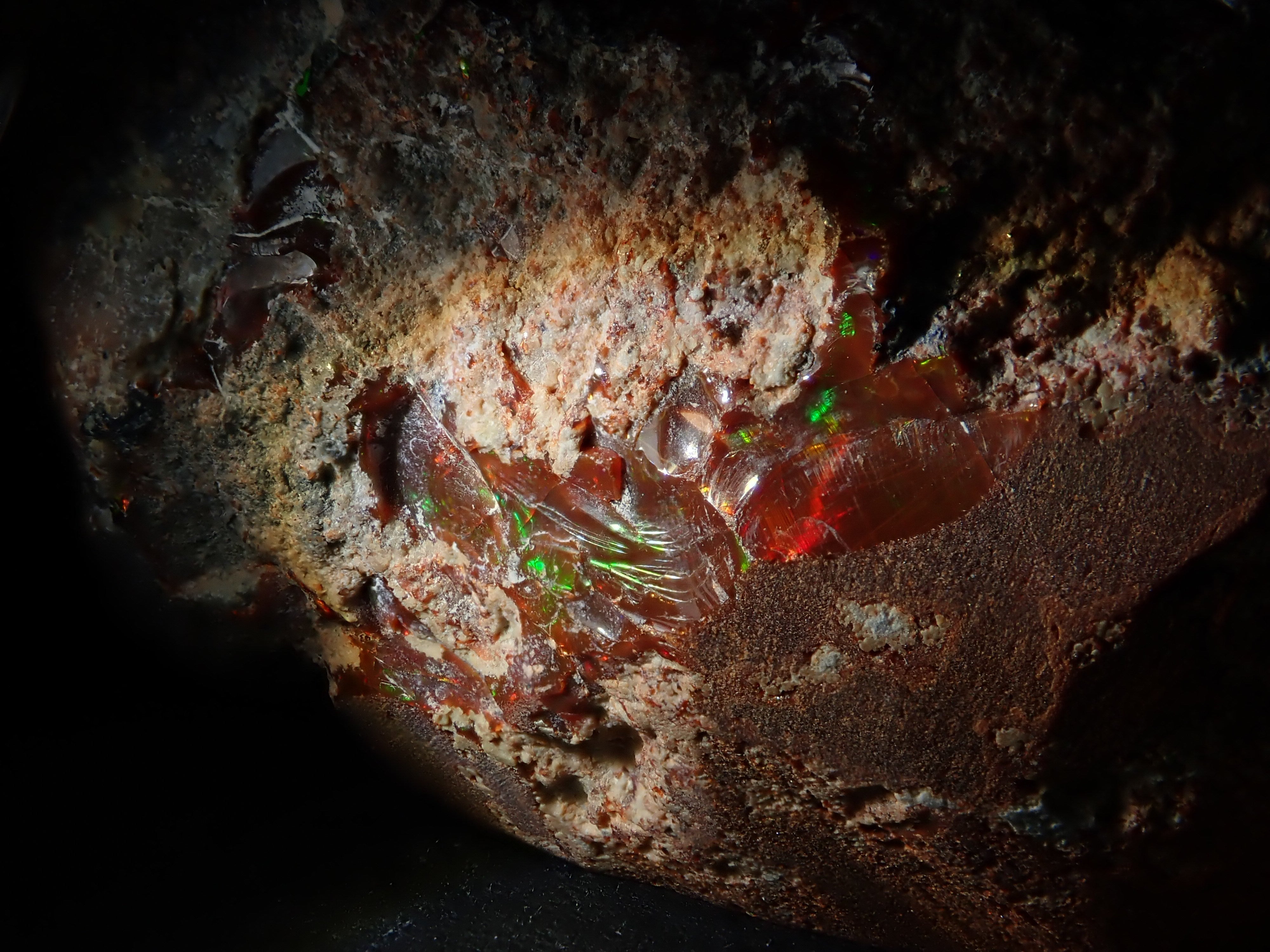 蛋白石是一種閃爍著彩虹色光芒的寶石。蛋白石是一種寶石,有許多不同的類型並具有多種表現形式。有些人被這種魅力所吸引,以至於只收集蛋白石。照片是使用筆燈拍攝的。本來,這種蛋白石原石有很多孔,但這種蛋白石也有孔。