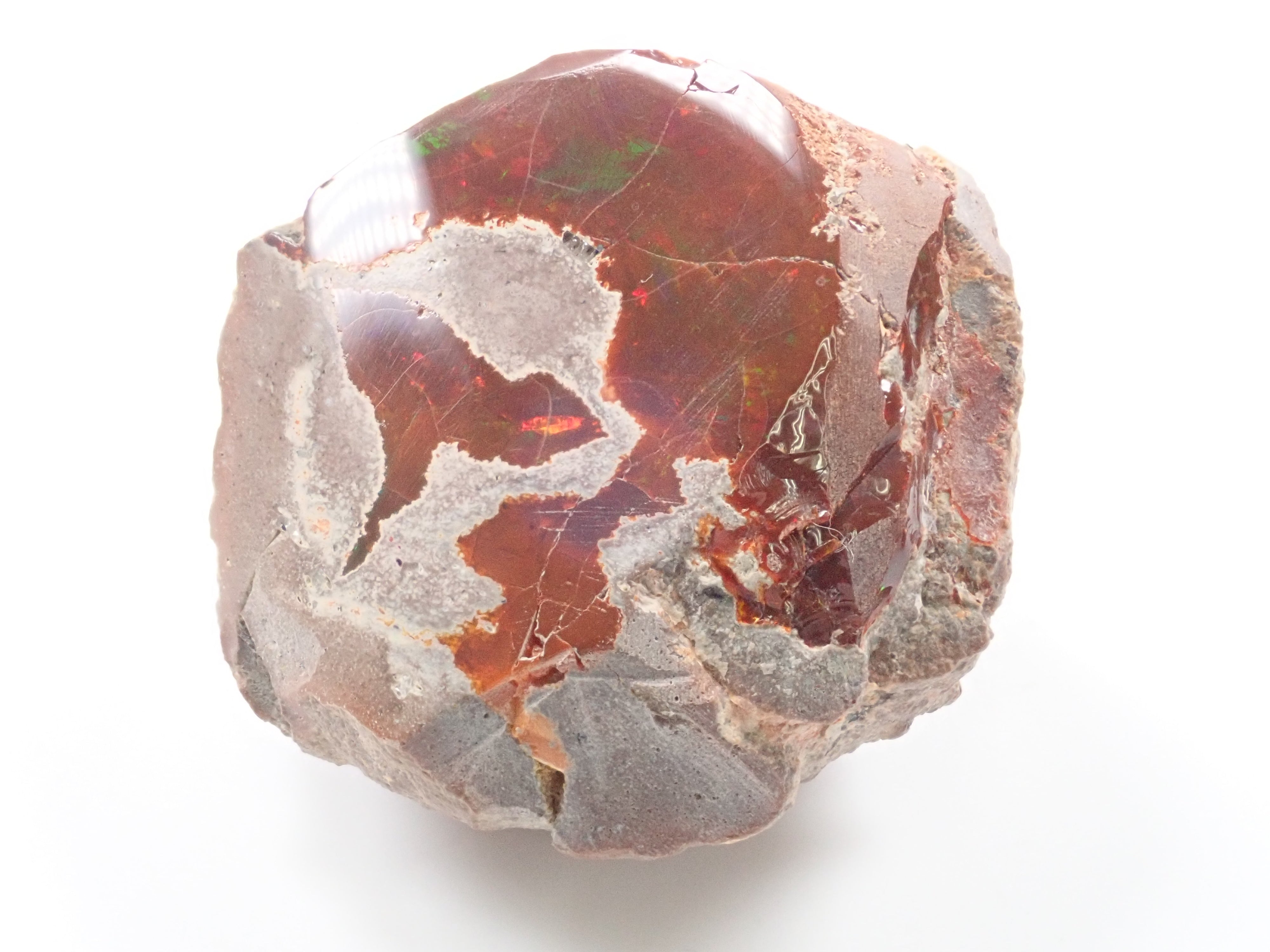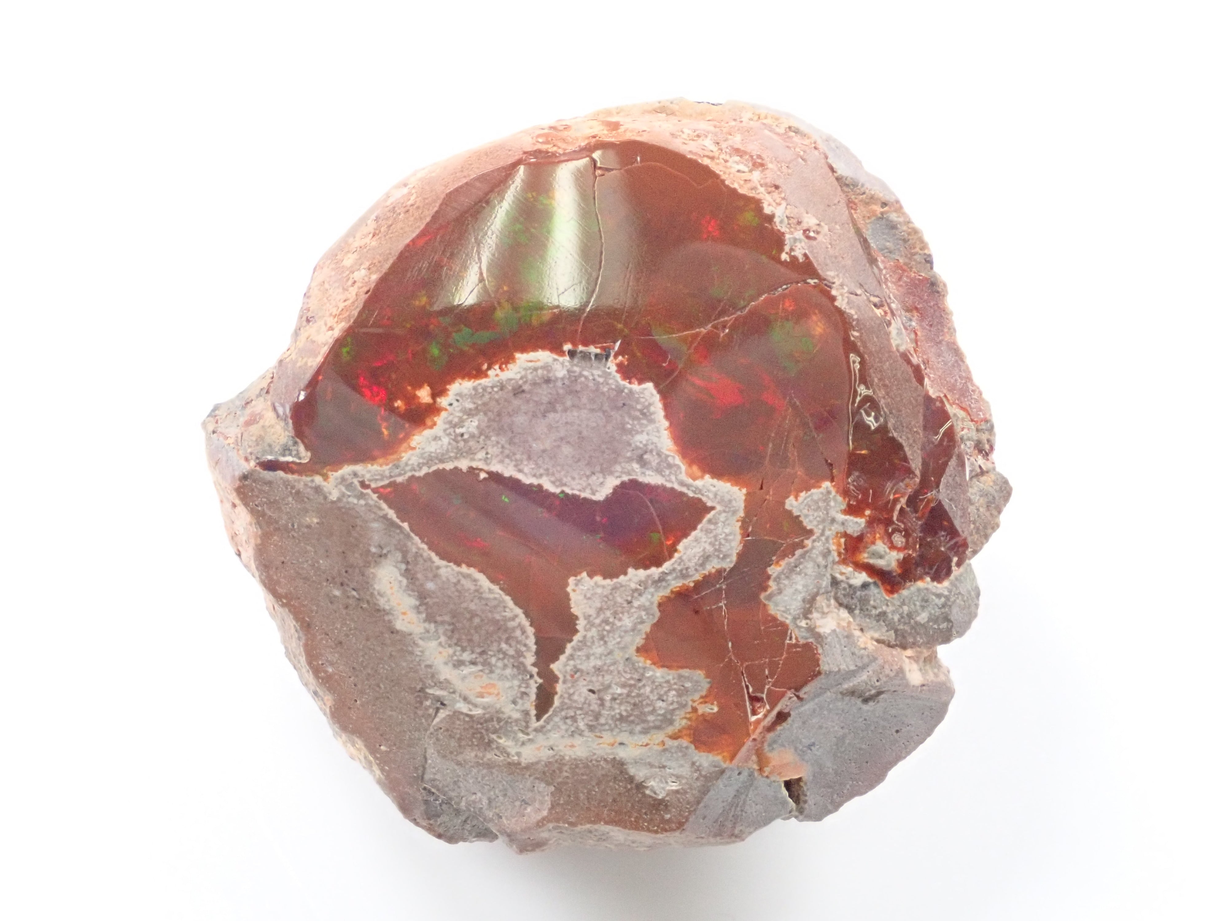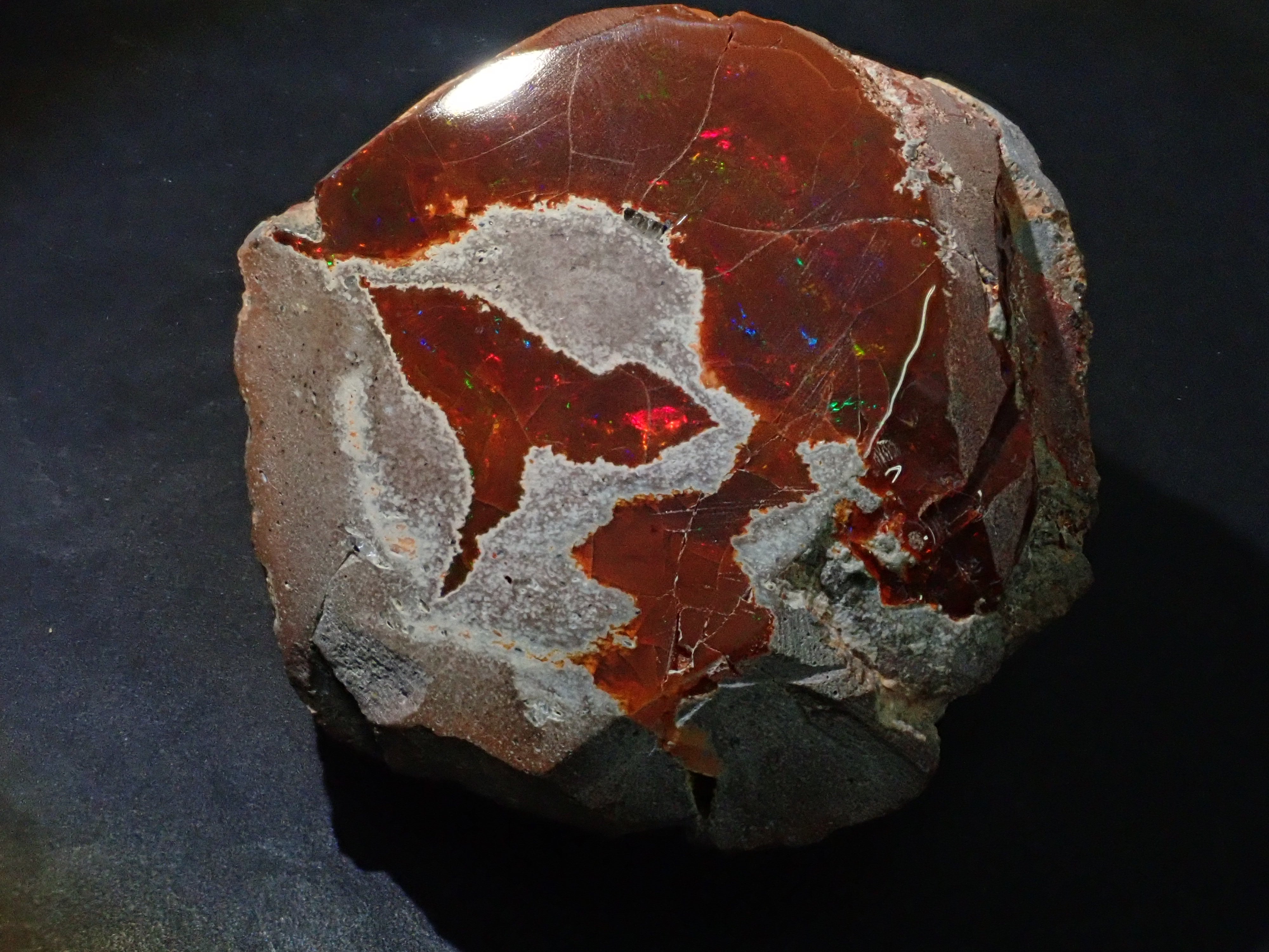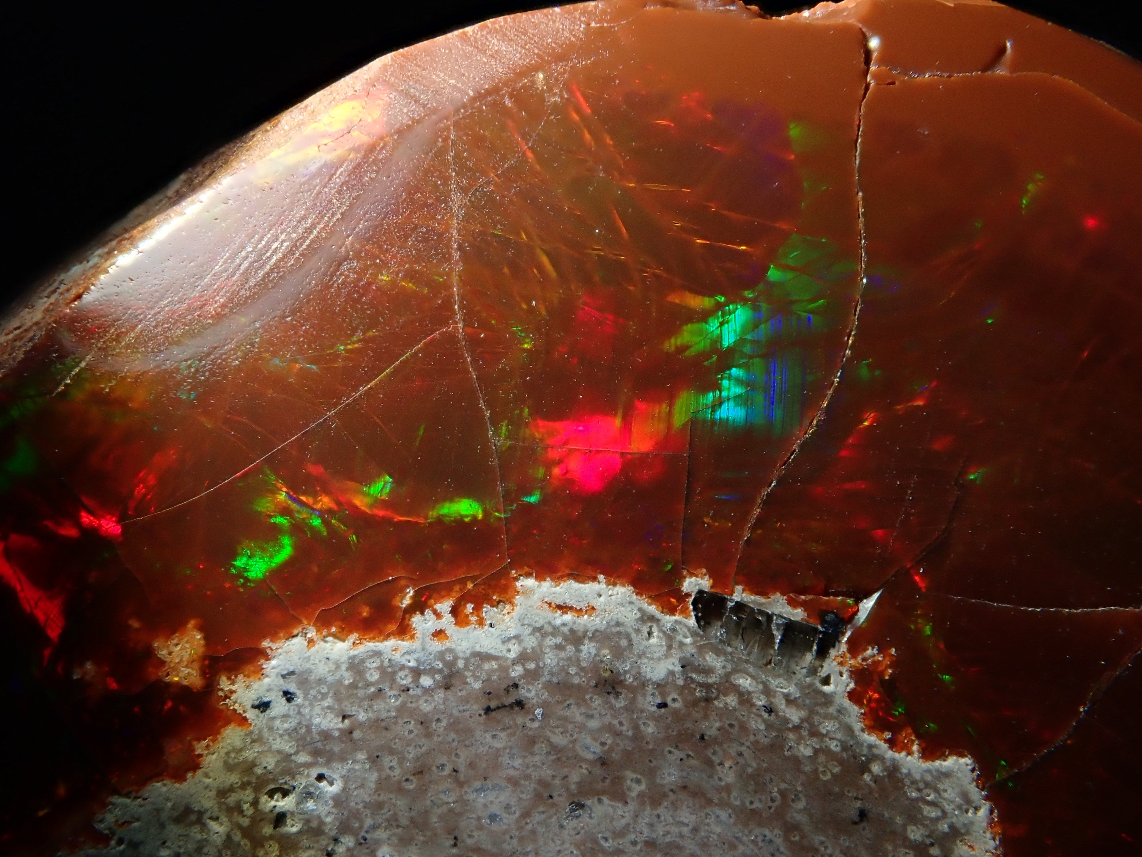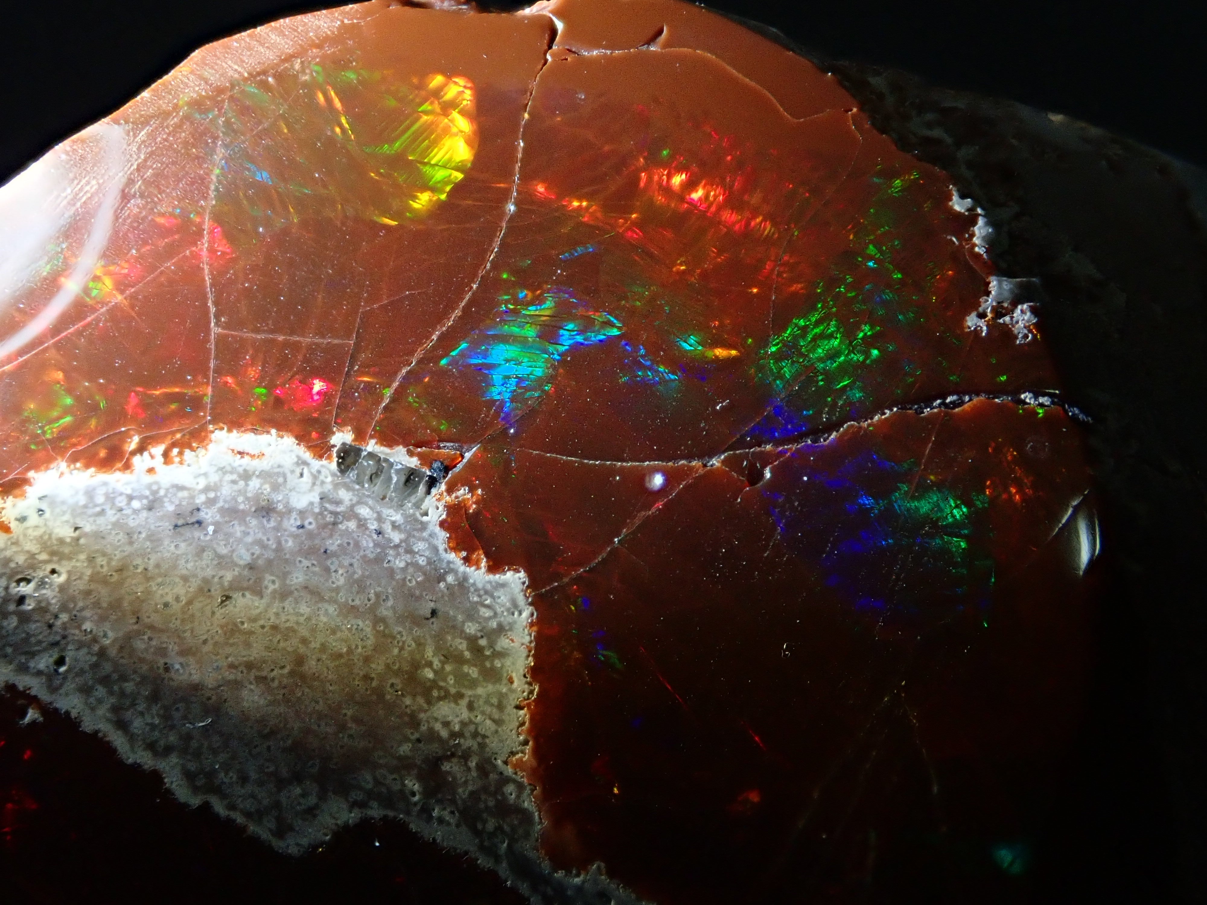 蛋白石是一種閃爍著彩虹色光芒的寶石。蛋白石是一種寶石,有許多不同的類型並具有多種表現形式。有些人被這種魅力所吸引,以至於只收集蛋白石。照片是使用筆燈拍攝的。本來,這種蛋白石原石有很多孔,但這種蛋白石也有孔。