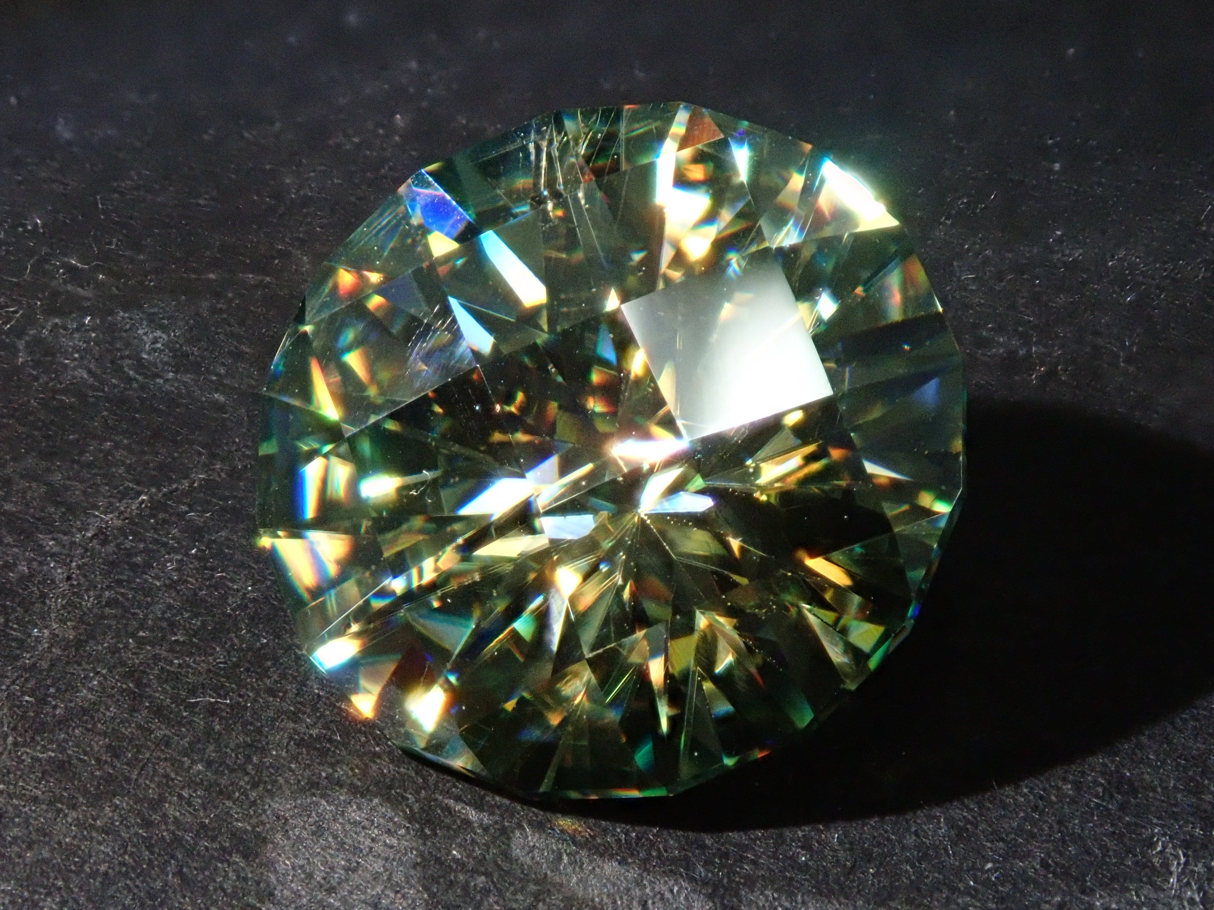 莫桑石的硬度為9.5,僅次於硬度為10的鑽石,並且比鑽石、榍石、濃綠榴石石榴石的分散率更高。事實上,它是一種適合寶石的礦物。由於天然寶石極為罕見,因此常見的是合成寶石。這也是一種合成莫桑石。莫桑石有多種顏色,因此收藏起來很有趣。請盡情享受眼前這耀眼的光芒。這是由斯里蘭卡熟練工匠桑傑先生(Sanjay Mr. Sanjay)進行的寬鬆切割。多邊形圓形切割 13.3 毫米。