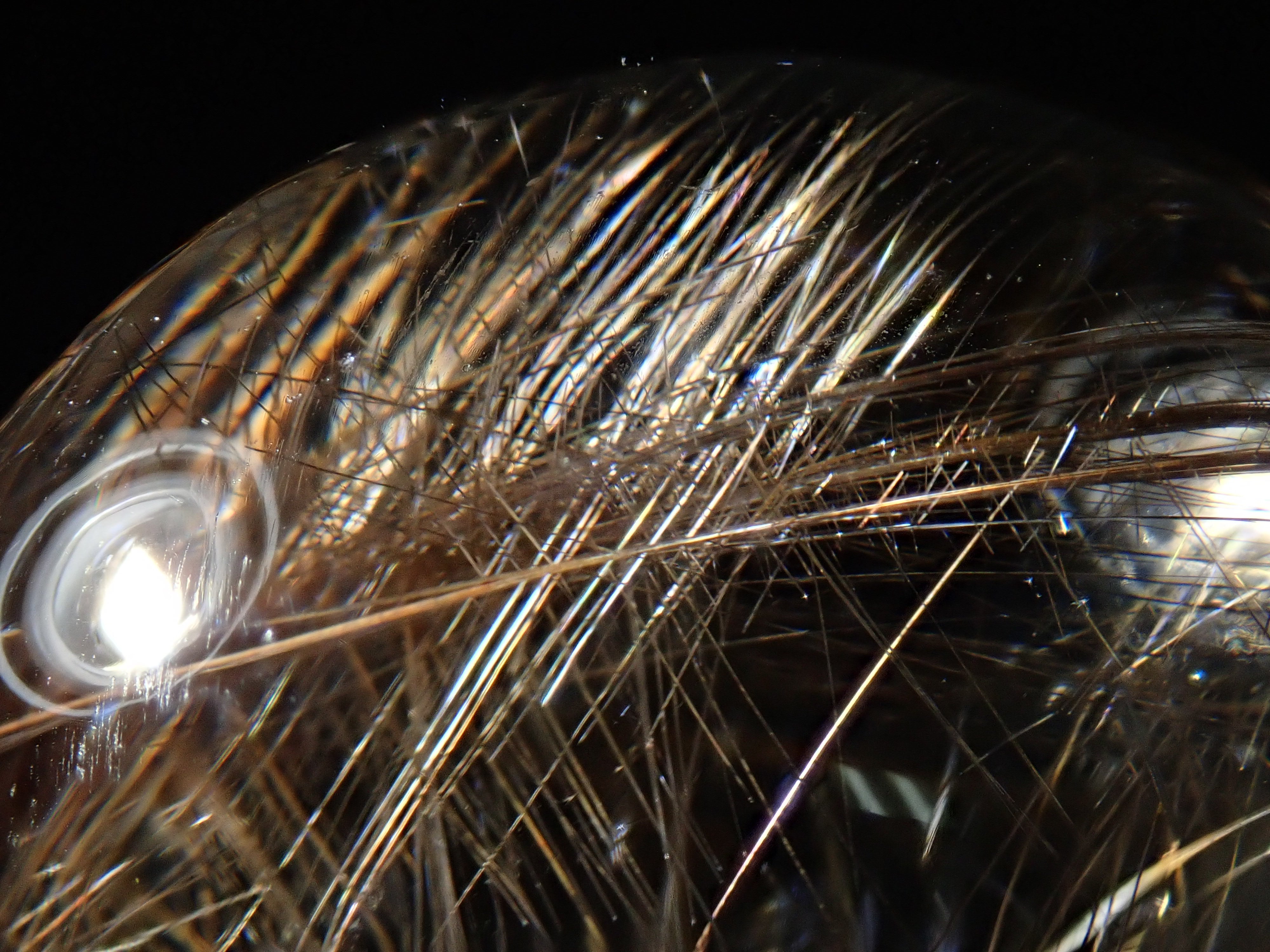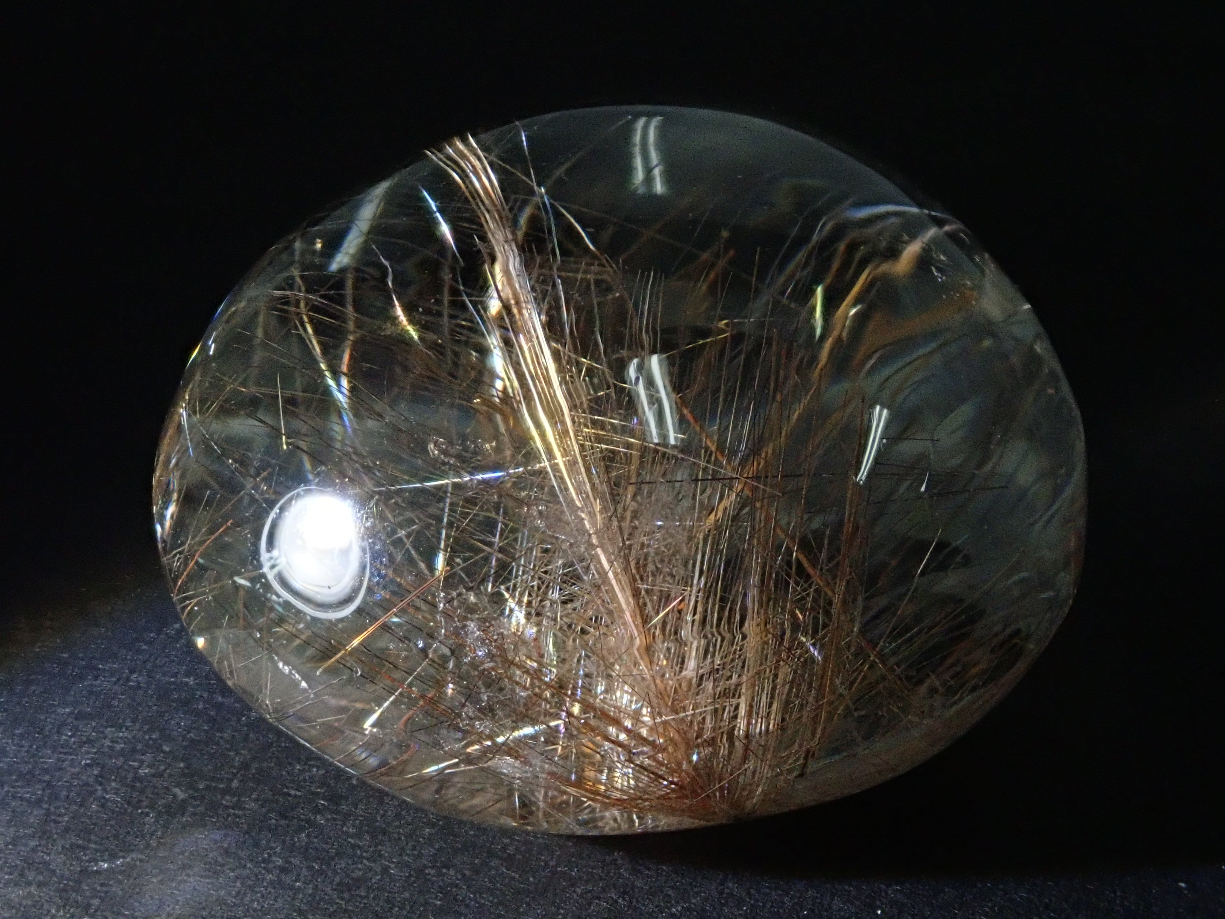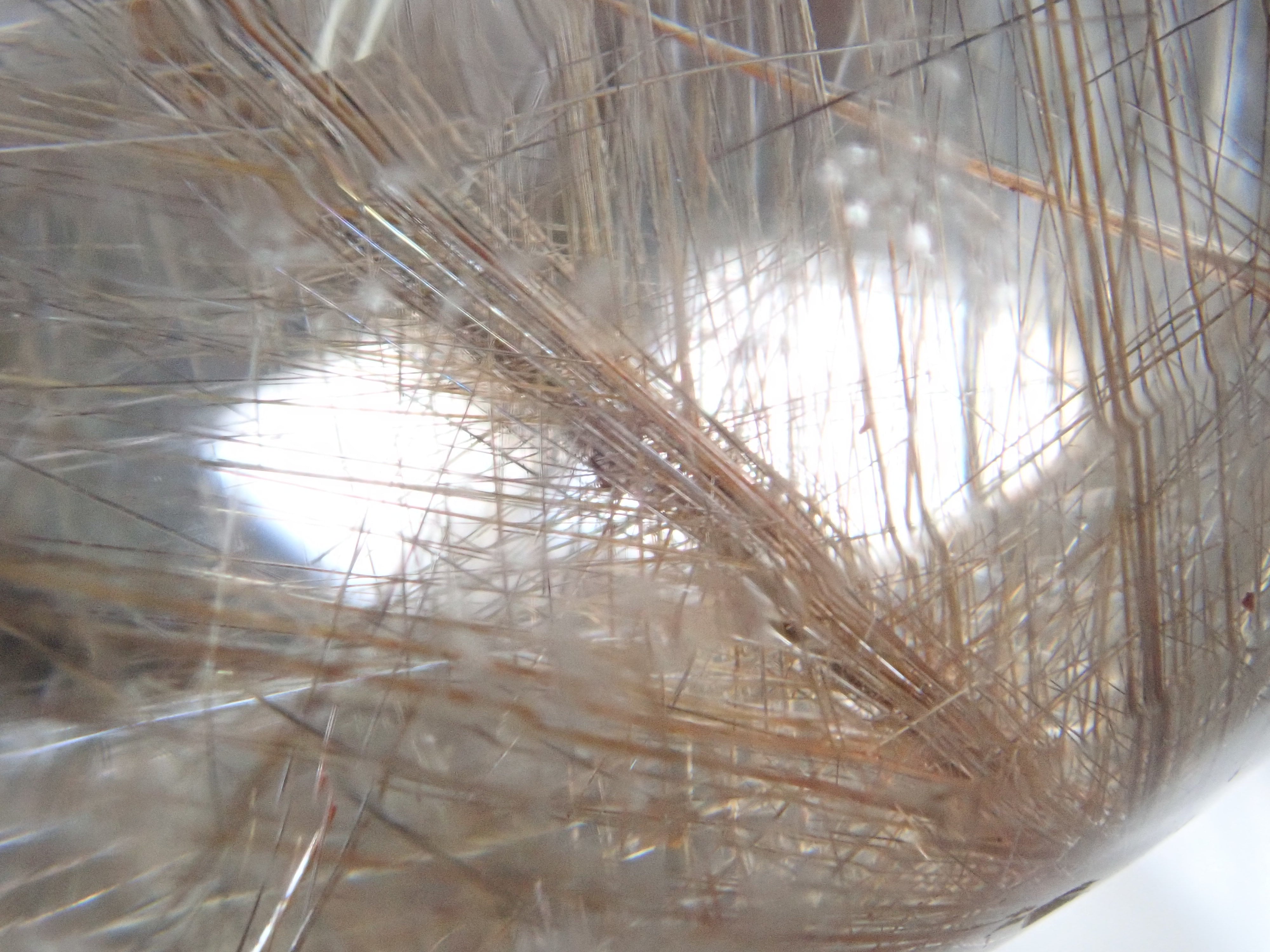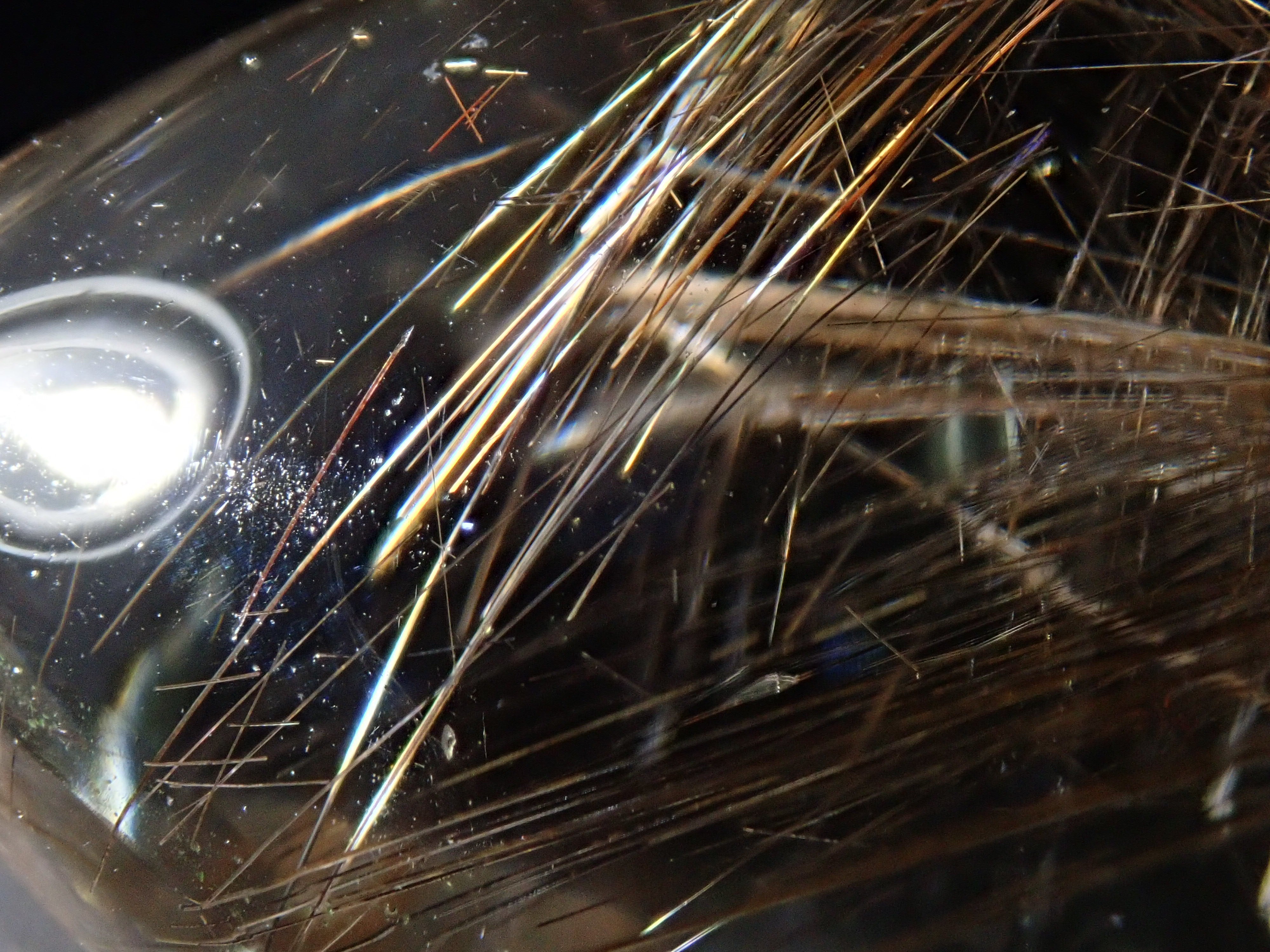 金紅石石英具有美麗的金色光澤。將一根由金紅石製成的「金針」插入晶體中。日本名字是“Kinkoishi”。它也被稱為“金紅石石英”、“金紅石石英”和“金紅石石英”。攝影時使用筆形燈捕捉內含物的美麗光芒。