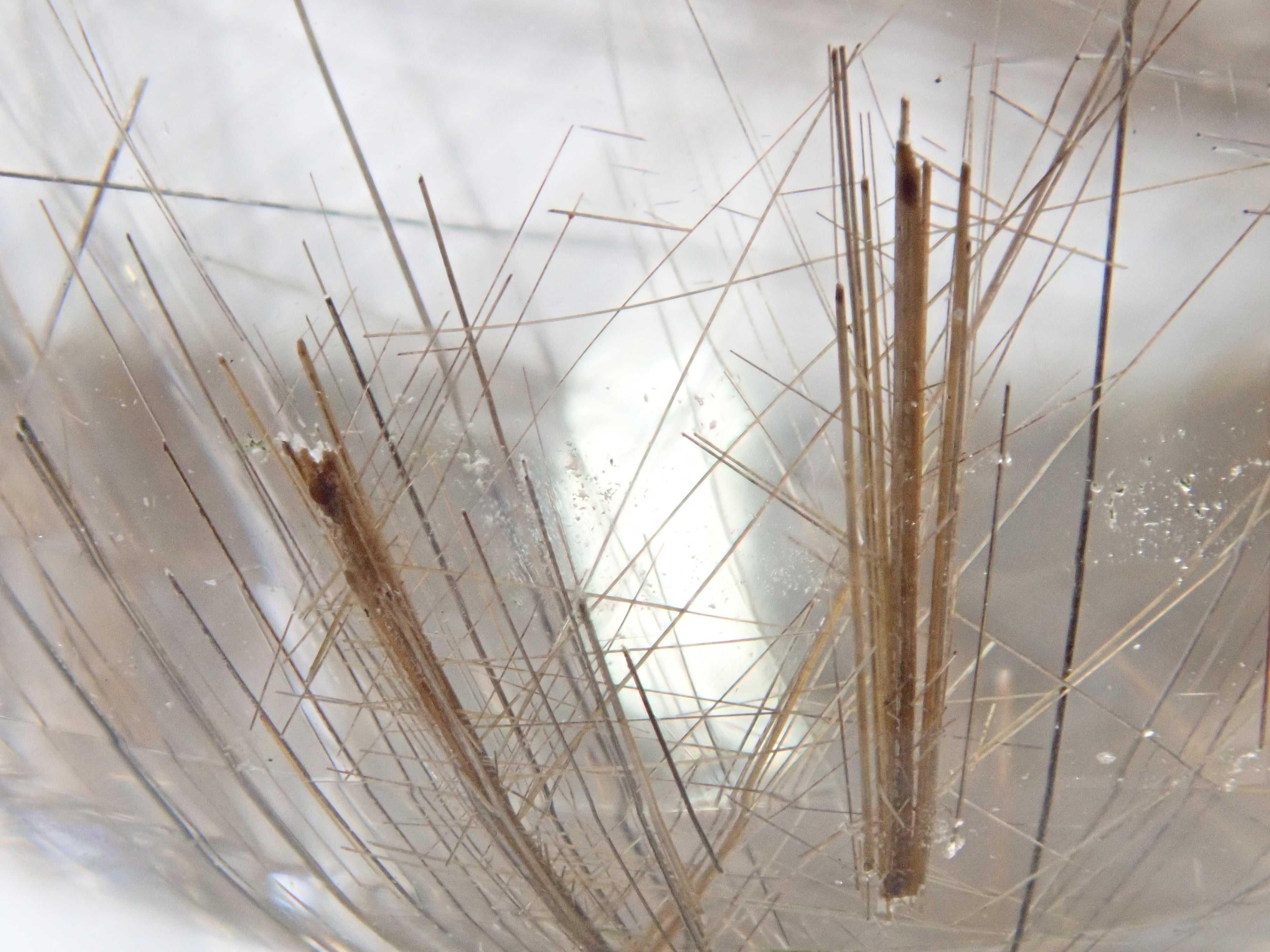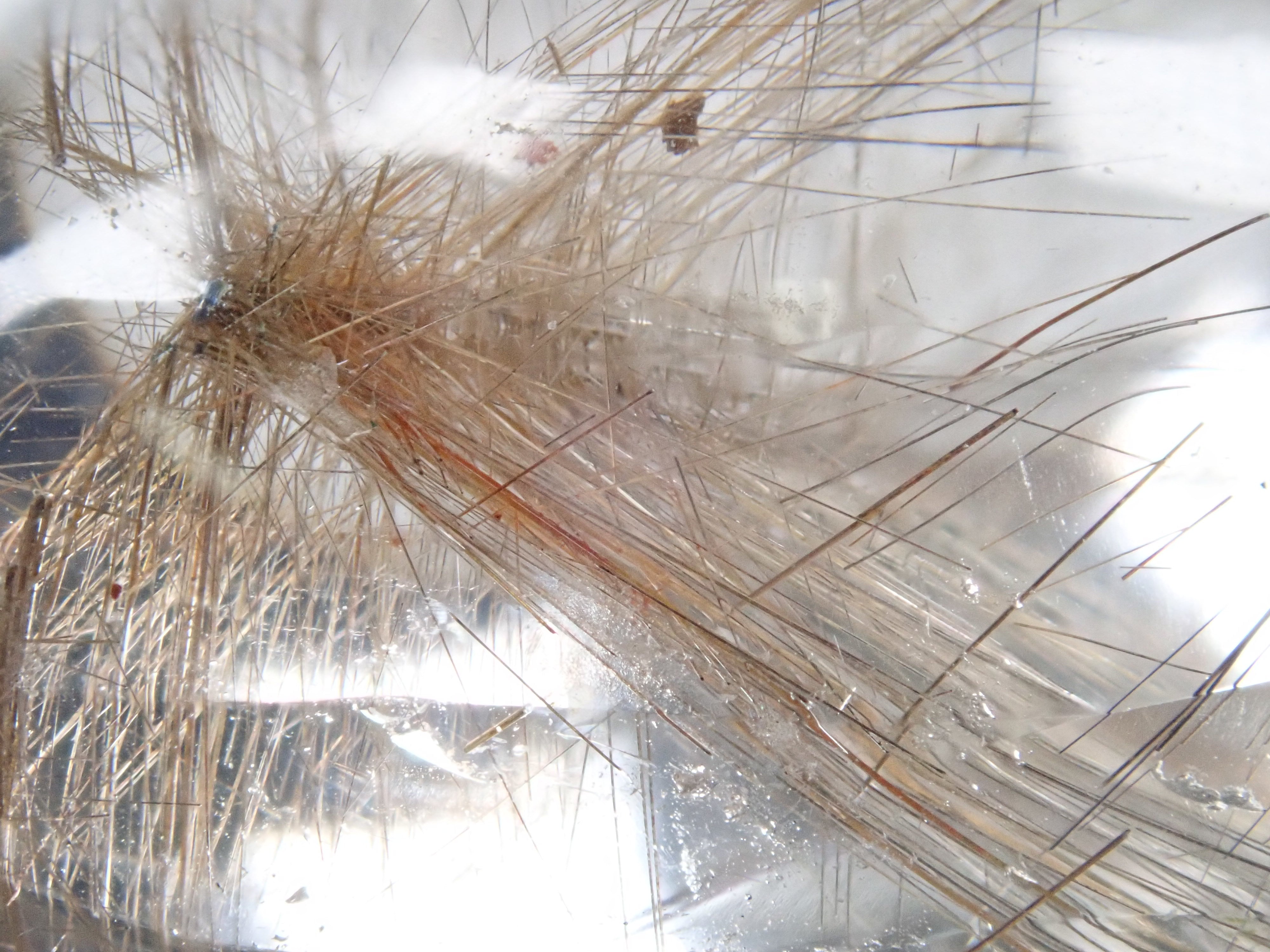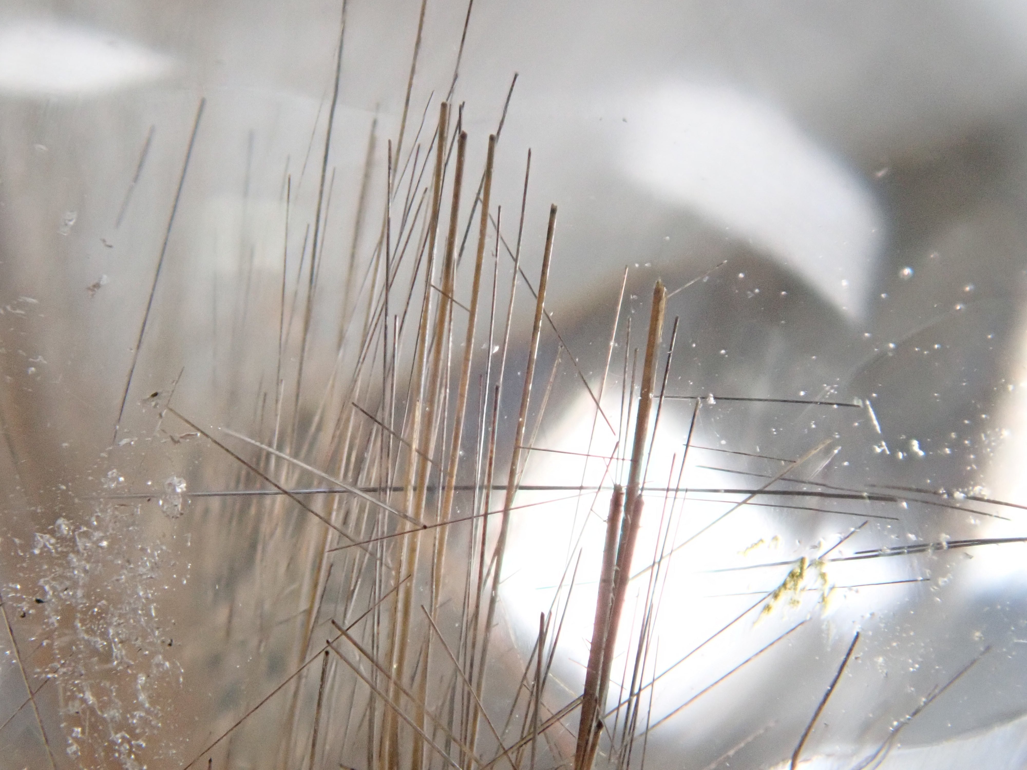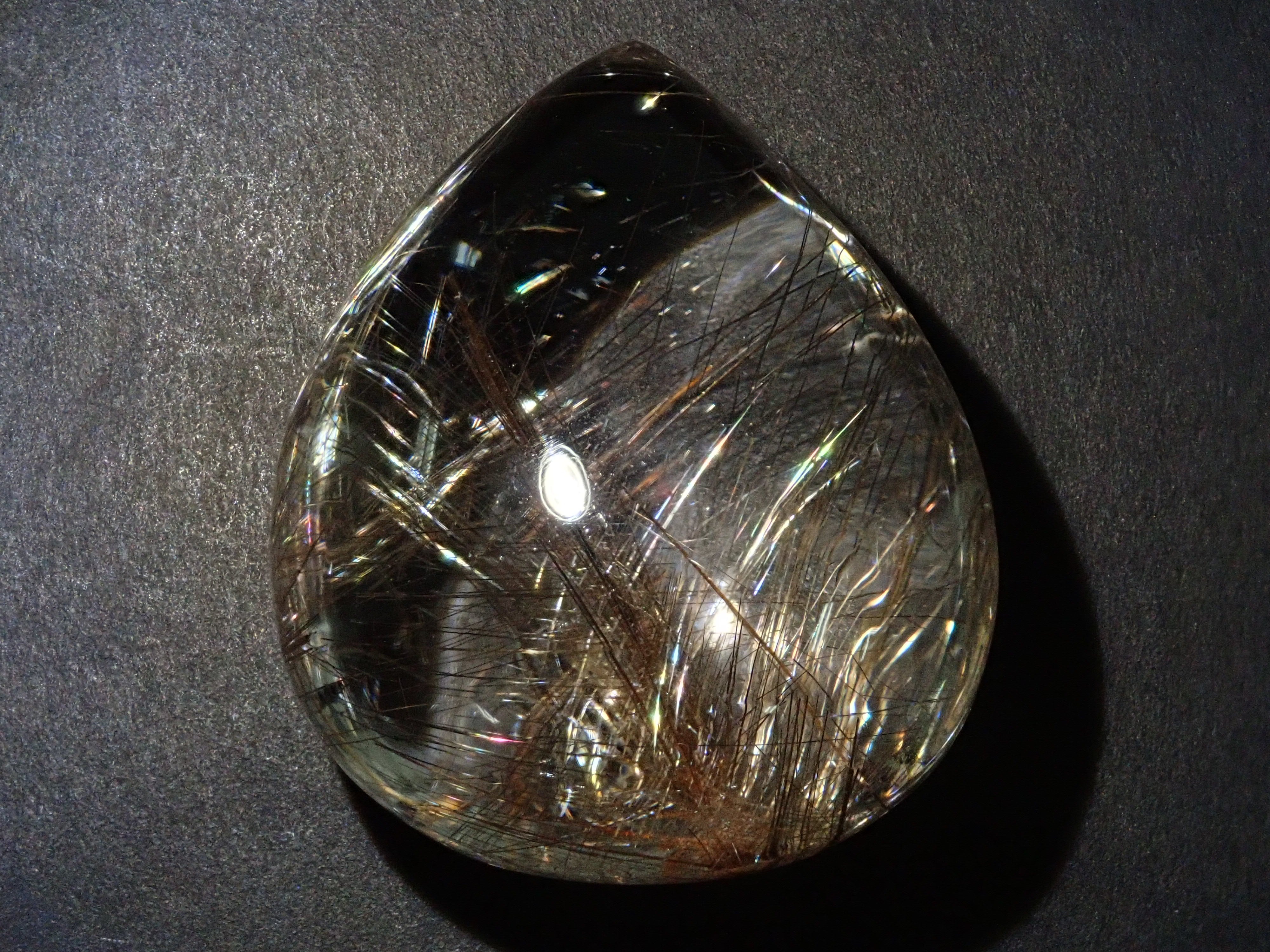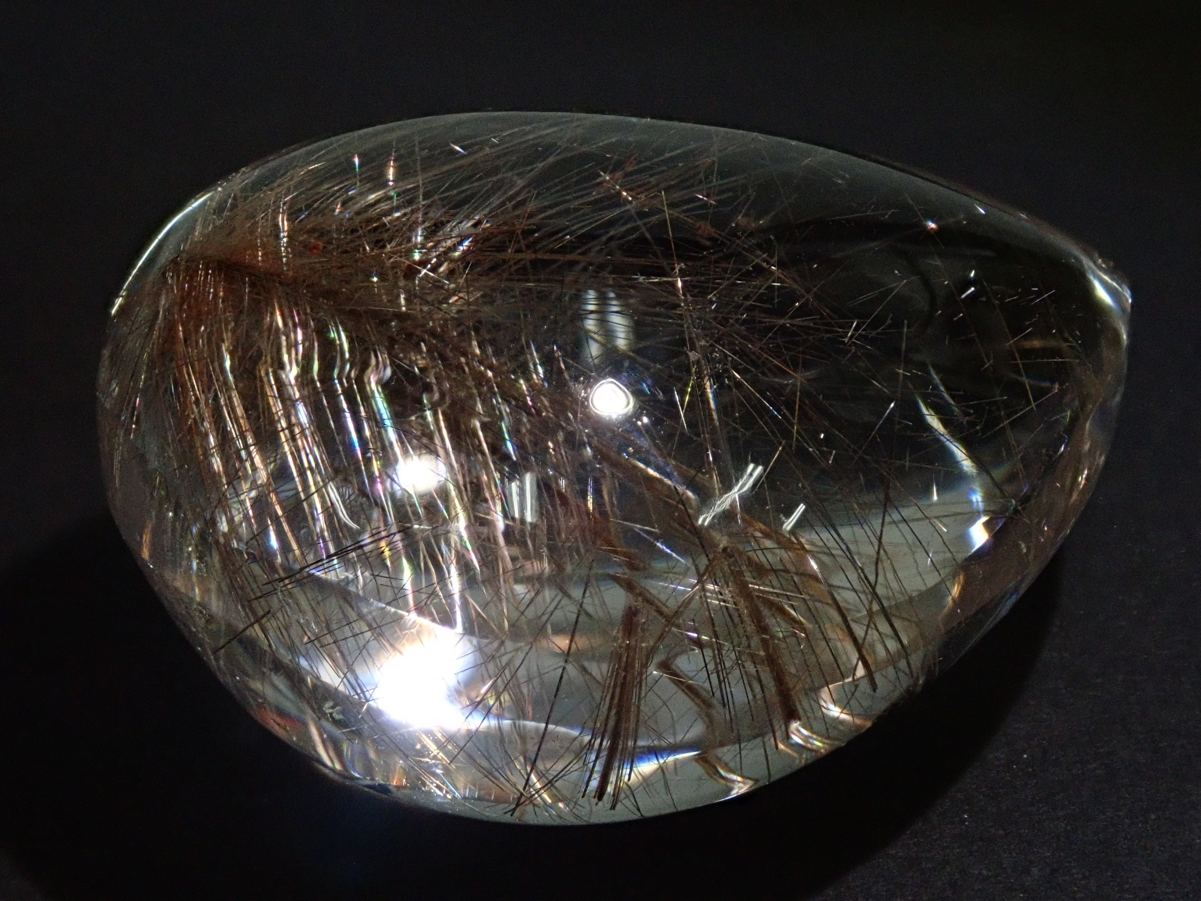 金紅石石英具有美麗的金色光澤。將一根由金紅石製成的「金針」插入晶體中。日本名字是“Kinkoishi”。它也被稱為“金紅石石英”、“金紅石石英”和“金紅石石英”。攝影時使用筆形燈捕捉內含物的美麗光芒。