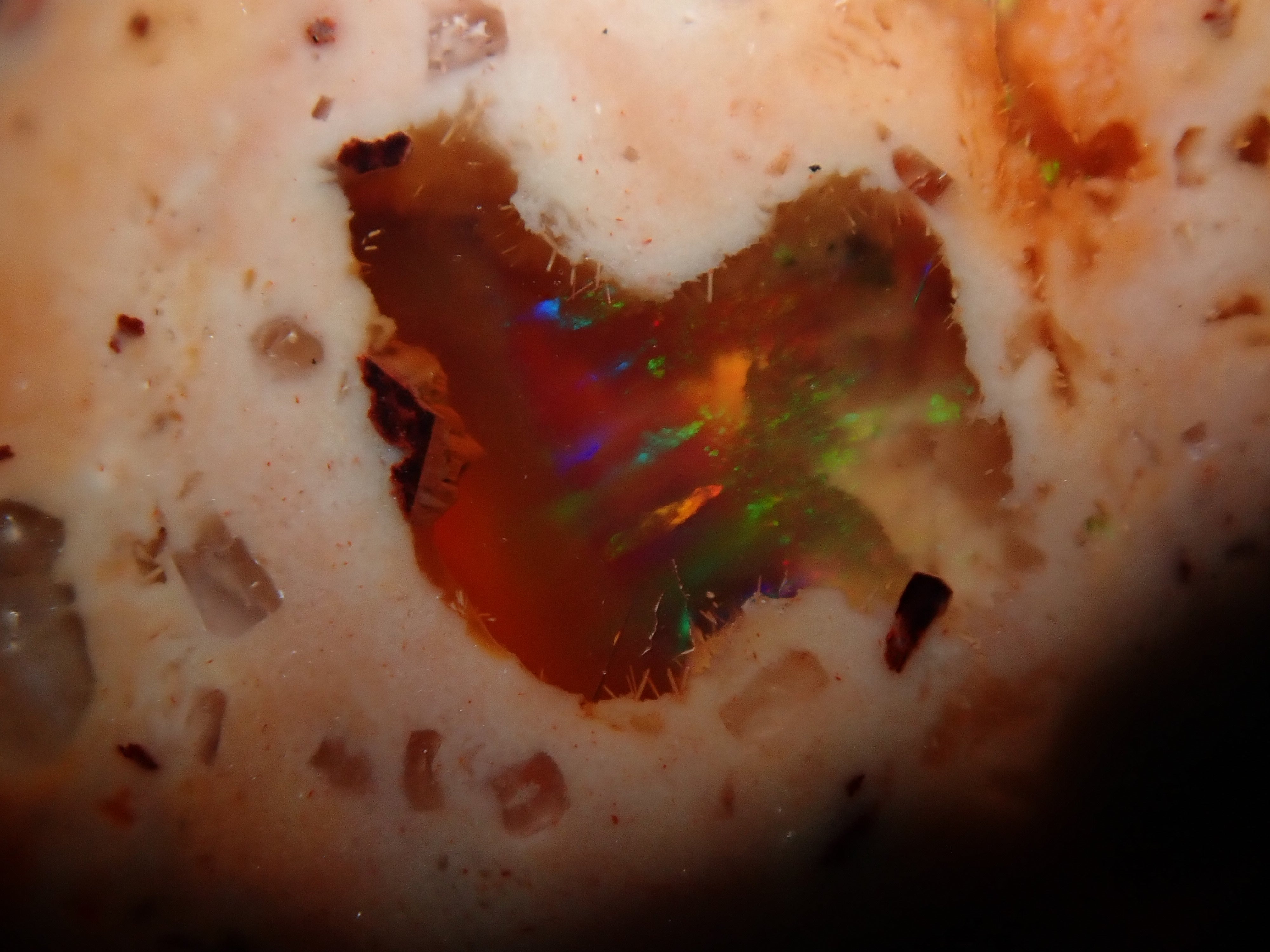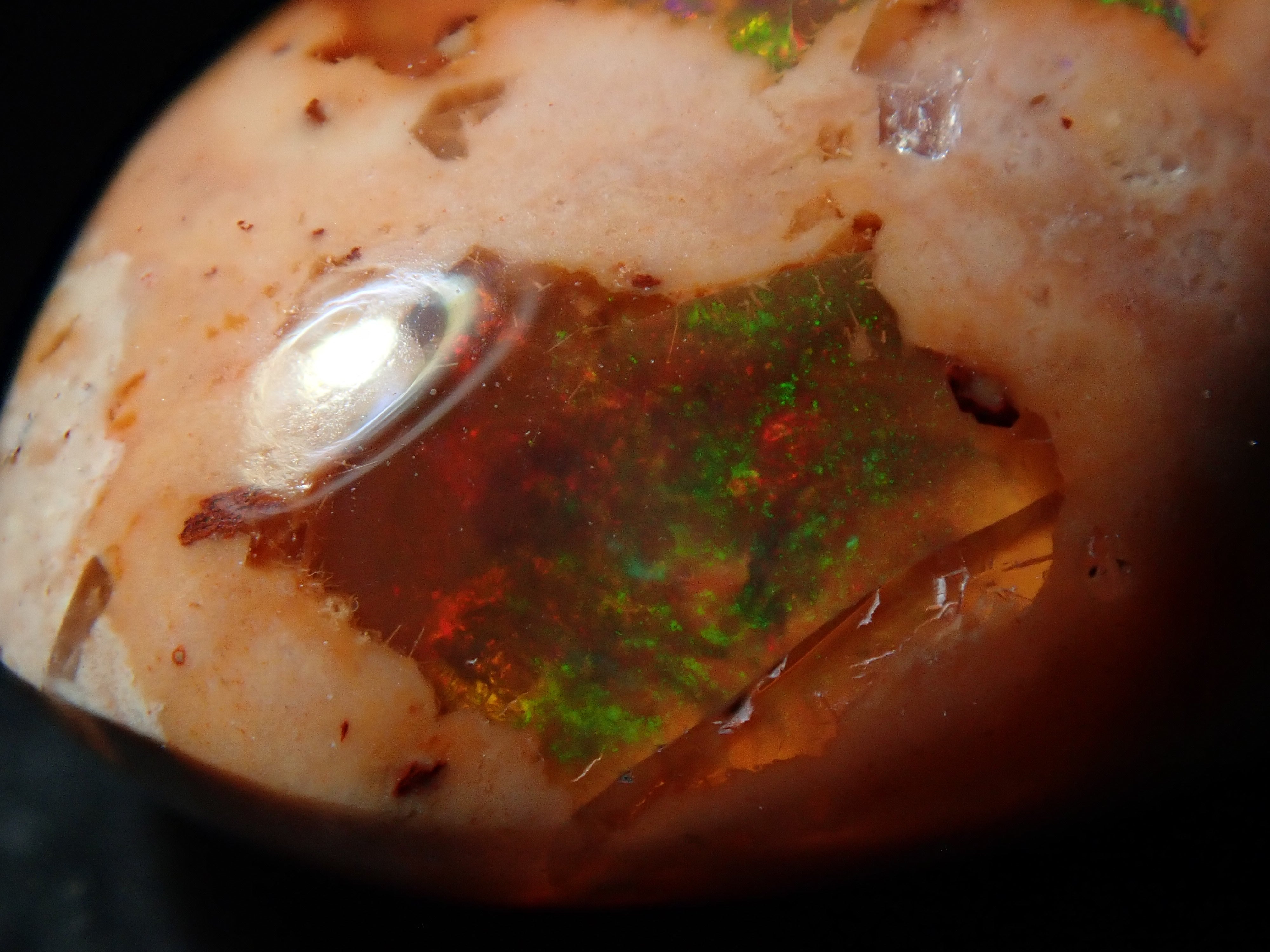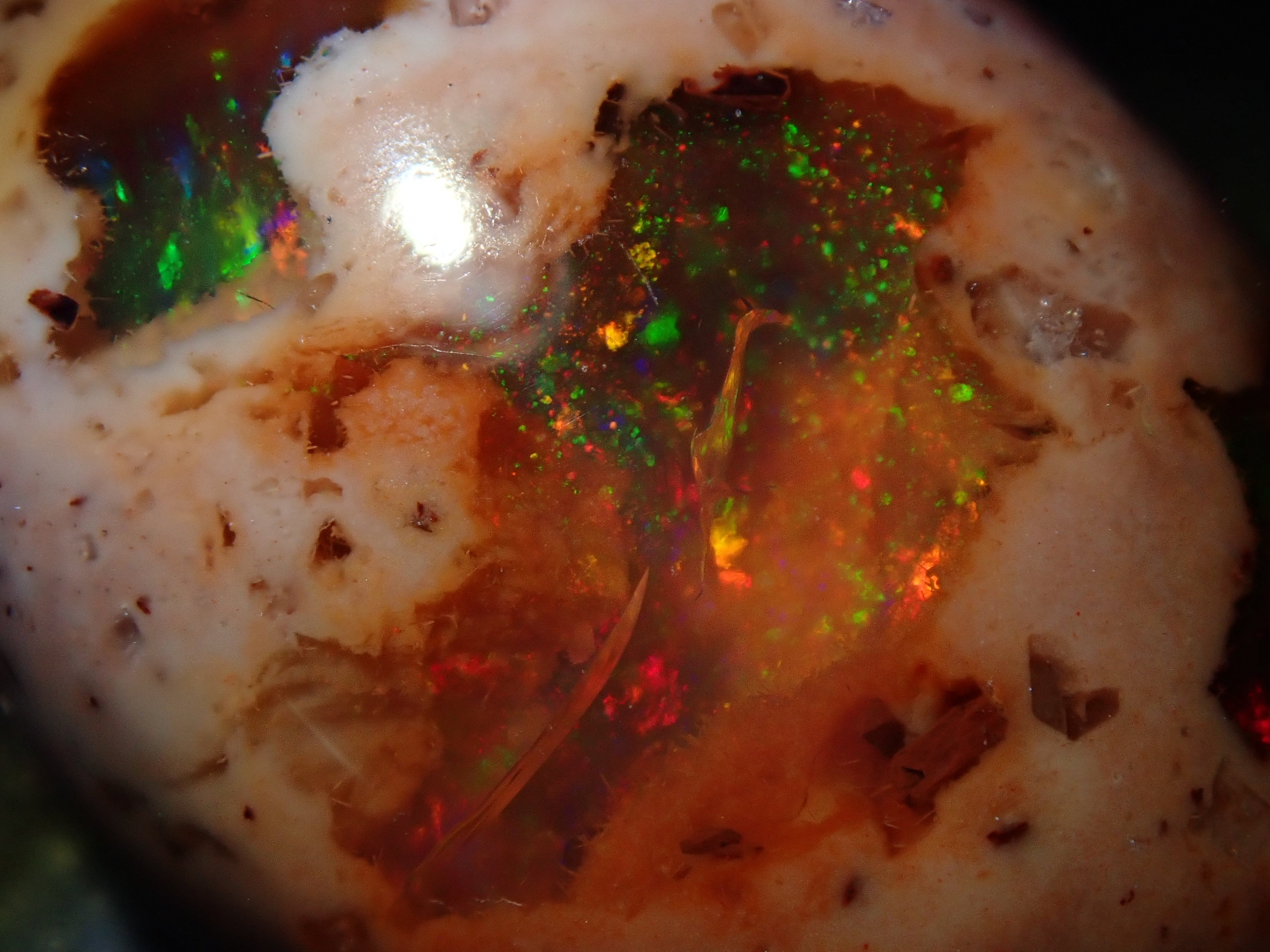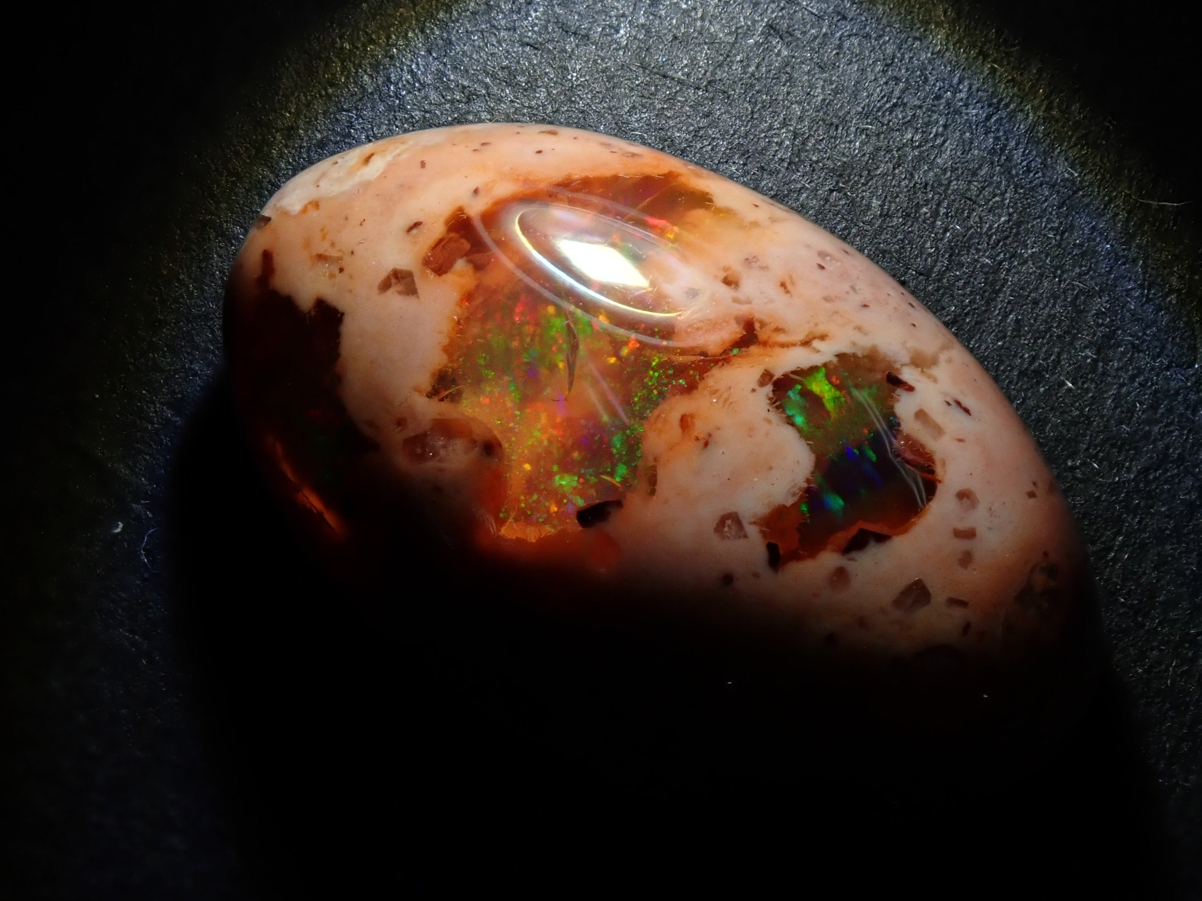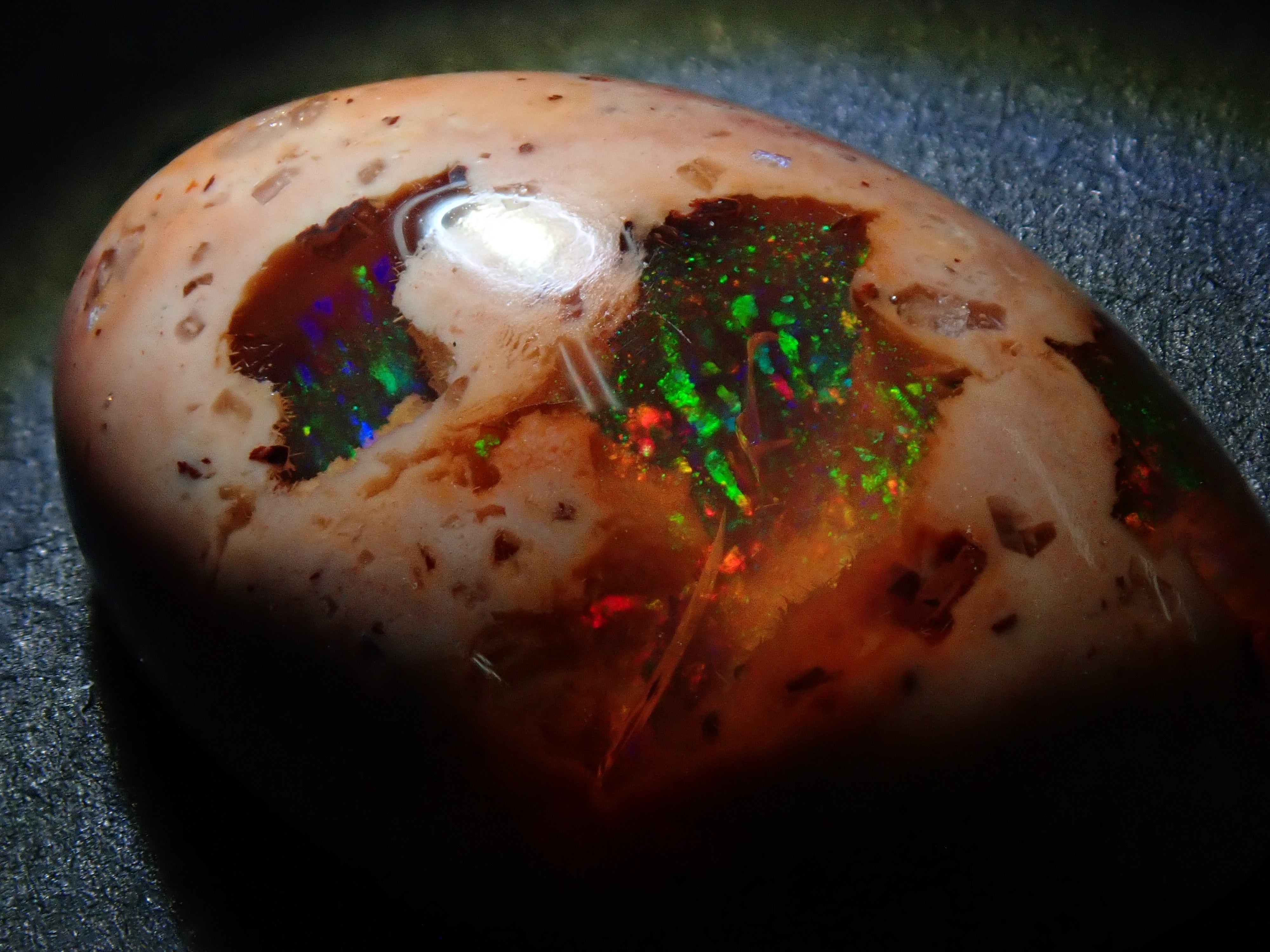 蛋白石是一種以閃耀的彩虹色為特徵的寶石。蛋白石種類繁多,其中坎特拉蛋白石尤其受收藏家的青睞。它像徵著地球的活力,擁有眾多愛好者,即使是散裝的也可以欣賞。坎特拉蛋白石天然光澤豐富。這張照片是用筆型電筒拍攝的。這塊坎特拉蛋白石也同樣具有光澤。