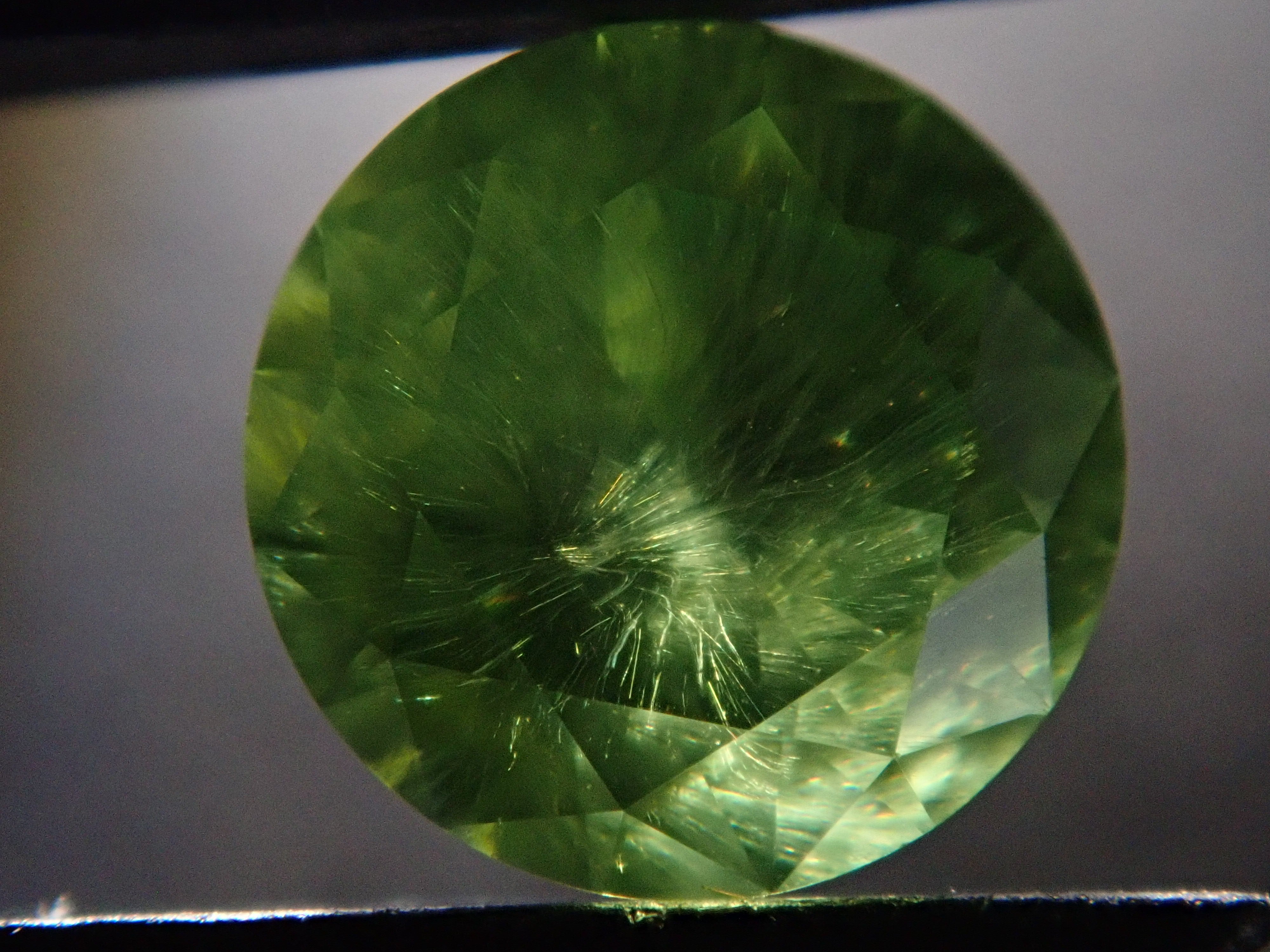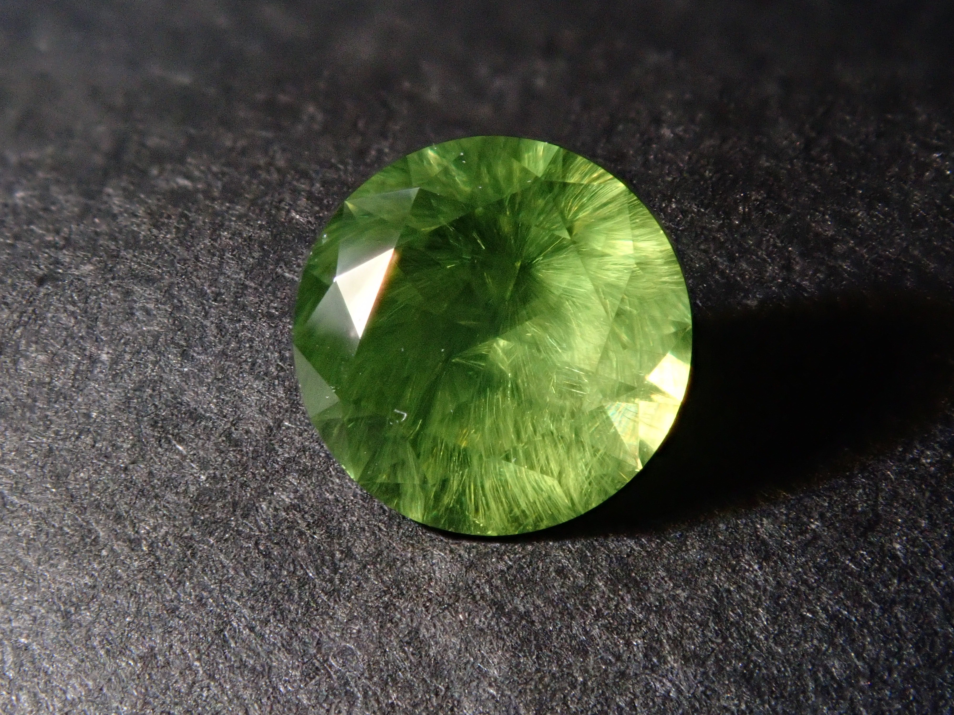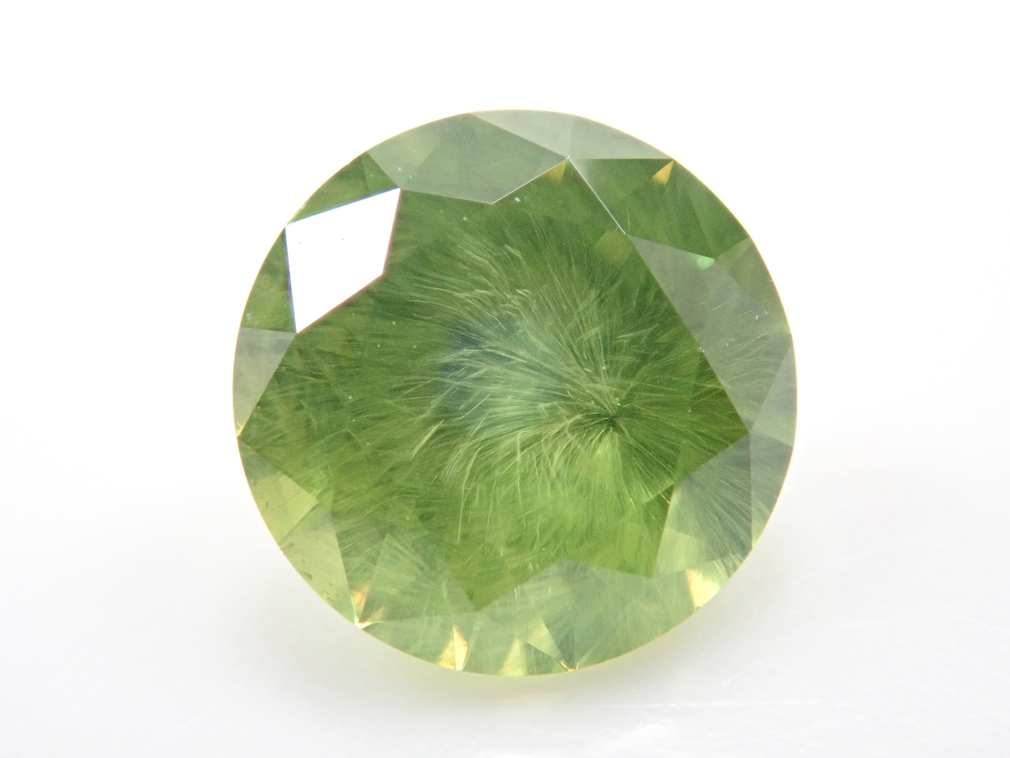 石榴石具有強烈的光色散和強烈的閃光。其中,這顆綠色的「濃綠榴石」是一種特別美麗且稀有的石榴石。這種類型稱為“馬尾”,內含物看起來像馬尾巴。馬尾的存在或不存在已透過顯微鏡檢查來確認。這是來自俄羅斯的稀有產品。圓形切割 5.3 毫米。