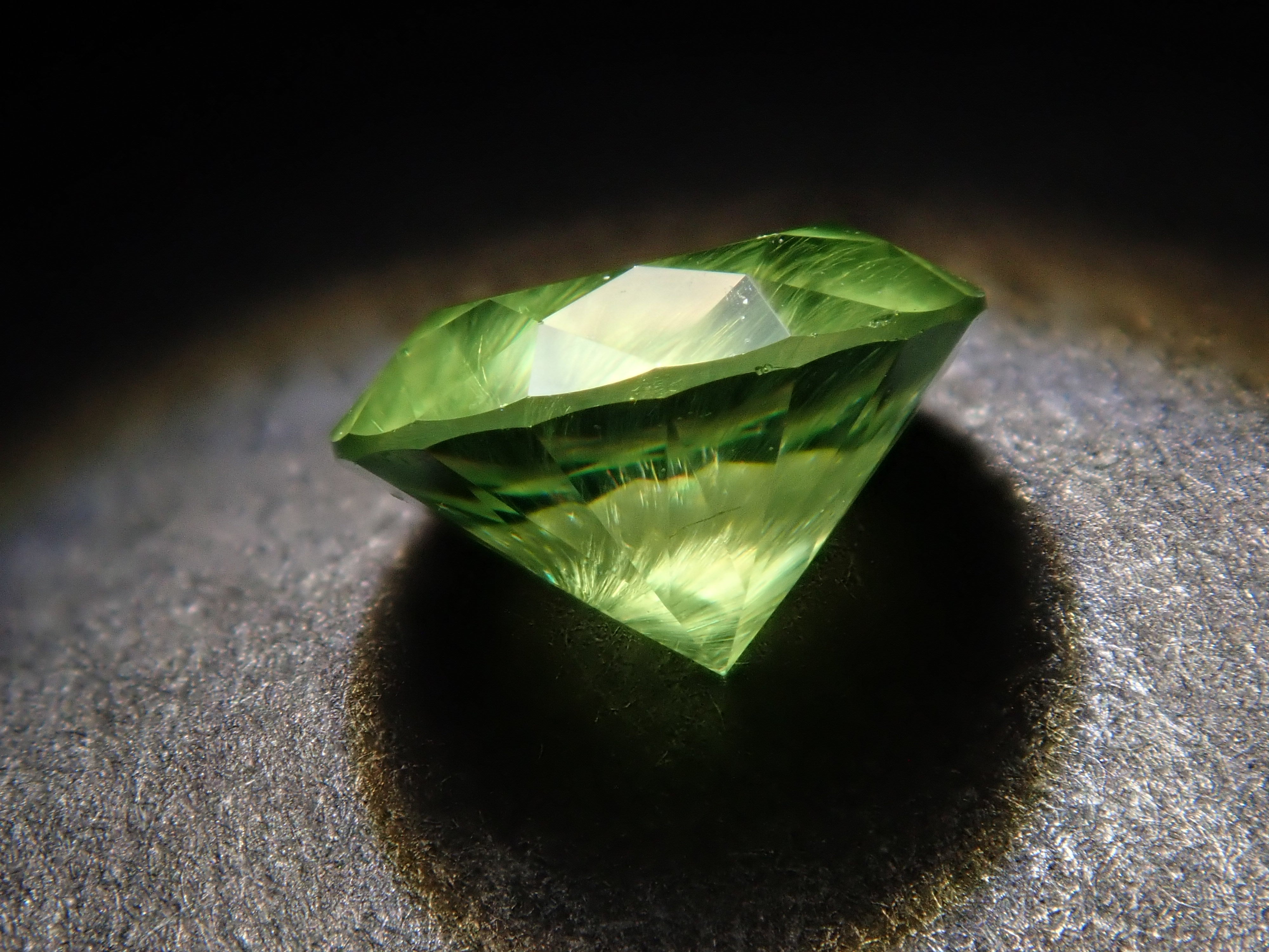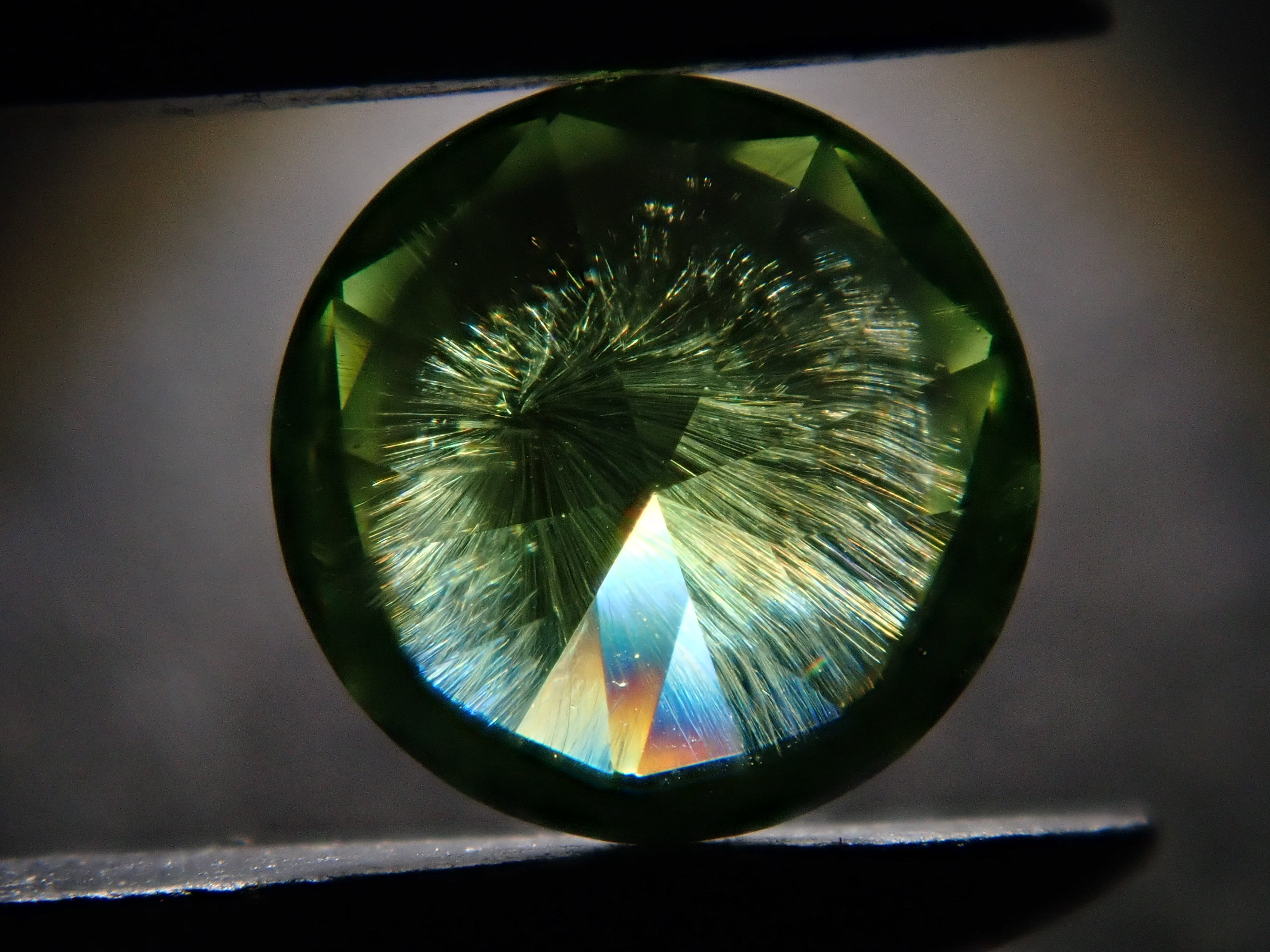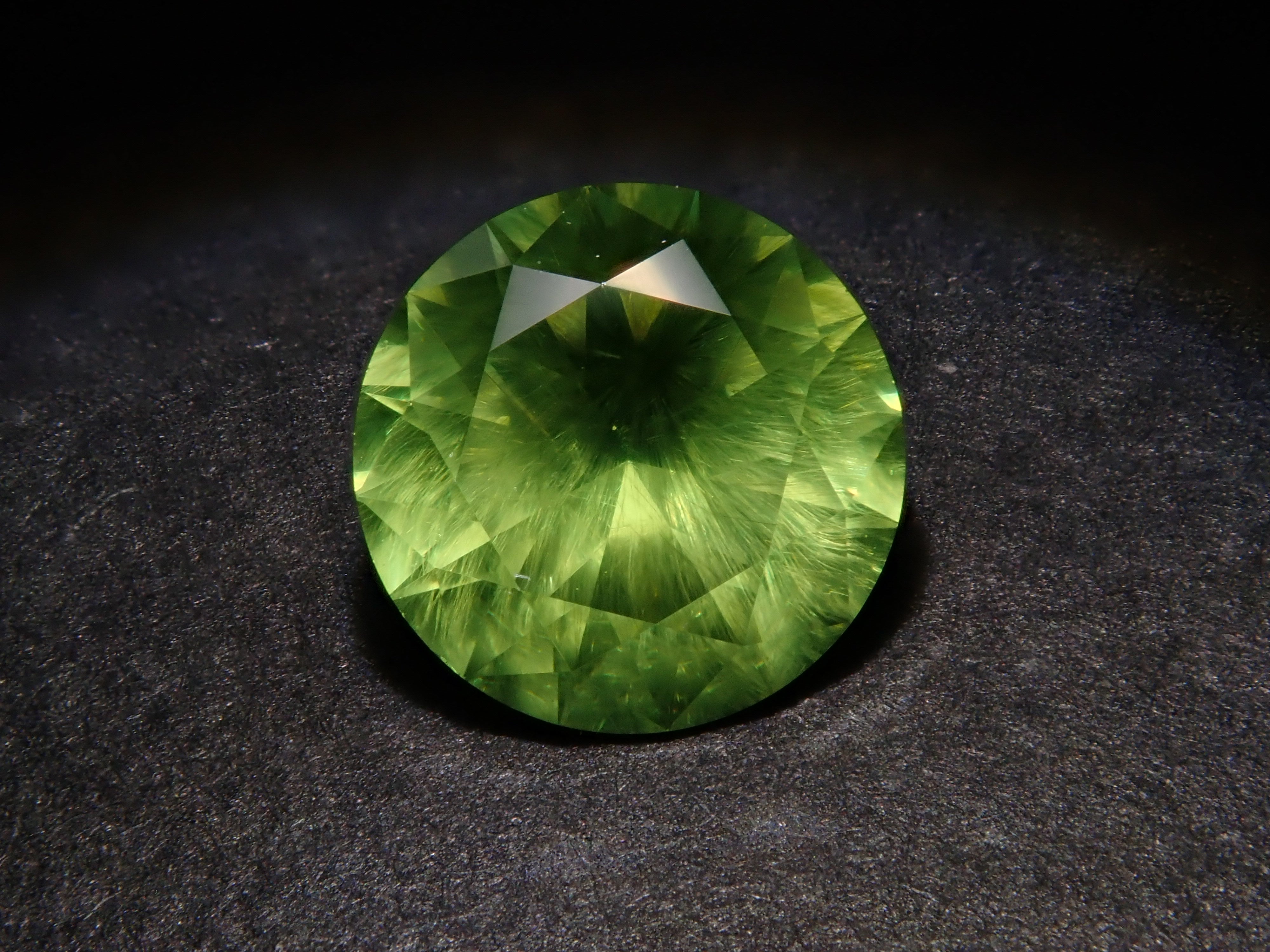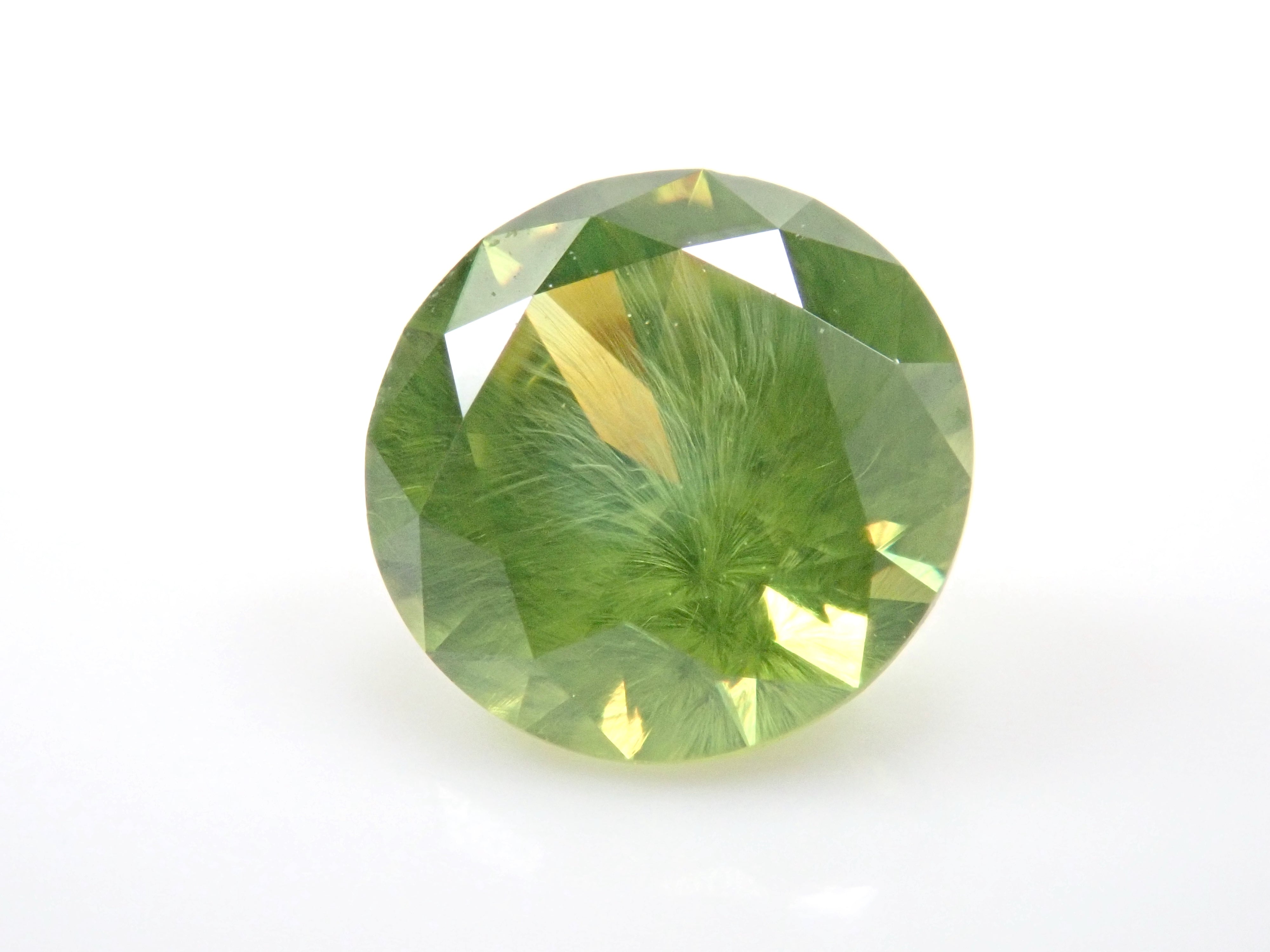 石榴石具有強烈的光色散和強烈的閃光。其中,這顆綠色的「濃綠榴石」是一種特別美麗且稀有的石榴石。這種類型稱為“馬尾”,內含物看起來像馬尾巴。馬尾的存在或不存在已透過顯微鏡檢查來確認。這是來自俄羅斯的稀有產品。圓形切割 5.3 毫米。