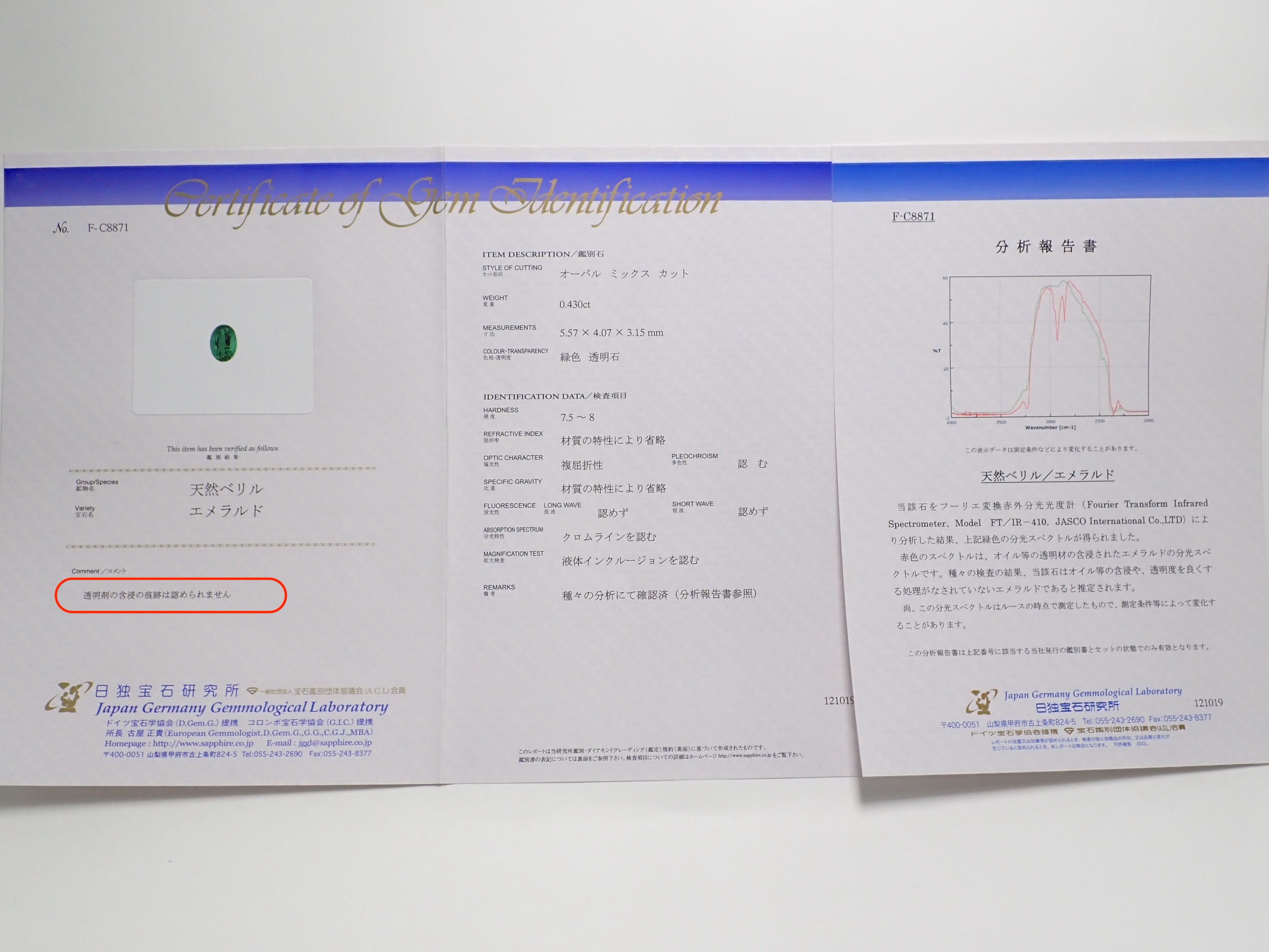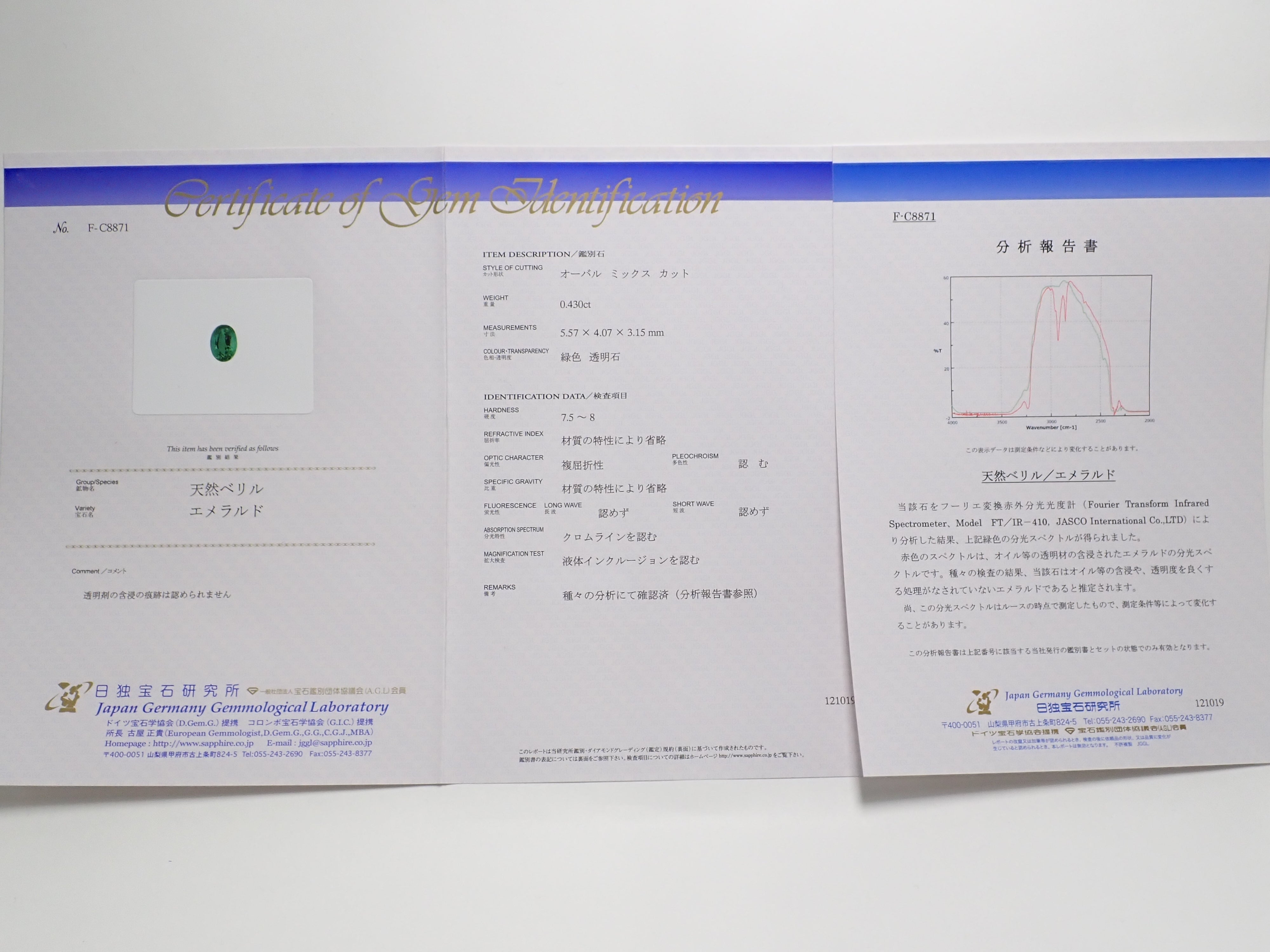 祖母綠是一種因受到埃及豔後克莉奧佩特拉的喜愛而聞名的寶石。它也是一塊有瑕疵的石頭,以至於有「完美無瑕的祖母綠比沒有瑕疵的人還少」的說法。因此,通常會使用油處理來使刮痕不那麼明顯,但這是一種罕見的未經過油處理的無油祖母綠。優質無油祖母綠,顏色深邃,透明度高。附有鑑定證書和日德寶石研究所的分析報告。