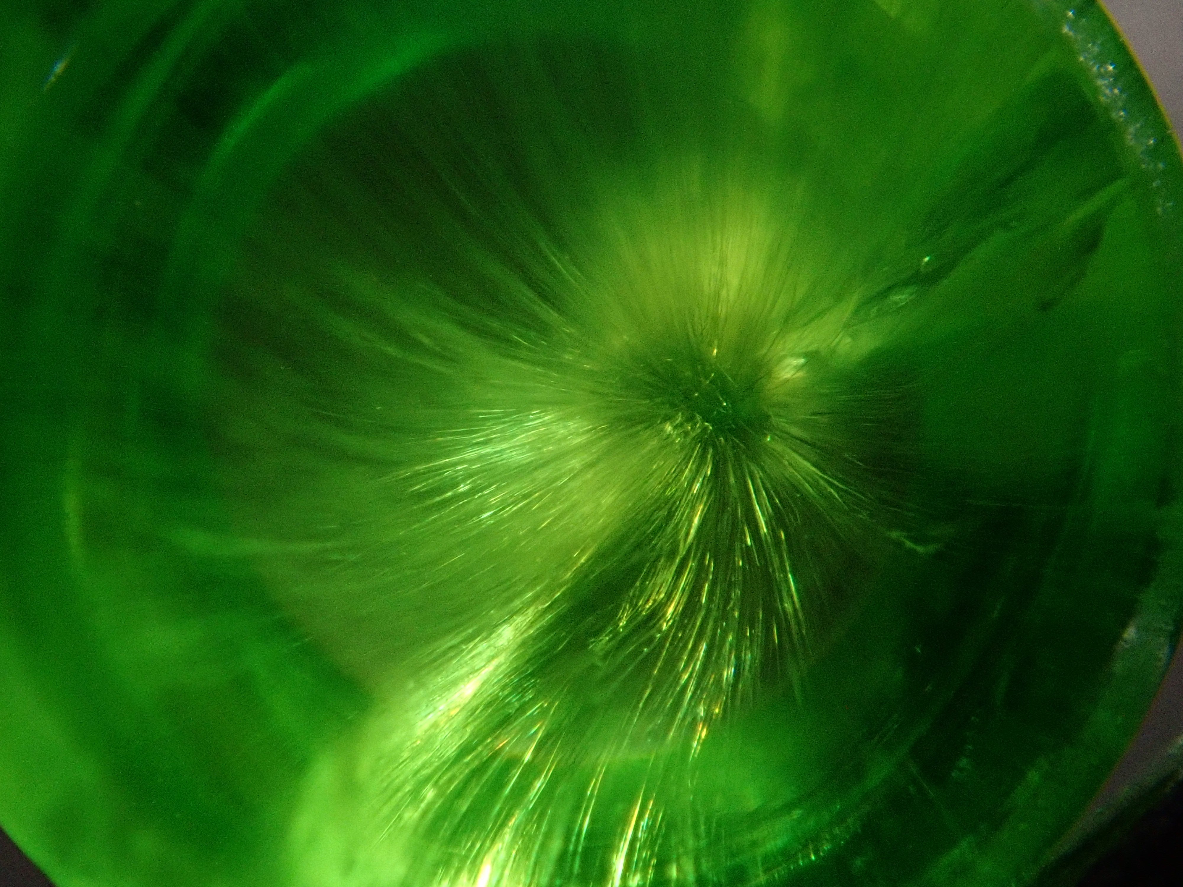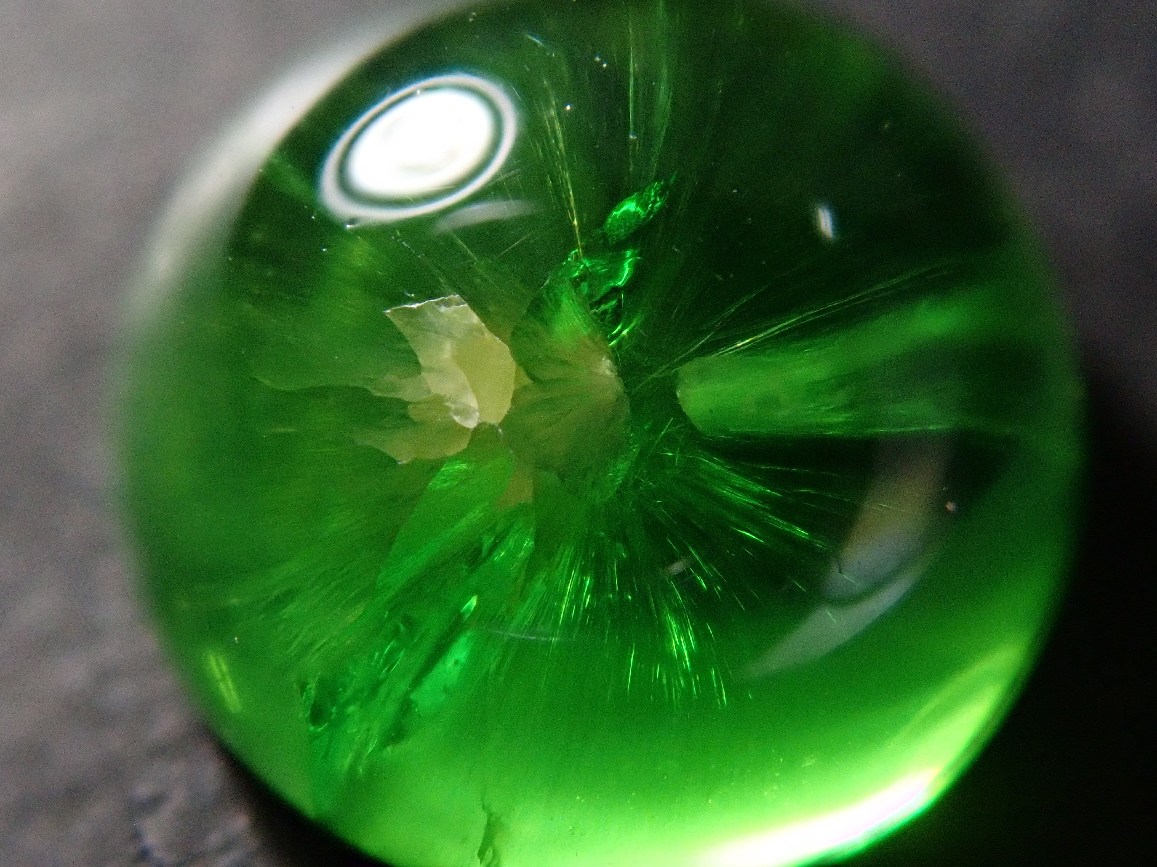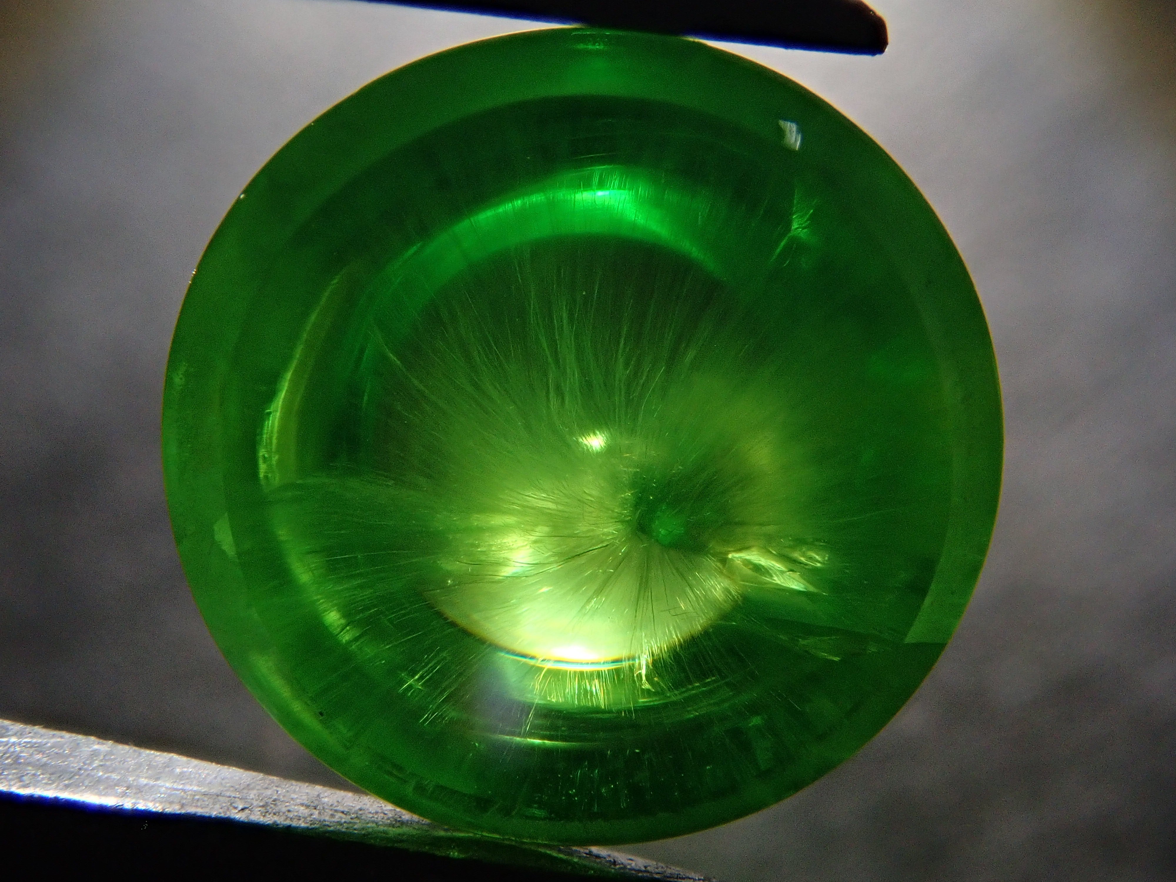 石榴石具有強烈的光色散和強烈的閃光。其中,這顆綠色的「濃綠榴石」是一種特別美麗且稀有的石榴石。這種類型的內含物被稱為“馬尾”,看起來像馬尾巴,甚至有貓眼效果。而且,這在俄羅斯也是很少見的。筆燈用於攝影。石頭的背面基本上是未拋光的。透過顯微鏡檢查證實了馬尾草的存在。這顆濃綠榴石是直接從俄羅斯濃綠榴石礦主購買的。它是超過 2 克拉的大顆粒。
