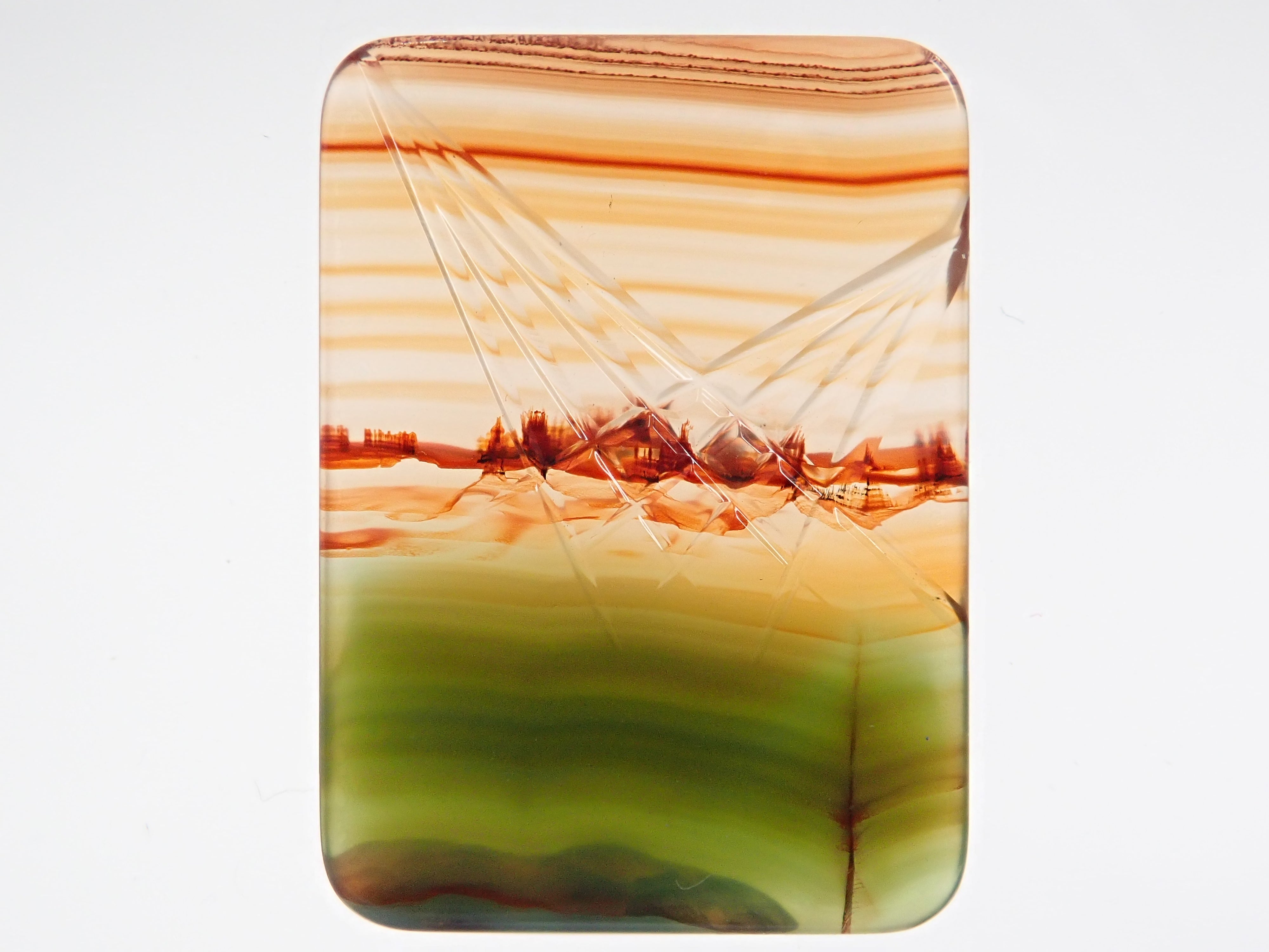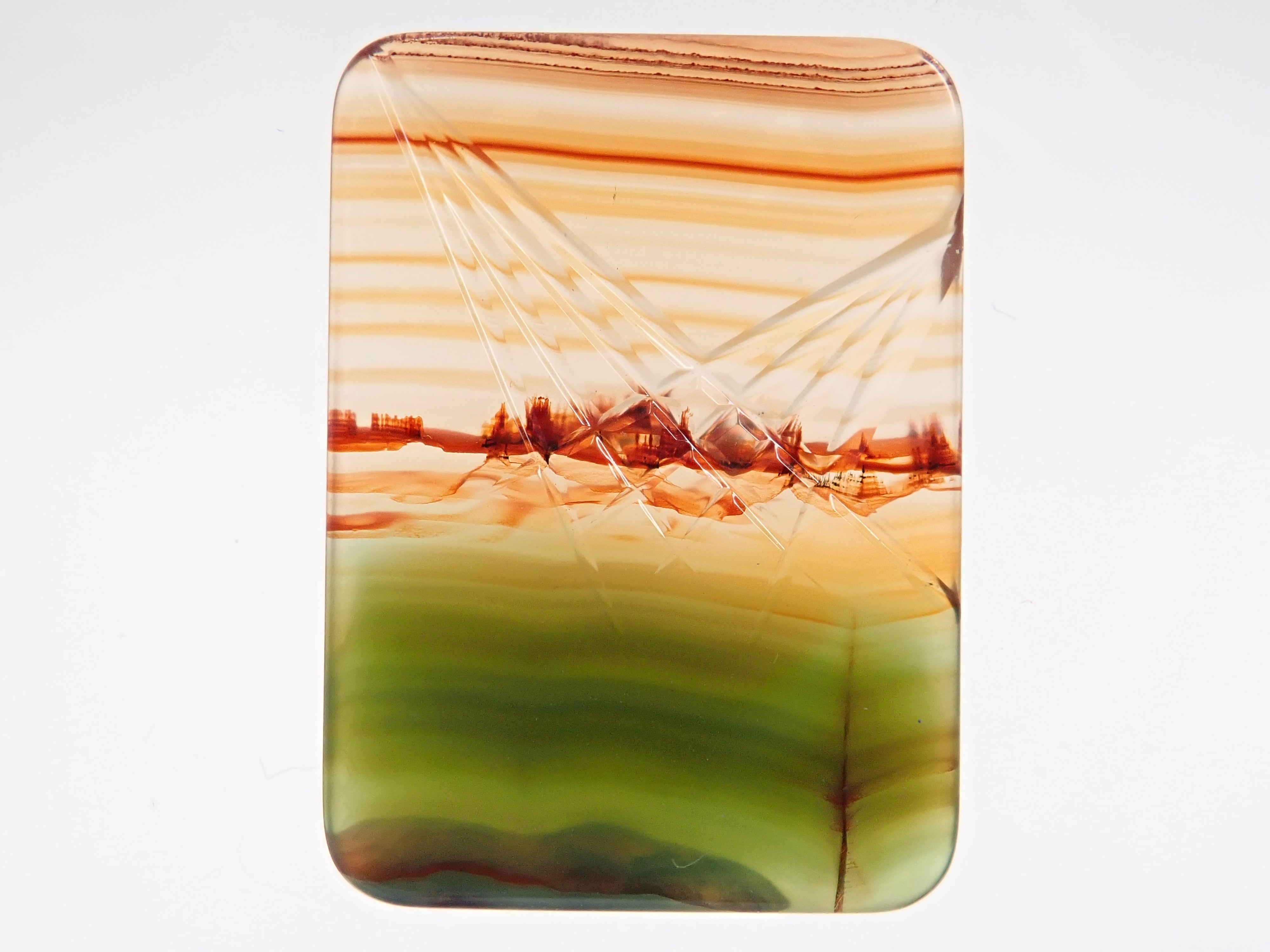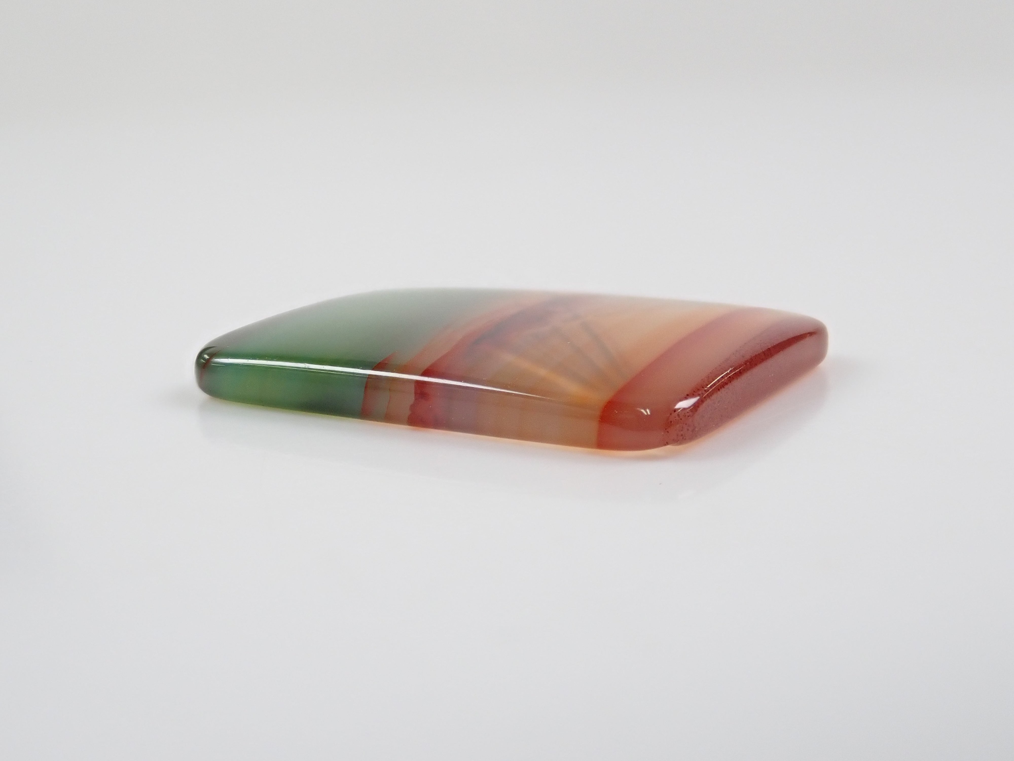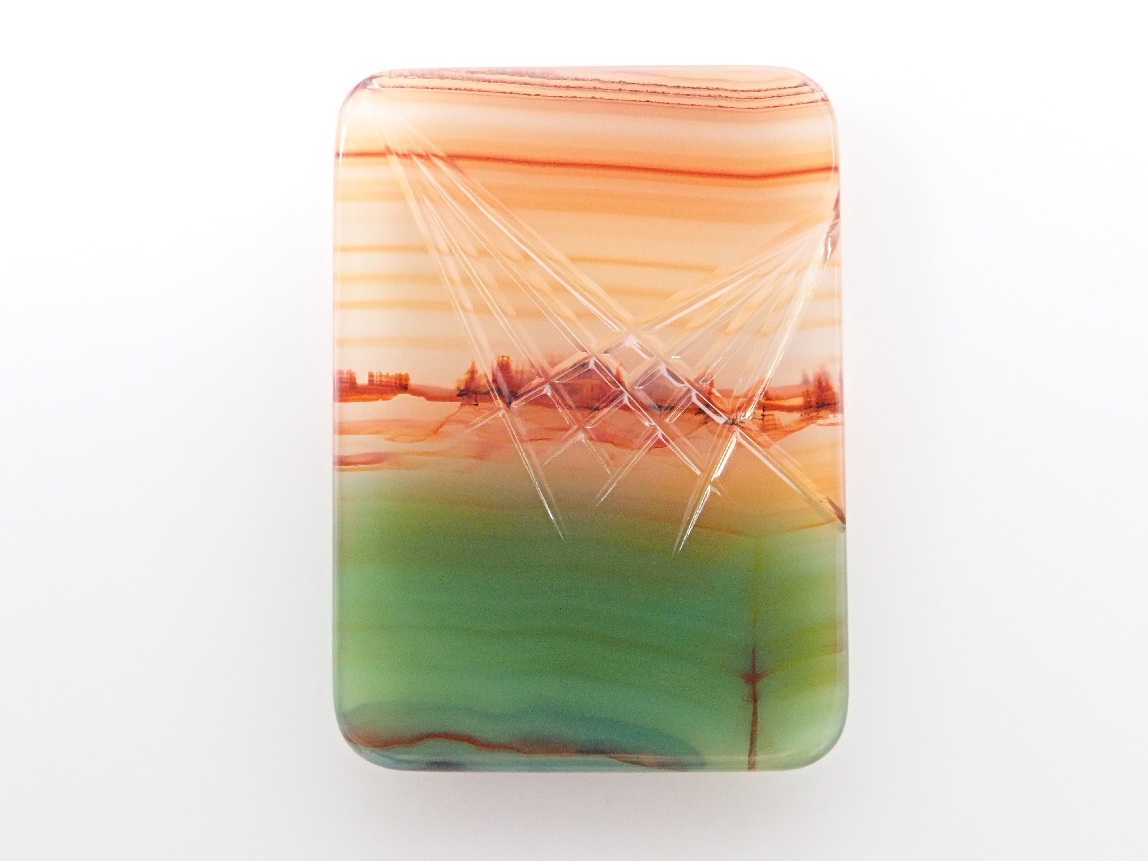 瑪瑙因其藝術般的大理石紋路而引人注目。它的英文名是「agate」。從礦物學角度來看,它是一種多晶體的石英,因此屬於水晶家族。瑪瑙是我們日本人熟悉的寶石,在日本也有開採記錄。這是一塊經過染色的瑪瑙。