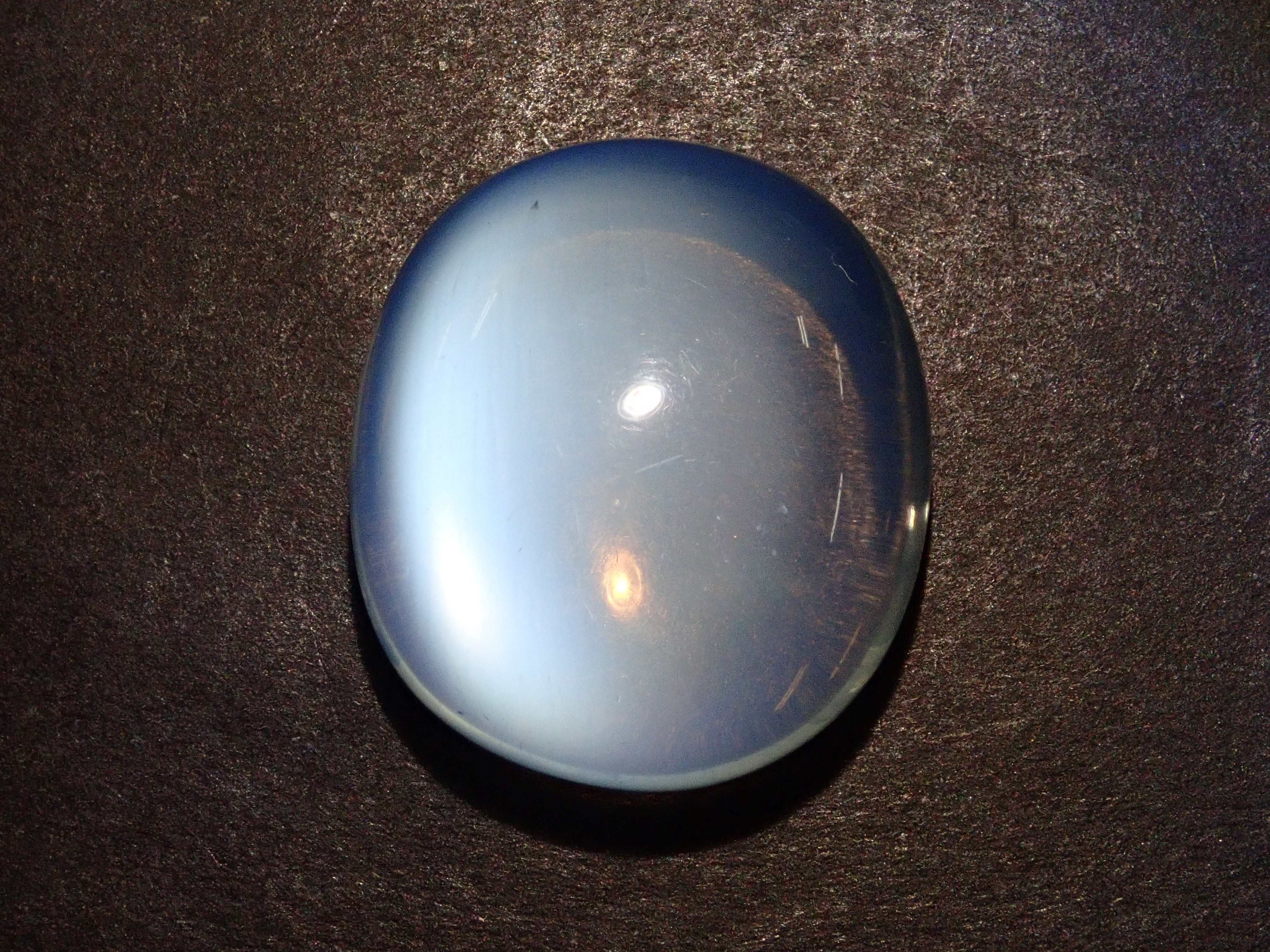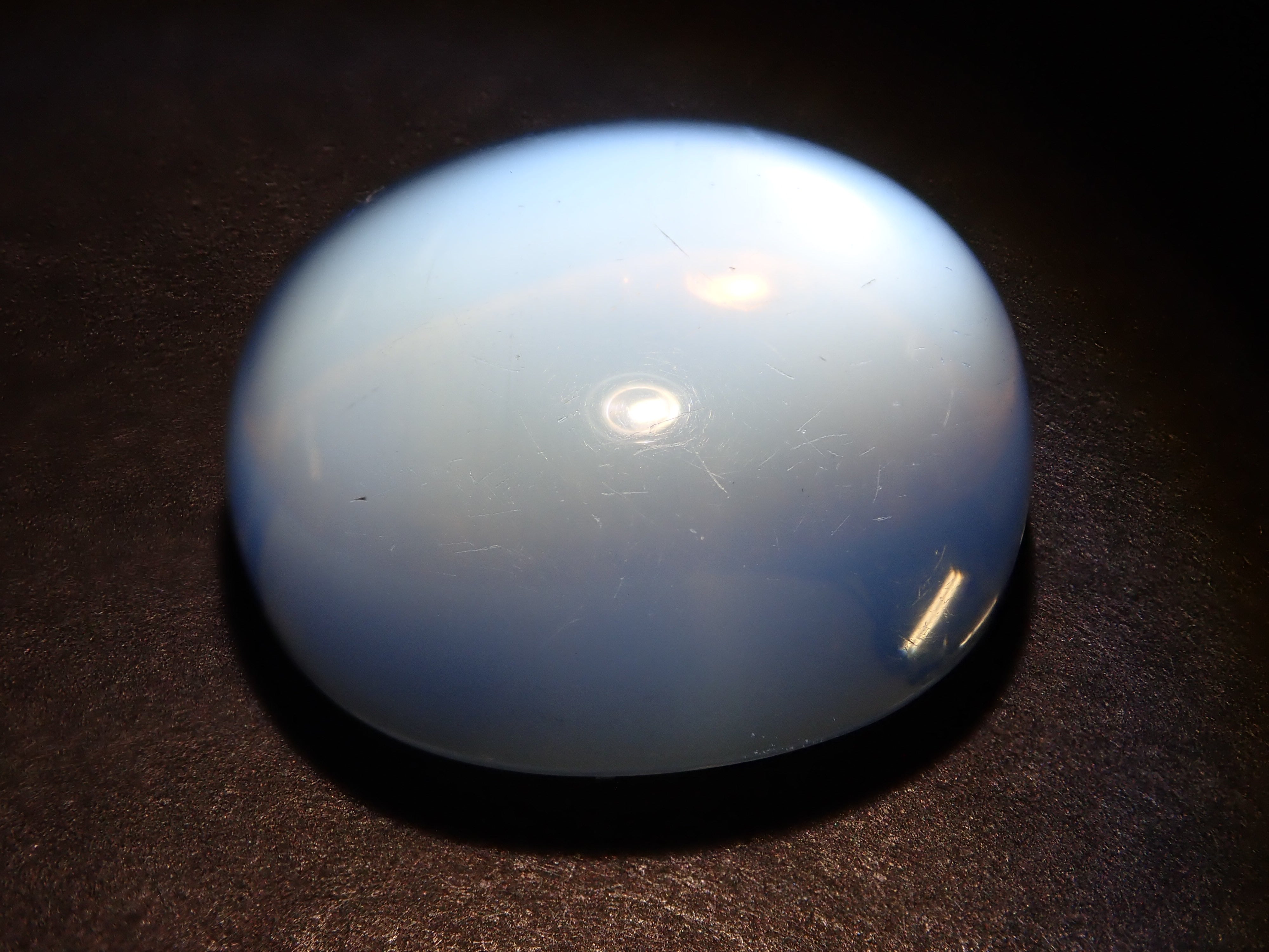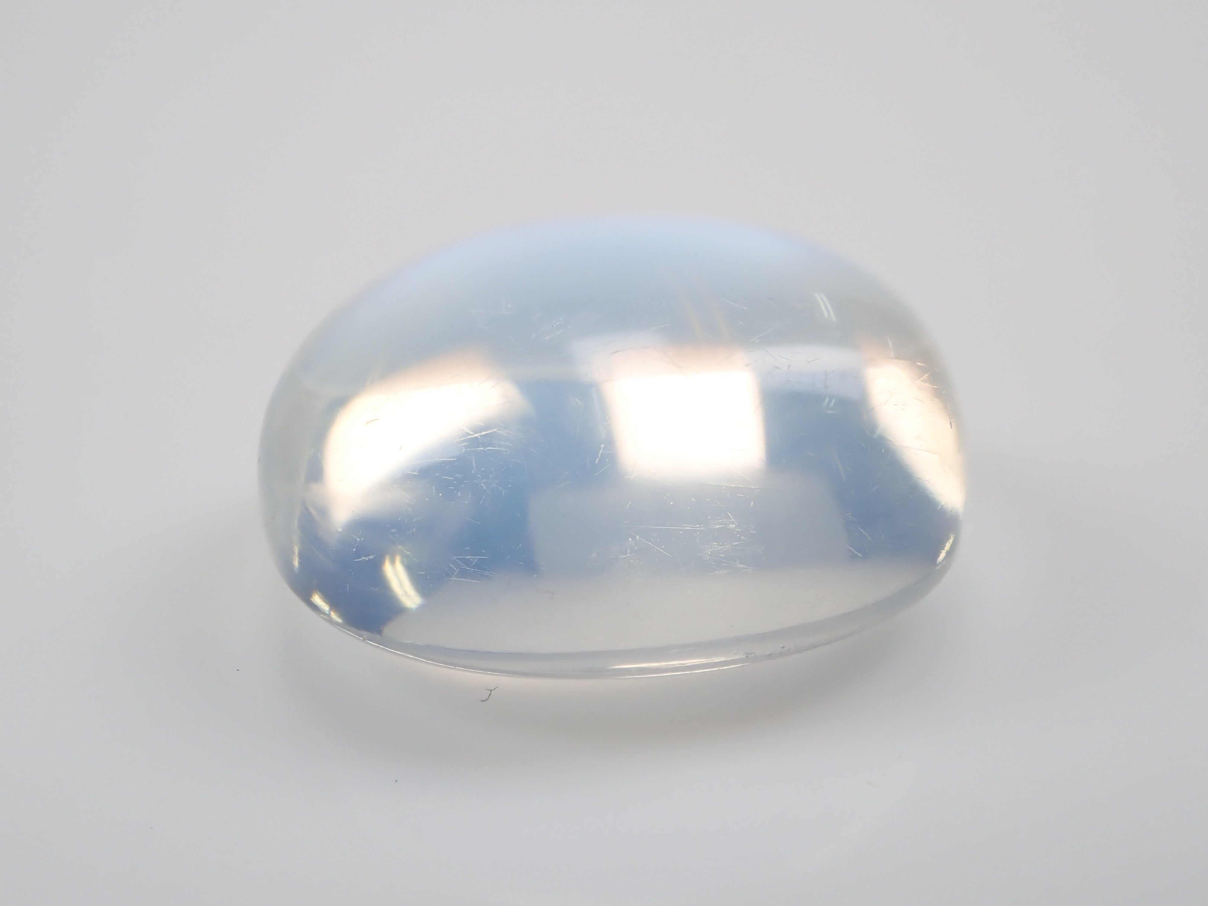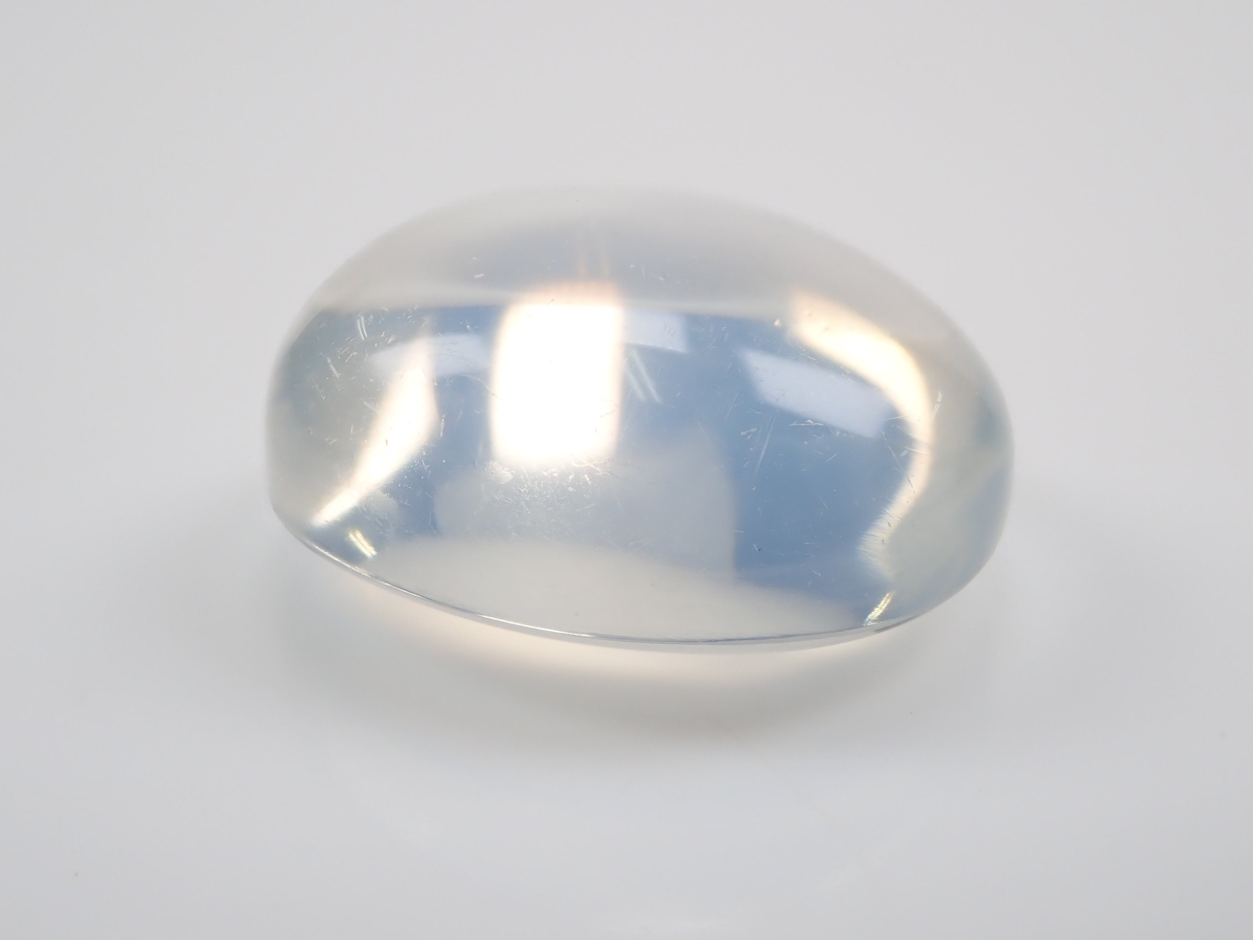 一顆看起來像聚光燈的月光石在中間閃閃發光。這種類似月光的明亮光學效果是月光石的標誌。照片是使用筆燈拍攝的。 附中央寶石研究院分選