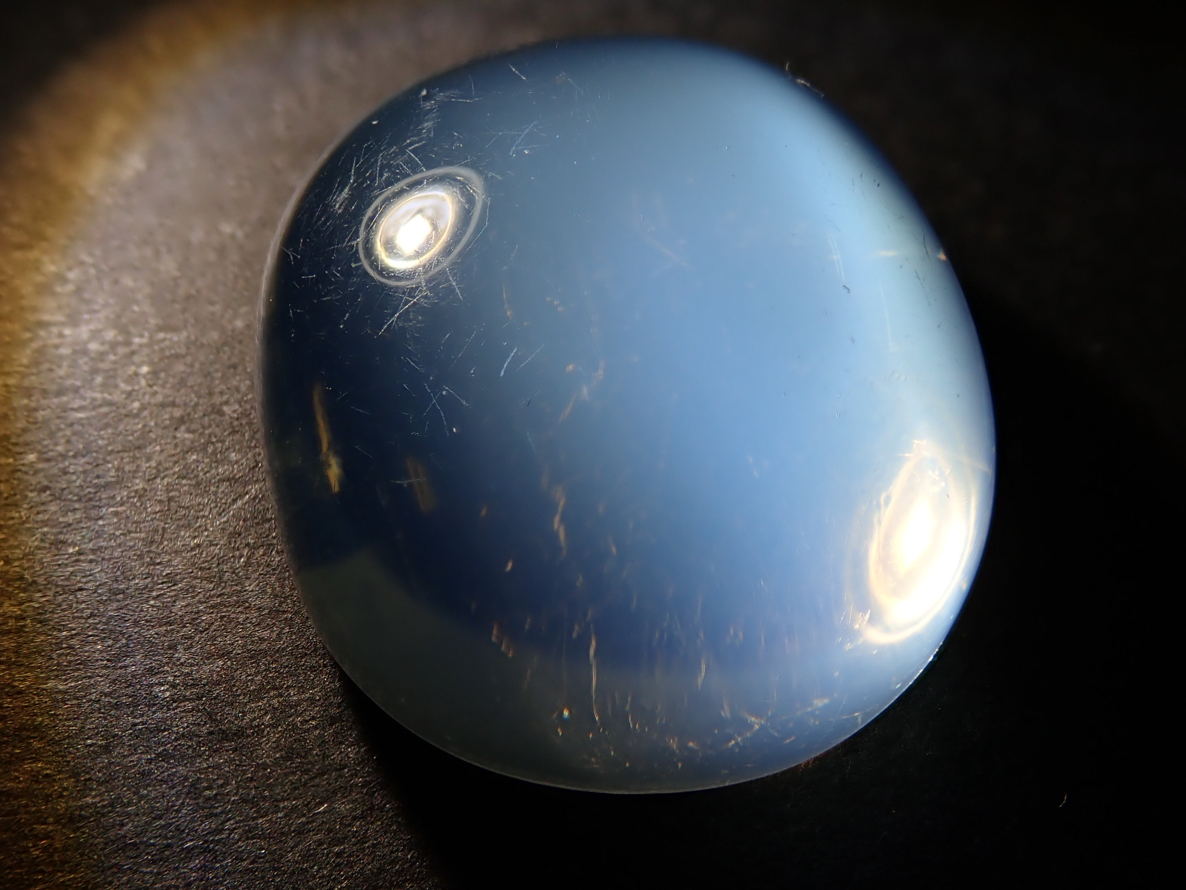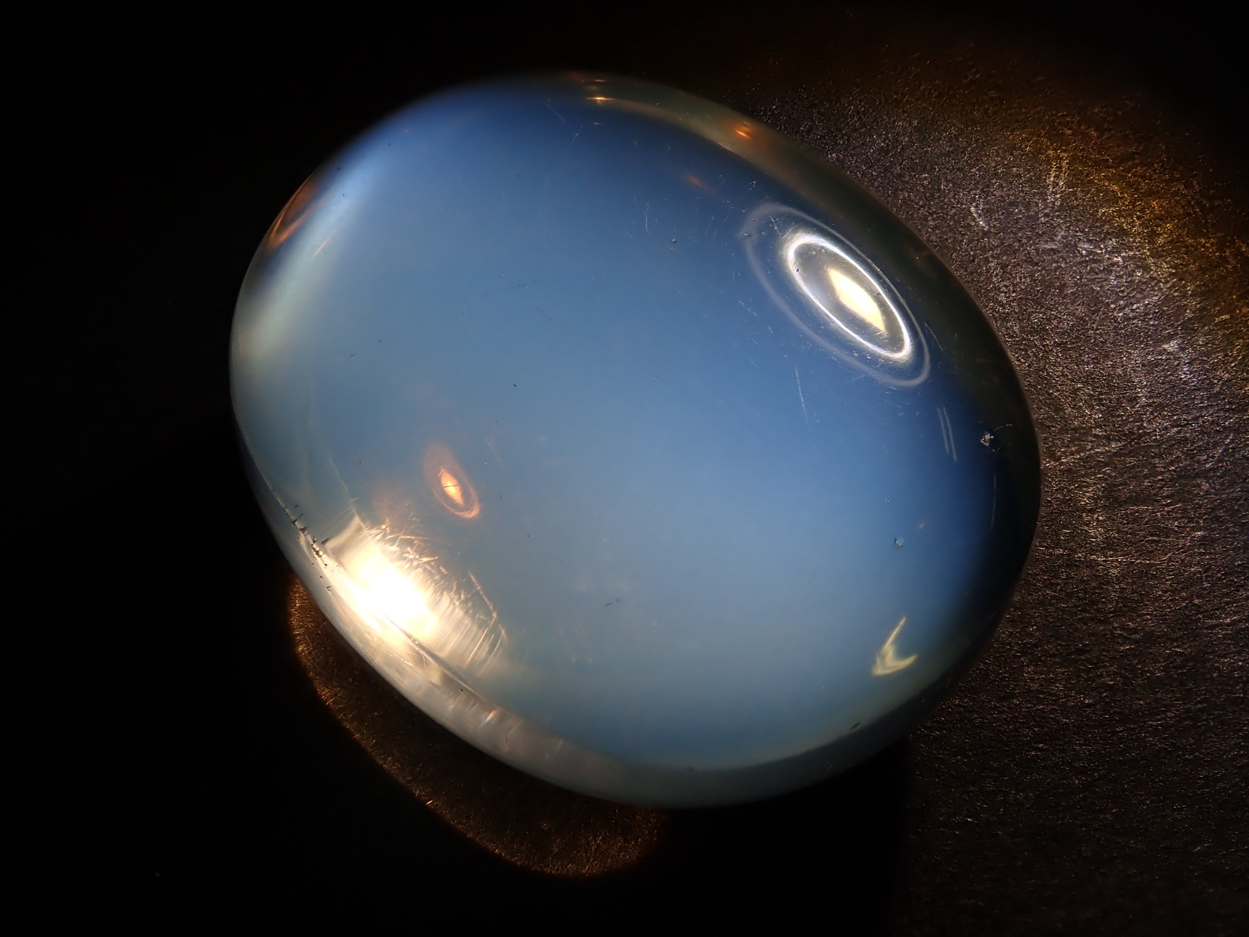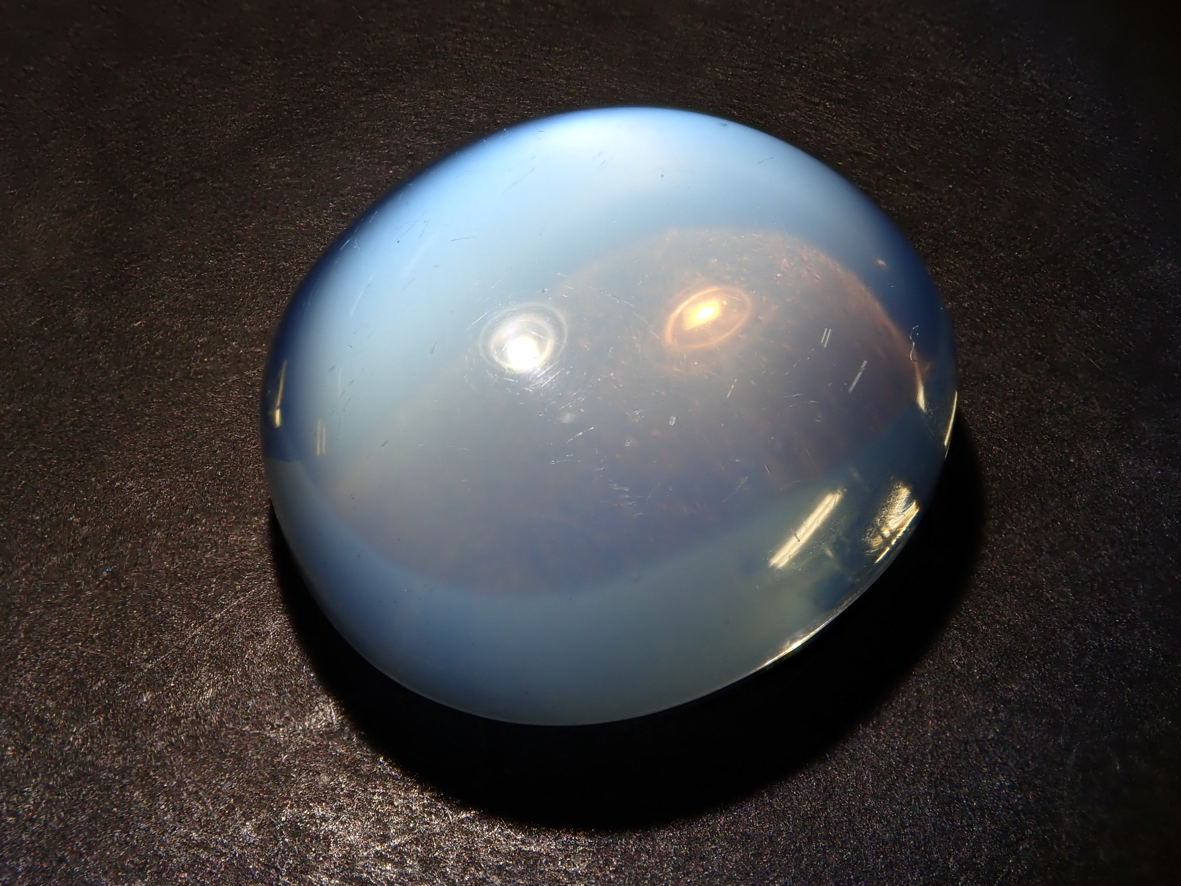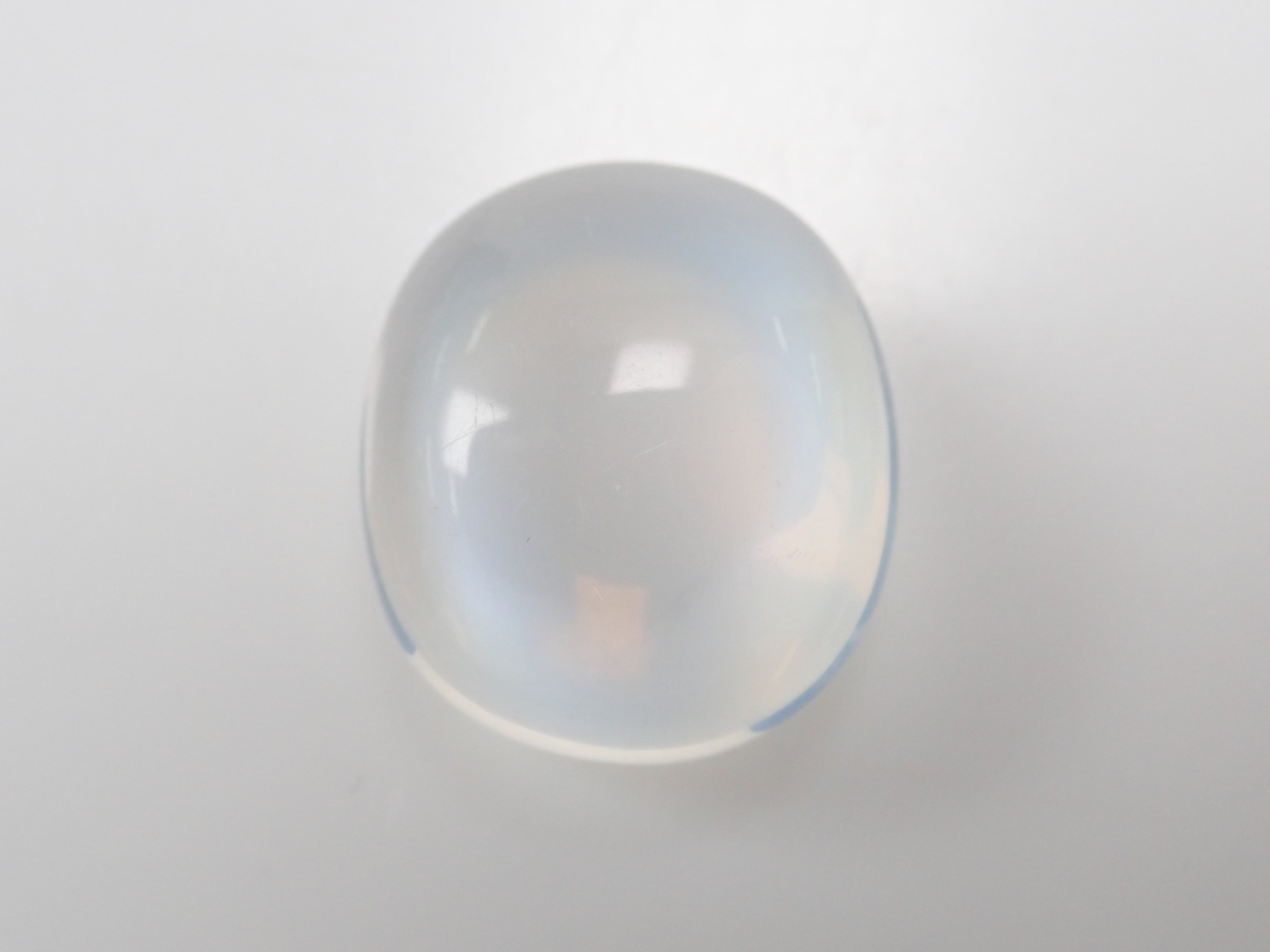 一顆看起來像聚光燈的月光石在中間閃閃發光。這種類似月光的明亮光學效果是月光石的標誌。照片是使用筆燈拍攝的。 附中央寶石研究院分選