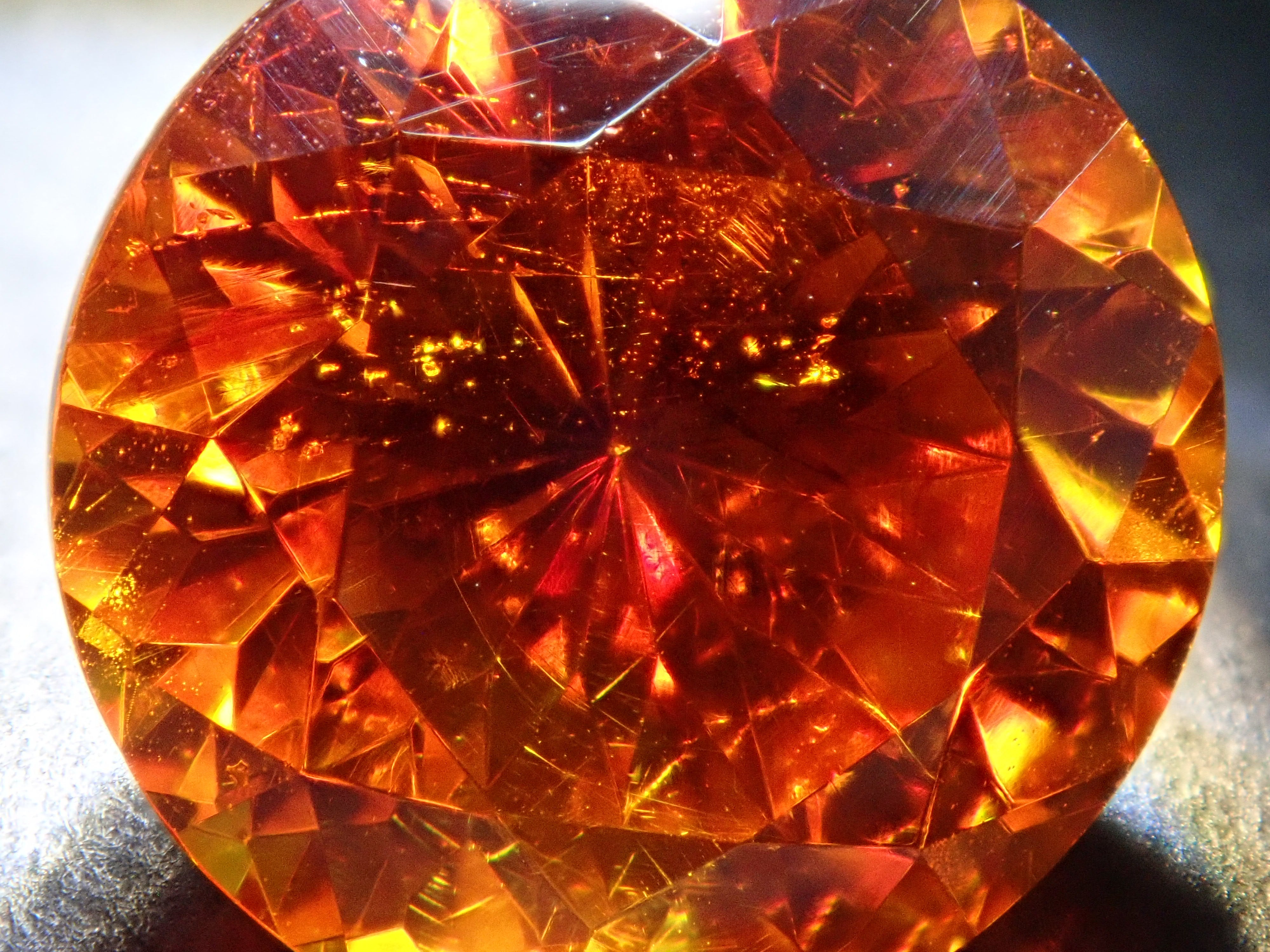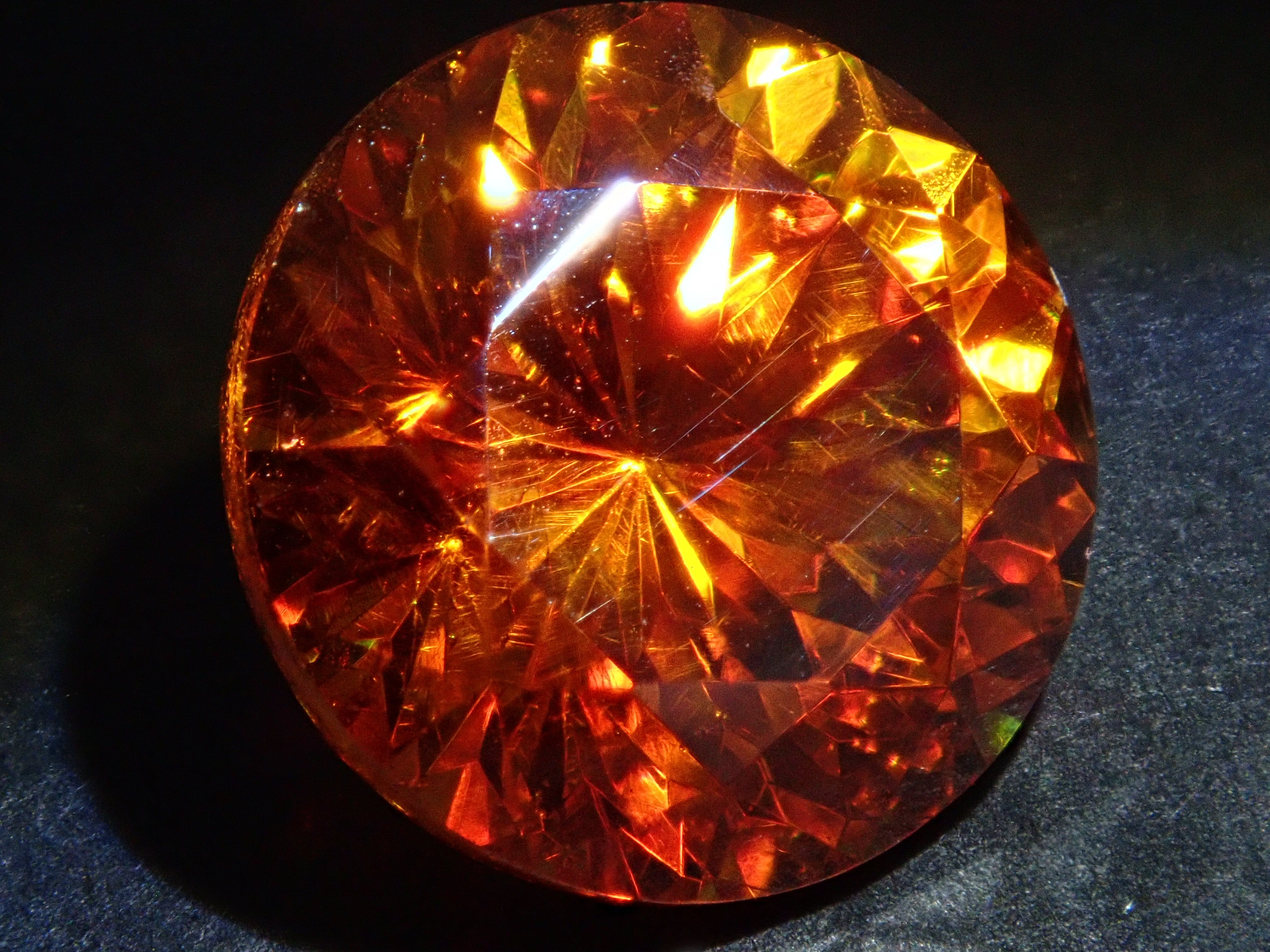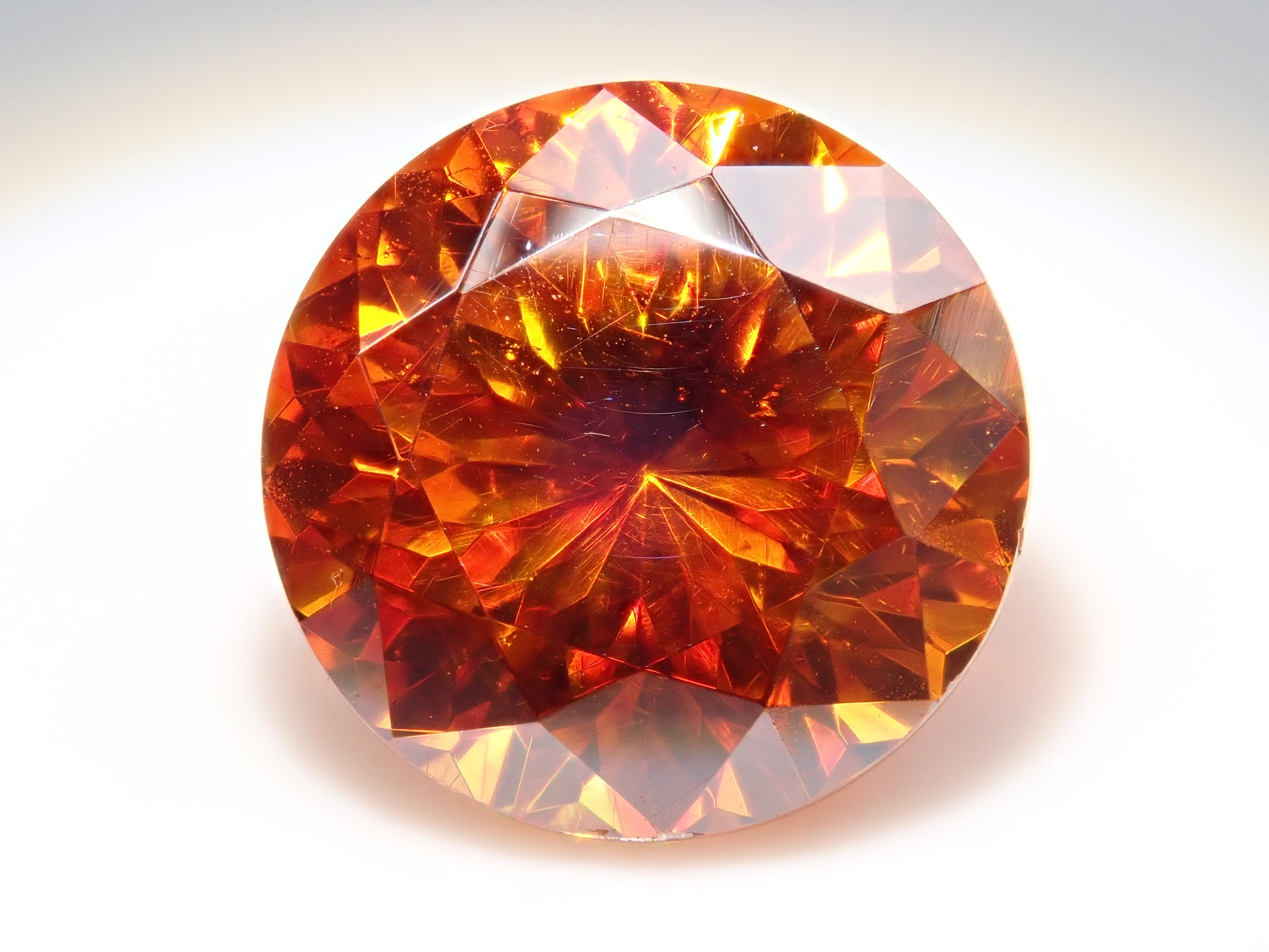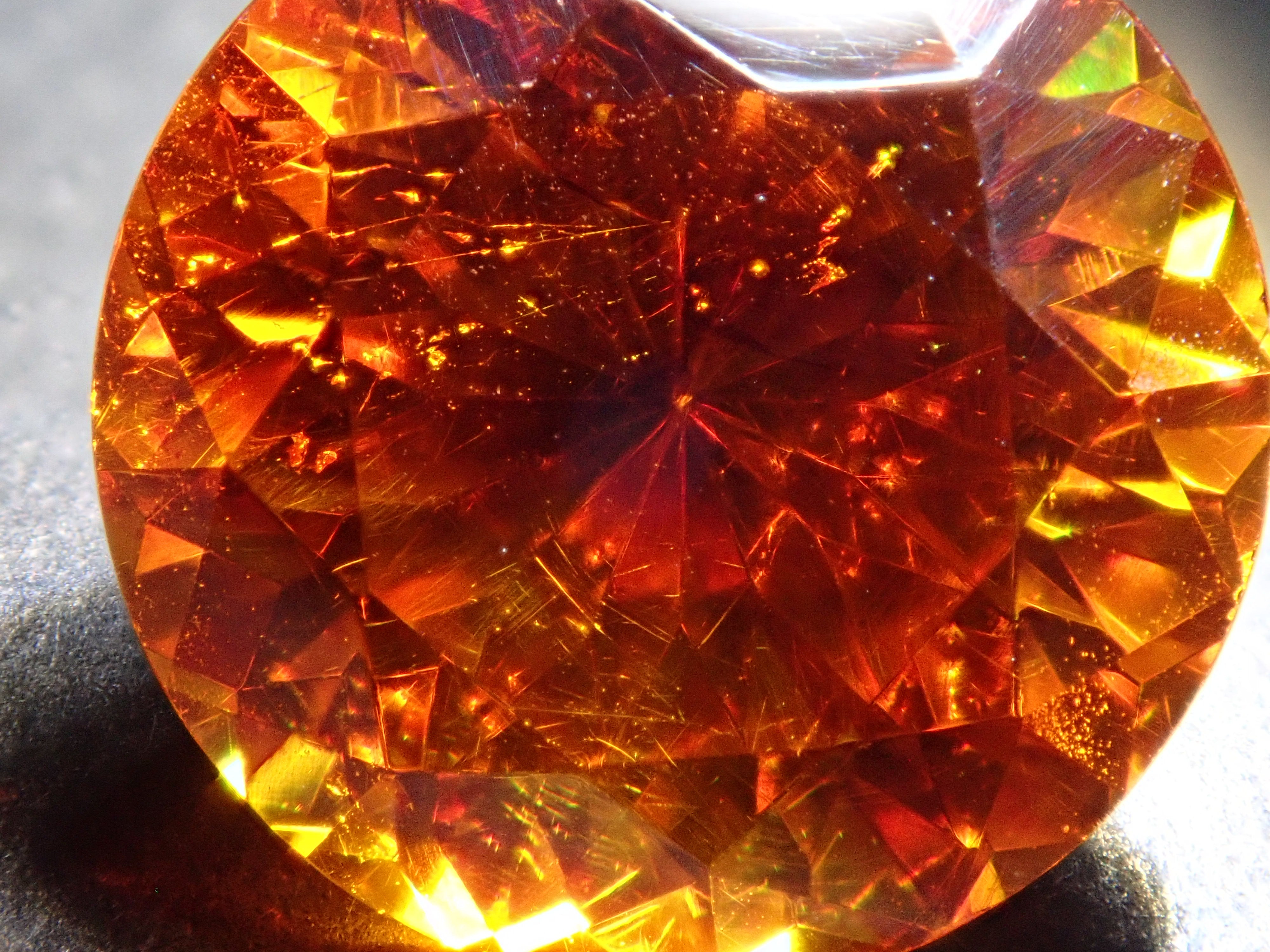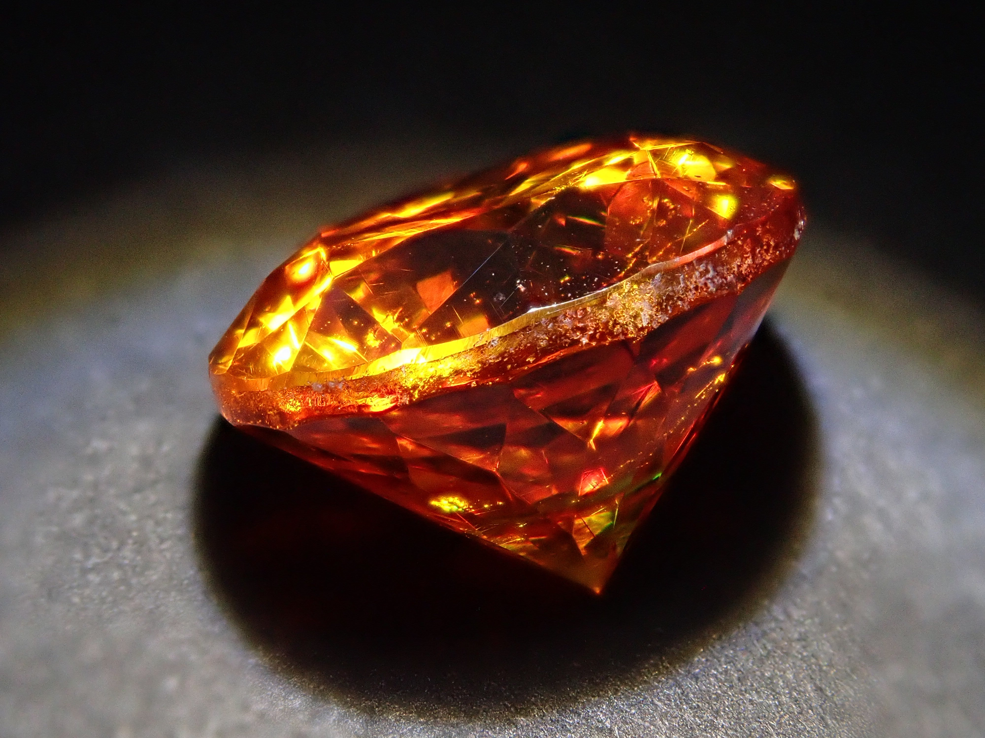 閃鋅礦的色散率接近鑽石的四倍,並呈現出絢麗的火彩。據說是流通量很小、市場上數量不多的稀有寶石之一。底色有黃、橙、綠等,在火中可以欣賞到黃、棕、橙、紅、綠等各種顏色。這是一顆圓形切割的 10 毫米閃鋅礦。這是一種可以用火來欣賞的優質閃鋅礦。