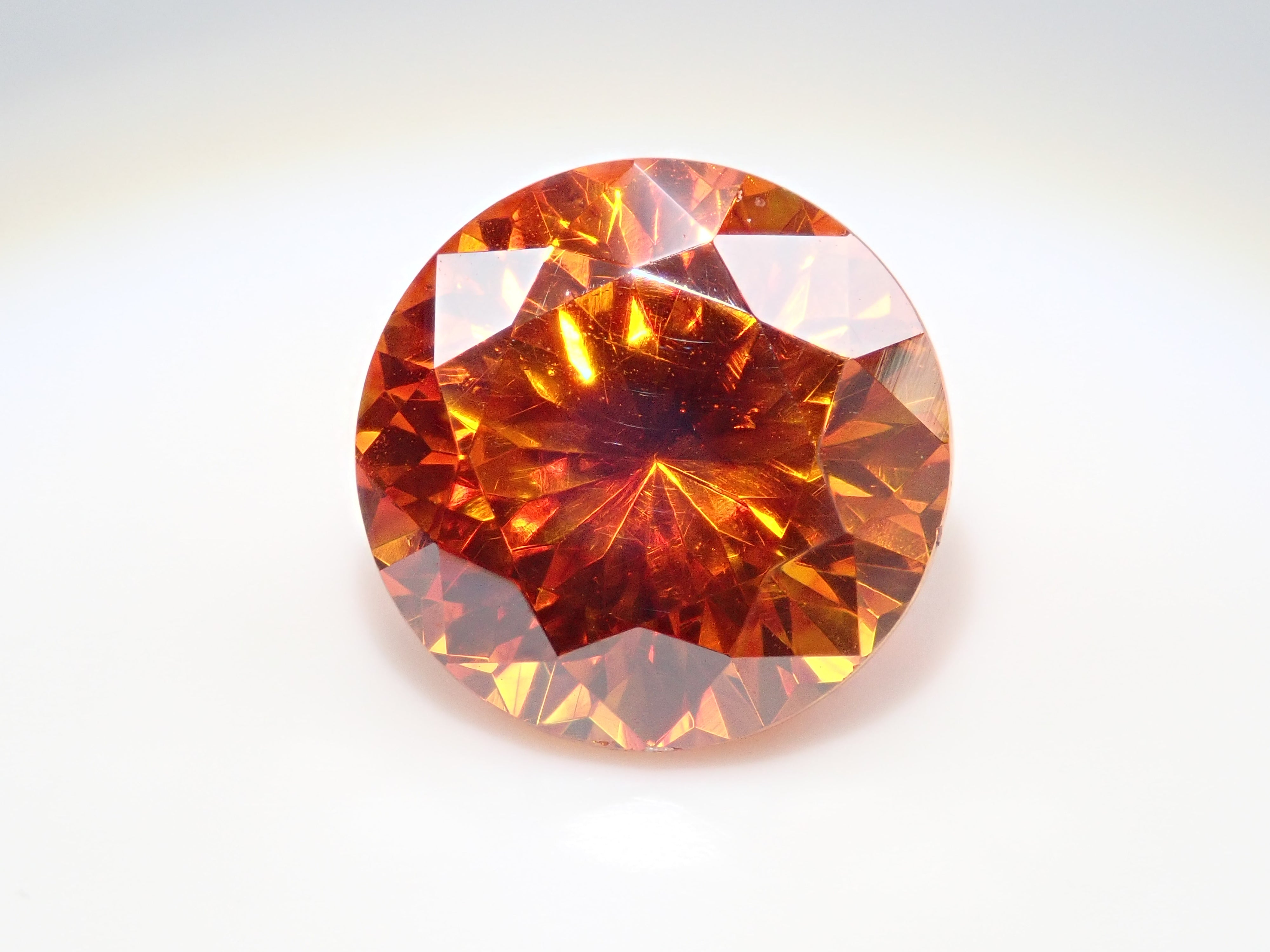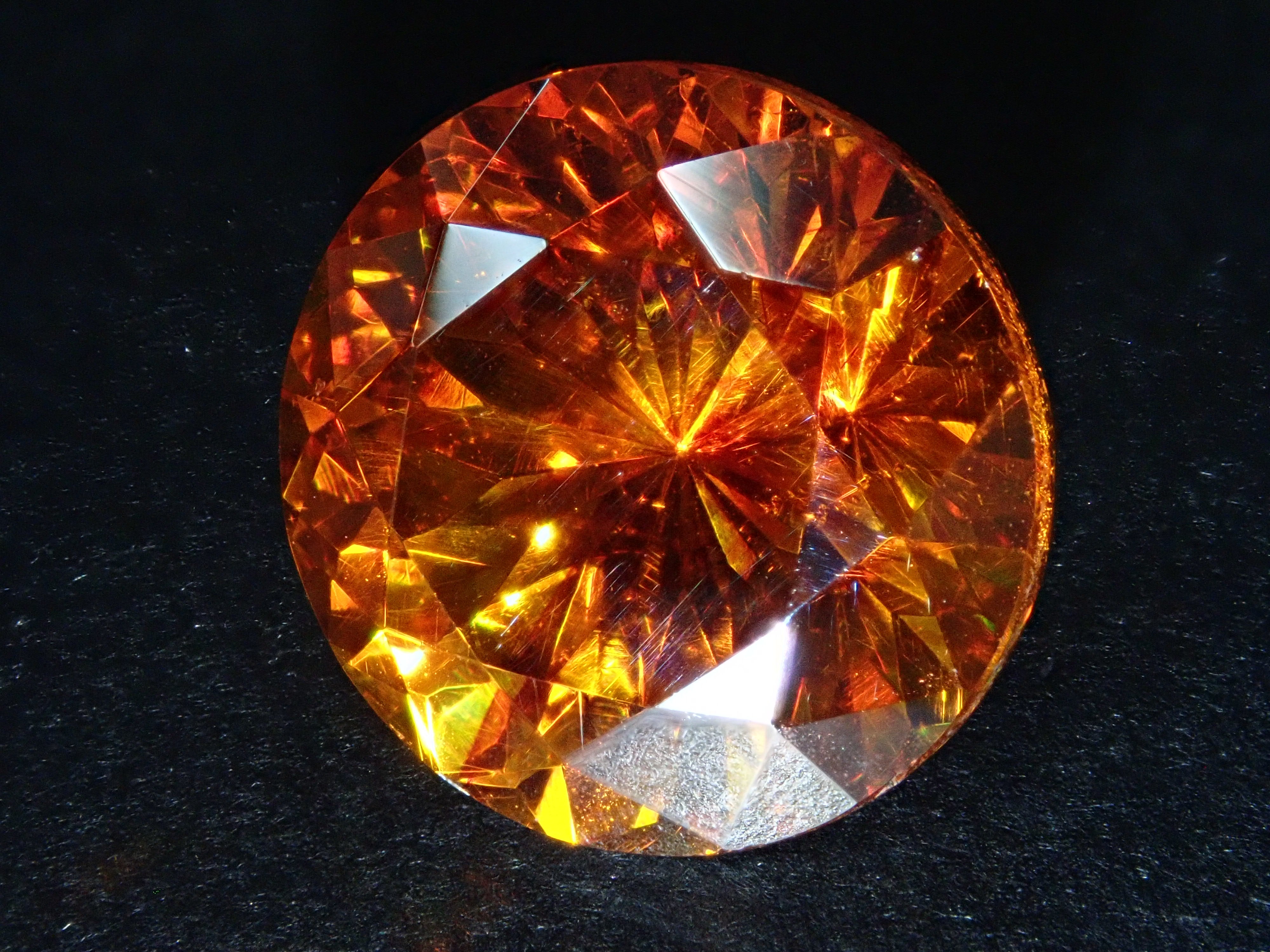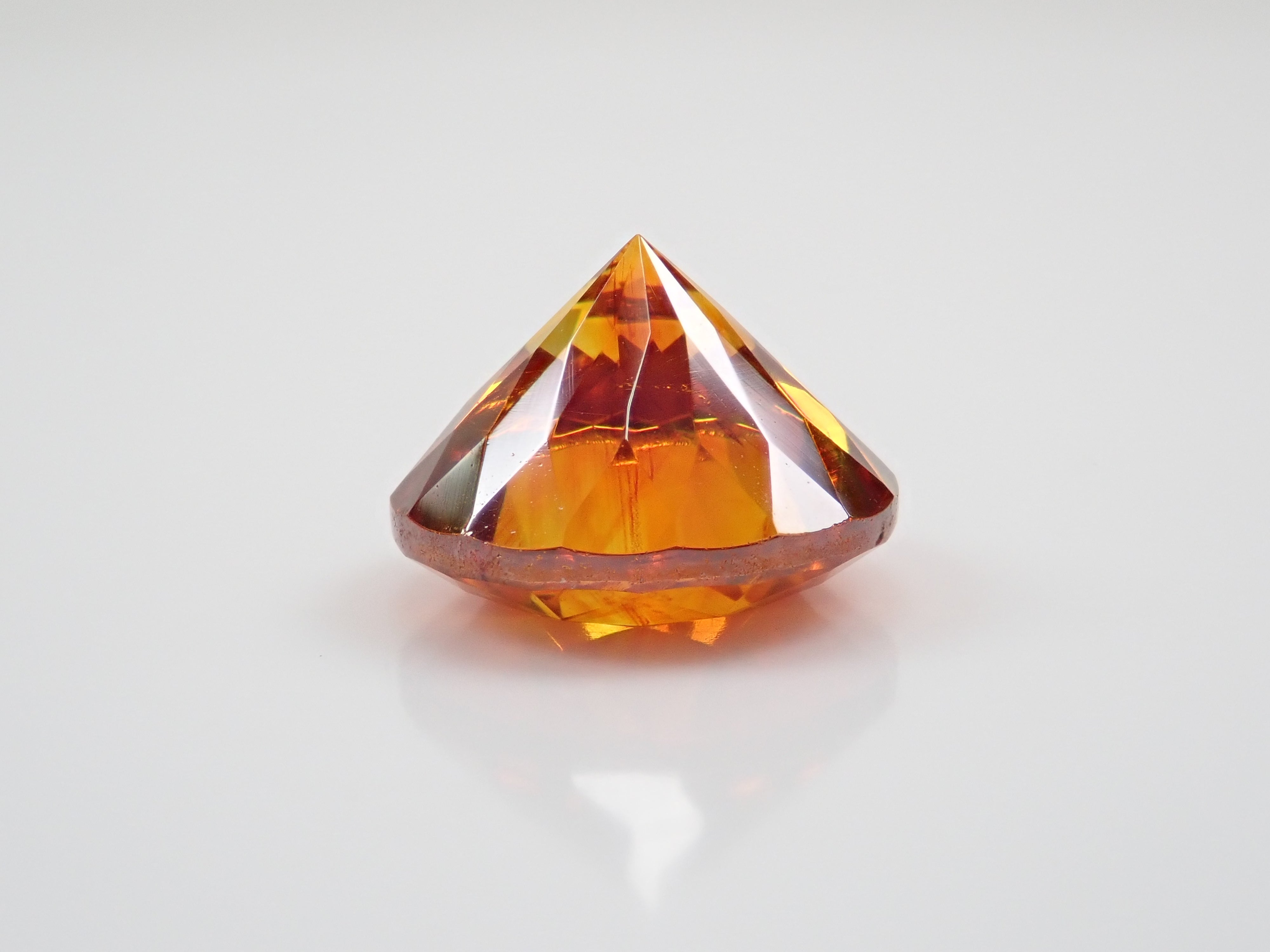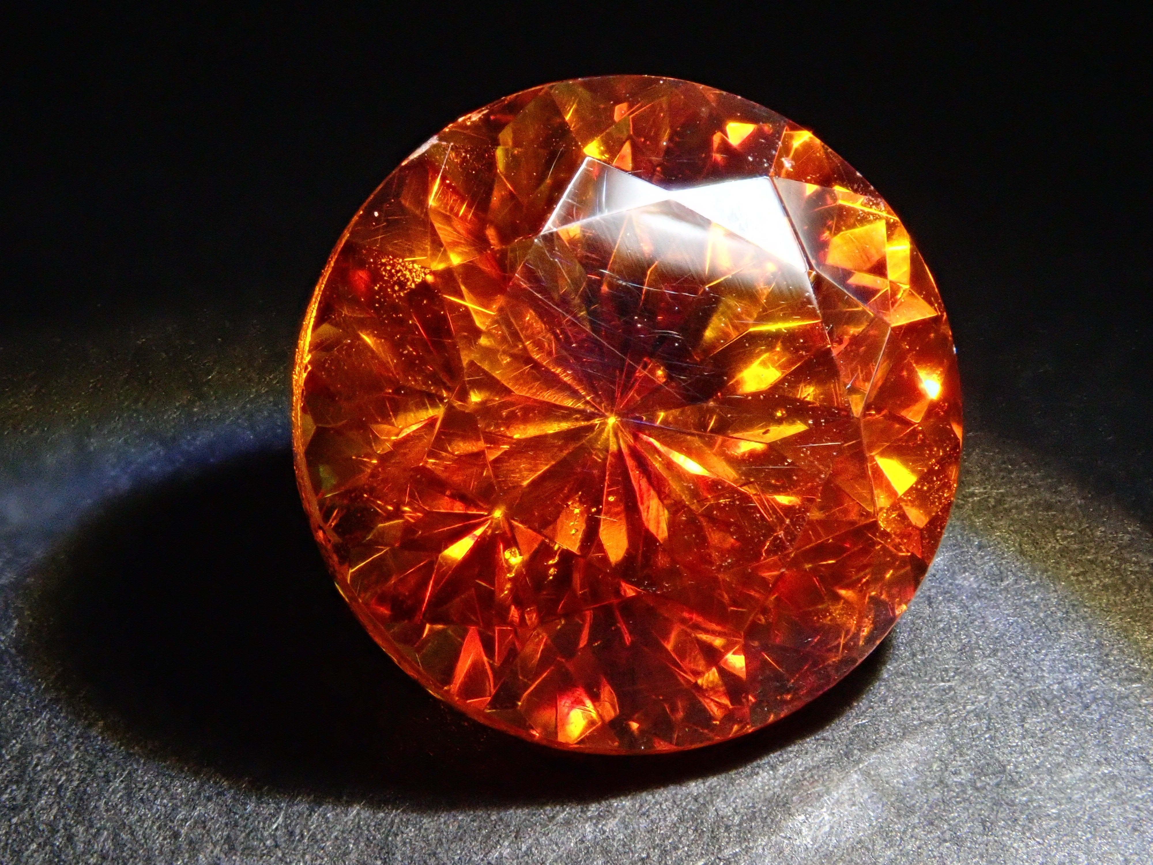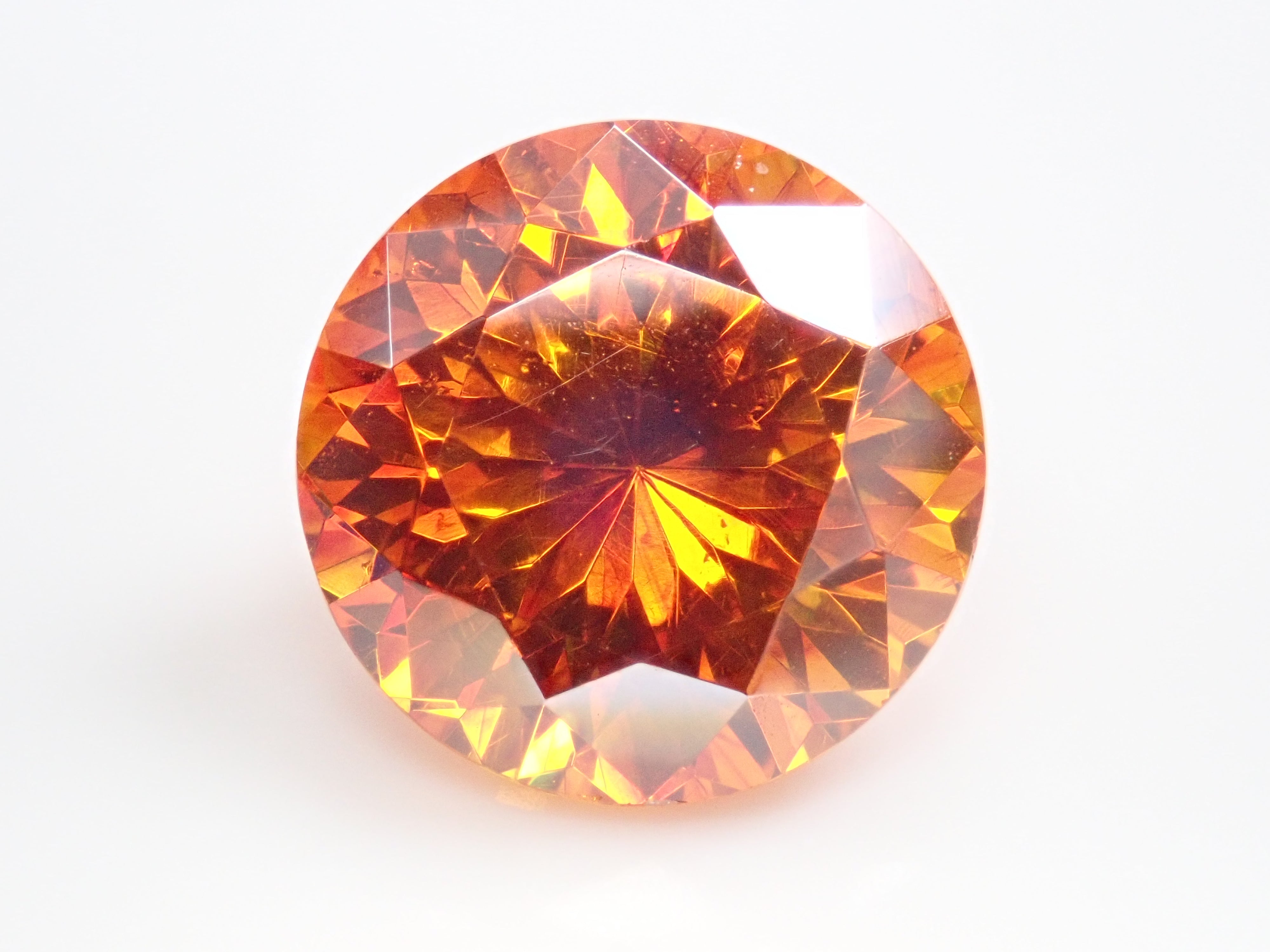 閃鋅礦的色散率接近鑽石的四倍,並呈現出絢麗的火彩。據說是流通量很小、市場上數量不多的稀有寶石之一。底色有黃、橙、綠等,在火中可以欣賞到黃、棕、橙、紅、綠等各種顏色。這是一顆圓形切割的 10 毫米閃鋅礦。這是一種可以用火來欣賞的優質閃鋅礦。