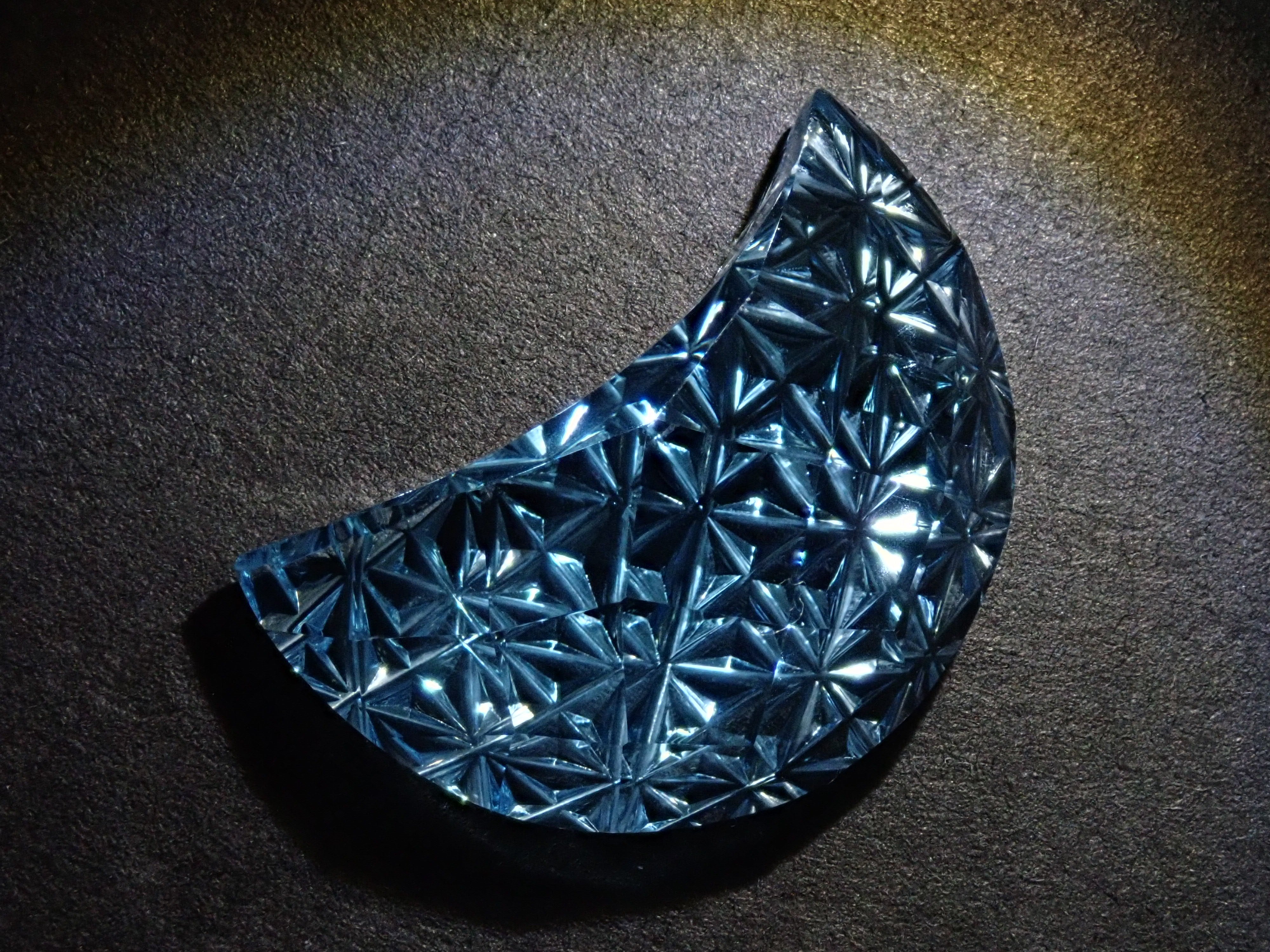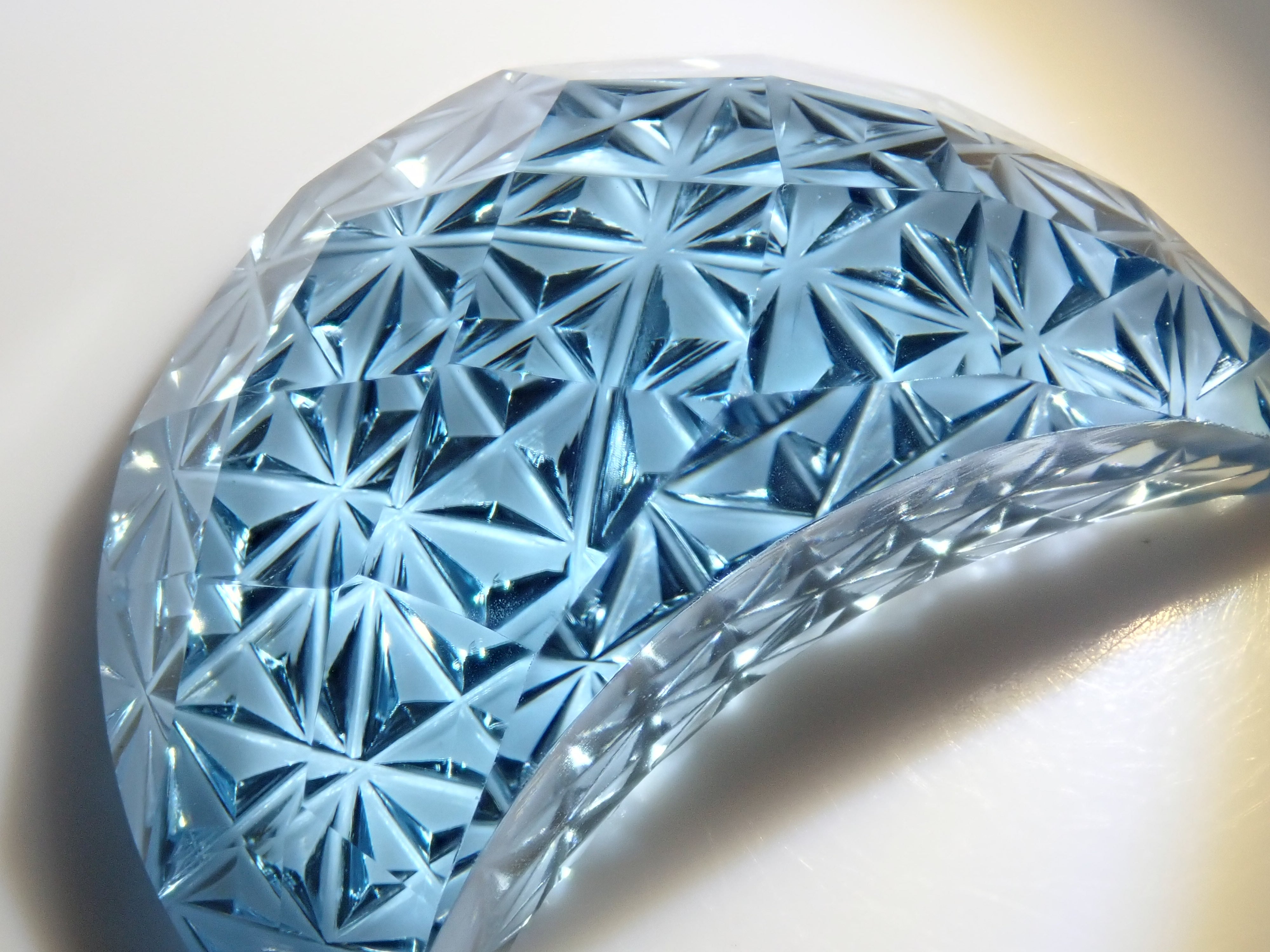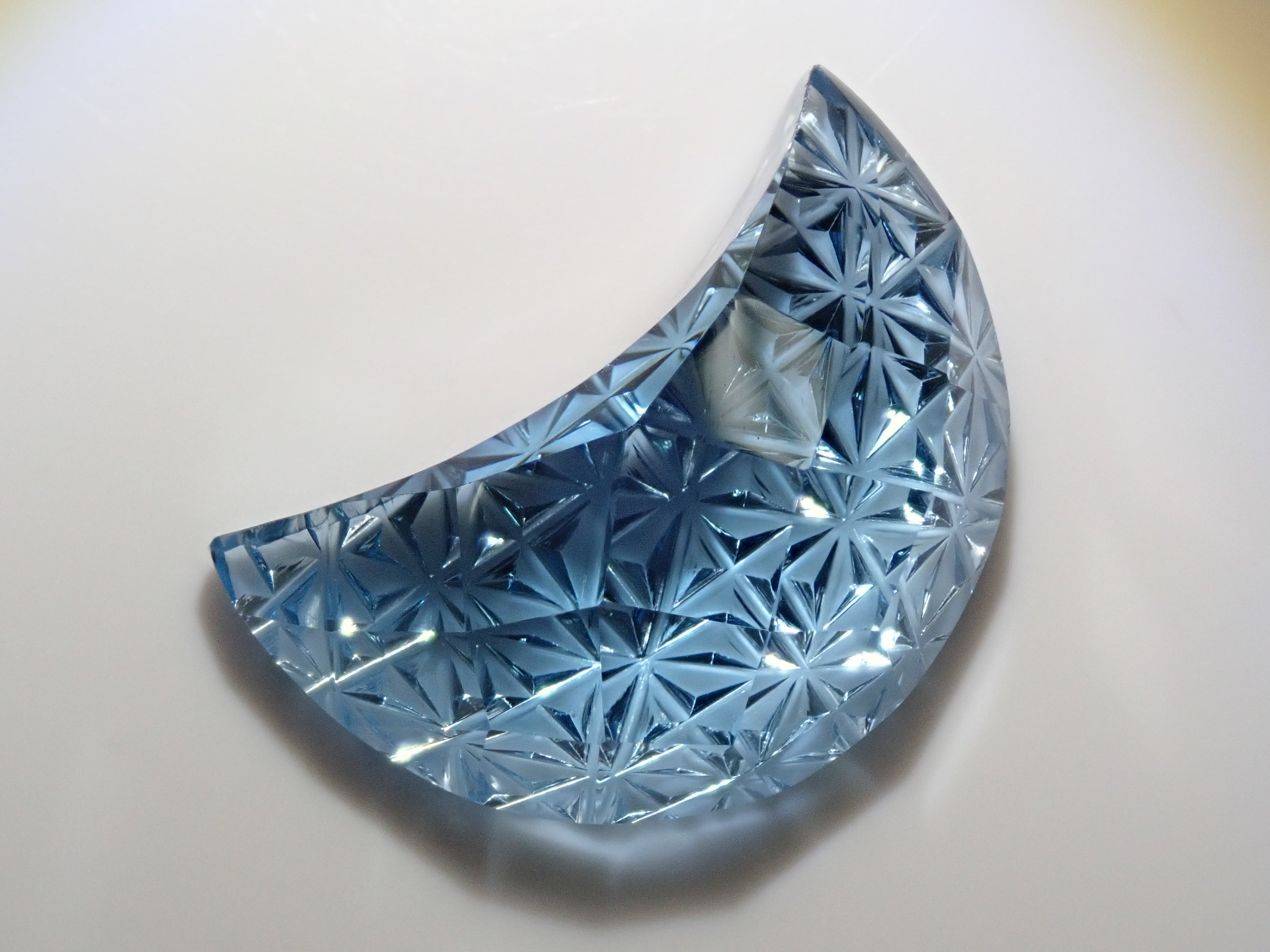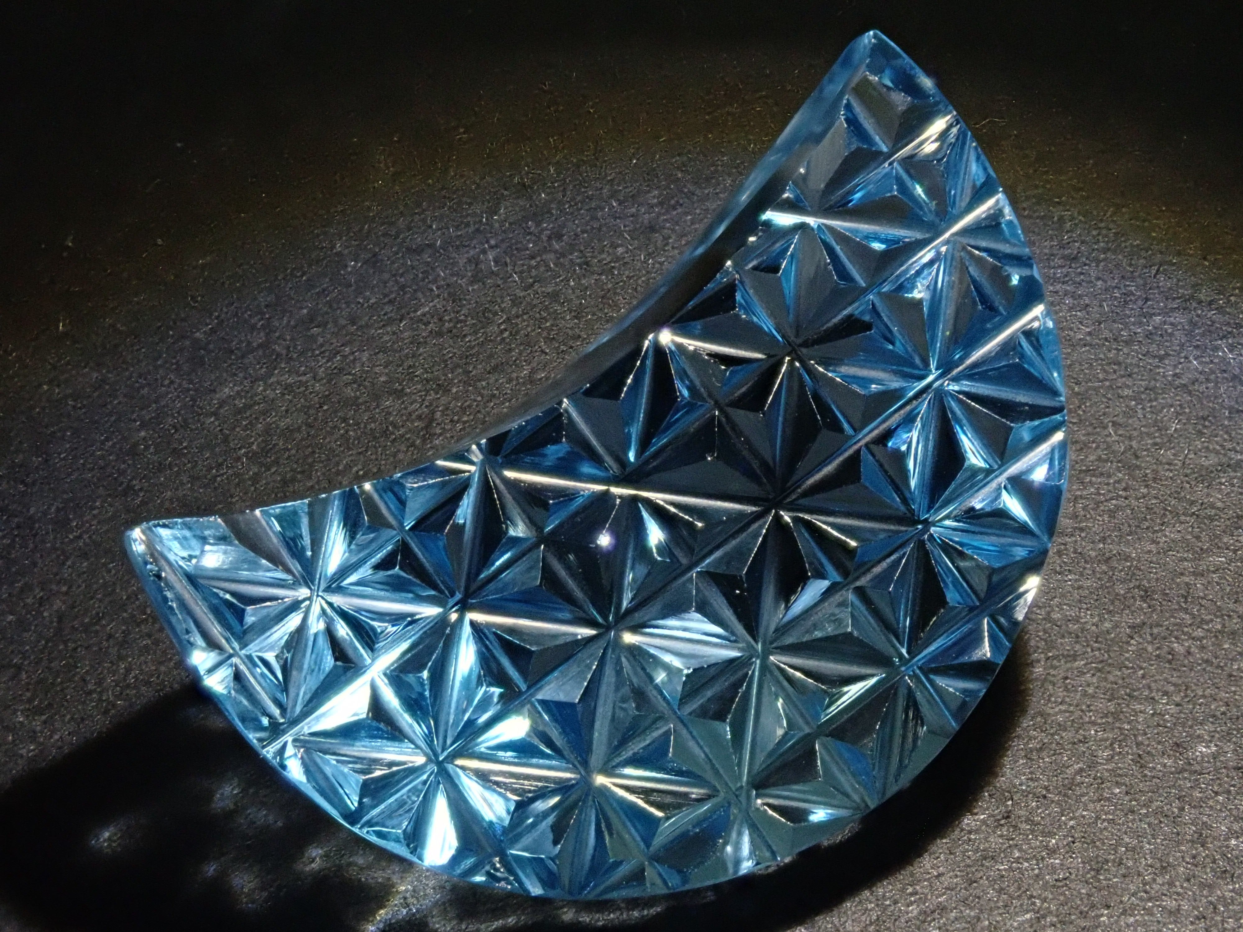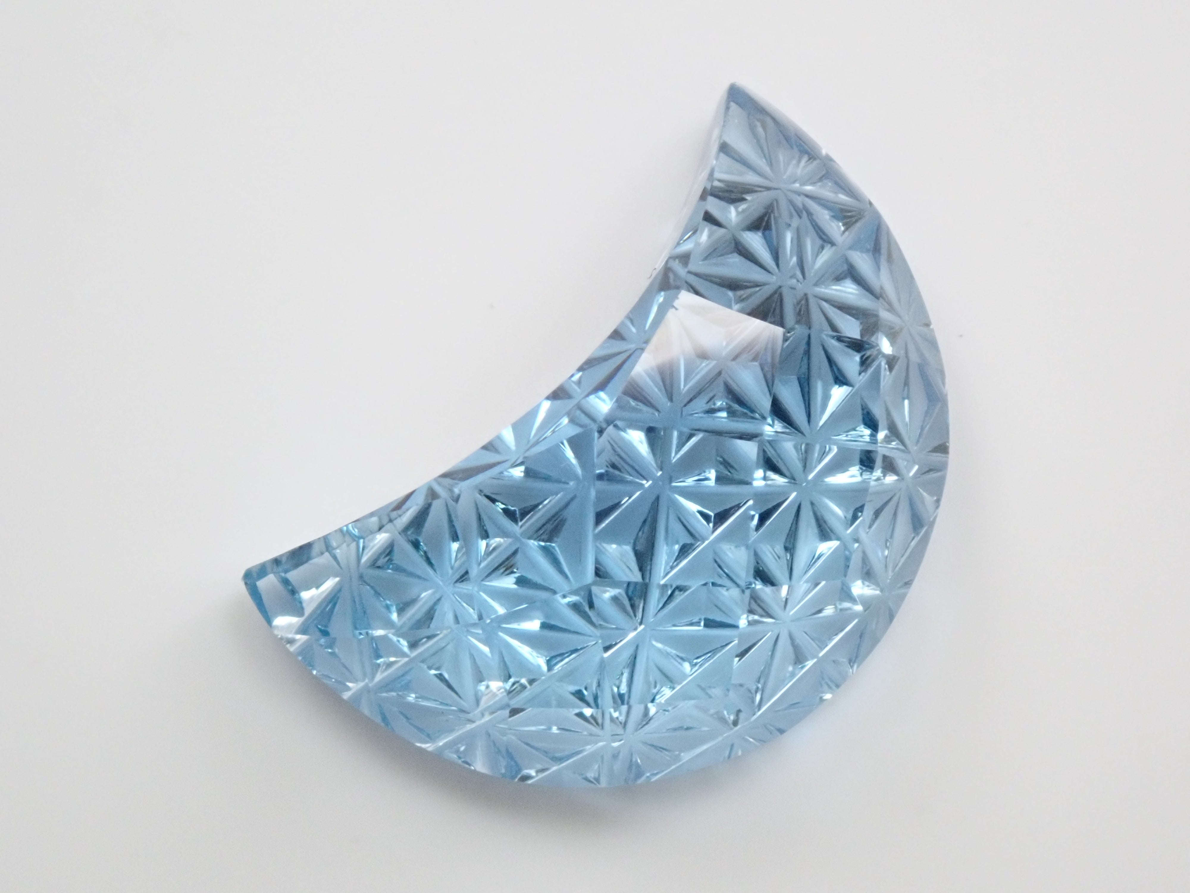 這是甲州高石切子藍托帕石《月形曉切子》,是清水喜石和深澤洋一先生的合作作品。