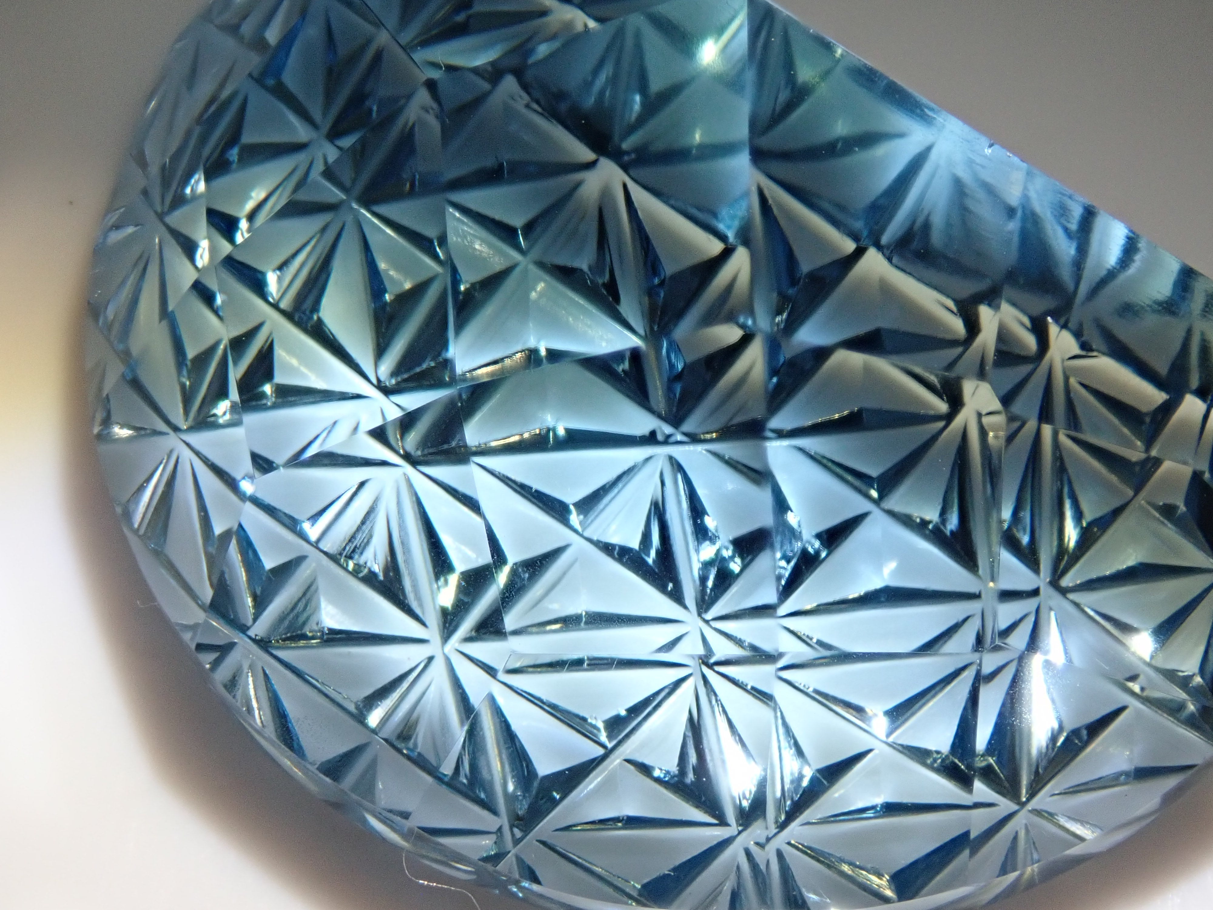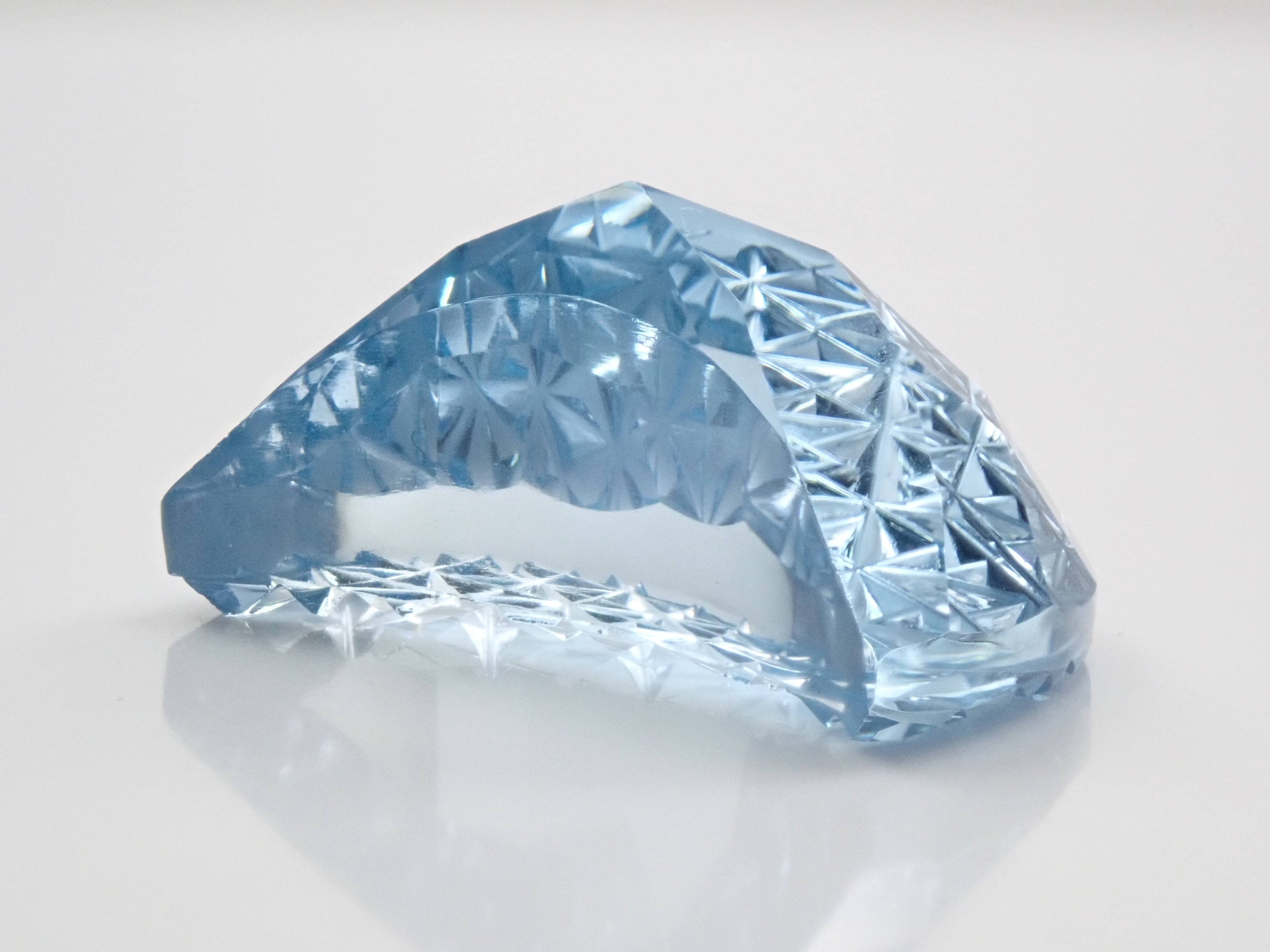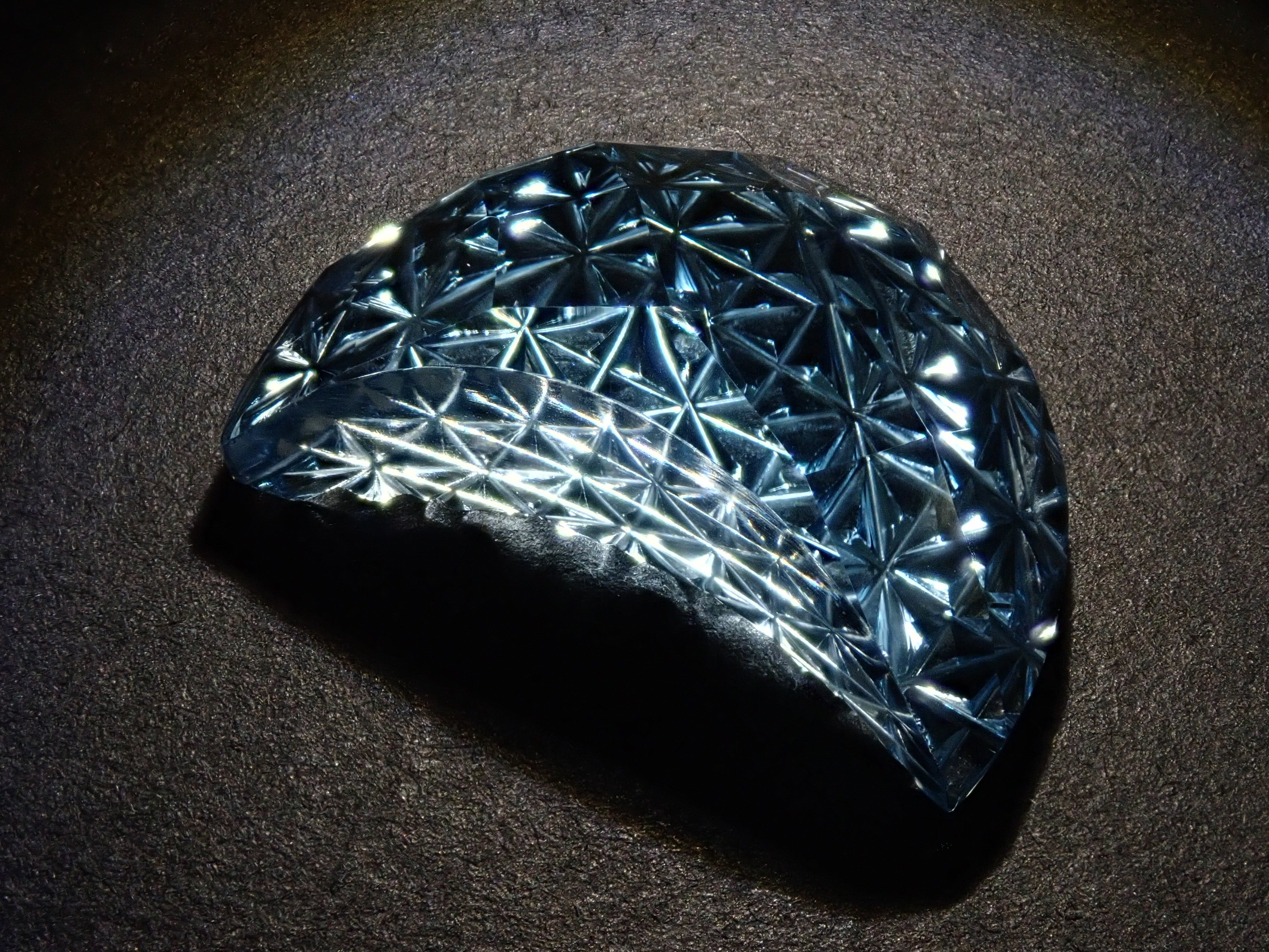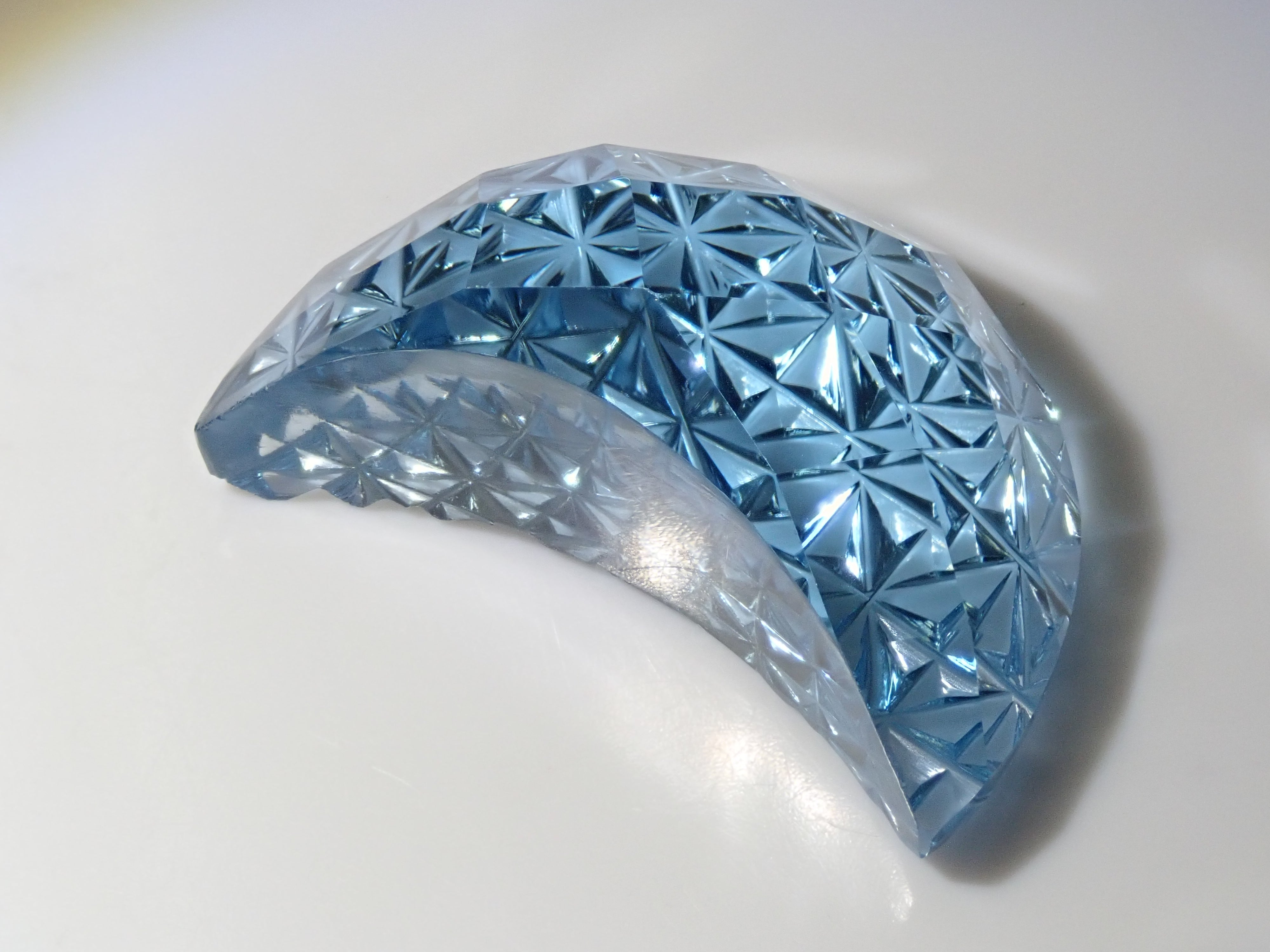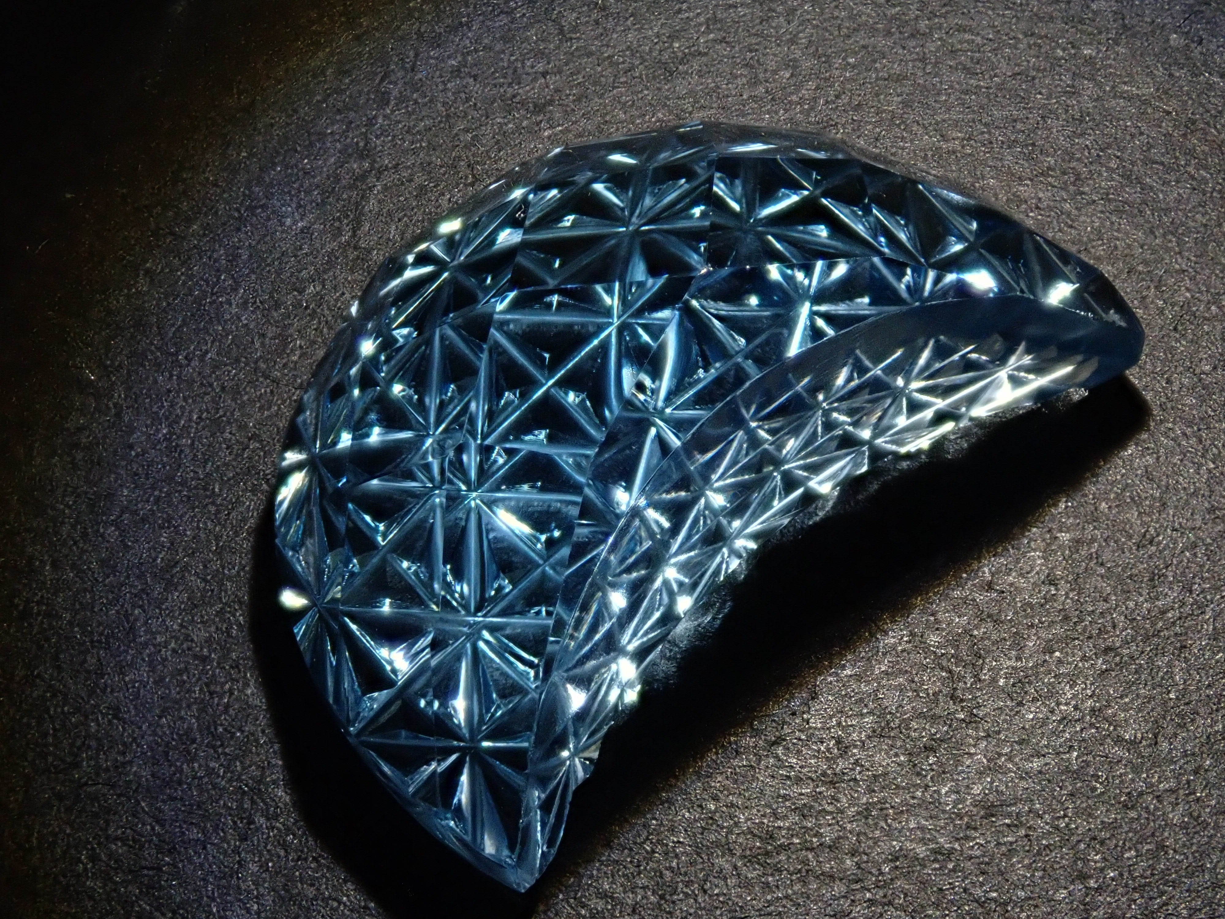 這是甲州高石切子藍托帕石《月形曉切子》,是清水喜石和深澤洋一先生的合作作品。