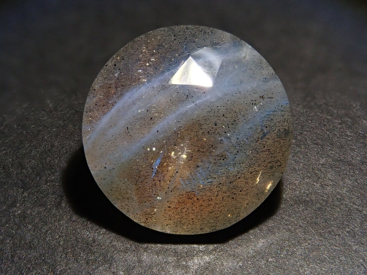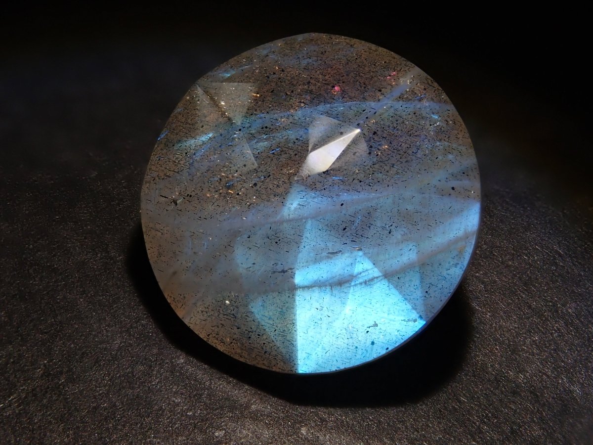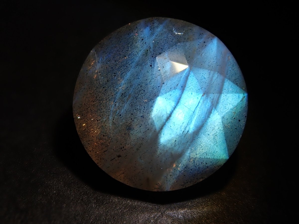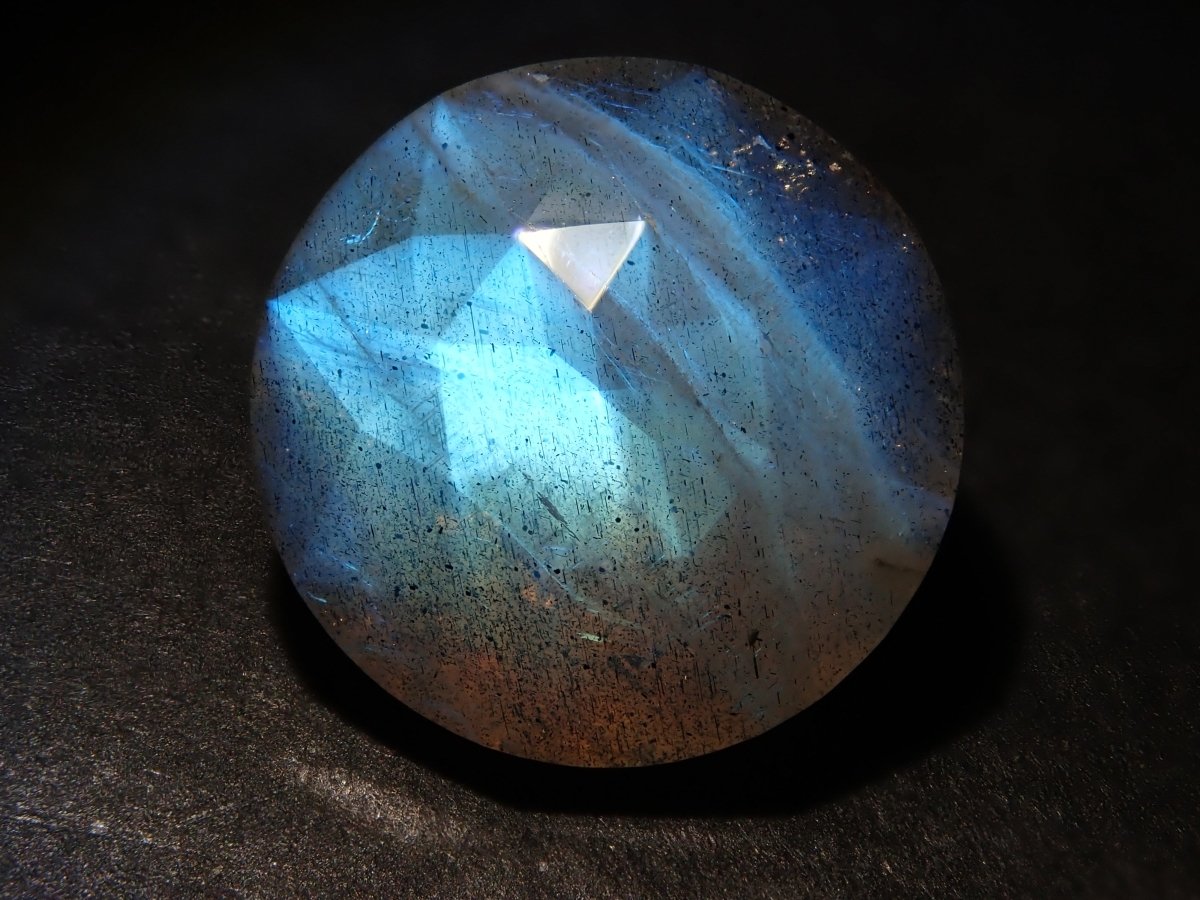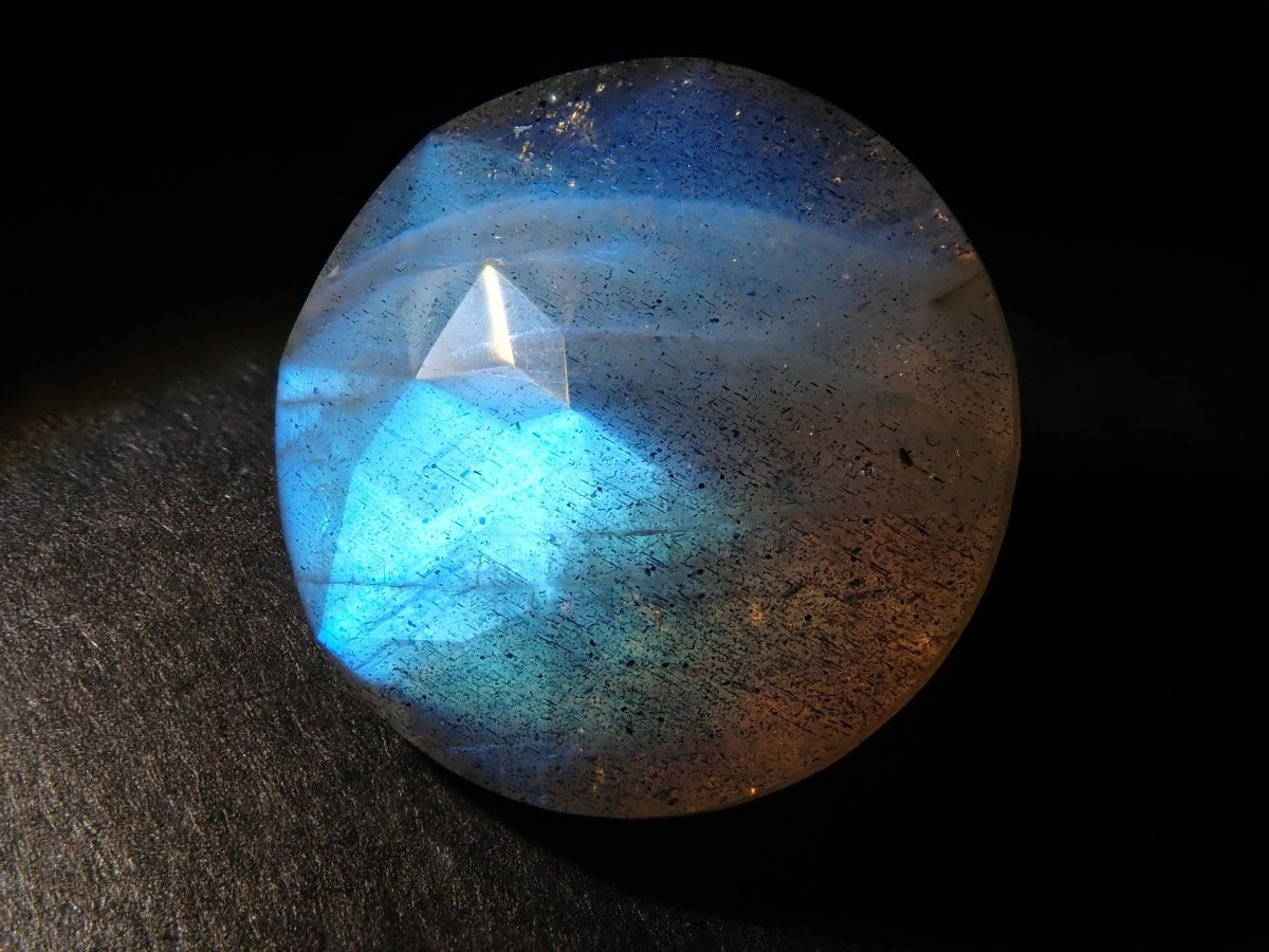 拉長石(俗稱藍月光石)是一種具有「虹彩效應」的寶石,會導致光線閃爍彩虹色的光芒。這種光帶來神秘的美感。為了清晰地捕捉光學效果,照片是使用筆燈拍攝的。