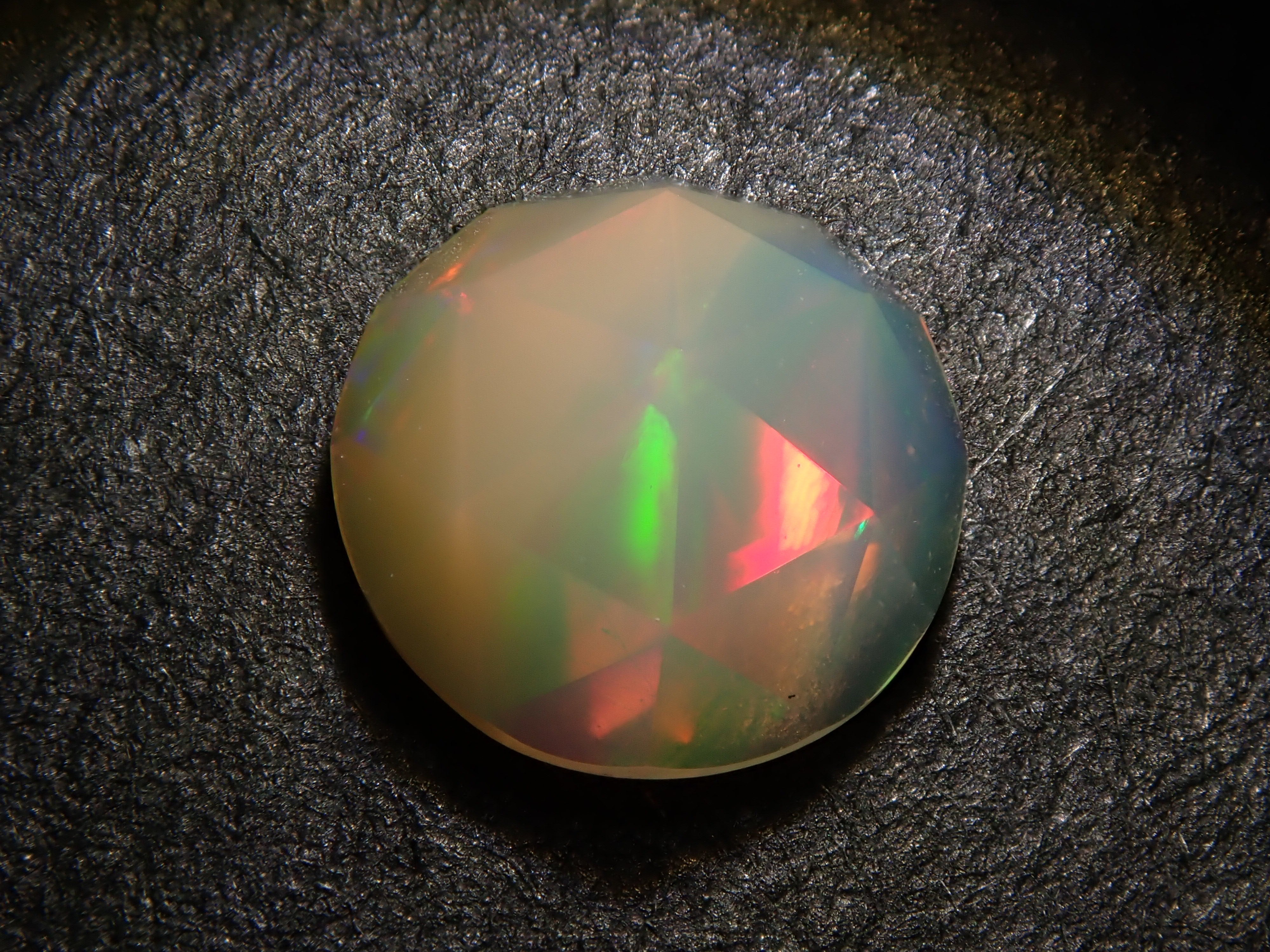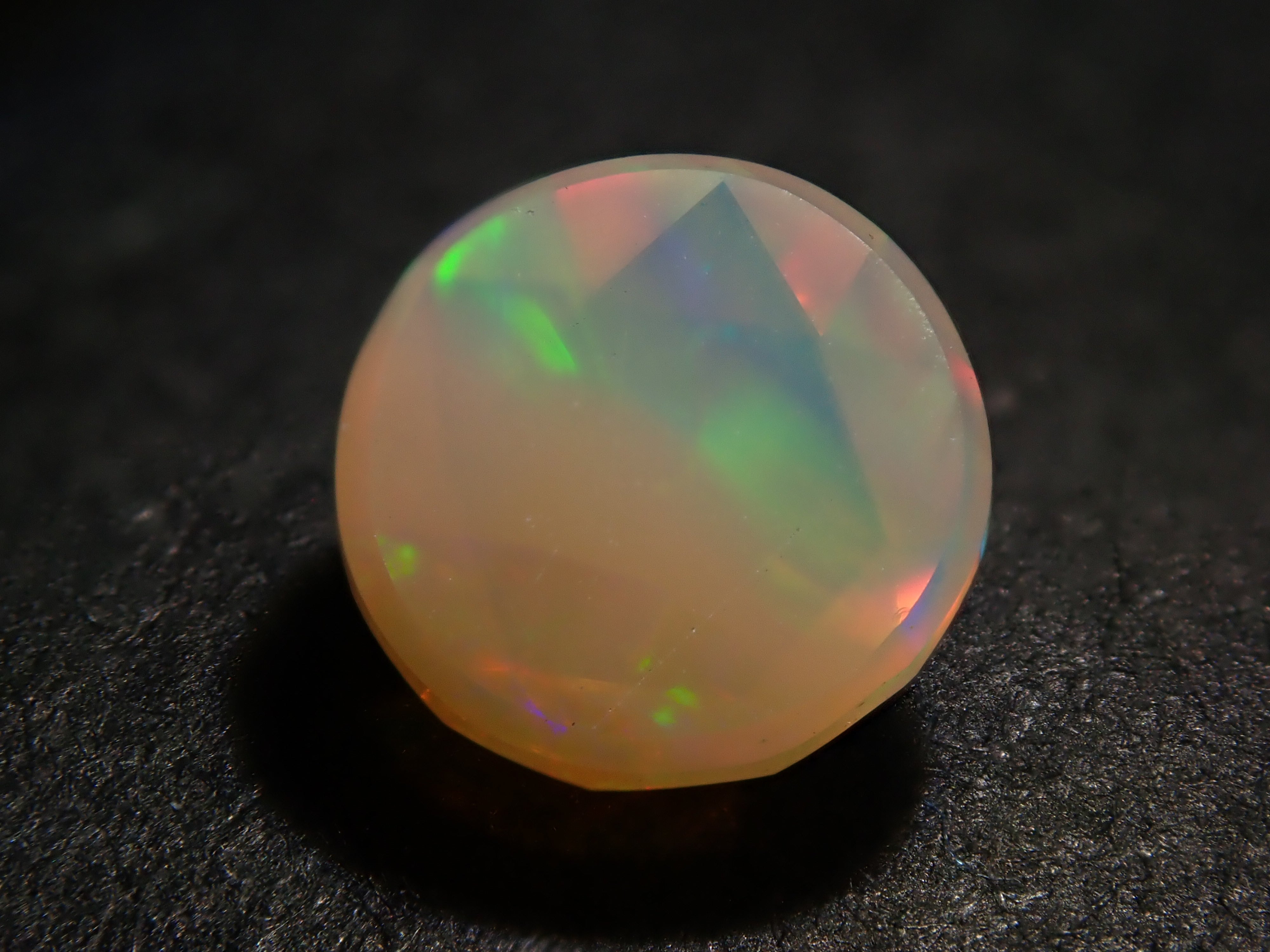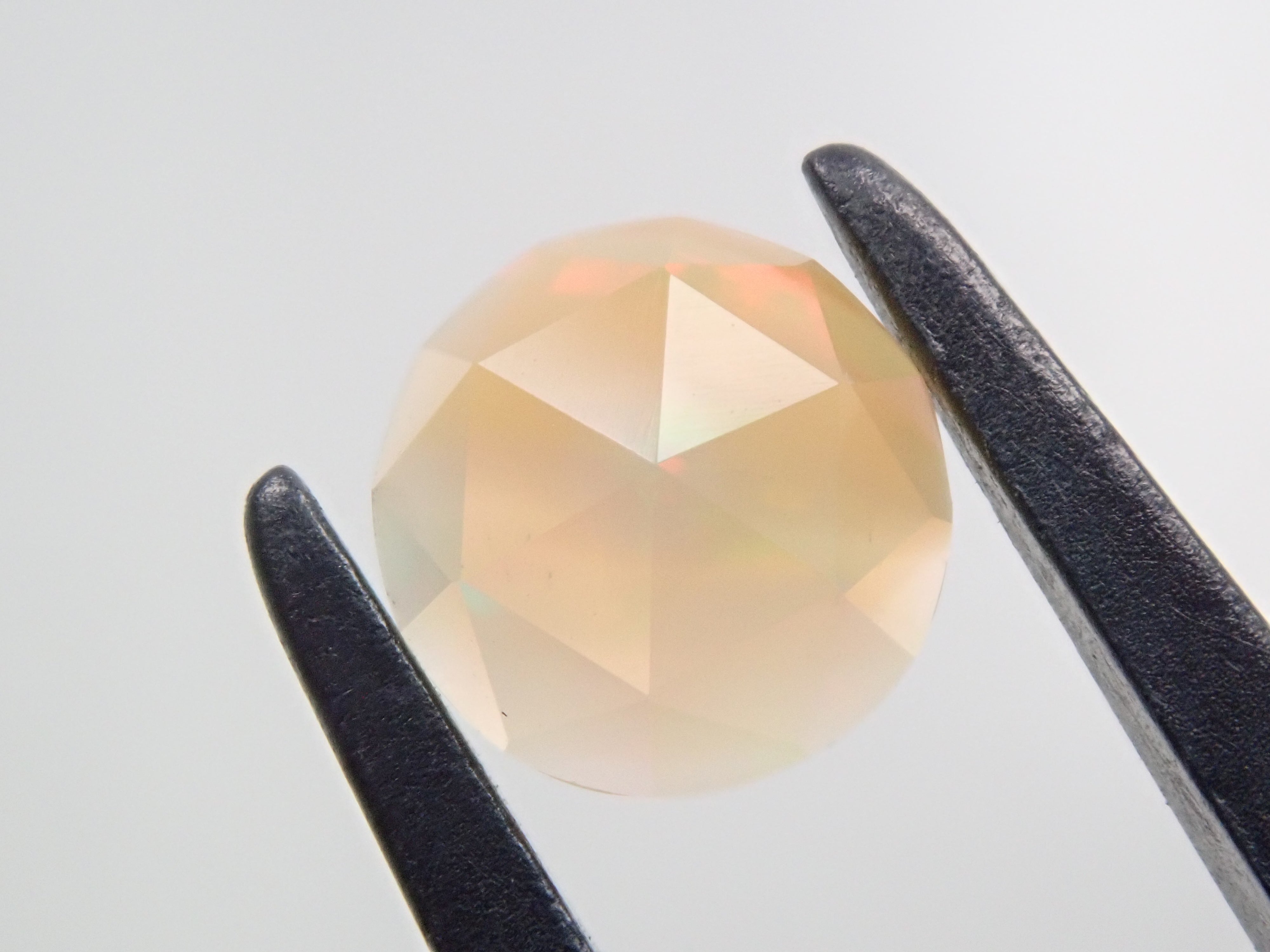 這是一顆 6 毫米玫瑰切割蛋白石,由 NOBU 製作,NOBU 也因其貓式切割而聞名。