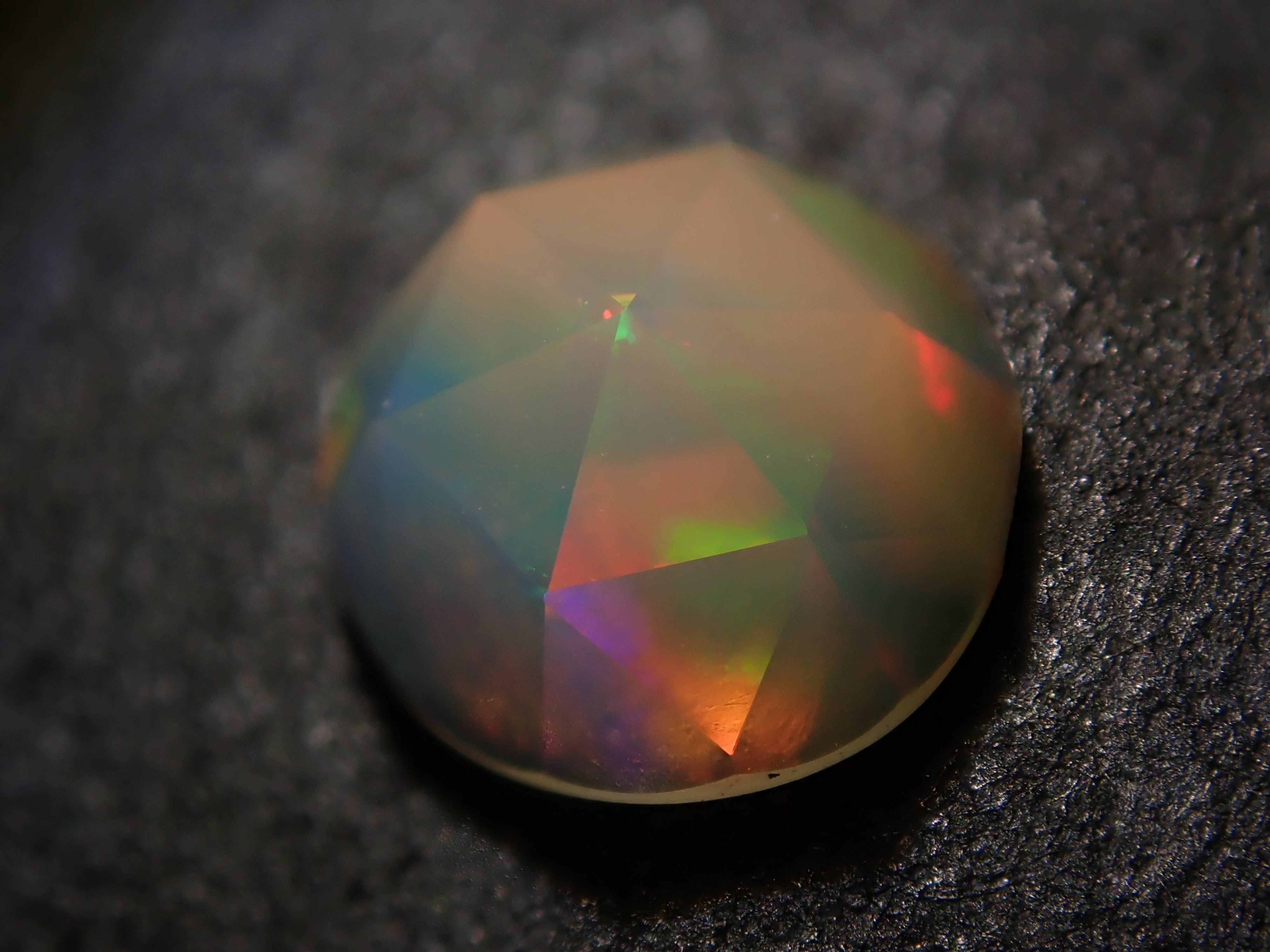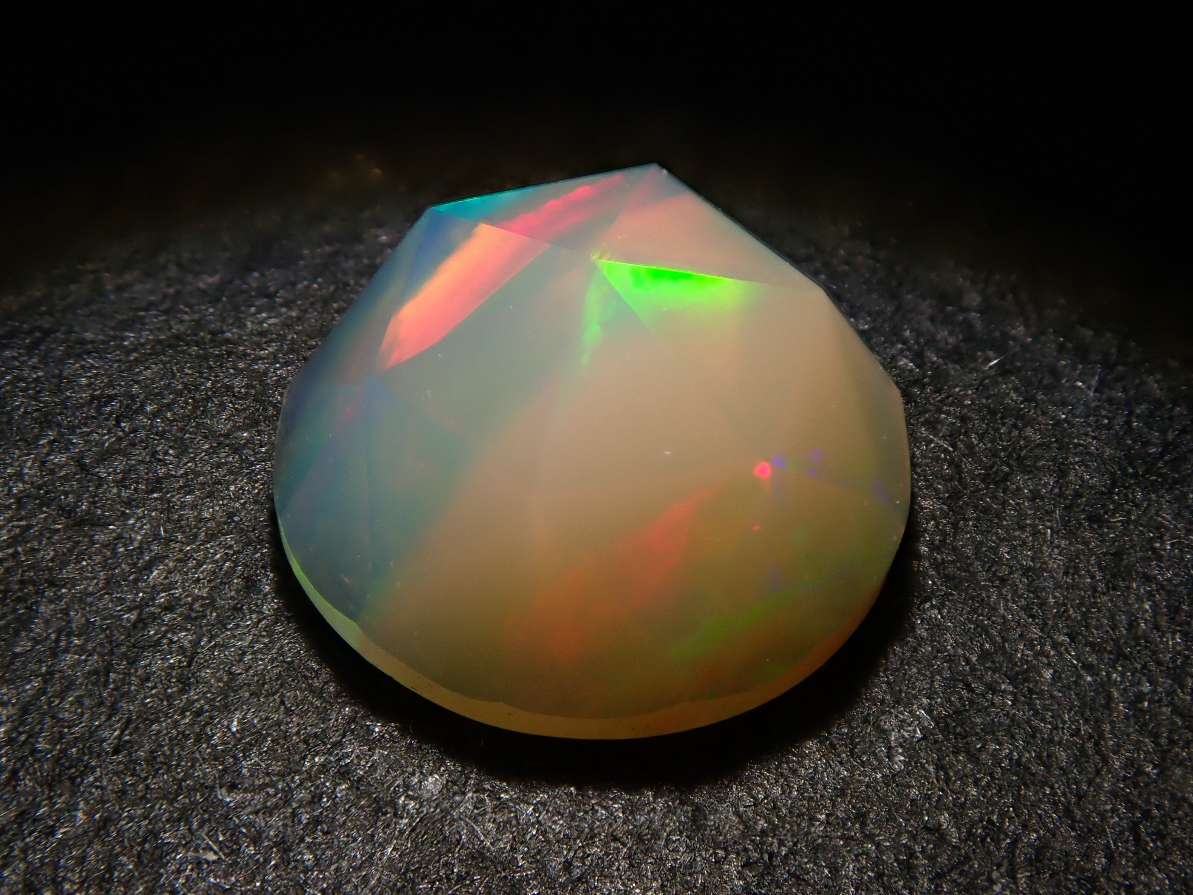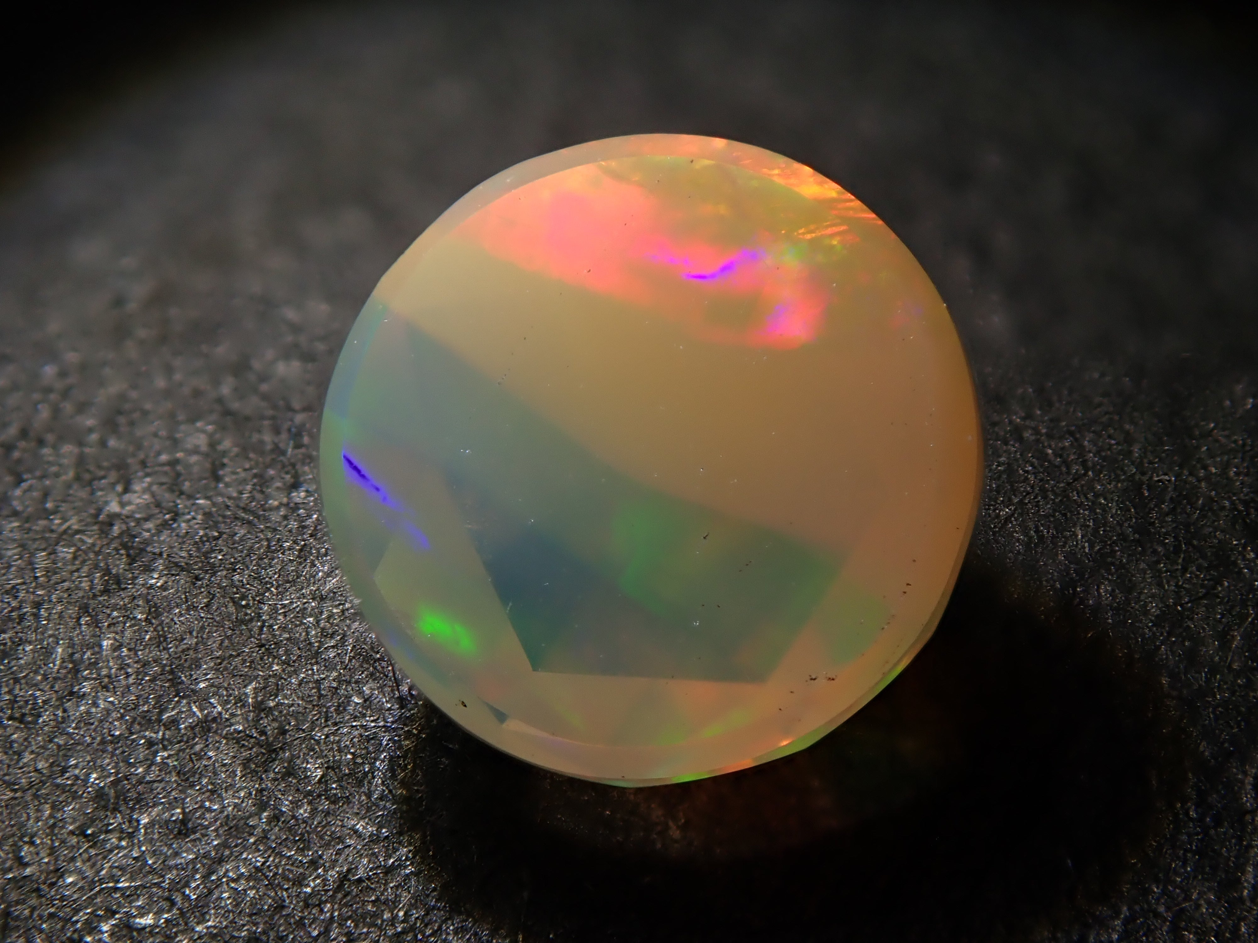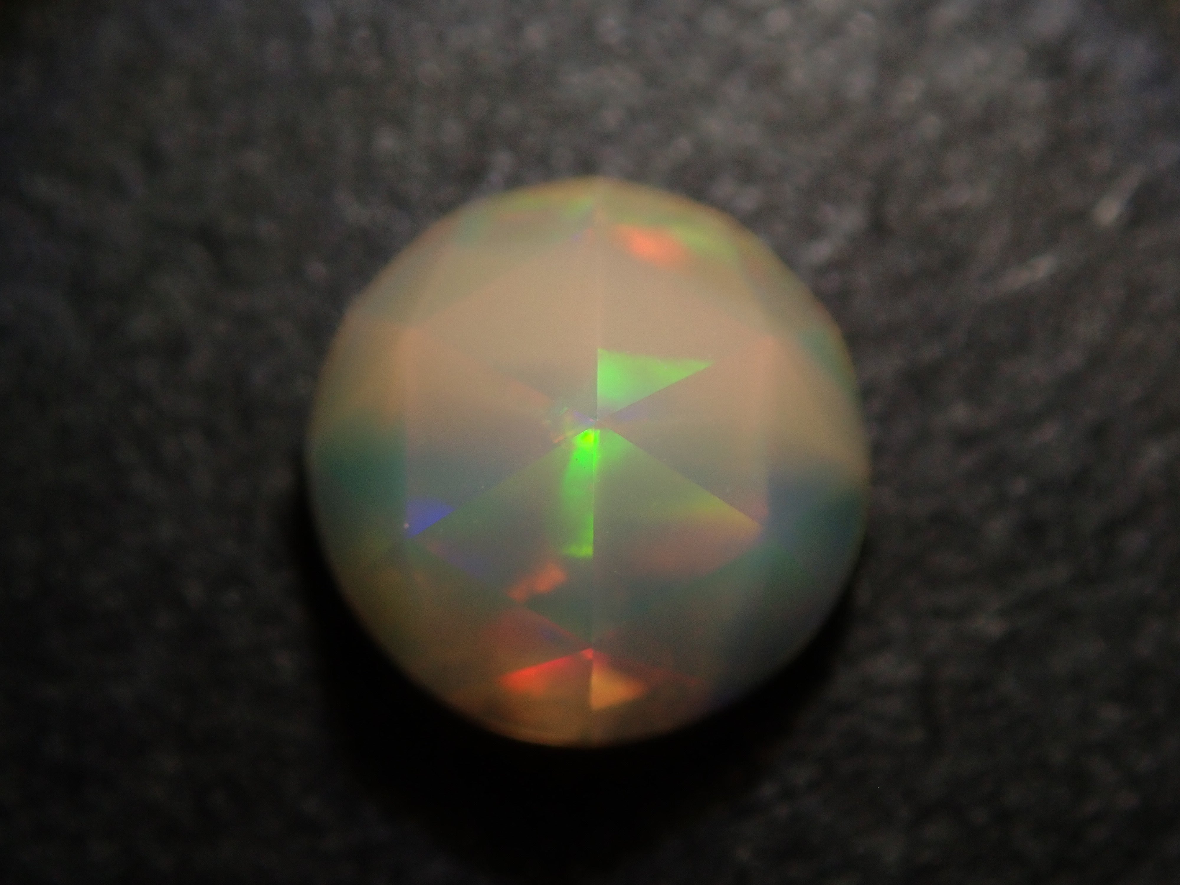 這是一顆 6 毫米玫瑰切割蛋白石,由 NOBU 製作,NOBU 也因其貓式切割而聞名。