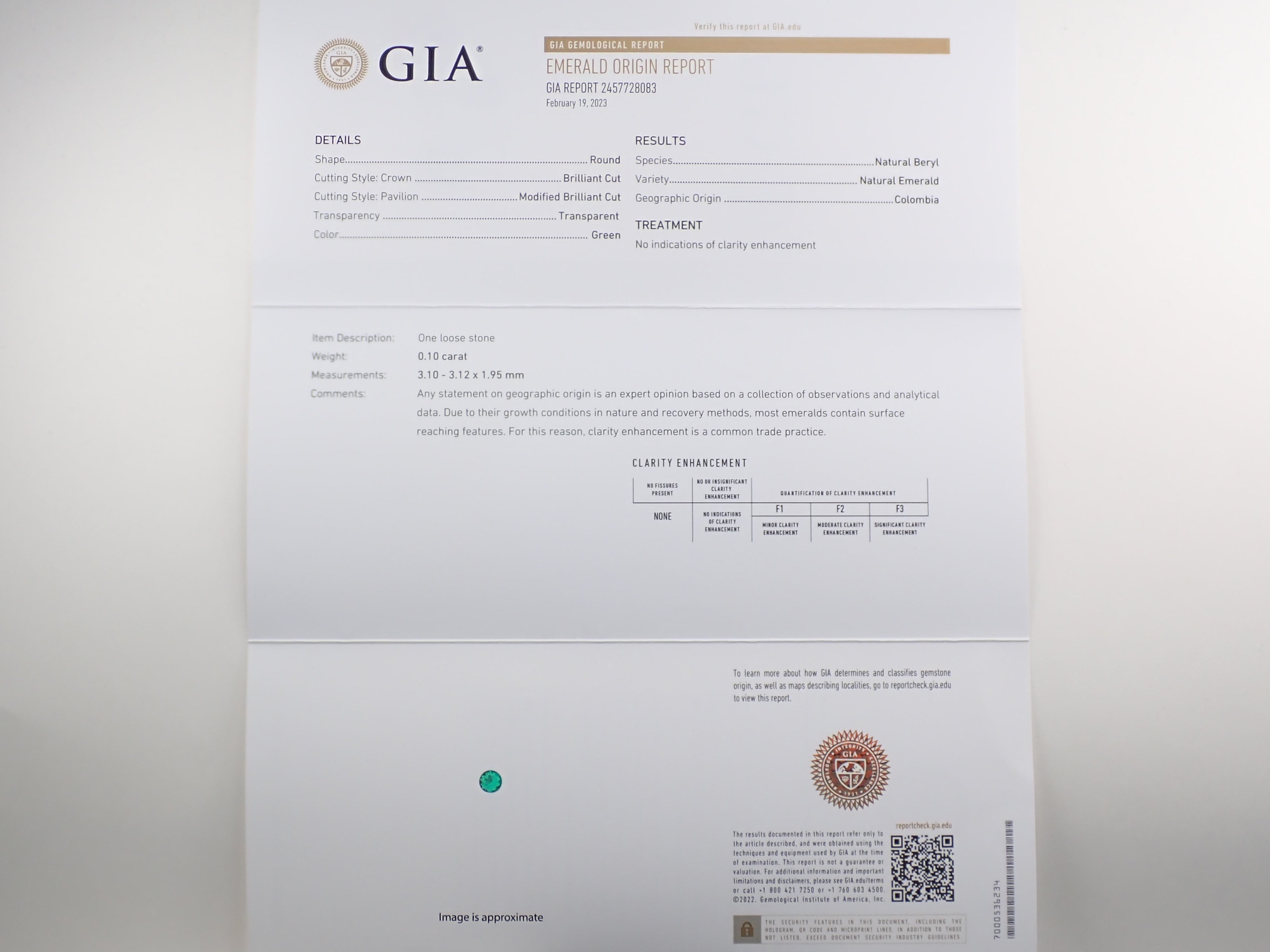 哥倫比亞無油祖母綠 3.1 毫米/0.10 克拉裸石 GIA