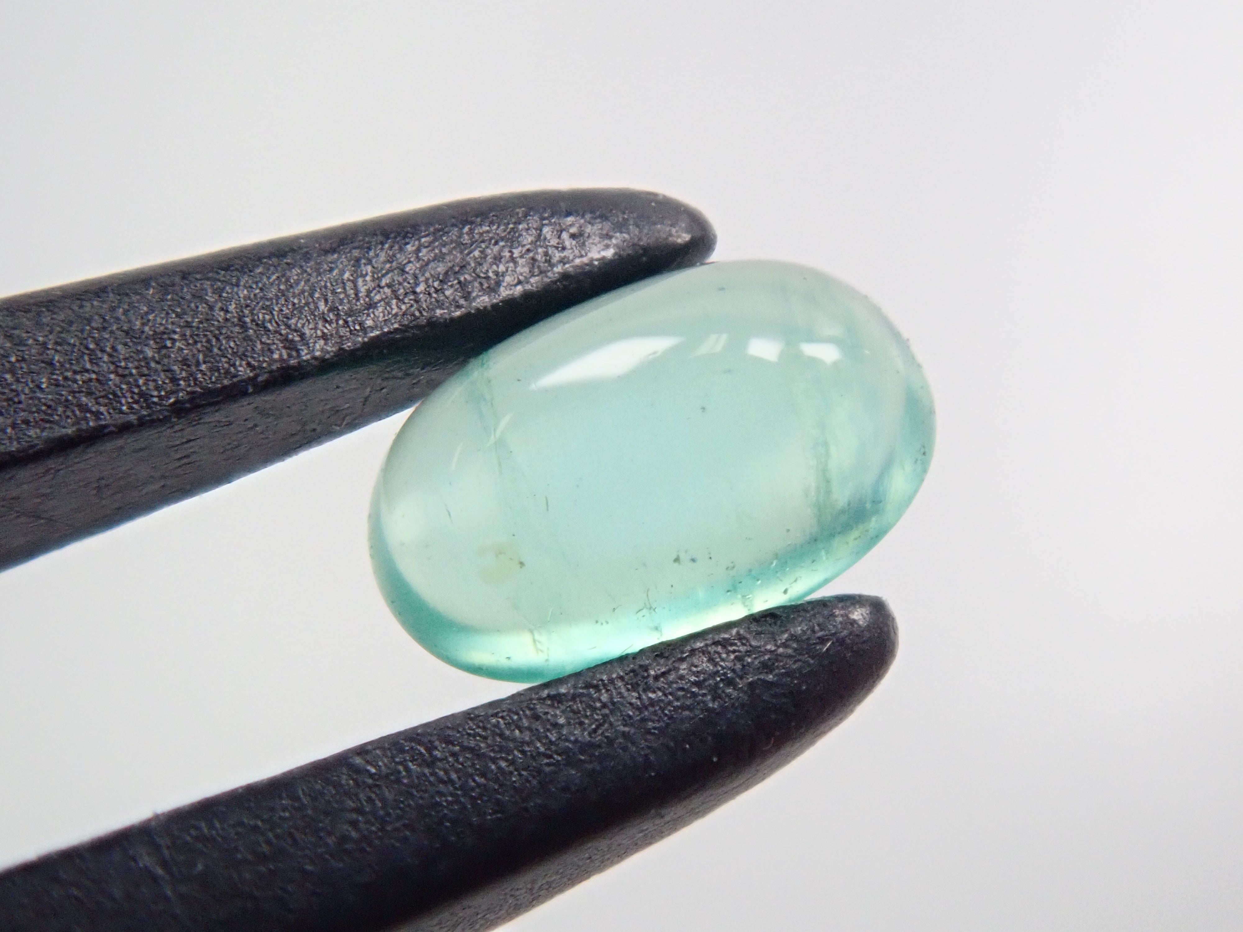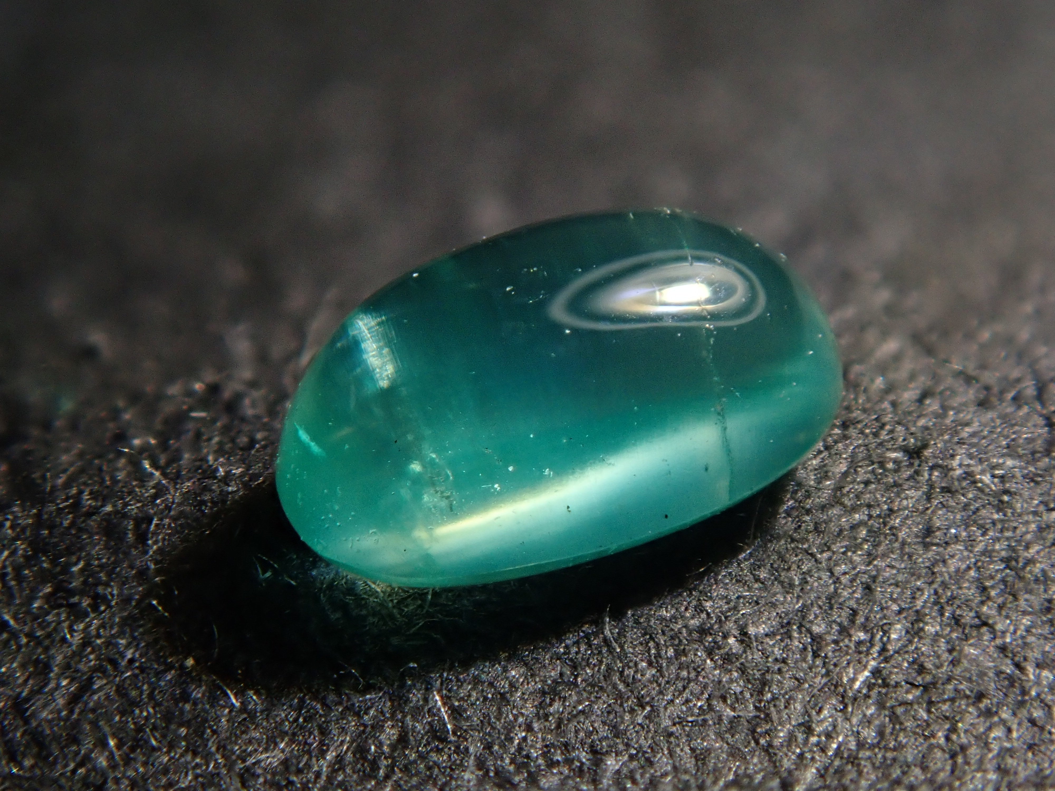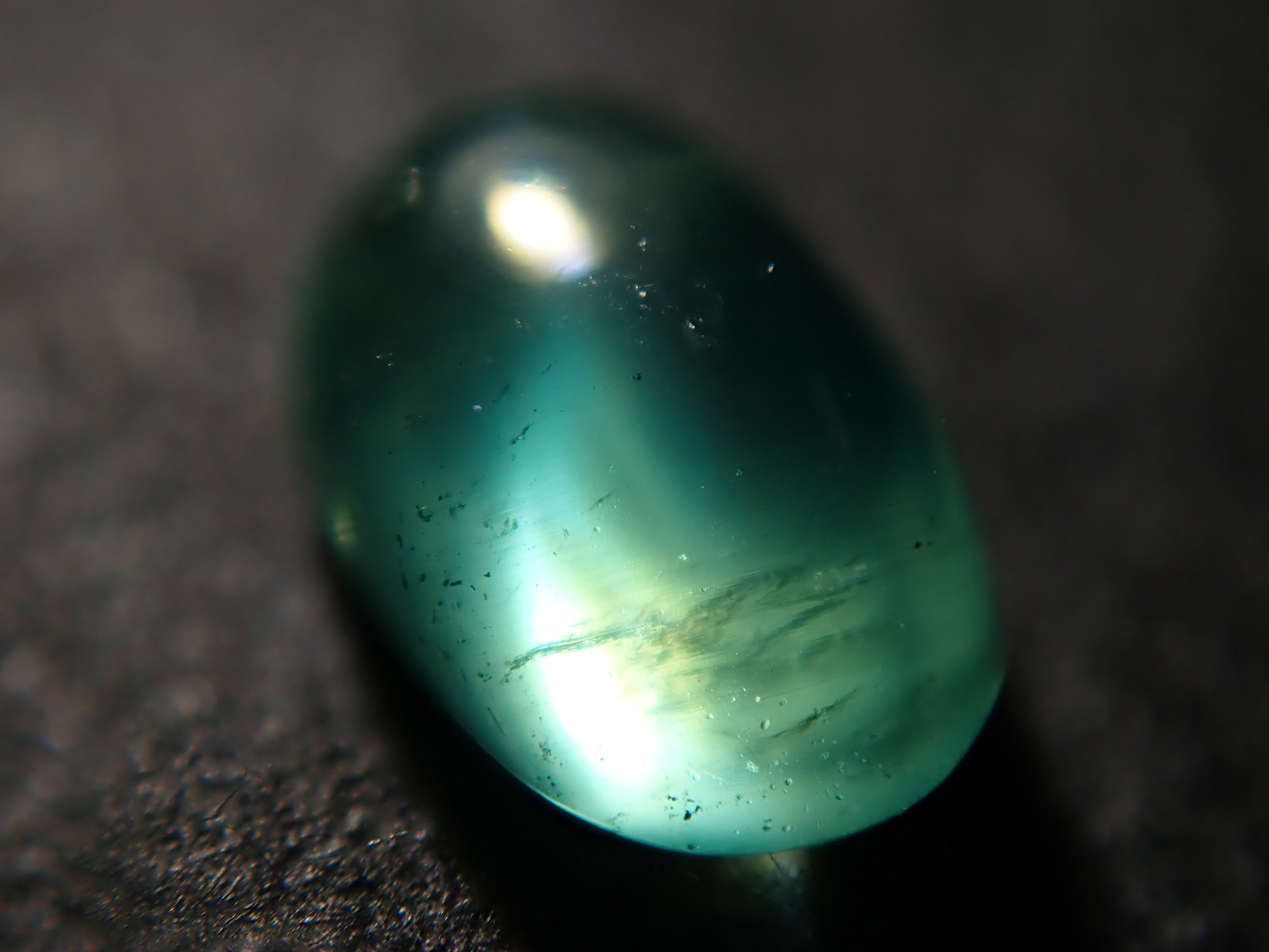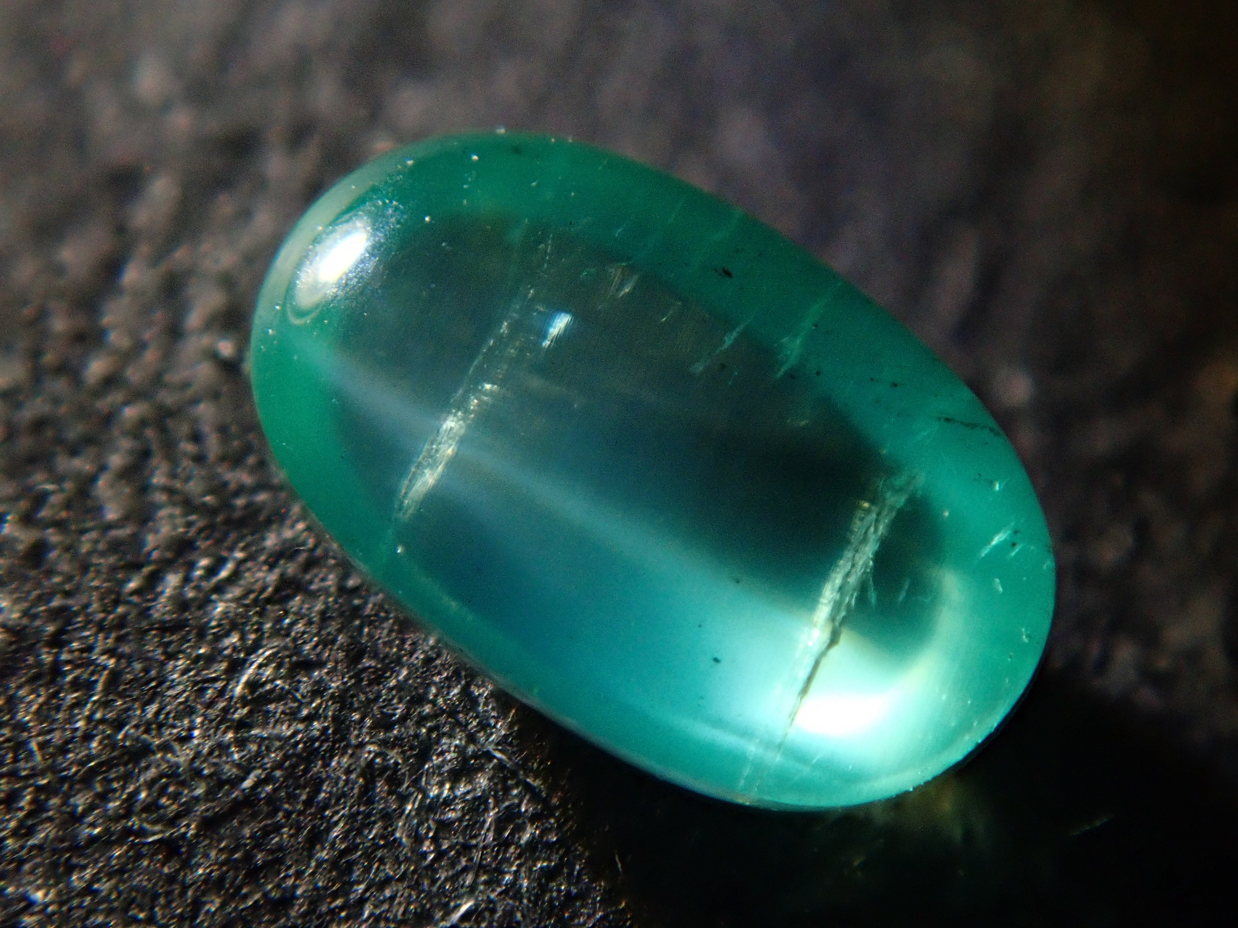 祖母綠是一種因受到埃及豔後克莉奧佩特拉的喜愛而聞名的寶石。它也是一塊有瑕疵的石頭,以至於有「完美無瑕的祖母綠比沒有瑕疵的人還少」的說法。因此,通常使用油處理來使刮痕不那麼明顯。當暴露在光線下時,您可以看到貓眼效應(貓眼)。溫柔與清新融為一體的表情非常吸引人。照片是使用筆燈拍攝的。石頭的背面基本上是未拋光的。