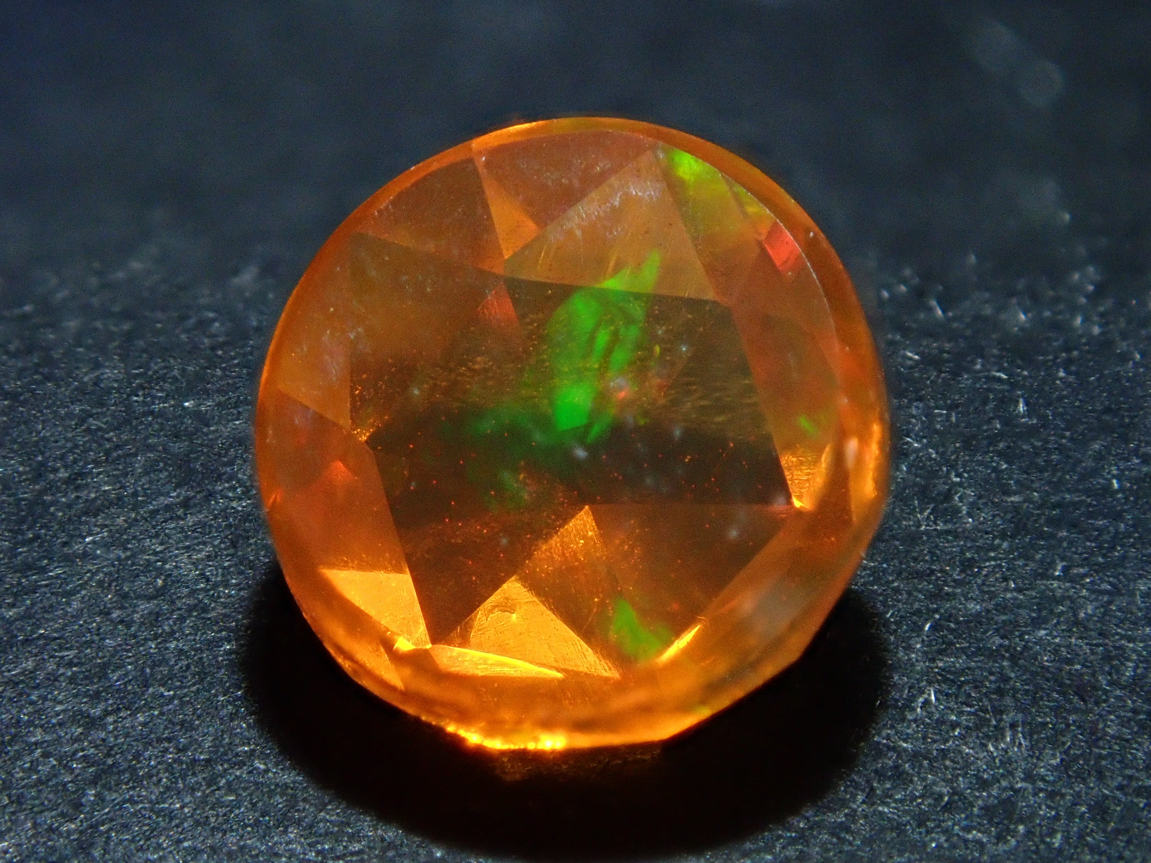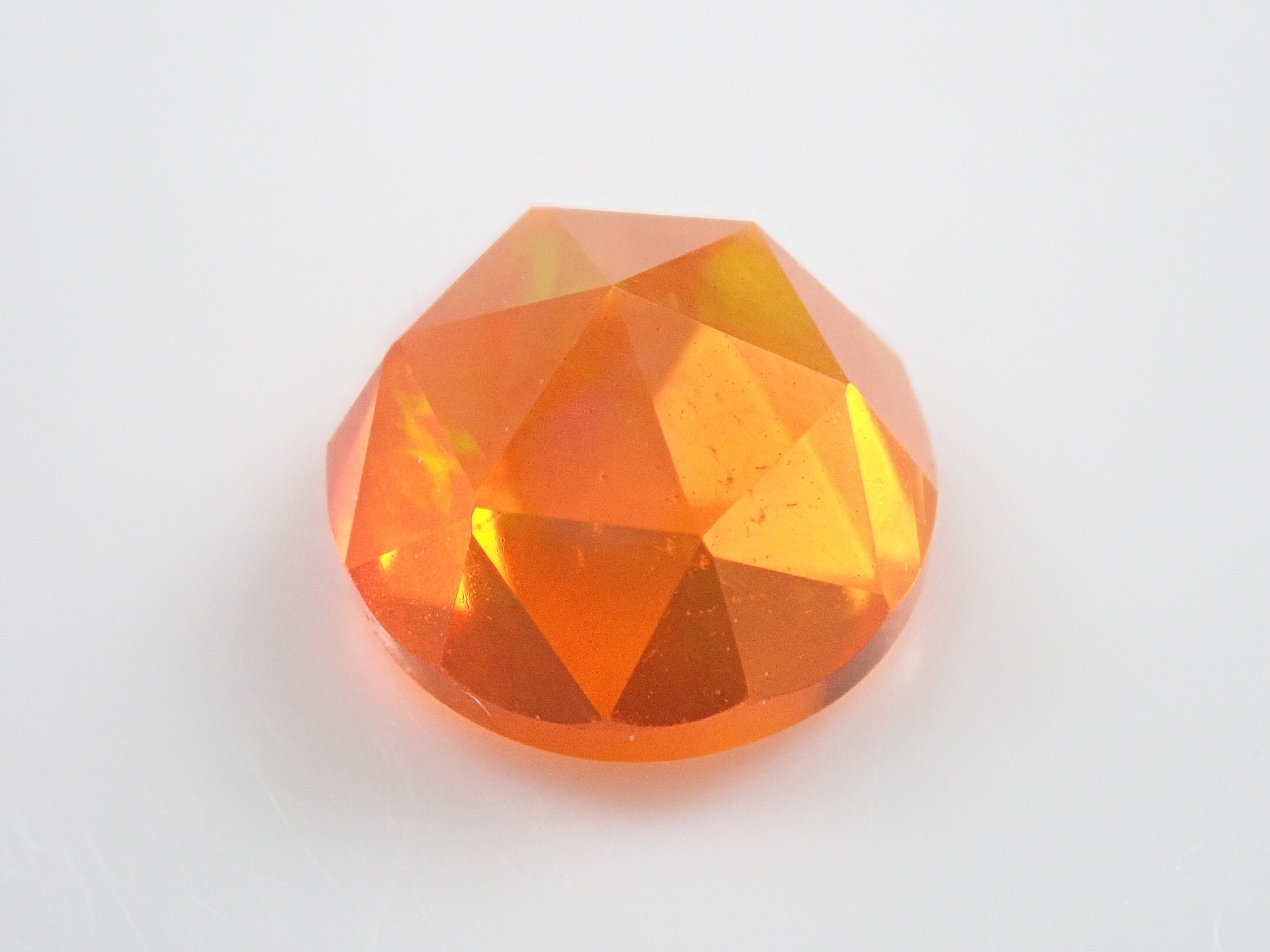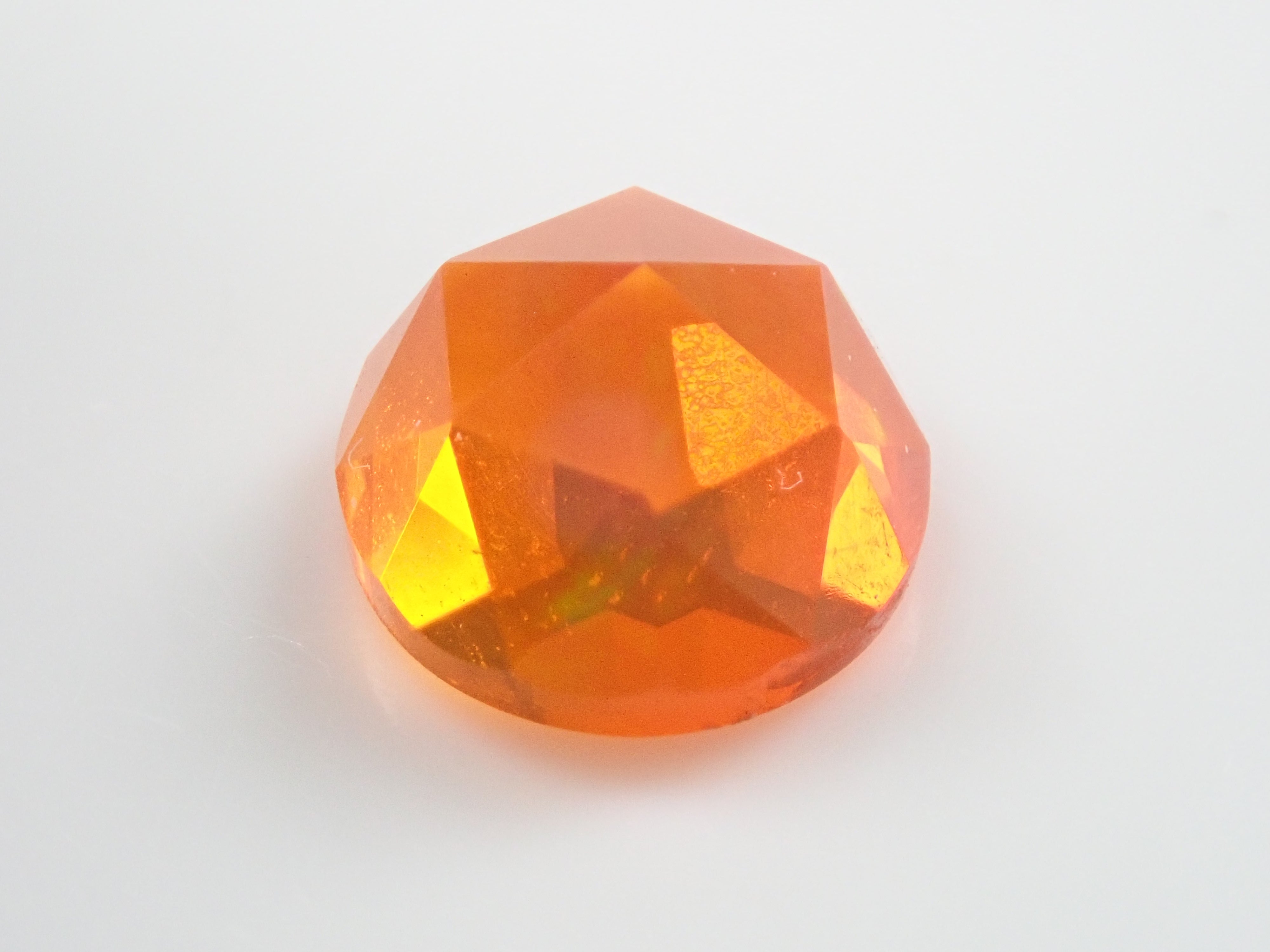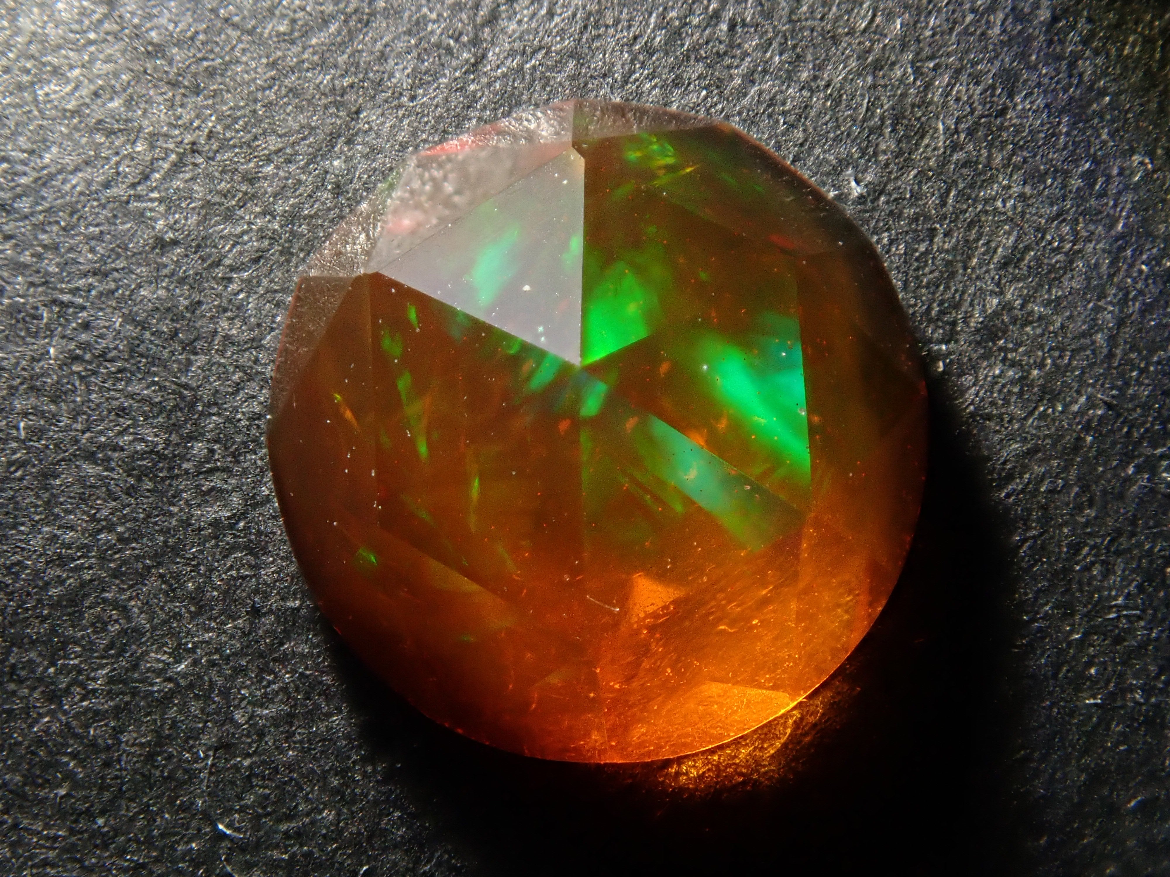 自古羅馬時代以來,蛋白石就備受青睞。火蛋白石的體色從紅色到橙色,令人聯想到火焰。這張照片是用筆型電筒拍攝的。這是一顆產自墨西哥的6毫米玫瑰式切火蛋白石。