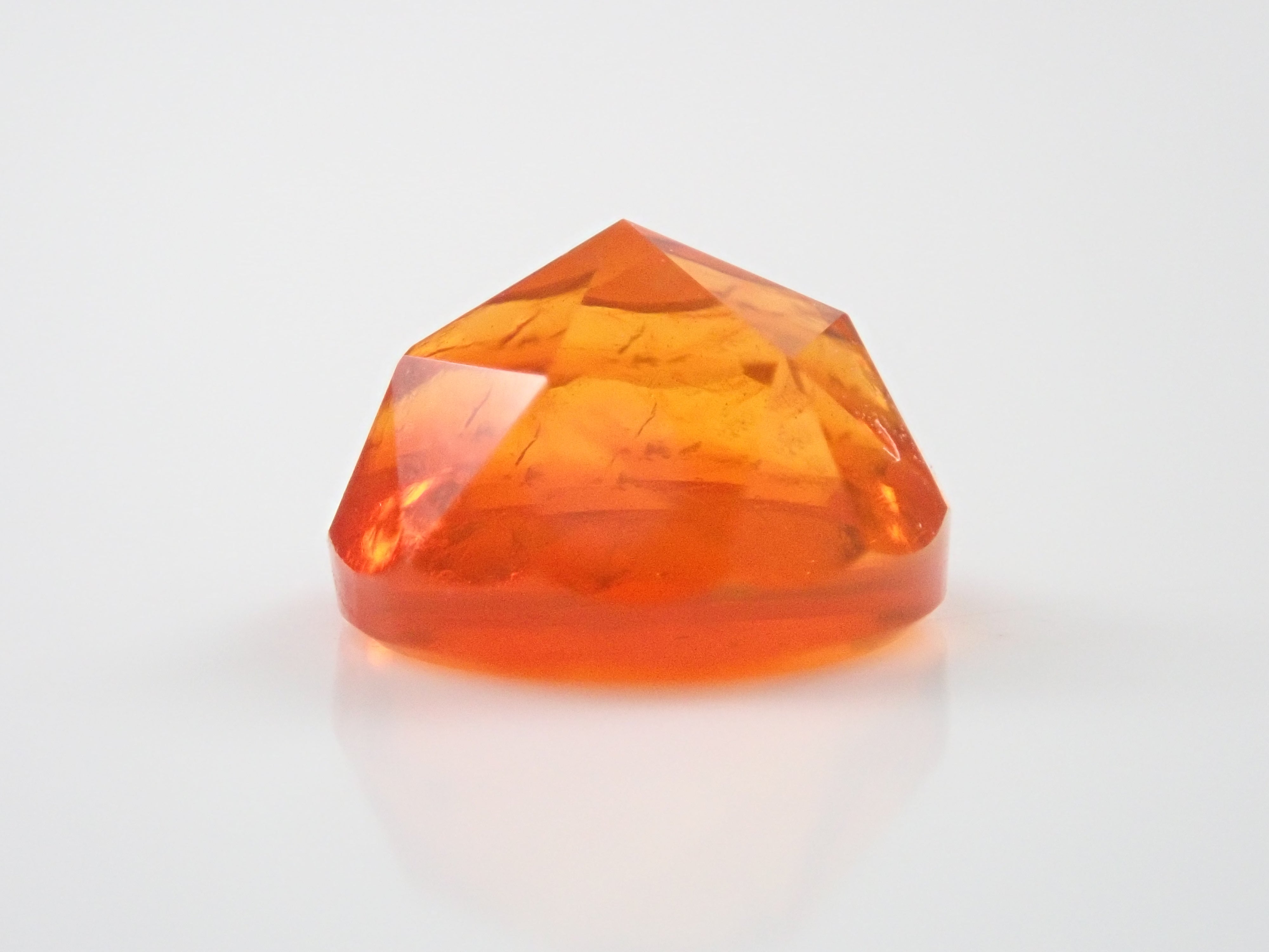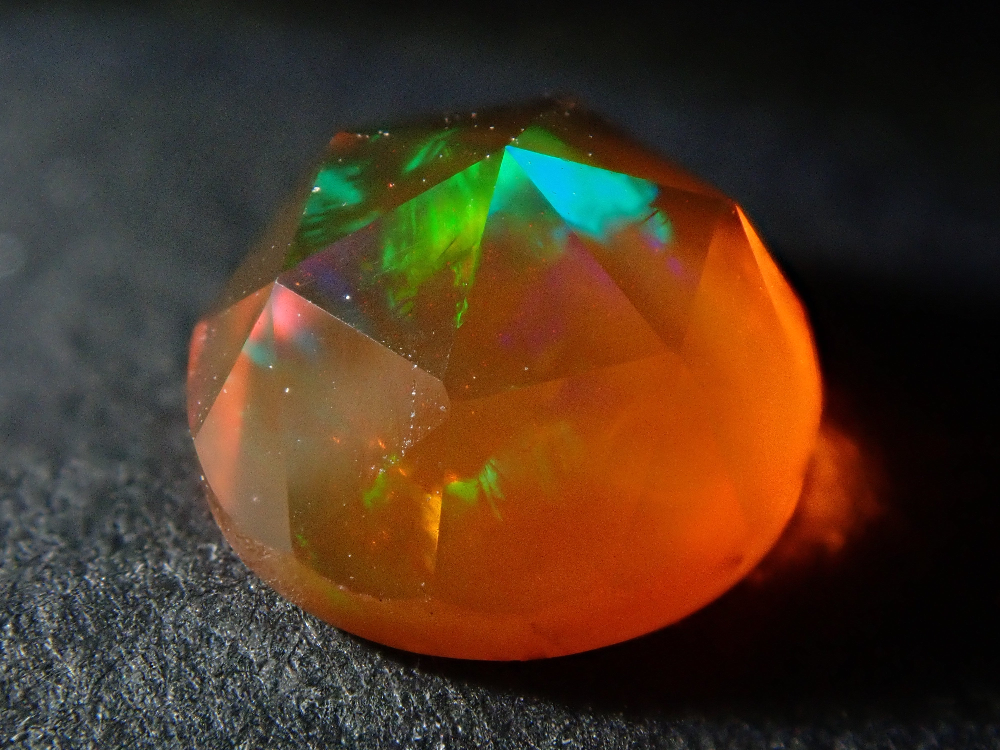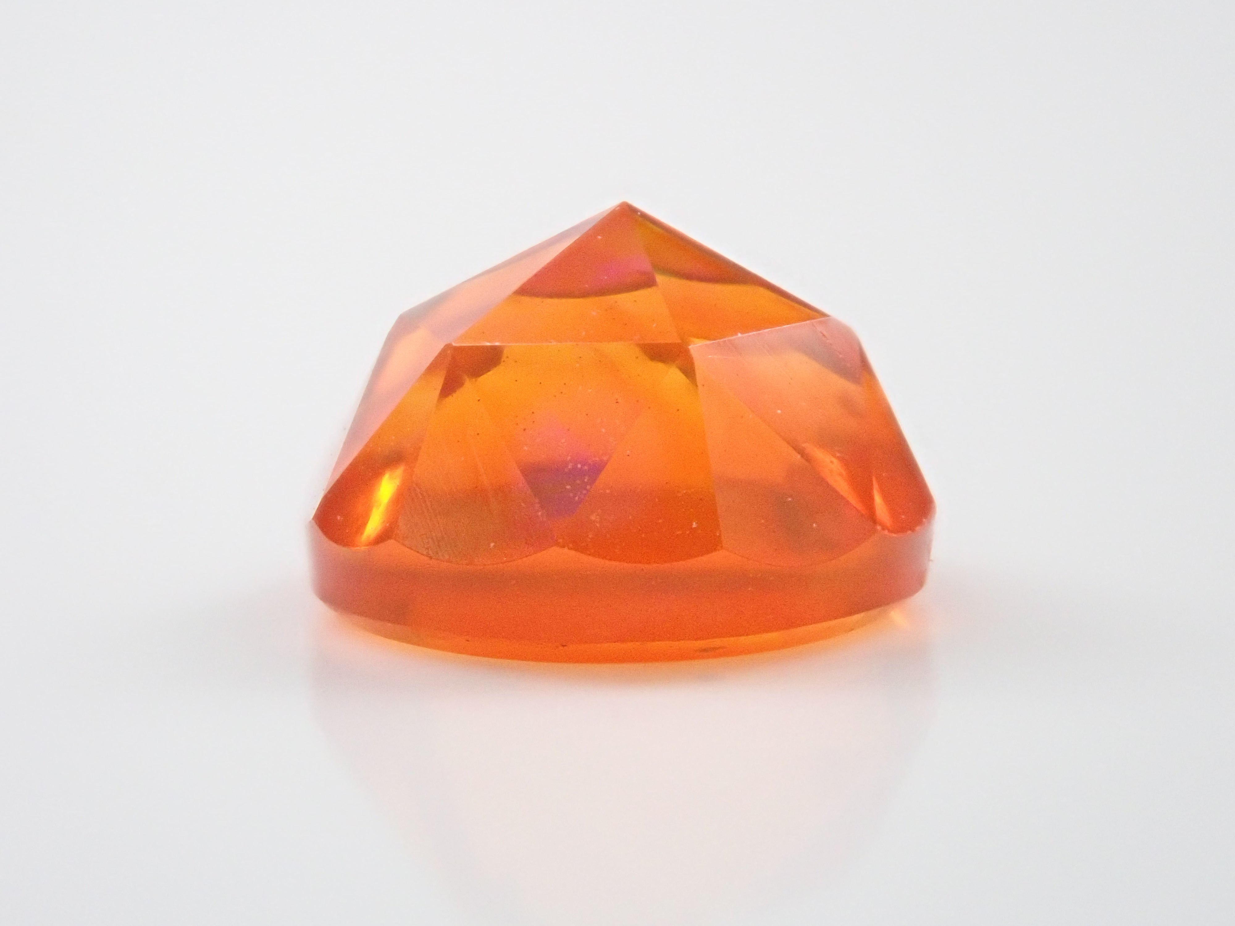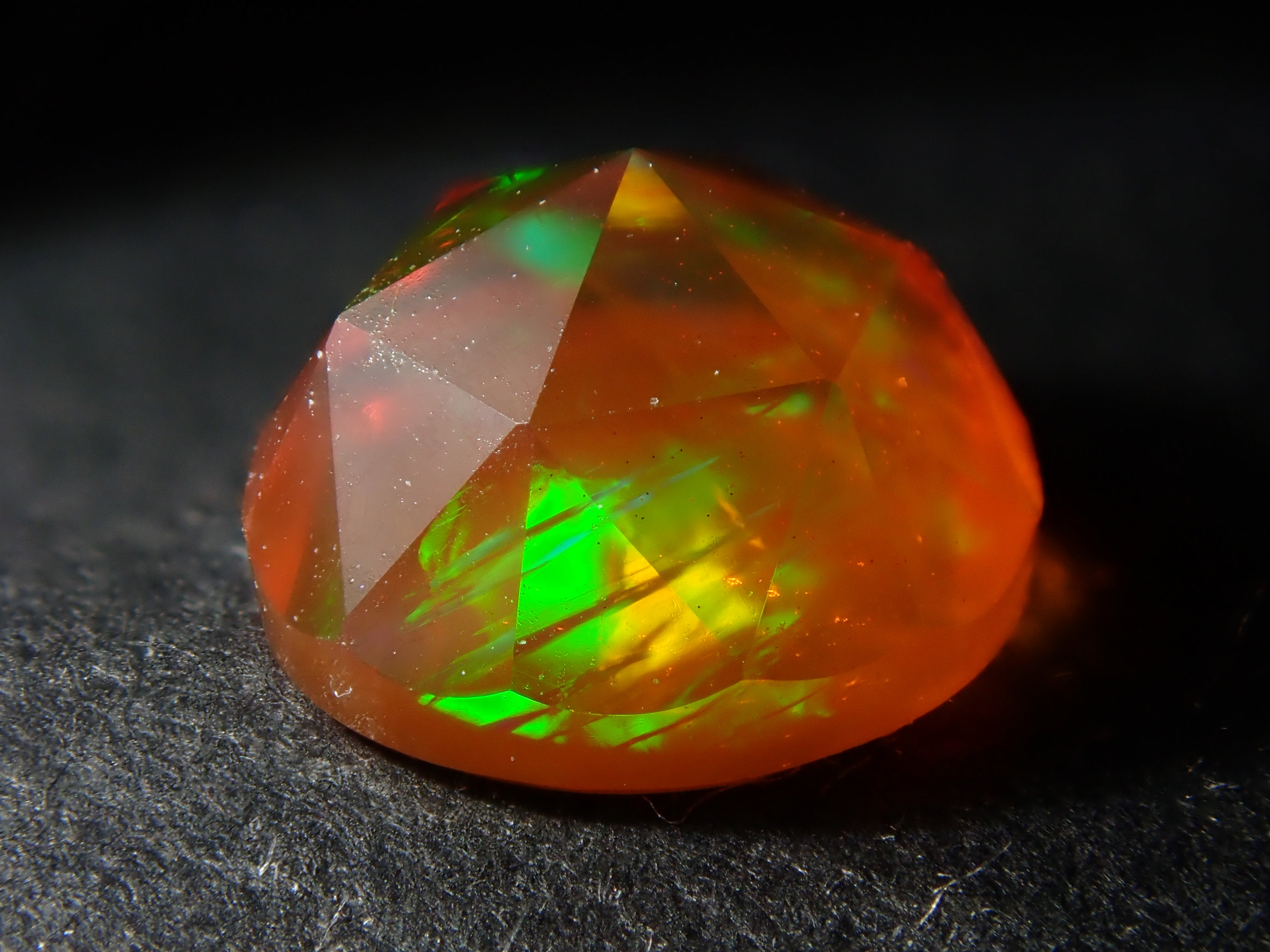 自古羅馬時代以來,蛋白石就備受青睞。火蛋白石的體色從紅色到橙色,令人聯想到火焰。這張照片是用筆型電筒拍攝的。這是一顆產自墨西哥的6毫米玫瑰式切火蛋白石。