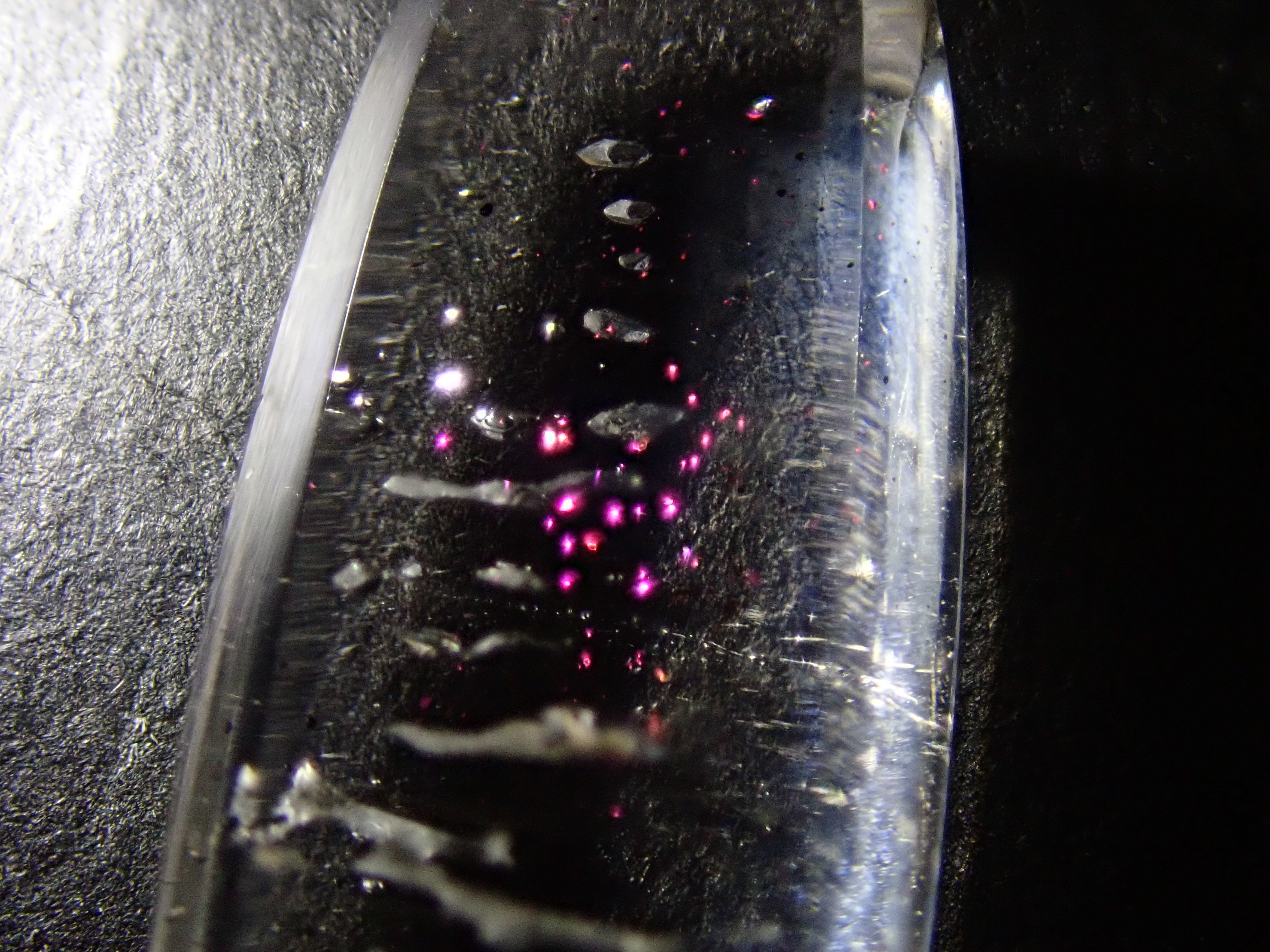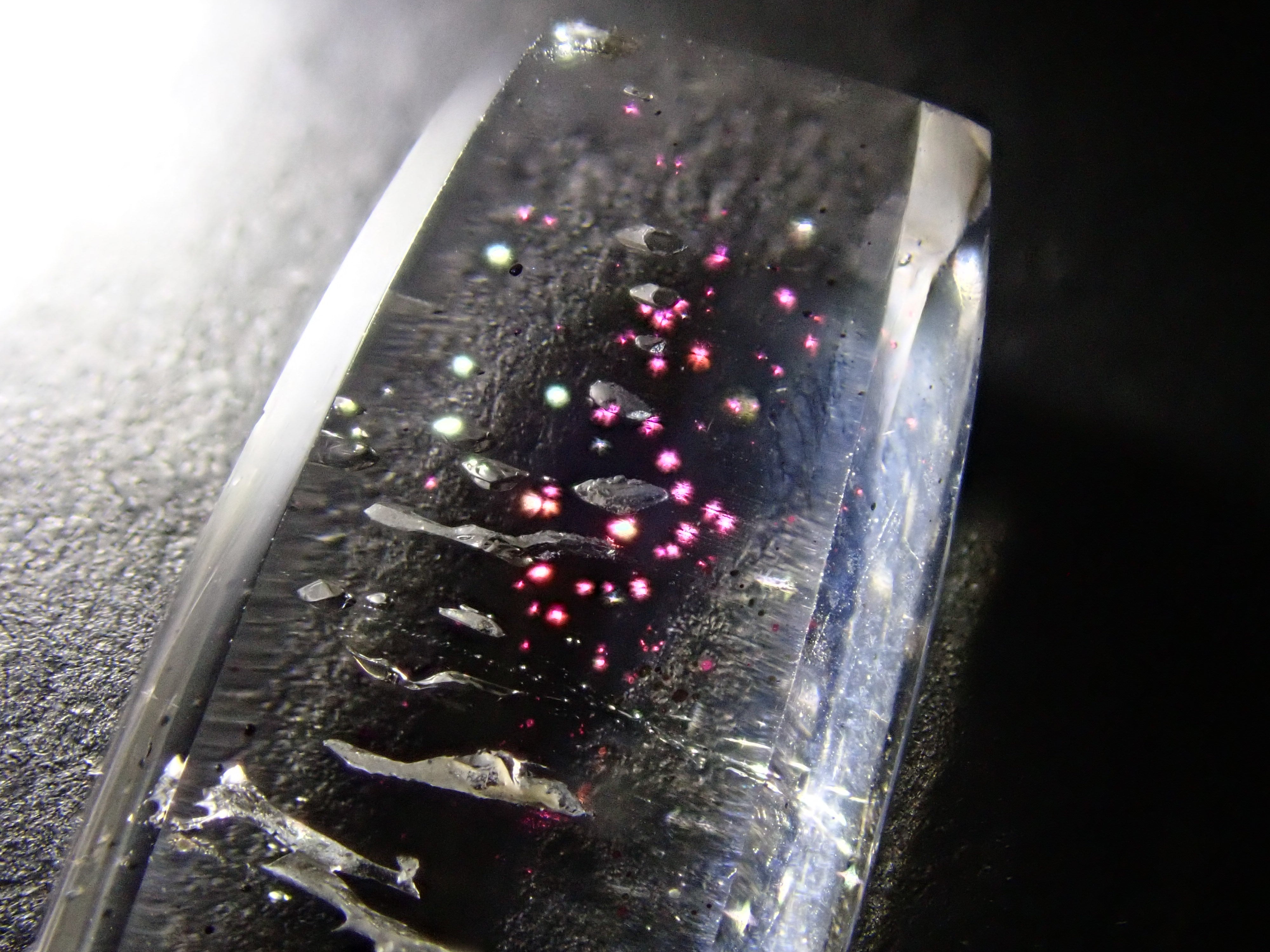 石英,日文稱為“水晶”,在日本是一種常見的寶石,但它也是一種深奧的寶石,擁有眾多種類,包括紫水晶和黃水晶。這種形狀像紅色花瓣的水晶被稱為「小叮噹石英」或「粉紅火石英」。照片是用筆形電筒拍攝的,以便清晰地顯示內部內含物的狀態。