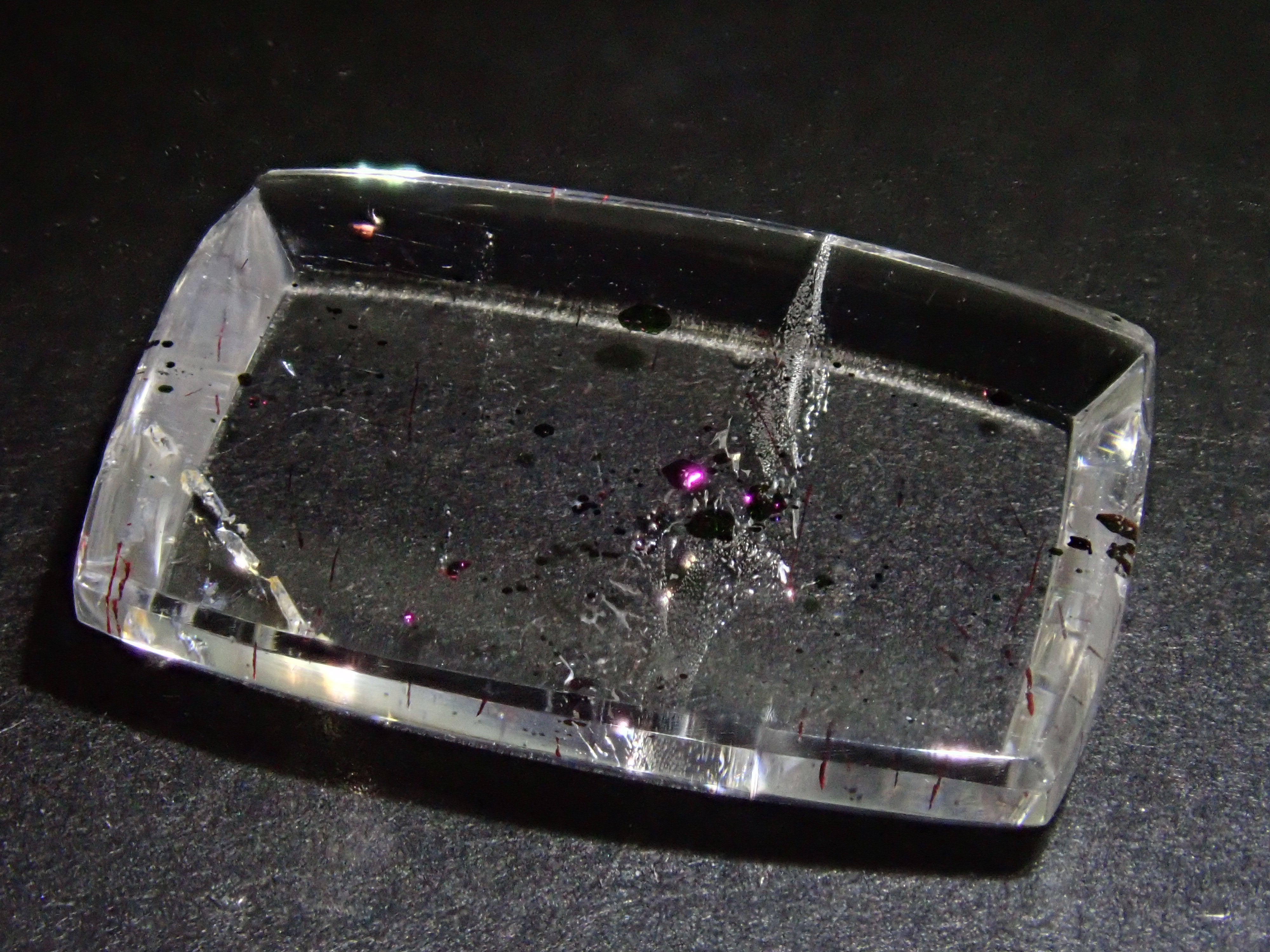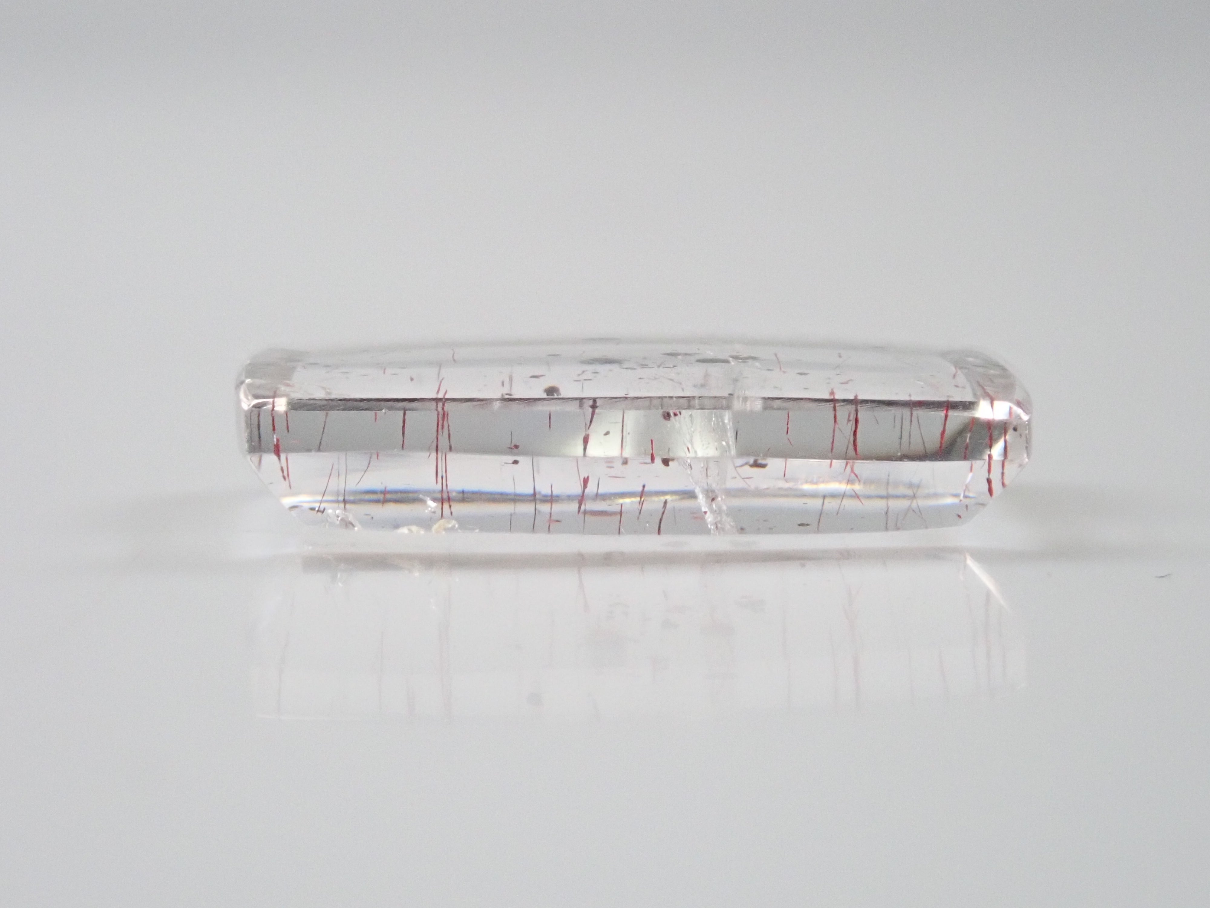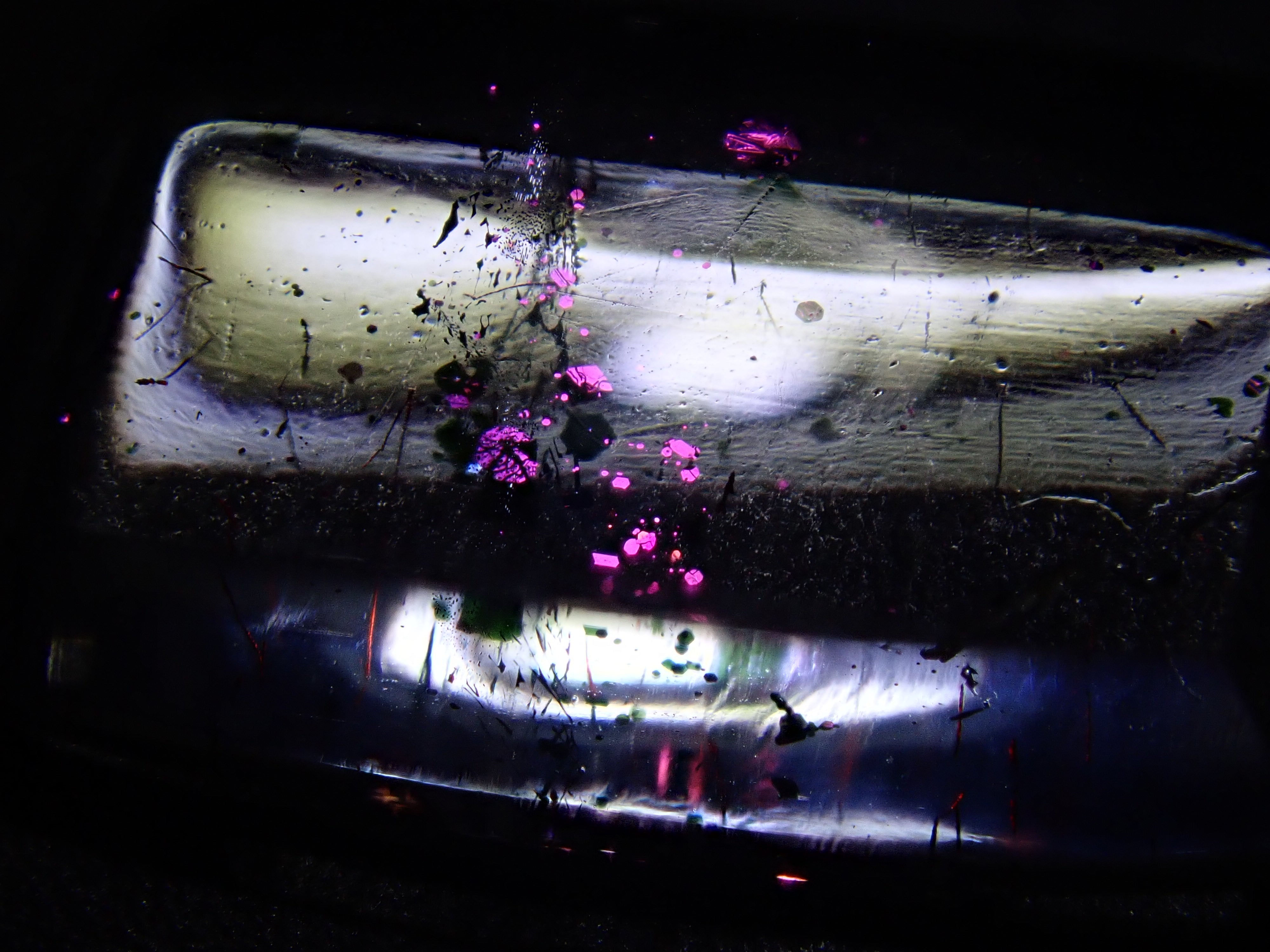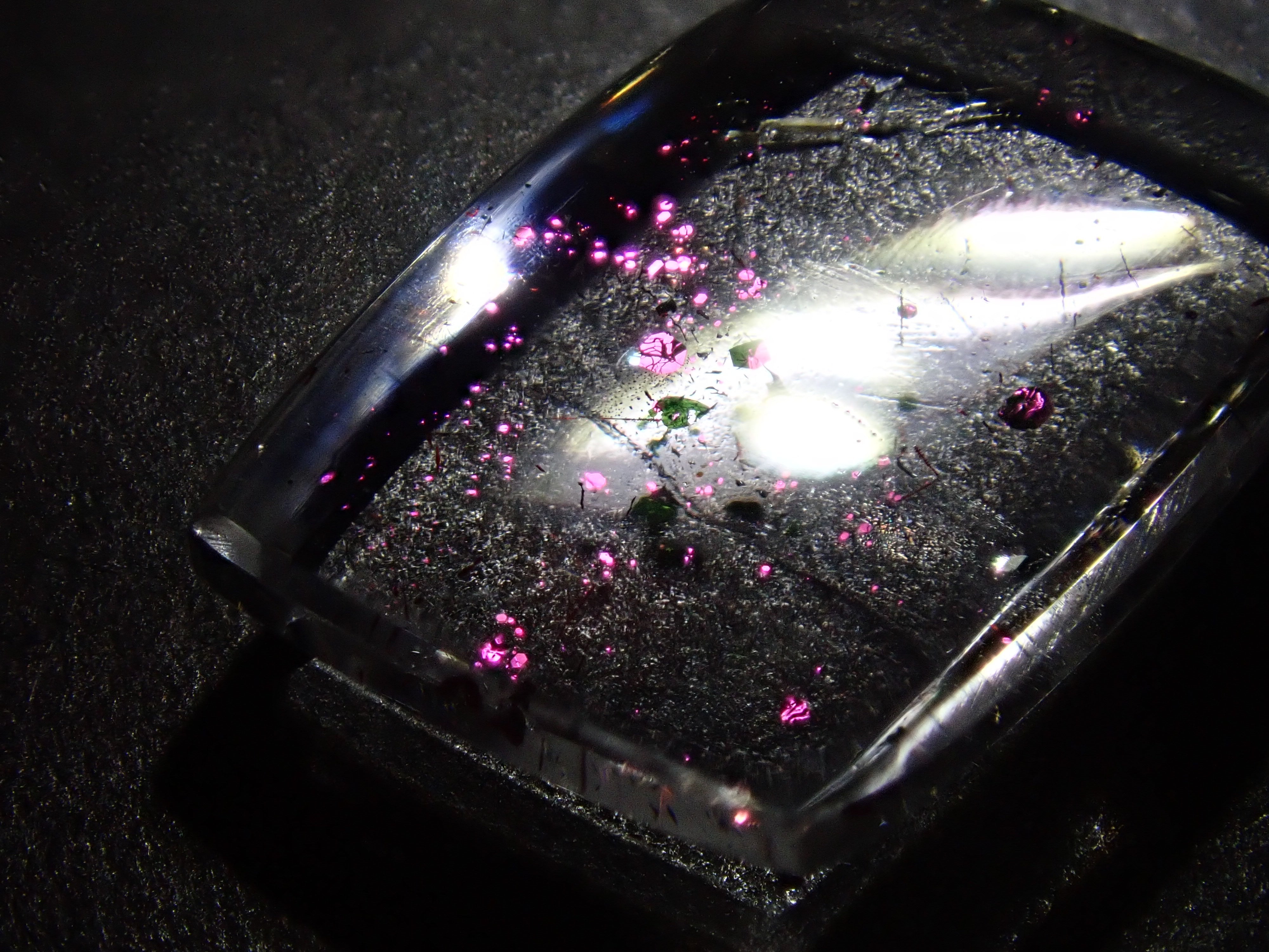 石英在日文中稱為水晶。它是一種在日本非常熟悉的石頭,但它也是一種深寶石,有紫水晶和黃水晶等多種類型。這種晶體看起來像暴風雪般的紅色花朵,被稱為小叮噹石英或粉紅火石英。為了清楚地展示裡麵包裹體的樣子,我用了筆燈拍照。
