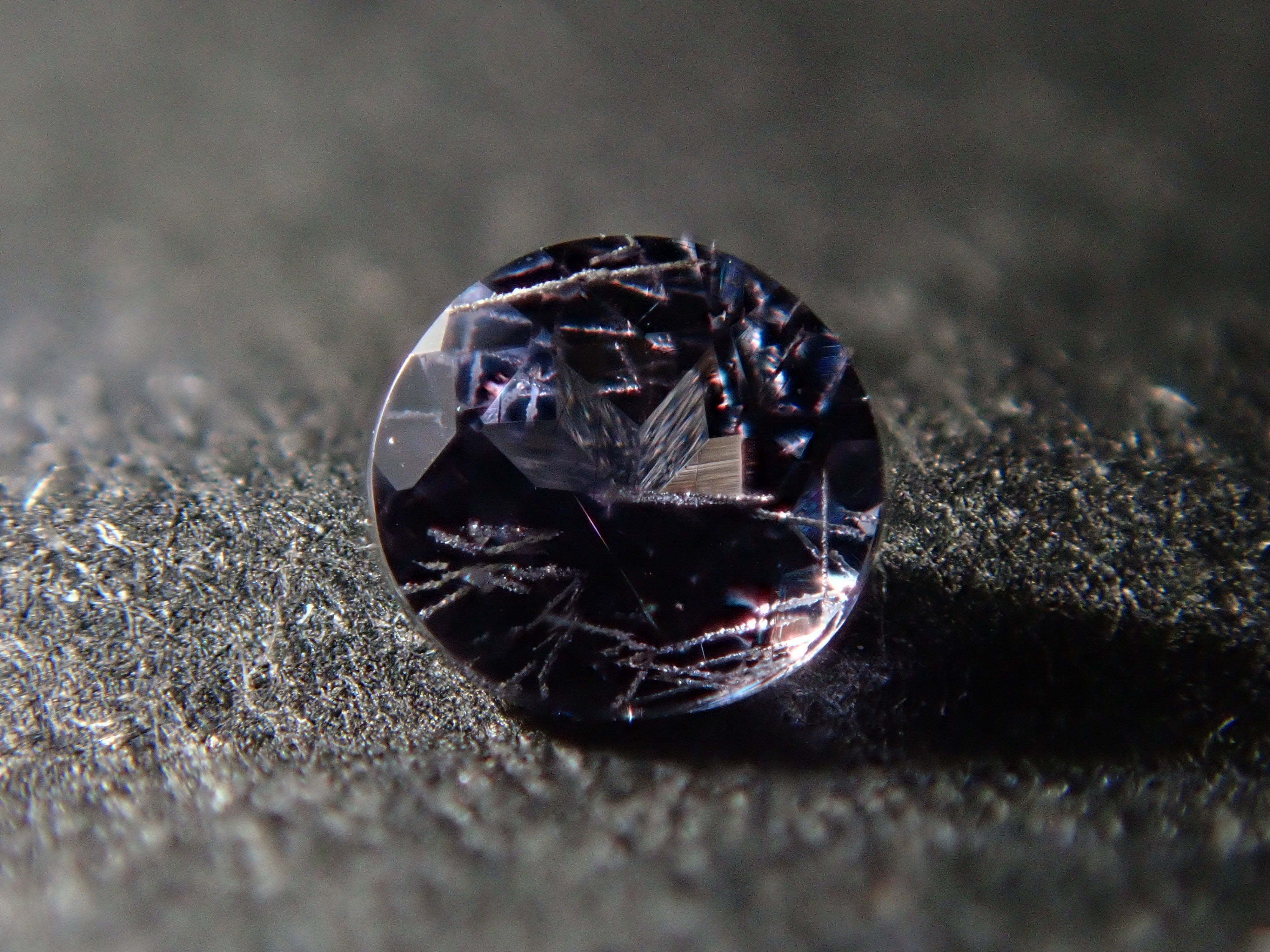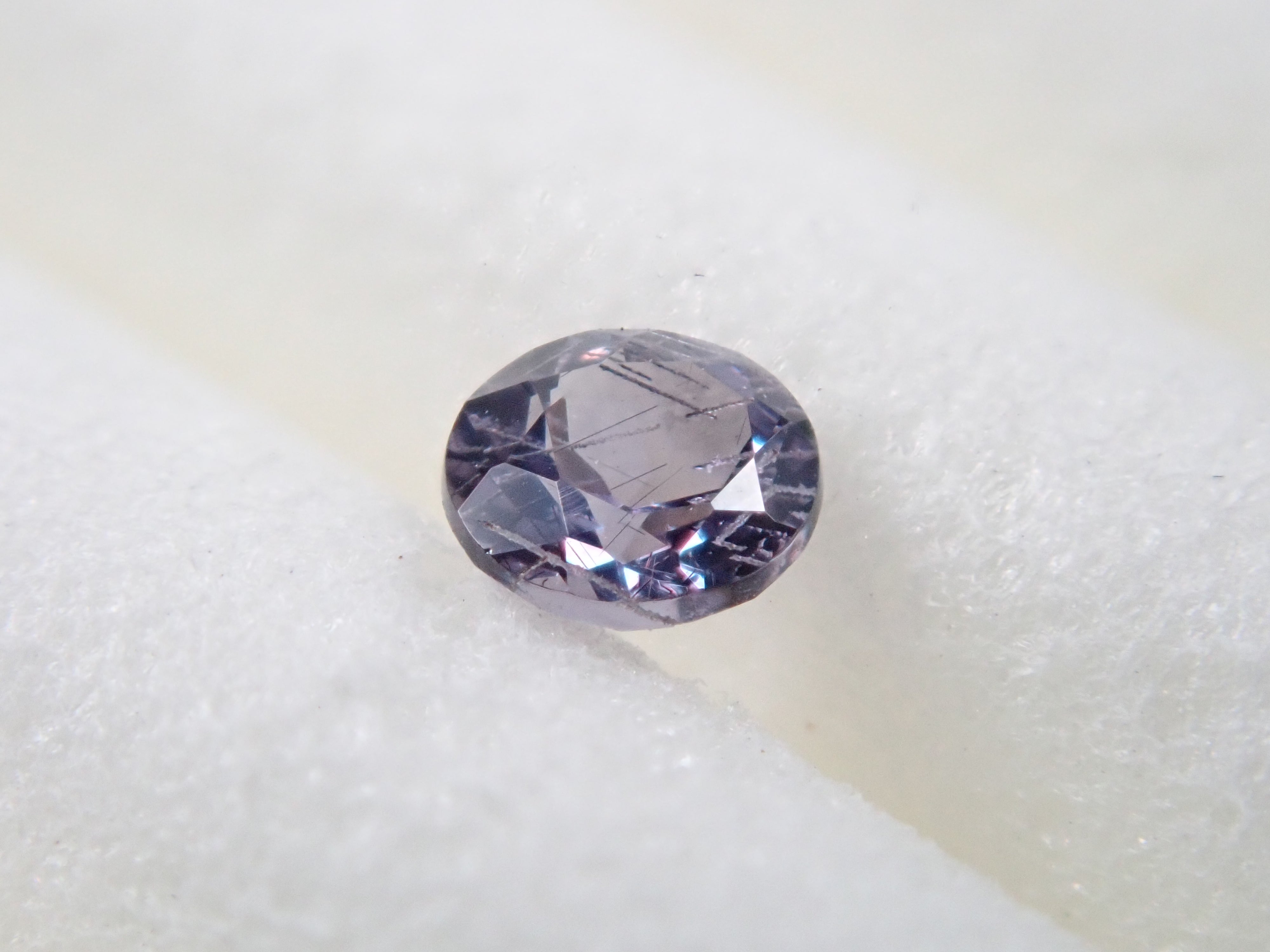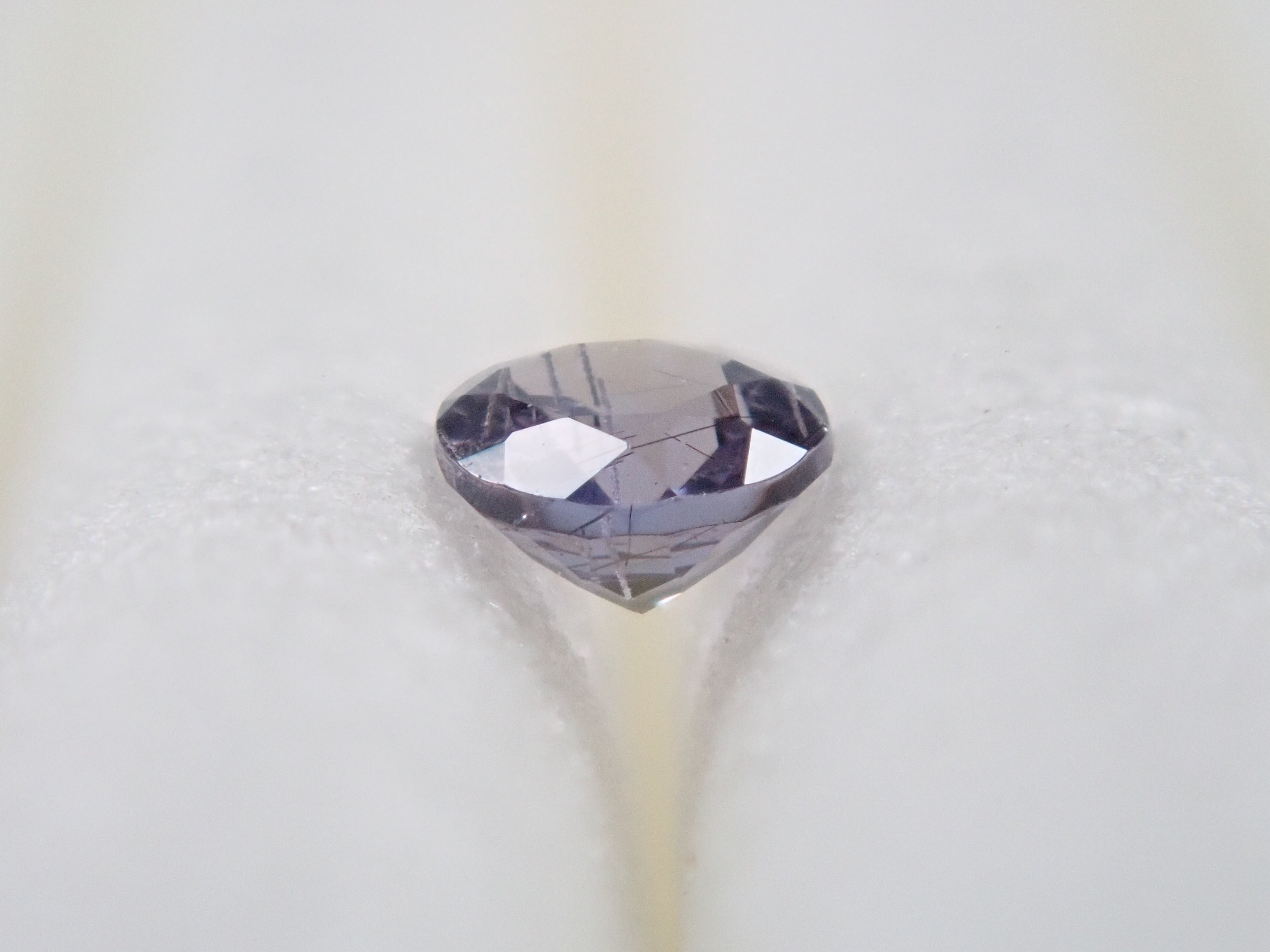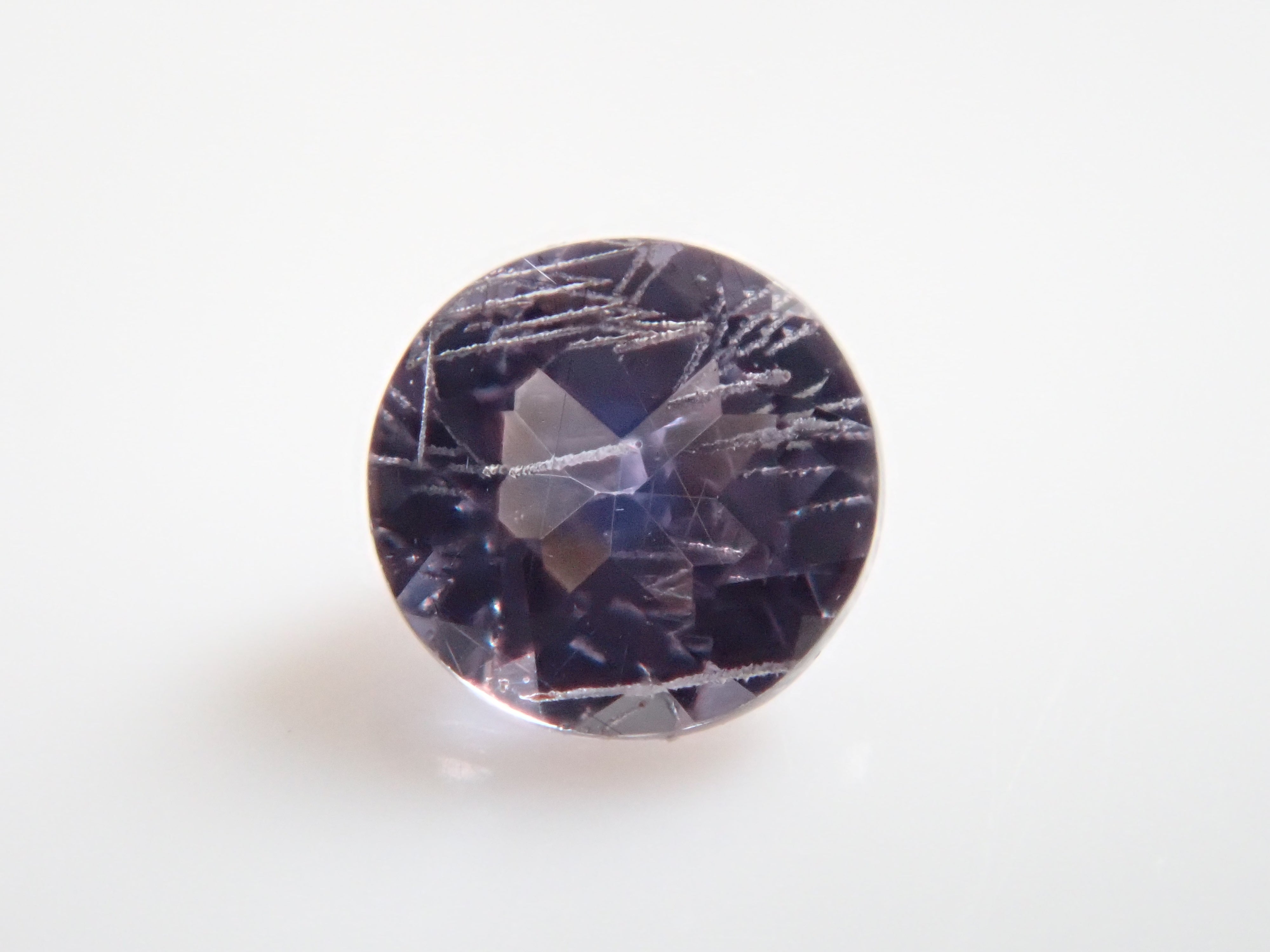 石榴石以一月生日石而聞名。它是標準寶石之一。不過這種變色類型的石榴石在市場上並不常見,所以很多人可能以為石榴石可以變色。這是一種相對罕見的石榴石,稱為貝基利藍石榴石,呈現藍色。請使用紅色變色筆燈欣賞變色效果。貝基利藍石榴石,圓形尺寸為 2.3 毫米,具有特徵性的針狀內含物。